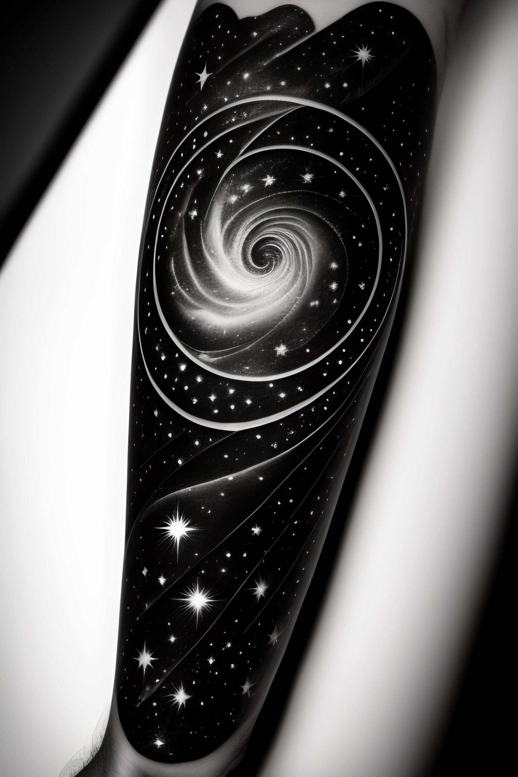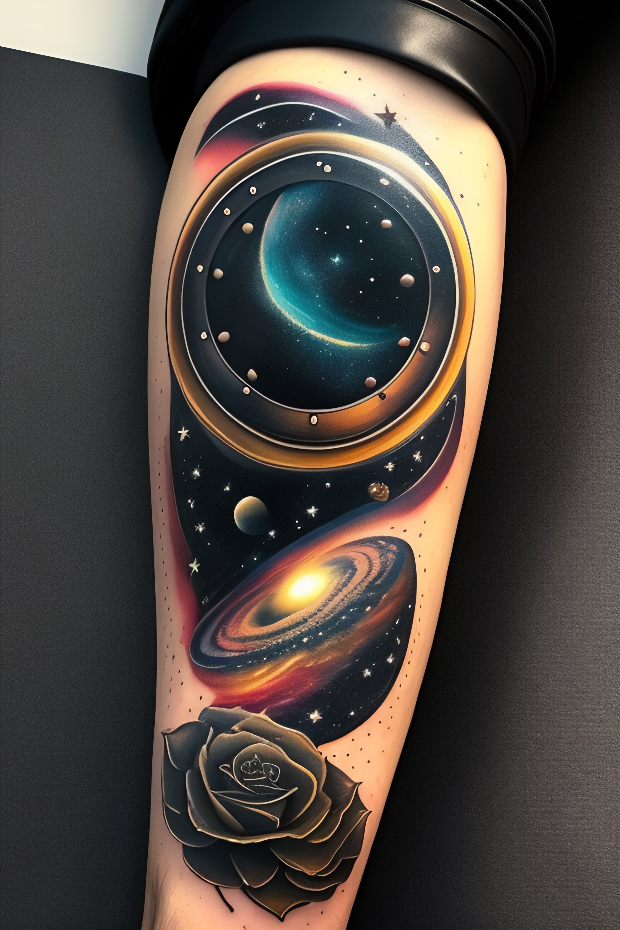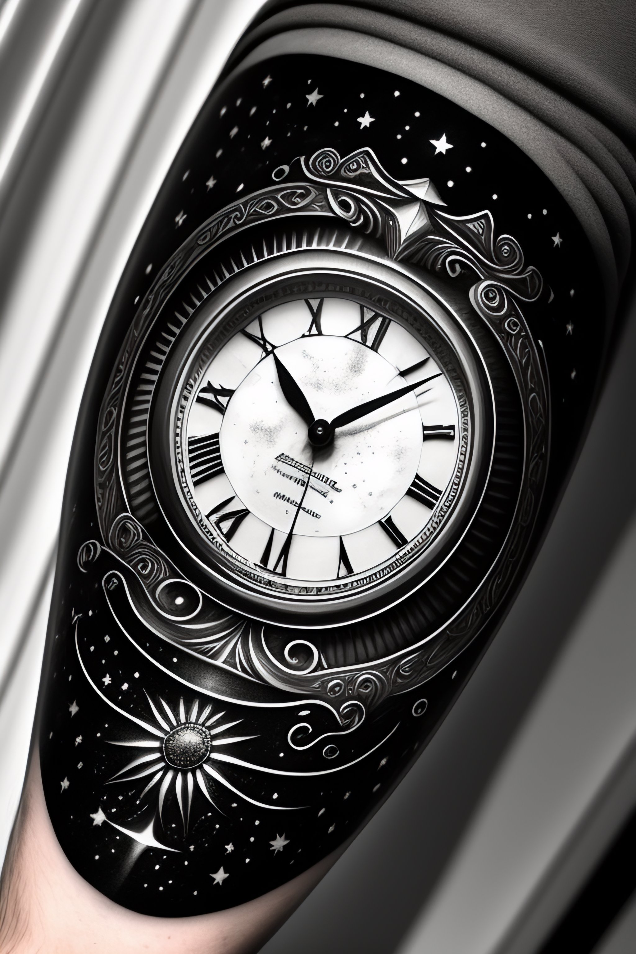 Show me a space and time tattoo on forearm in black and white