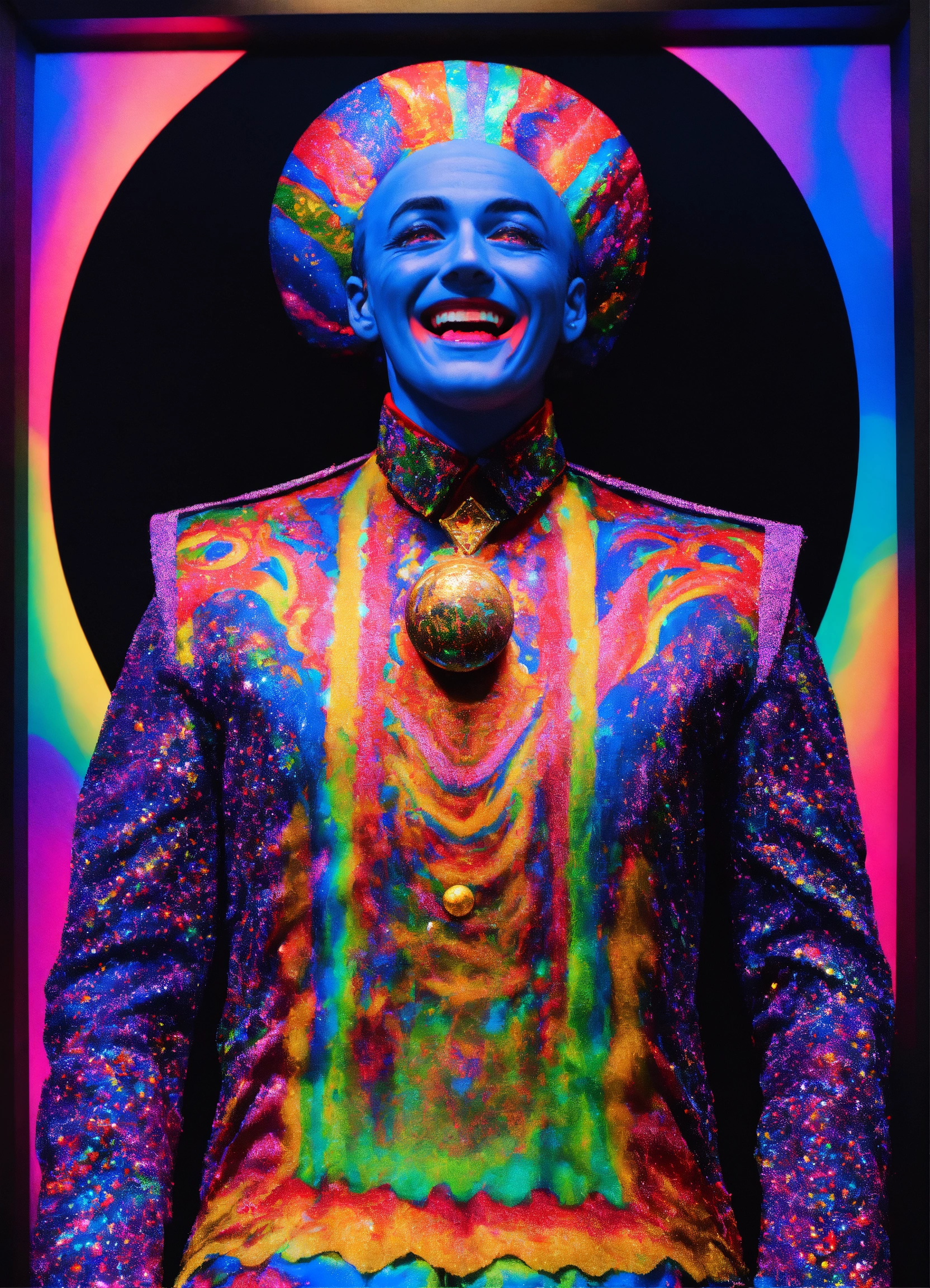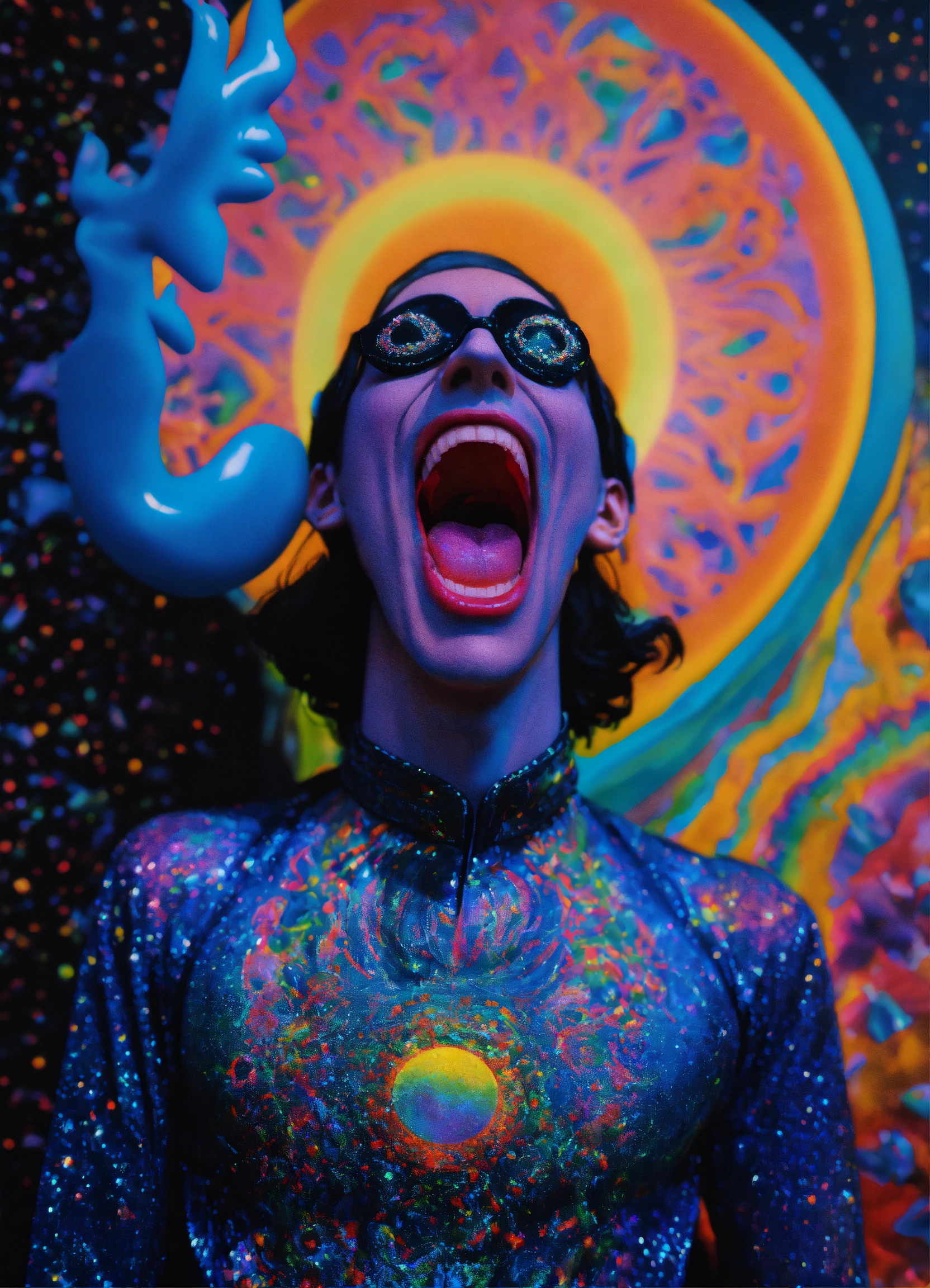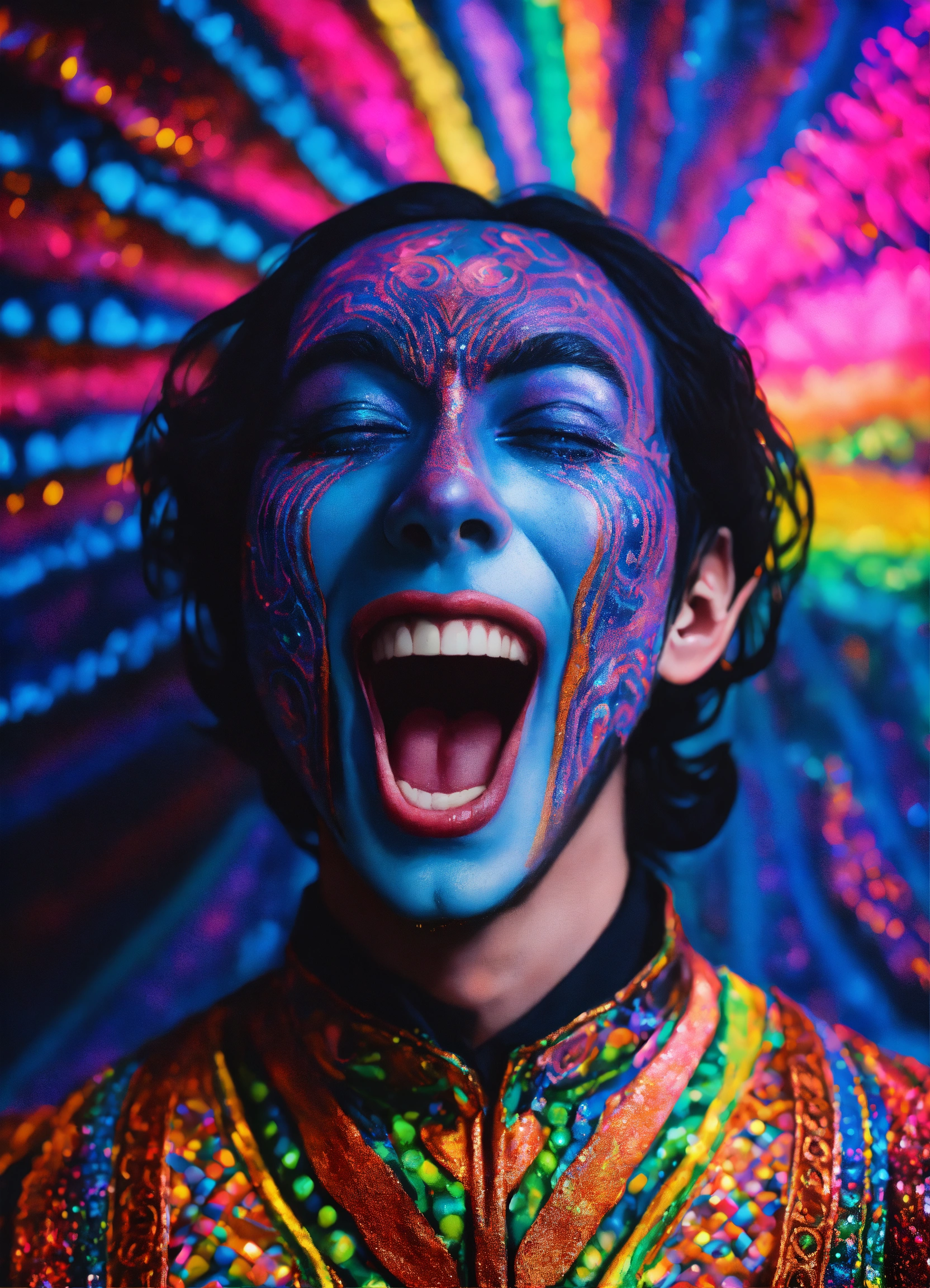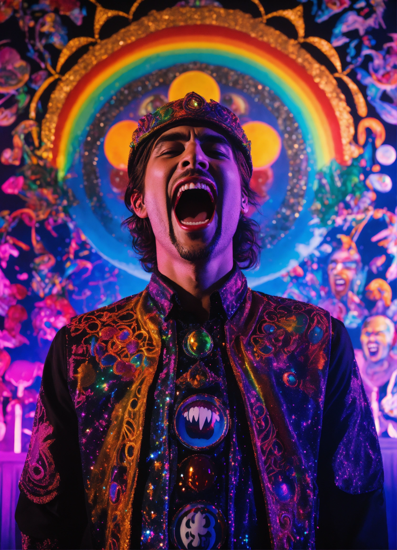 Photorealistic 3d portrait of gorgeous goth emo man screaming, laughing in a folk costume, of cosmic alex grey painting in a dmt black light glitter neon black rainbow glitter holographic moon tokyo night 70mm film, art by salvador dali and holy mountain the movie.