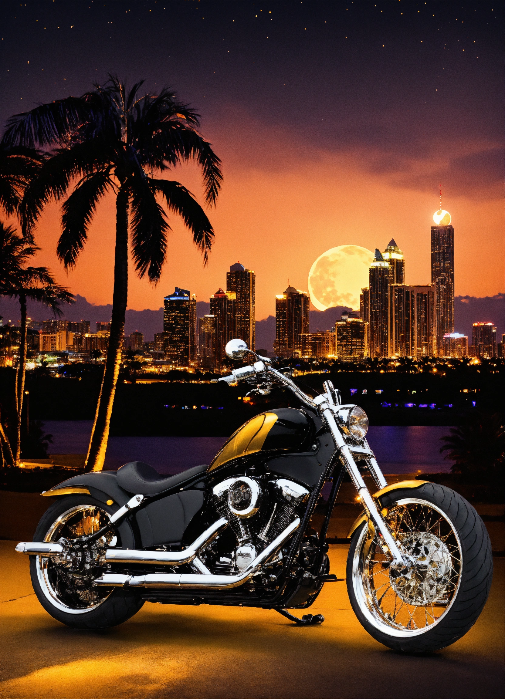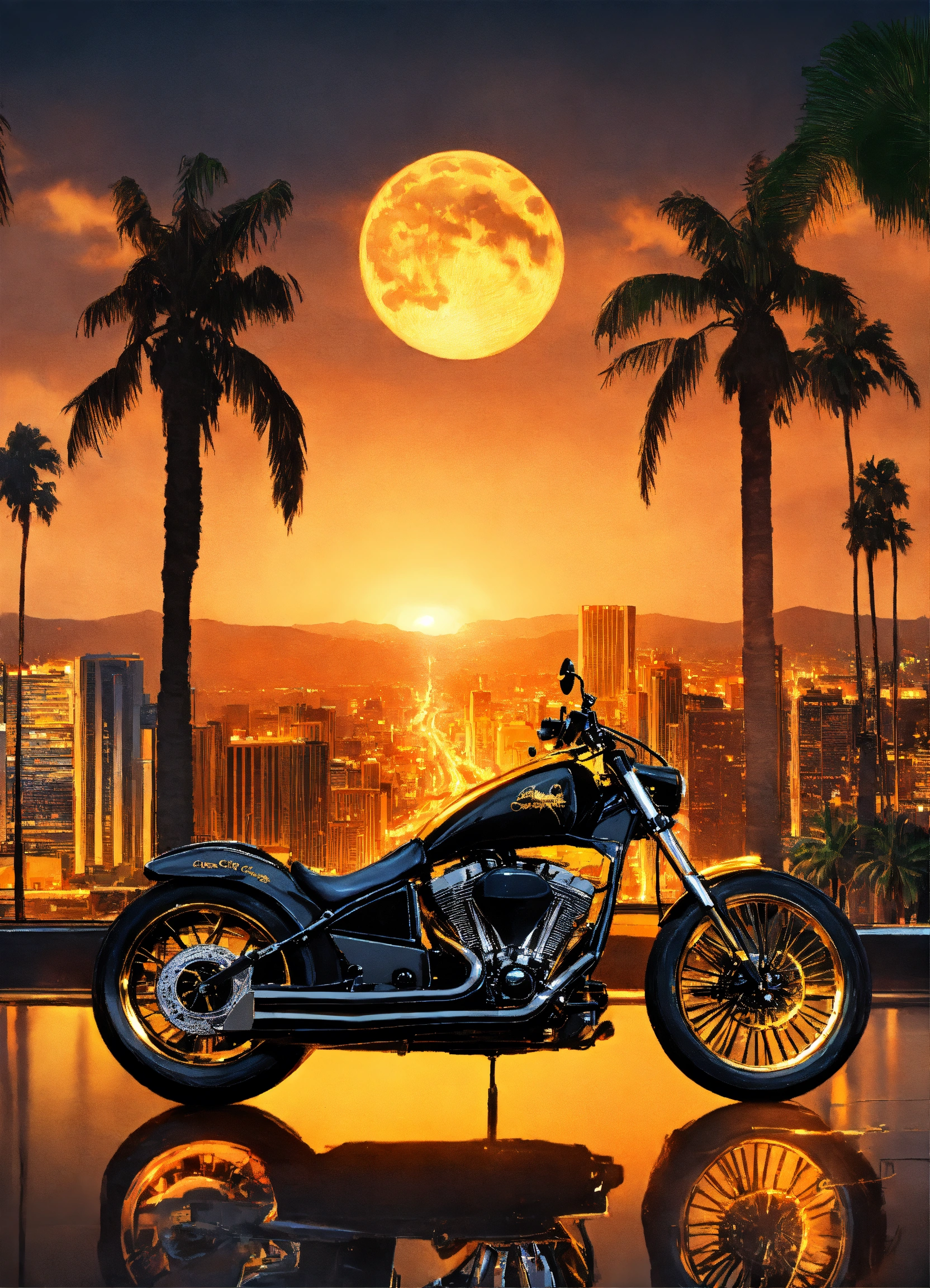 2023 orange coast choppers black and gold with downtown landscape and palm trees landscape and golden moonlight background