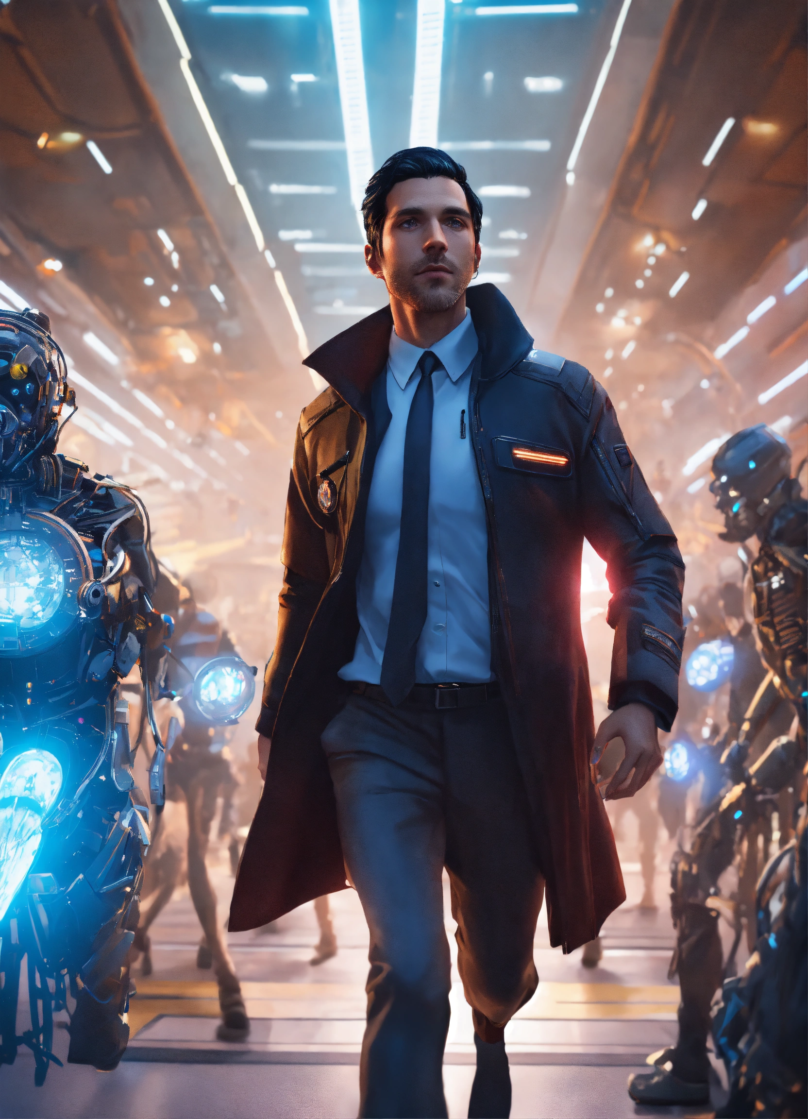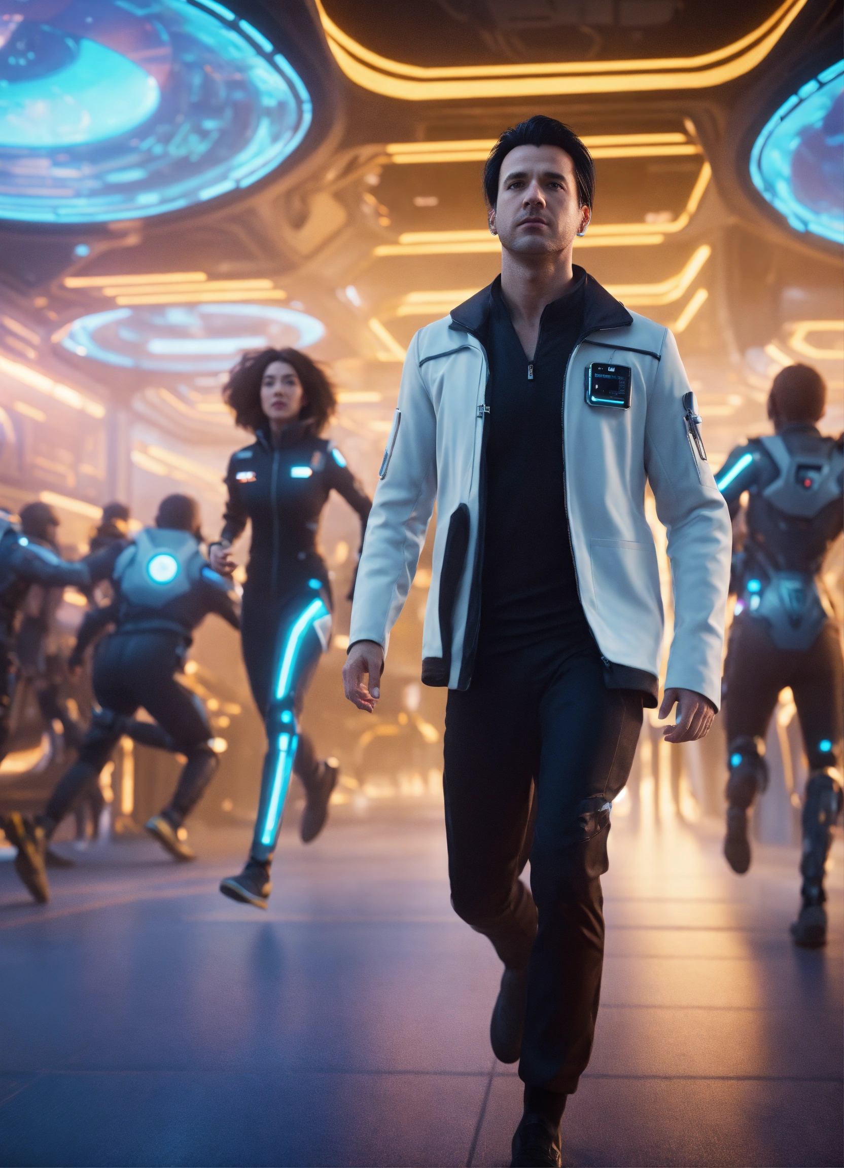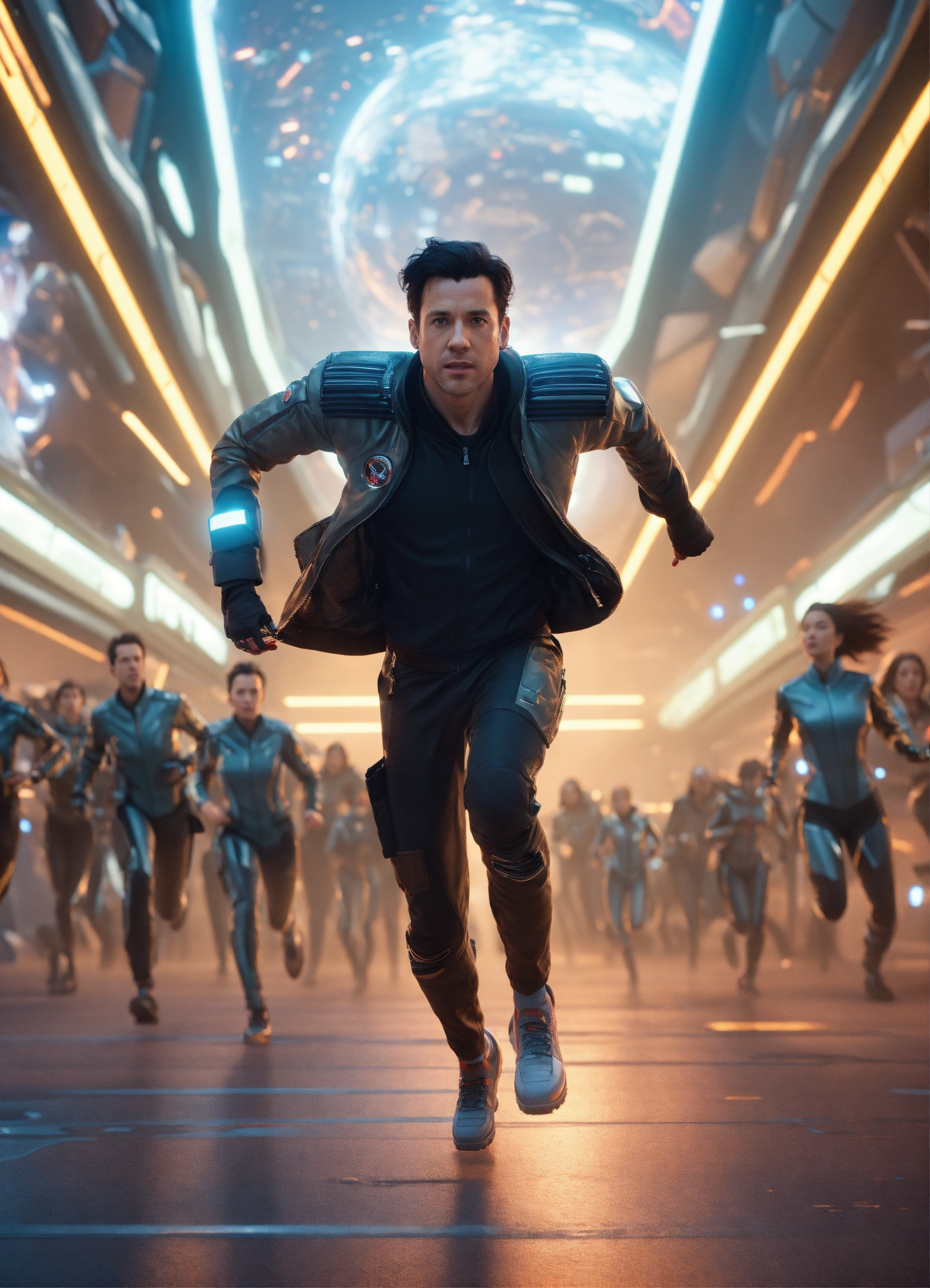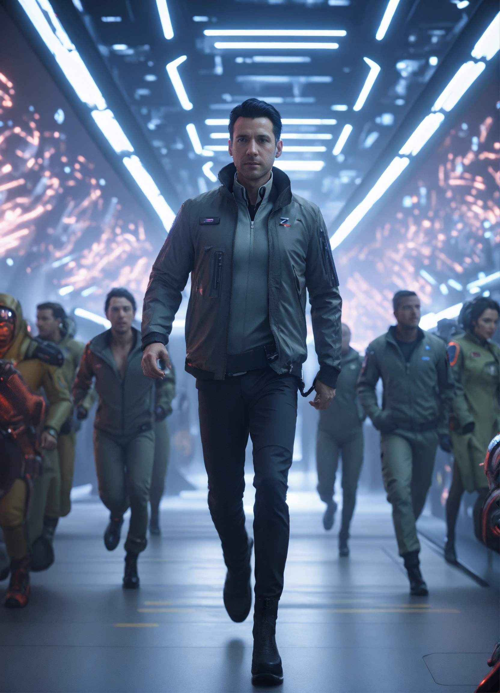35 year old white male doctor with black hair wearing futuristic spy jacket running through crowded spaceport filled with futuristic space zombies, realistic, futuristic, sci-fi, 8k, unreal engine, pixar, zaha hadid