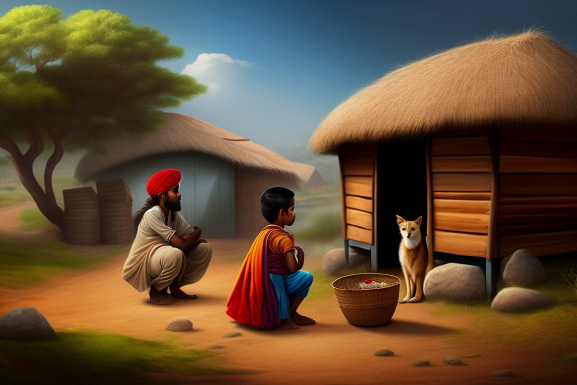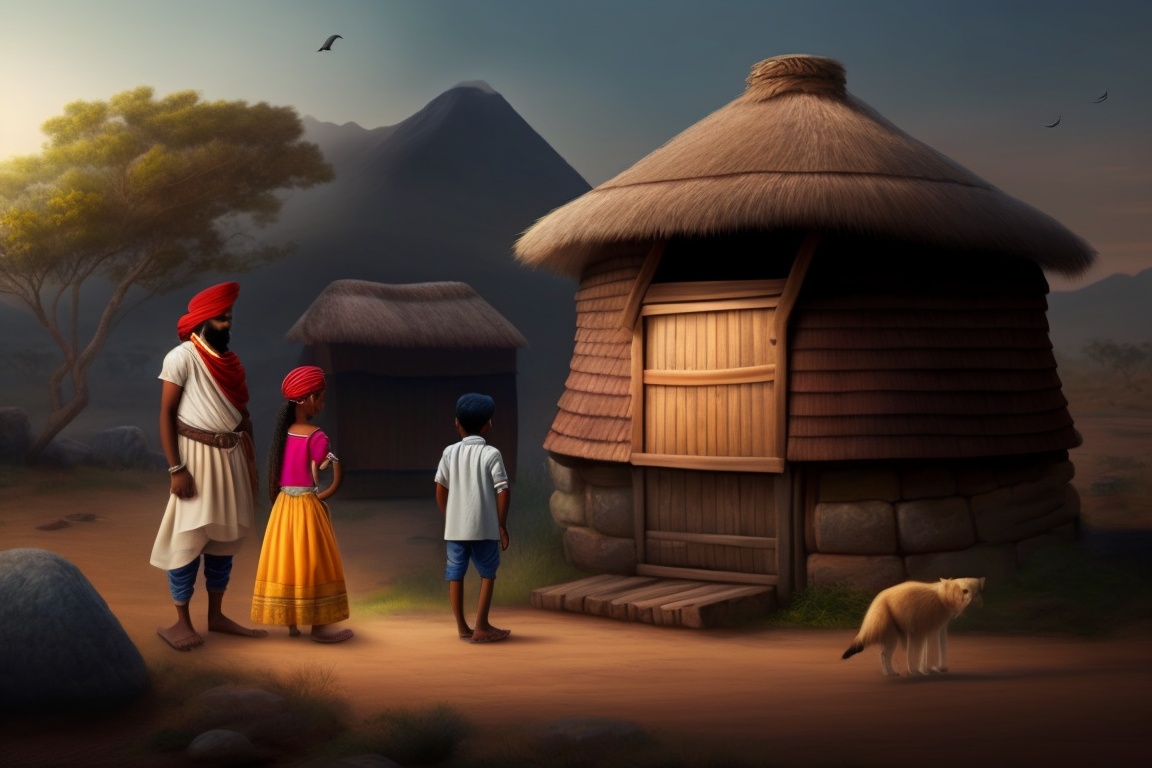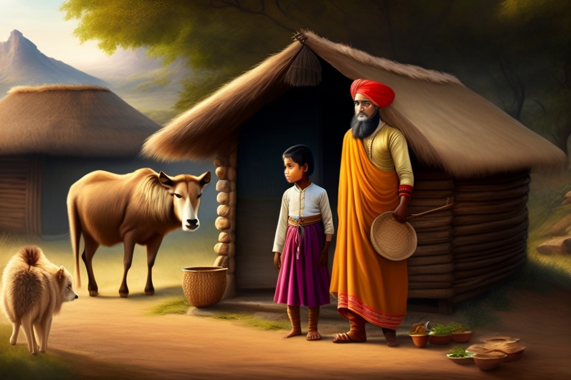 An indian king is standing near a poor man's hut, a poor little girl is sitting beside him do some work, a boy, a poor man and a poor lady standing near a hut, with a village scene in the background.