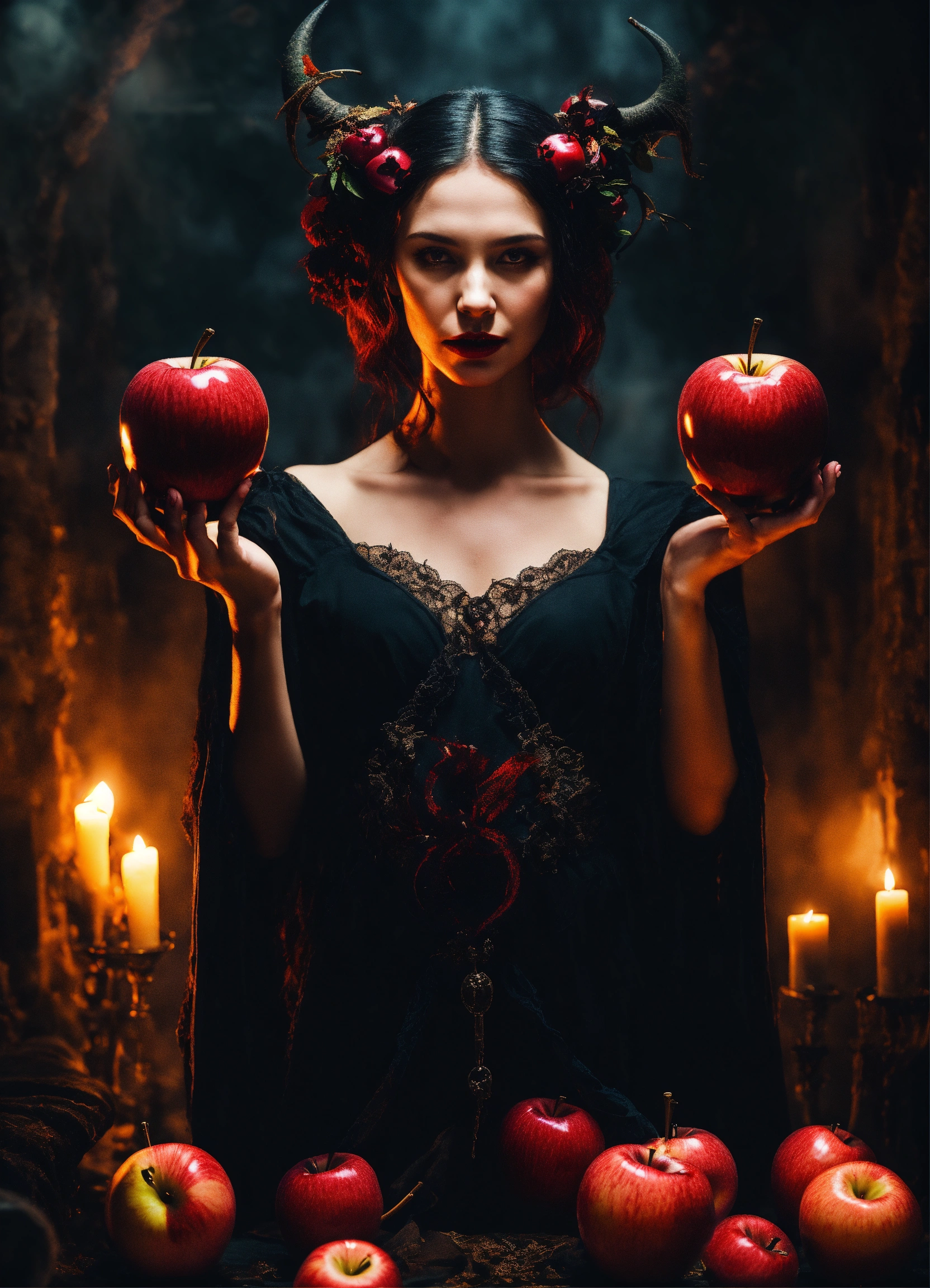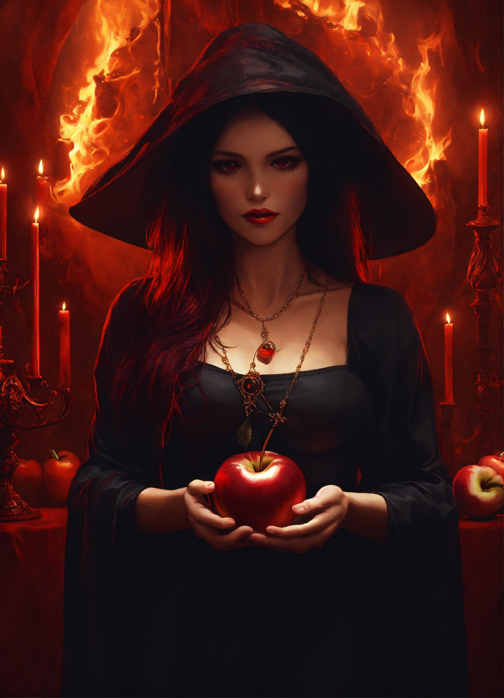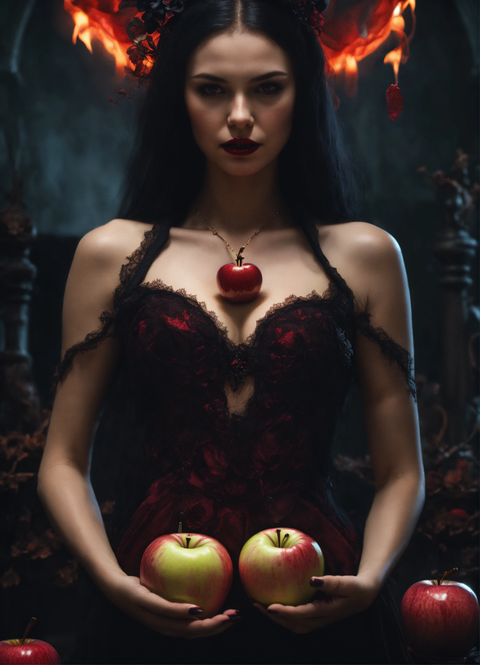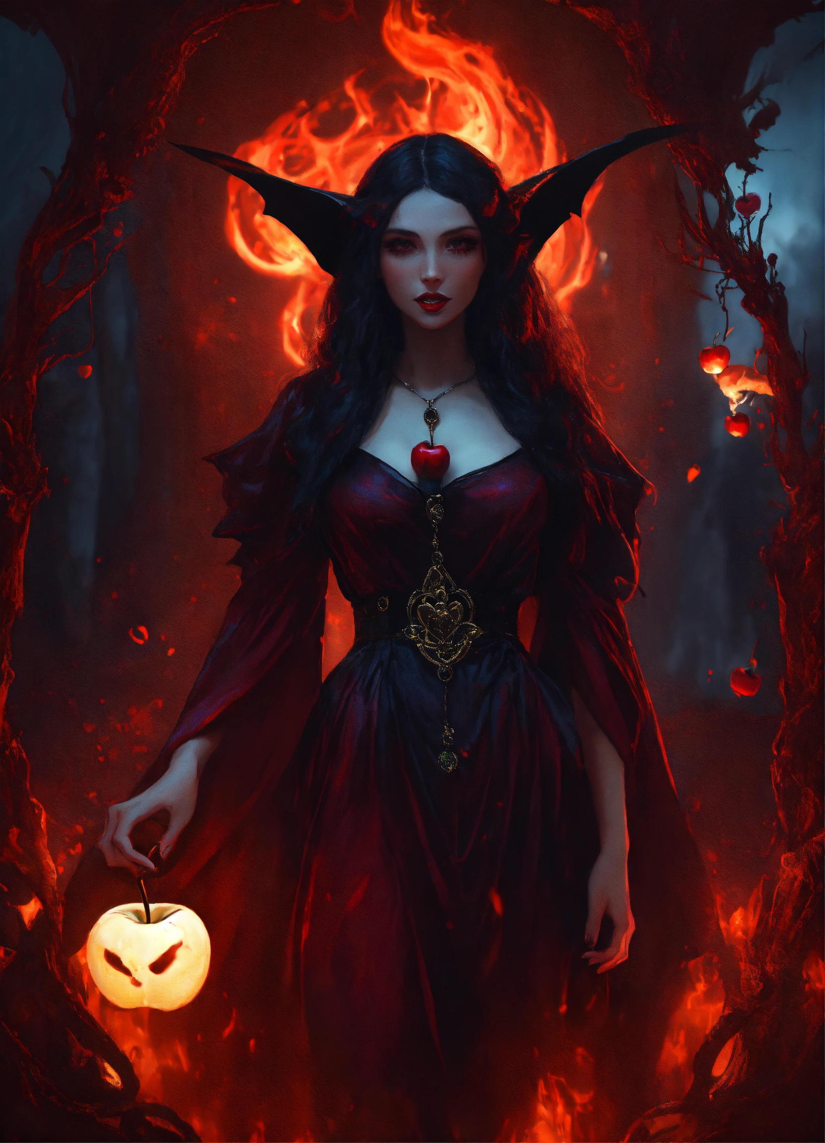 Lilith, witch characteristics, evil vibes, dark magic, holding a poisoned apple in her hands, full body, full scene, in hell