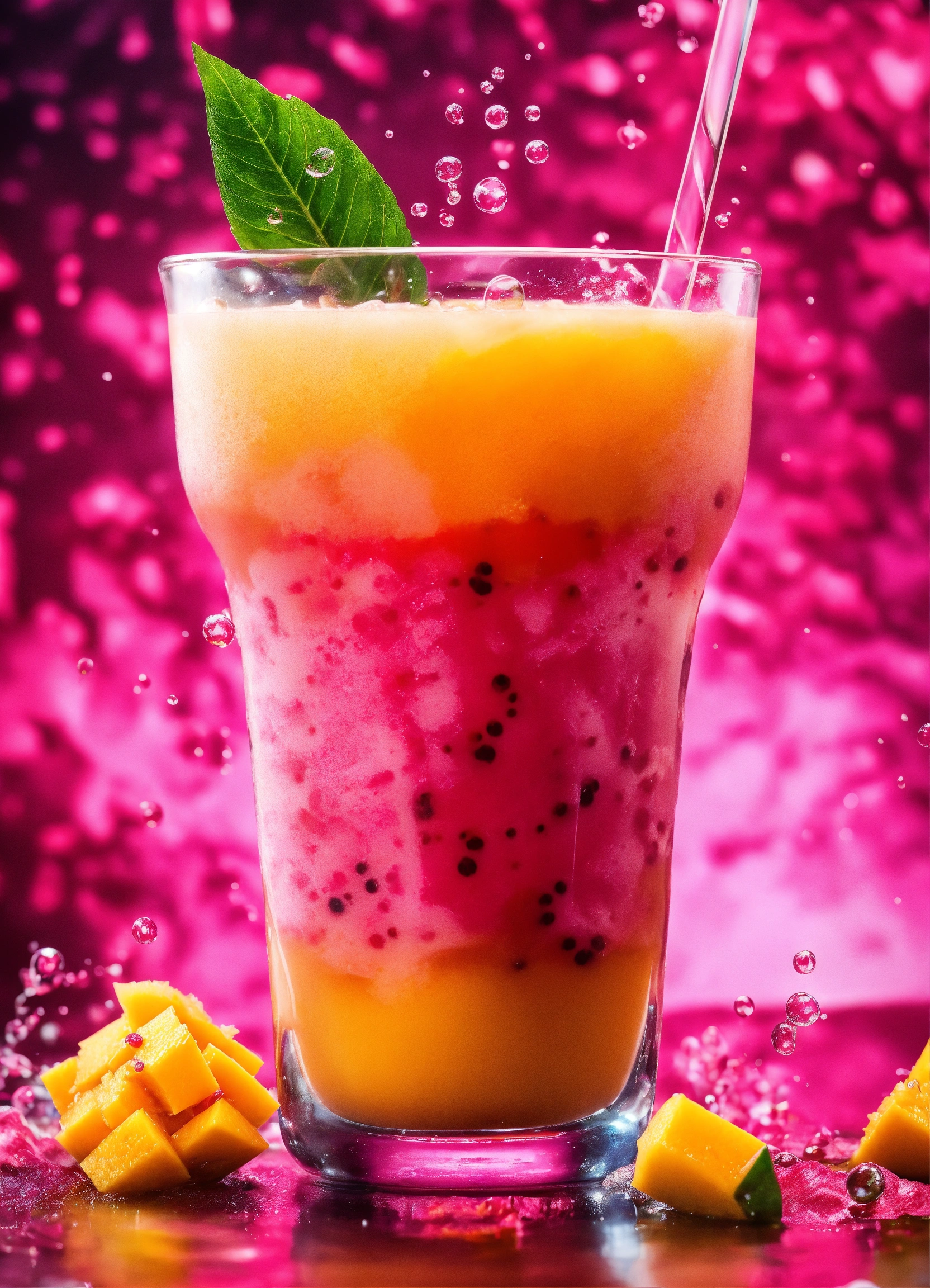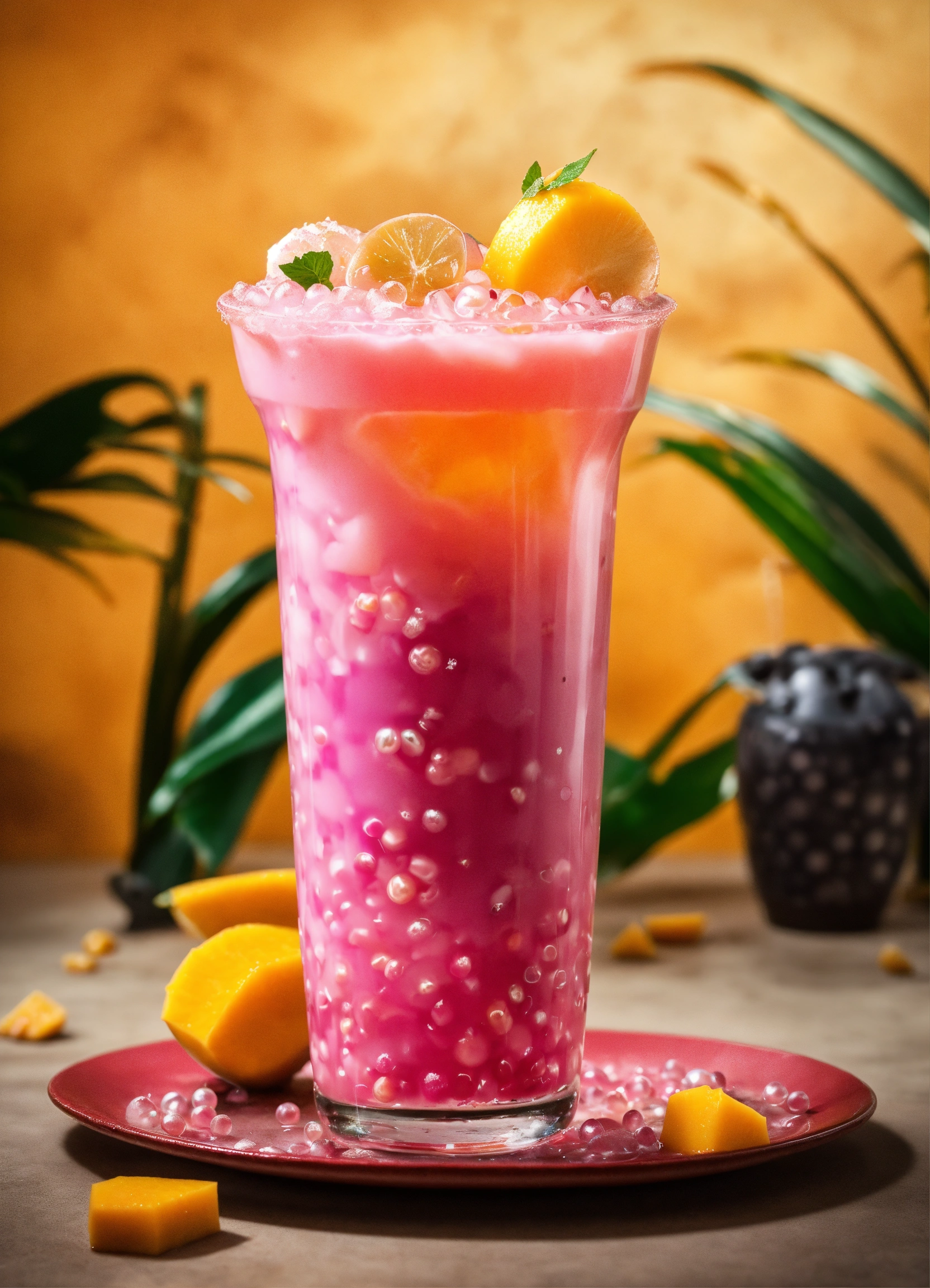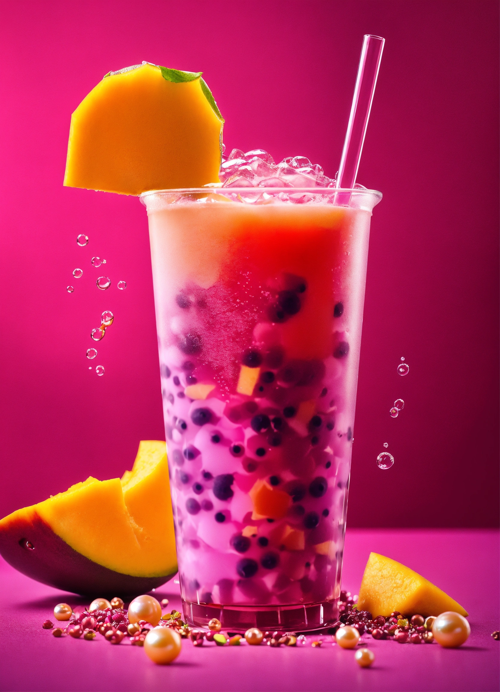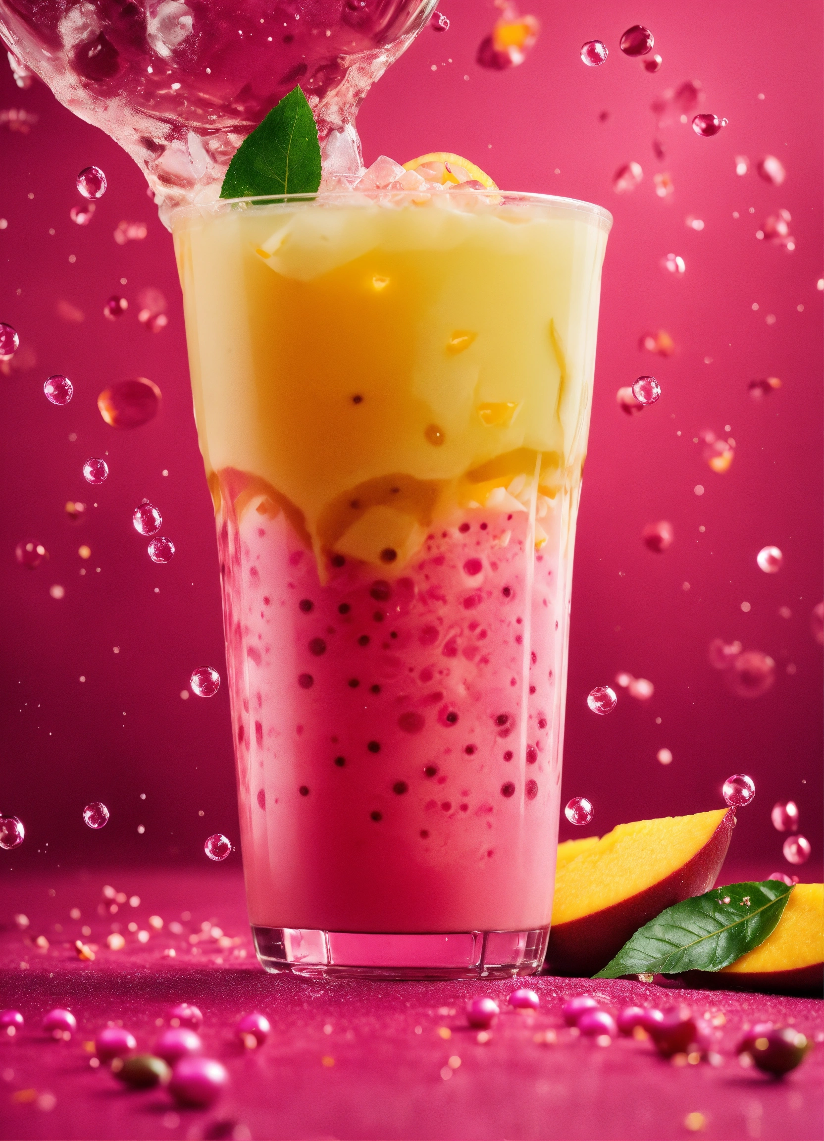 Exotic mango bubble tea, tapoica pearls. pink boba drink. tropical background. capture dramatic splash. creative dynamic compotition vary angle. macro food photography, taken by very high tech expensive camera. eyecatching, mouthwatering and cavtivating. photo product, great for poster promotion. 8k, hd quality, ultra realistic, hyper detailed. out of the box idea taken from different angle.