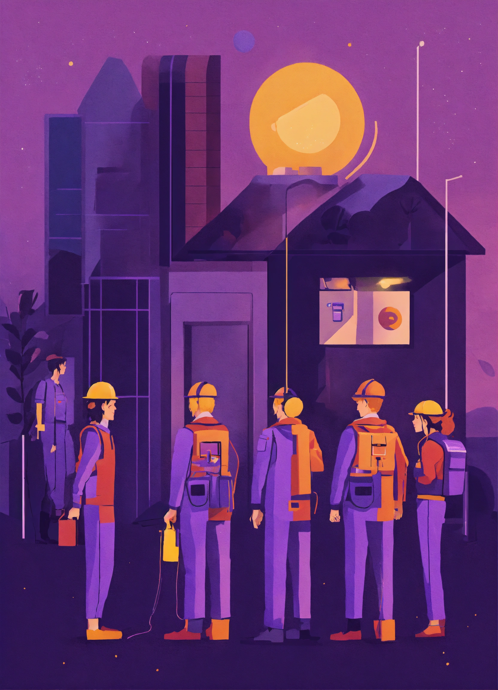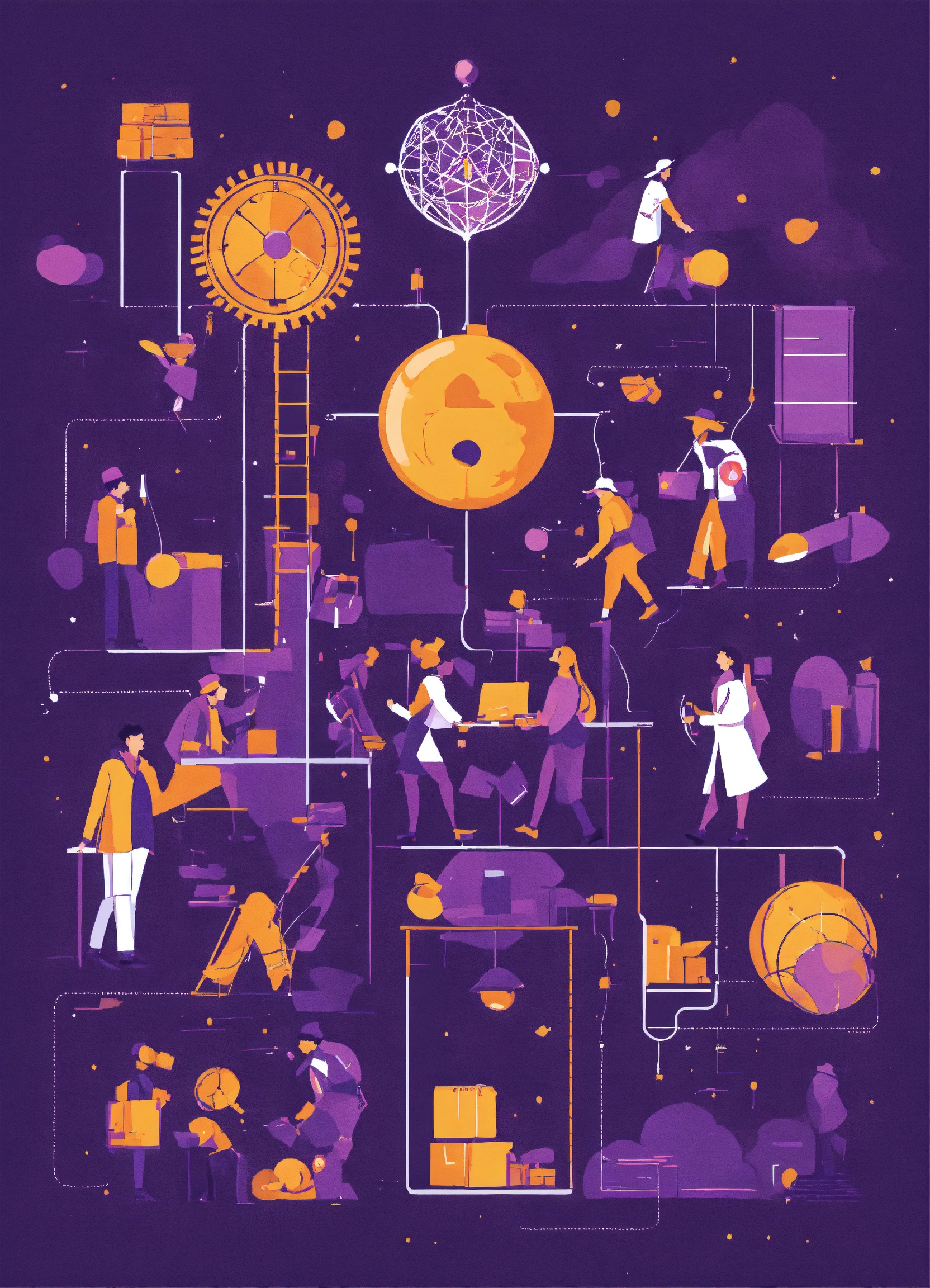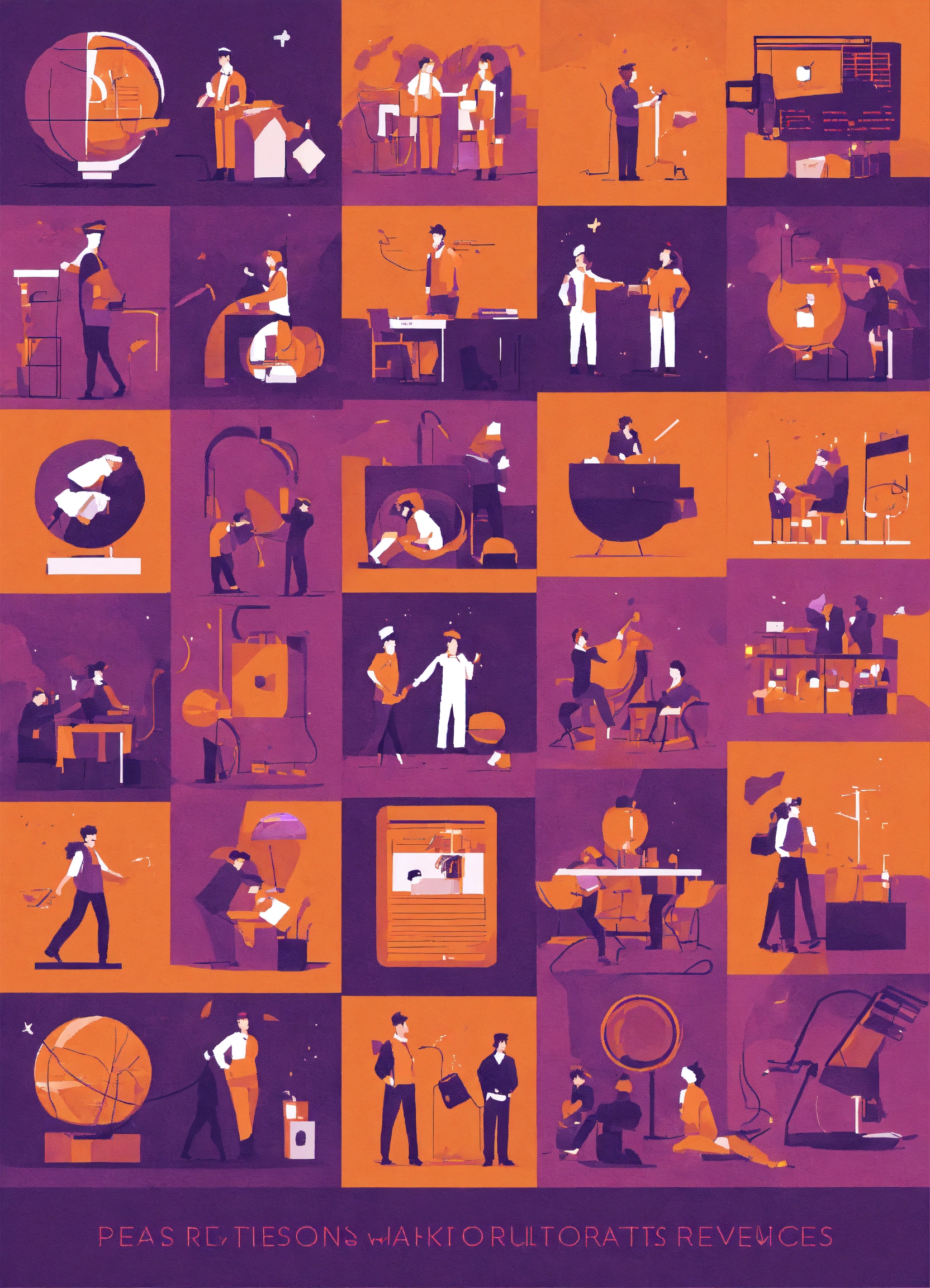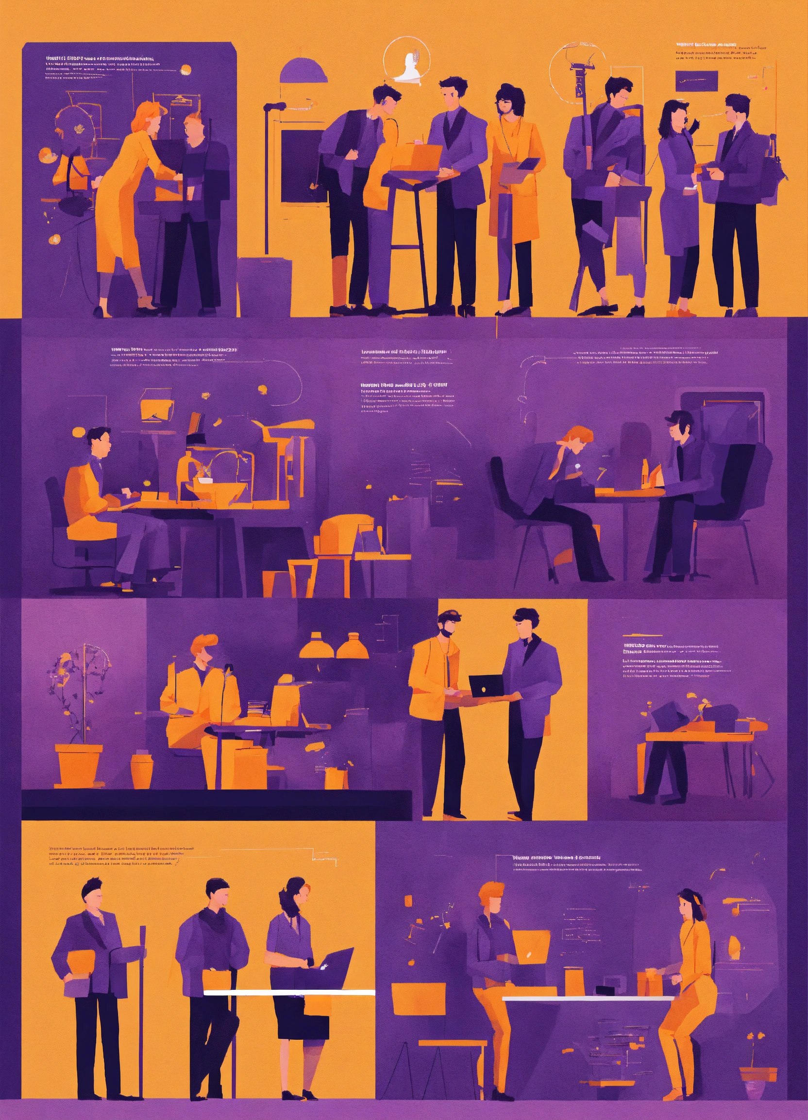 An illustration of workets, tertiary professions, human ressources happy, team building, dark purple style, minimalist