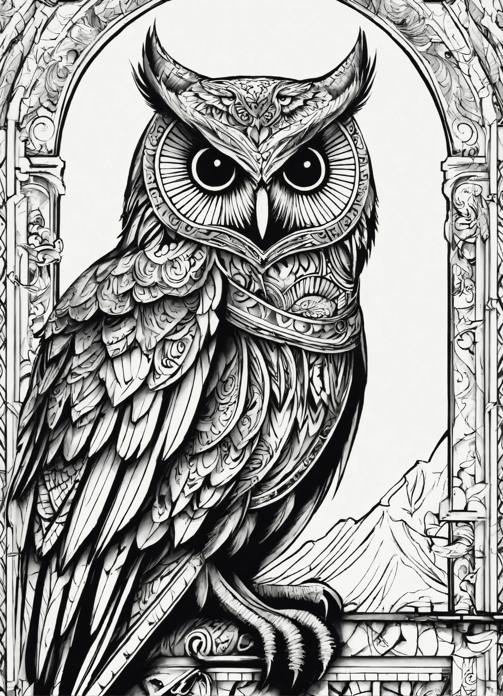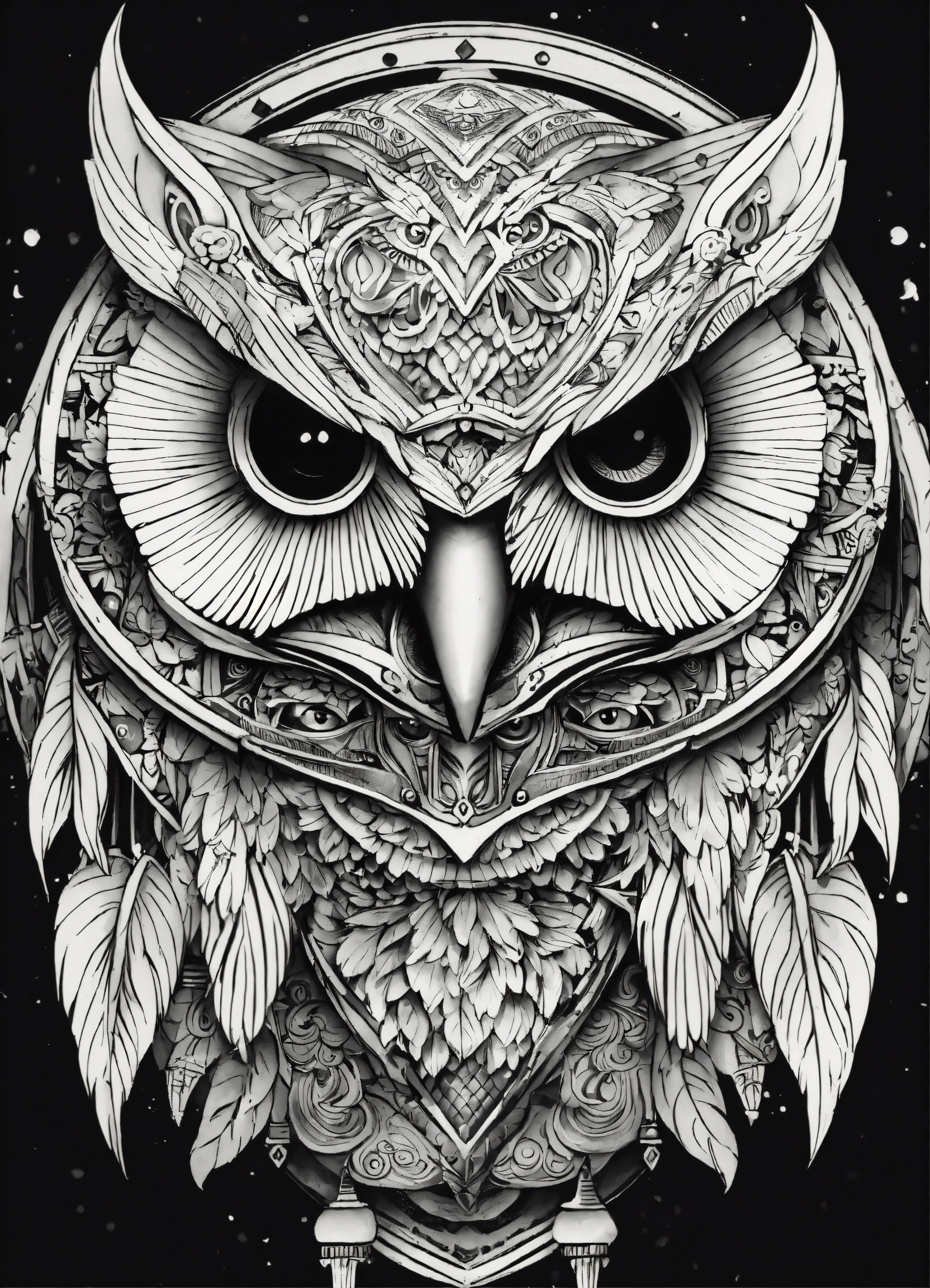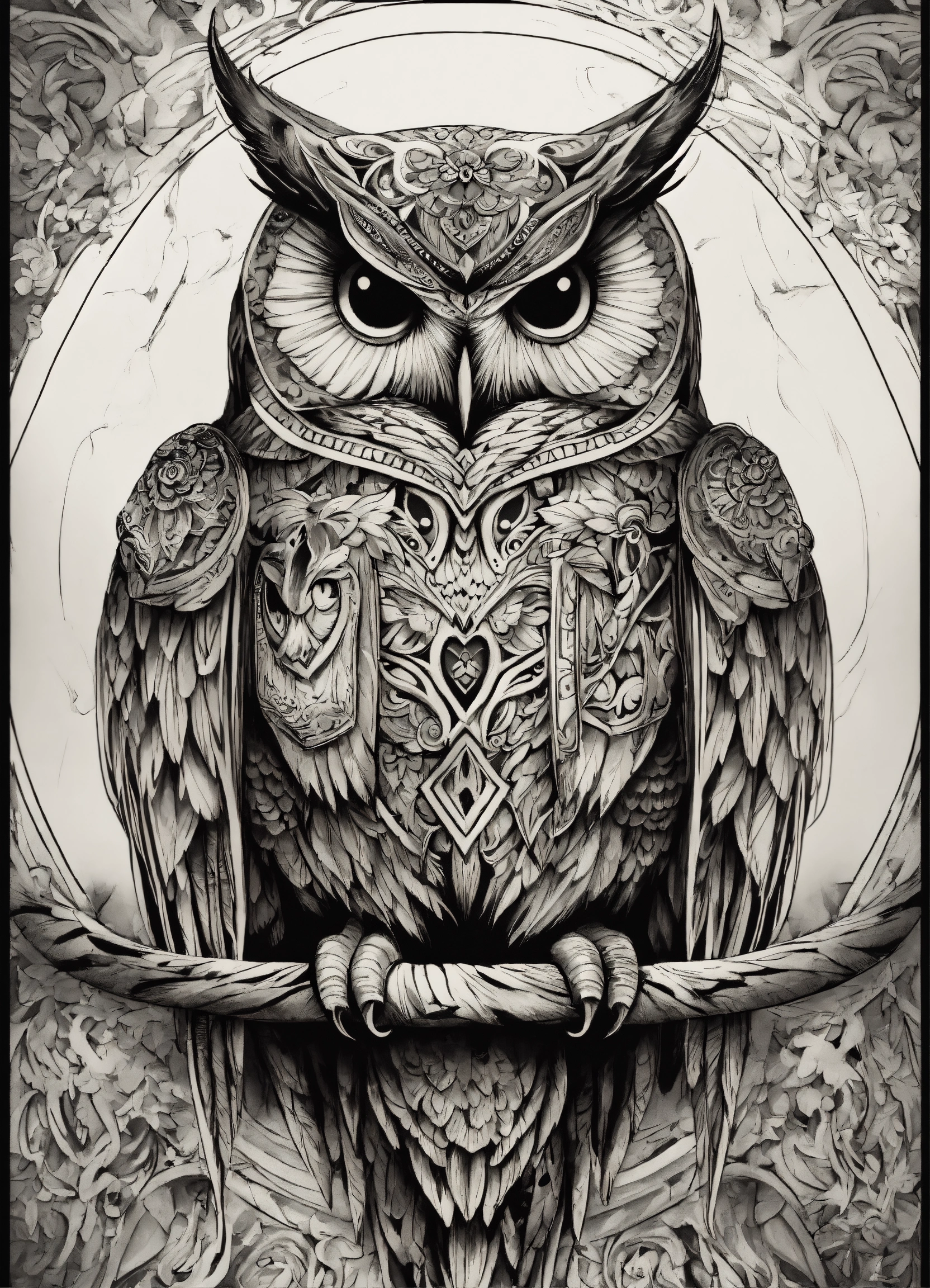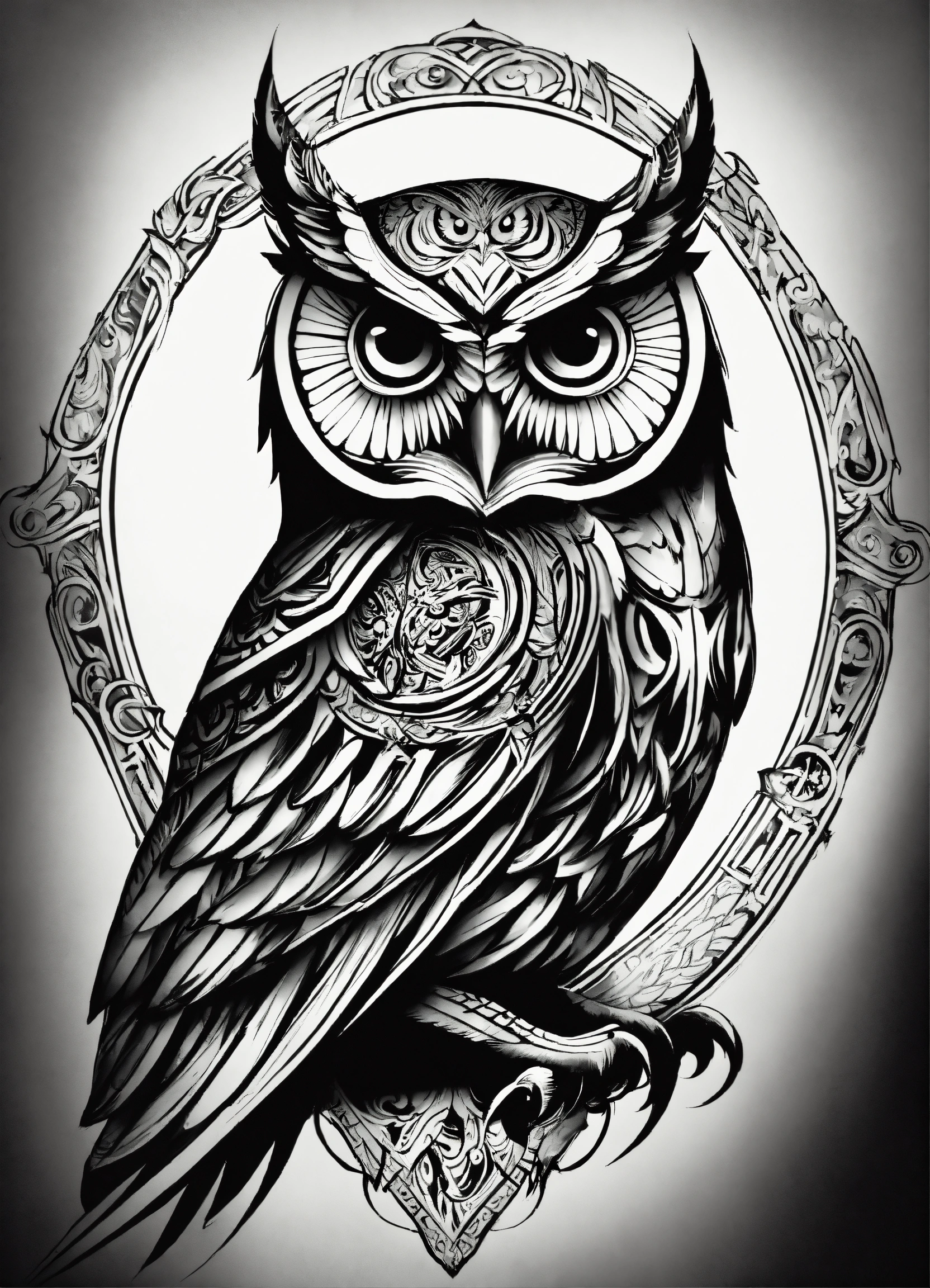 Tribal owl, black and white, detailed, elaborate, profile, tattoo like, face towards, compas background, knight