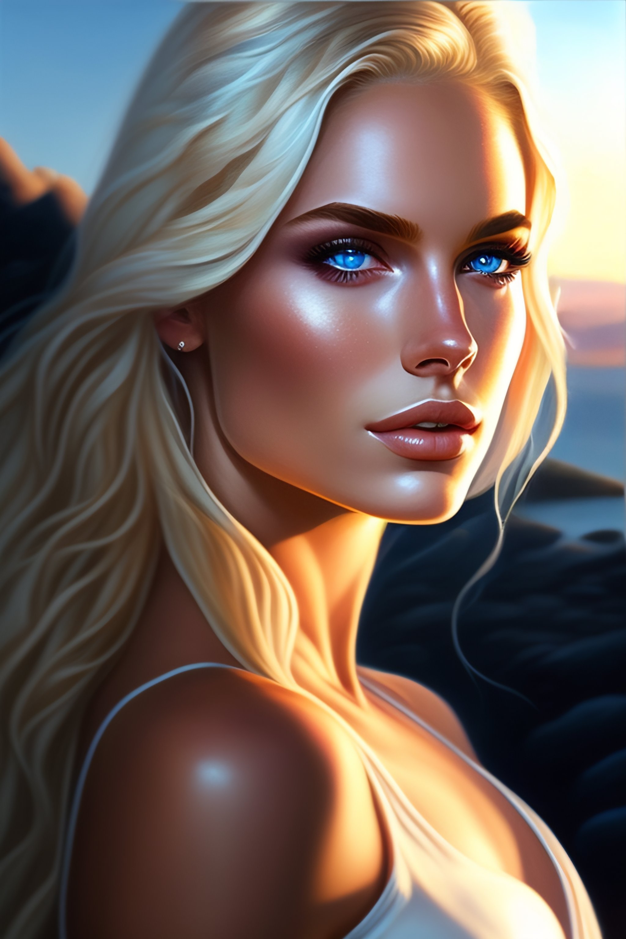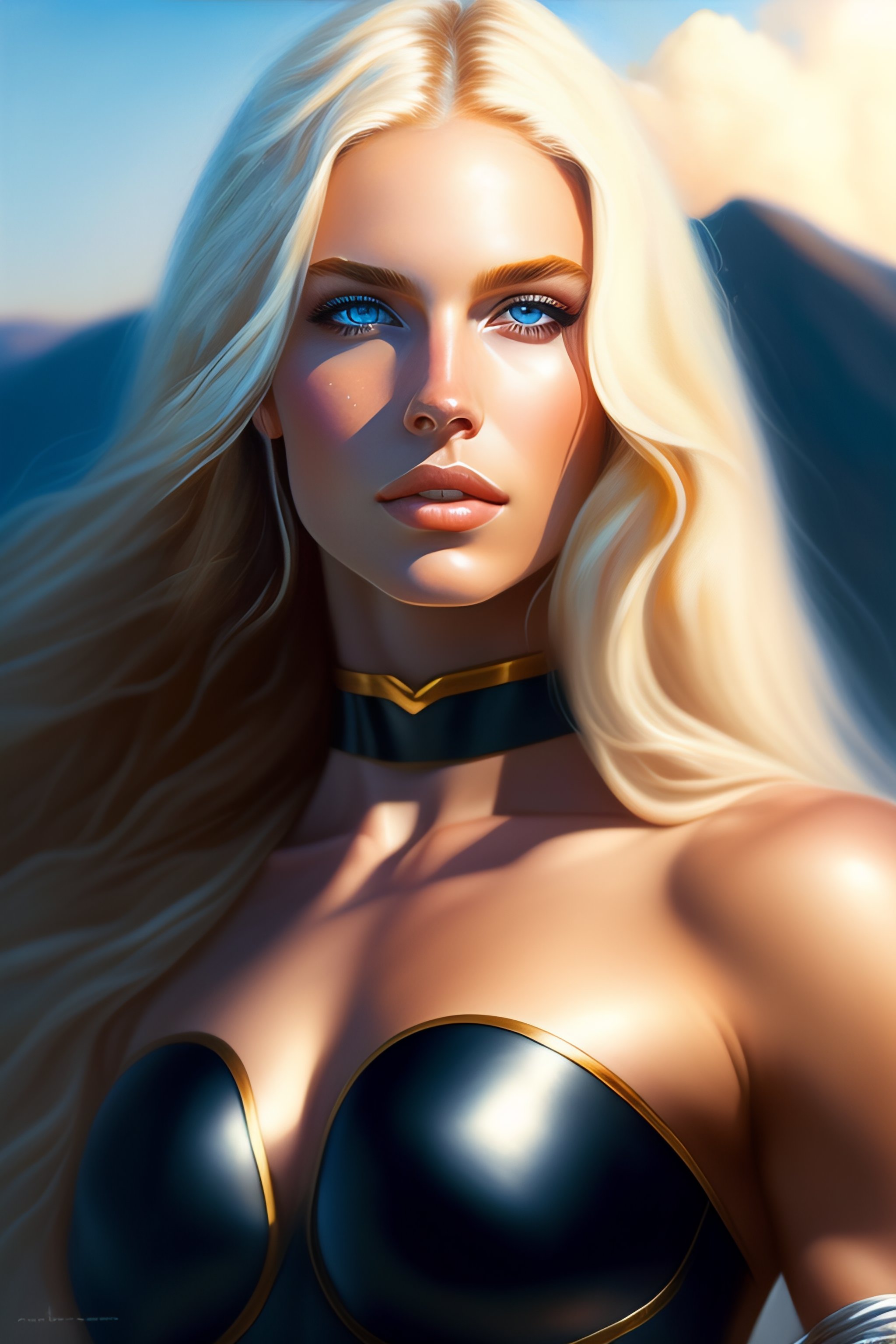 Girl looks like a goddess with pale white skin and long blonde hair, muscular upper body, beautiful highly detailed face, complementary lighting, backlit, black eyeshadow, blue eyes, adventure, dramatic lighting, landscape background, beautiful painting by artgerm and greg rutkowski and raymond swanland