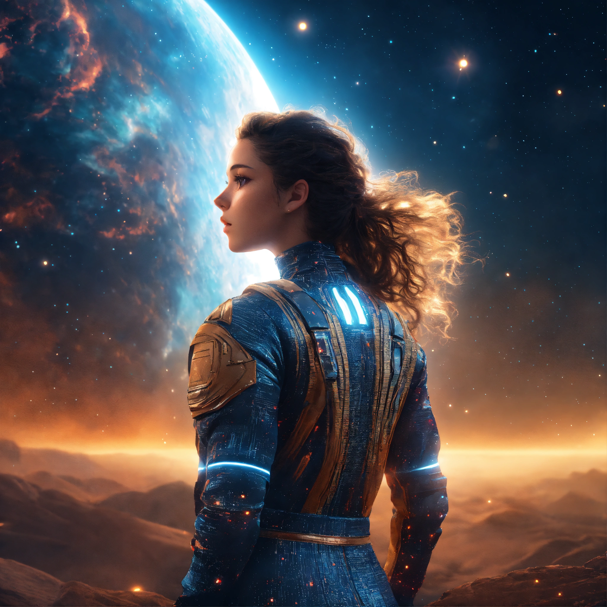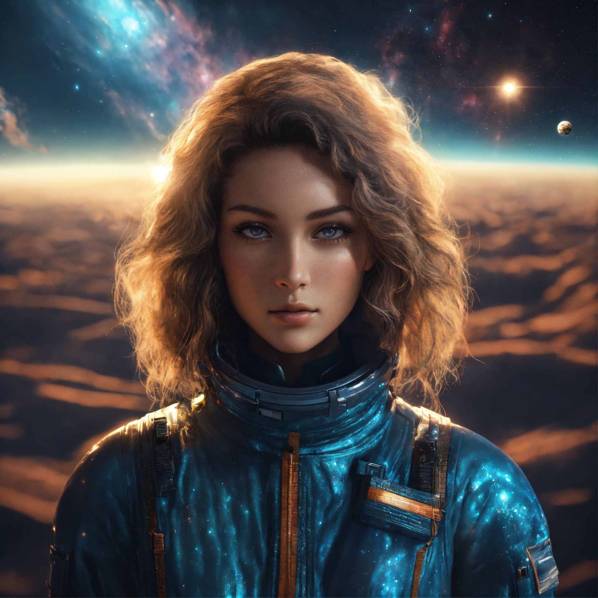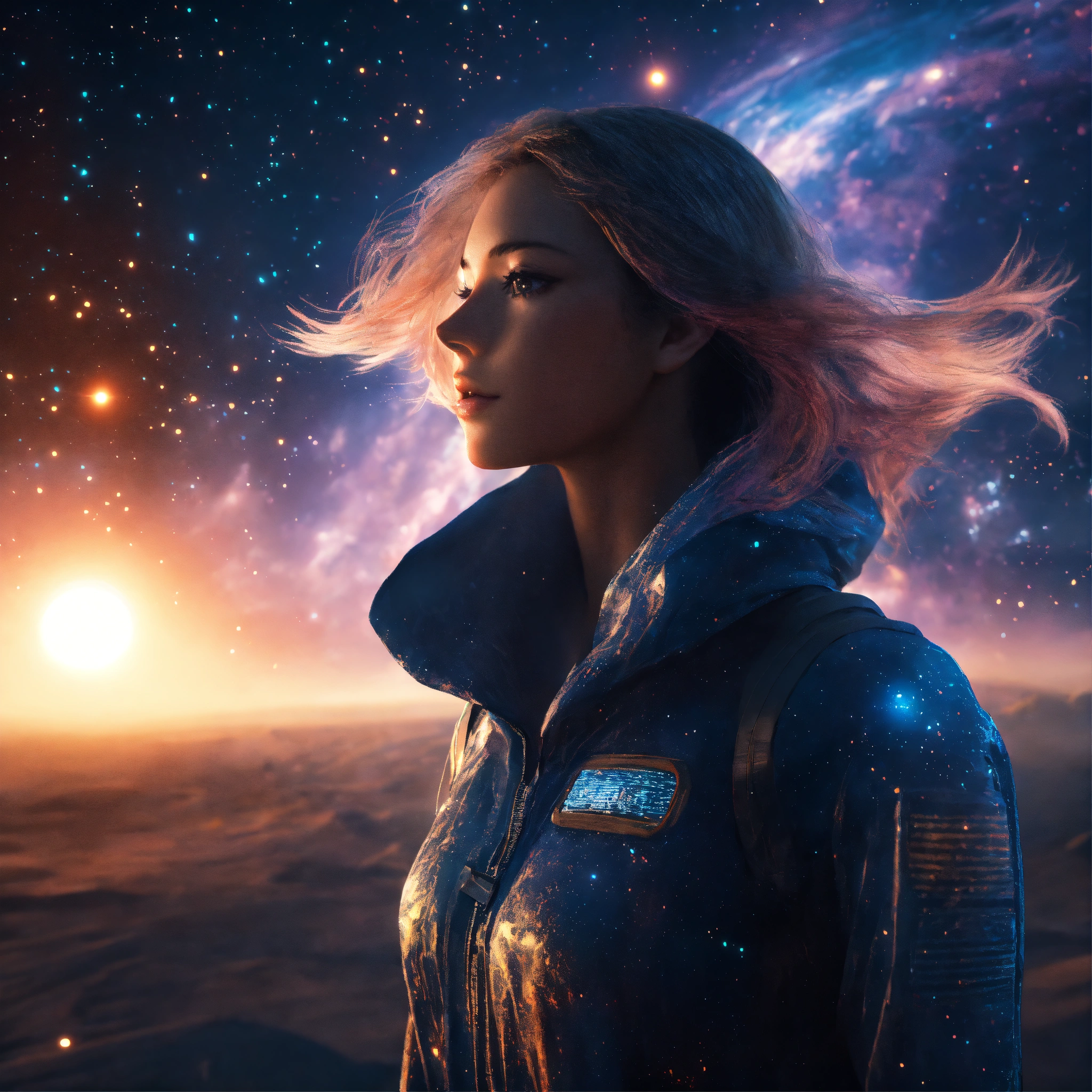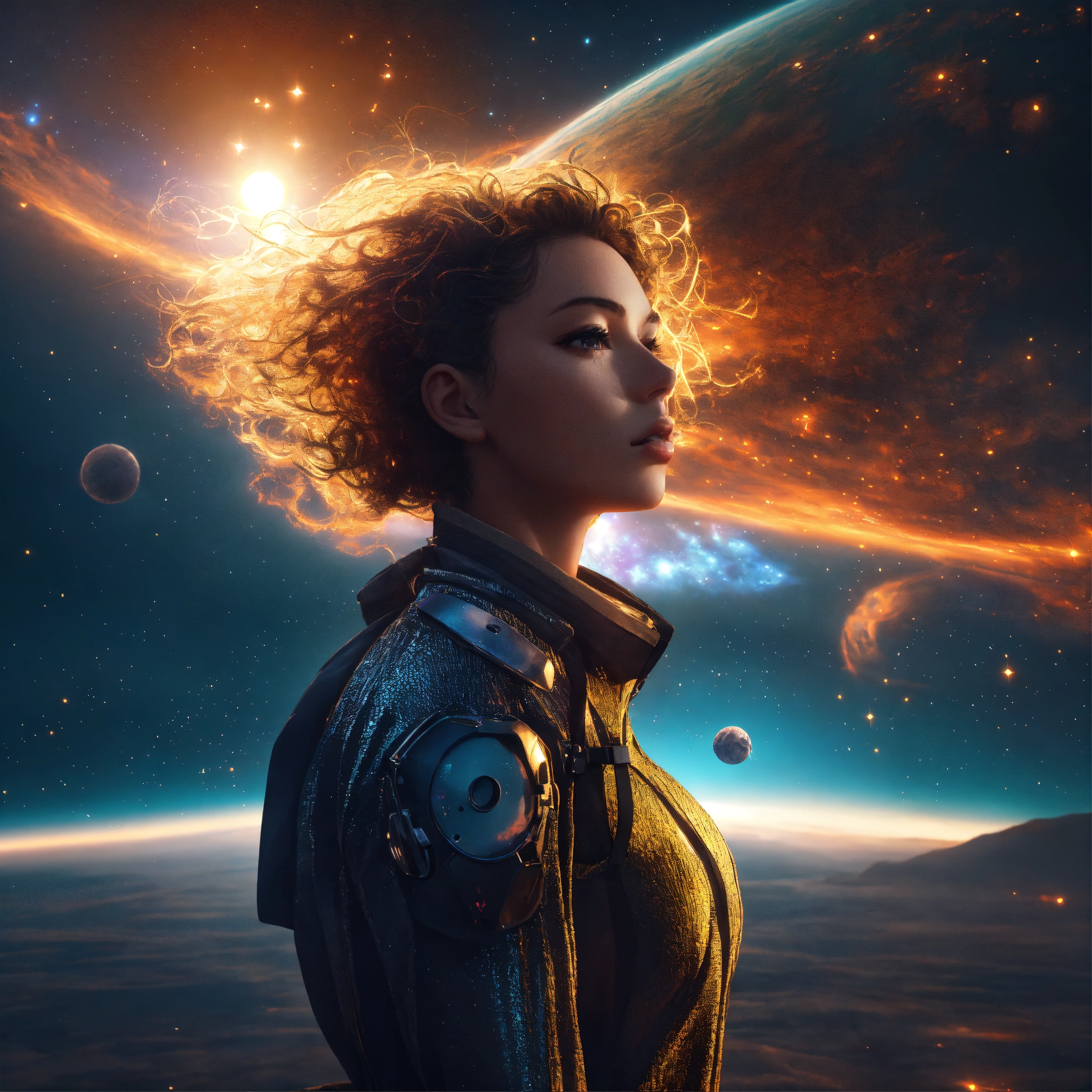 A young woman in a jumpsuit with her hair covering her face, space nebula, sun backgound, cinema 4d scifi 3d scene of a showing, hyper realism, realistic shading, realistic render, detailed textures, photorealistic, wide shot, landscape