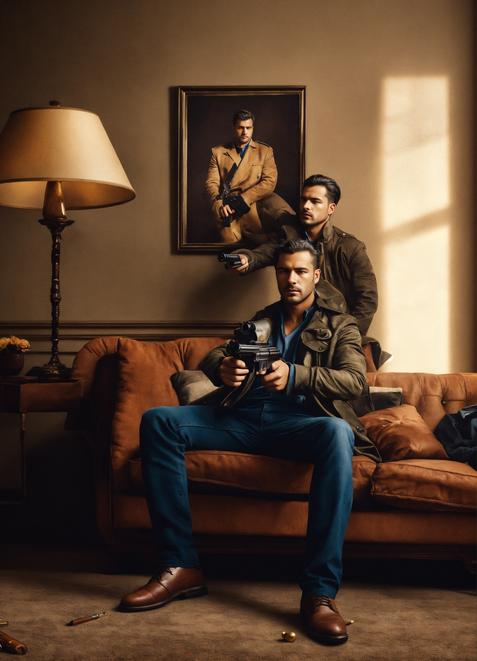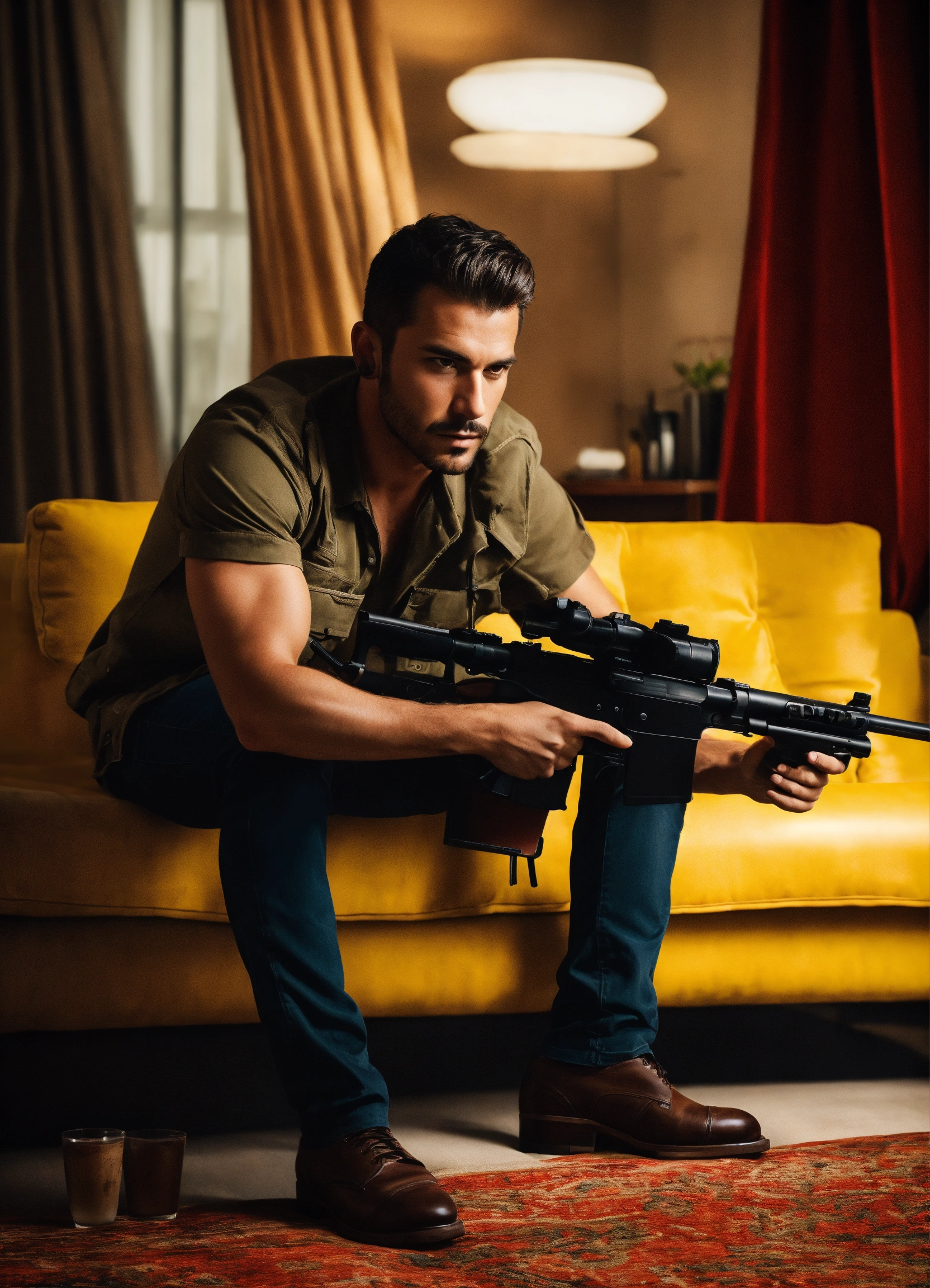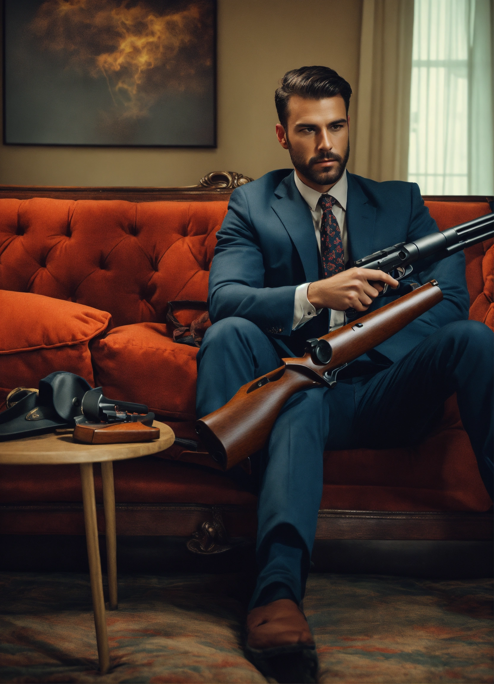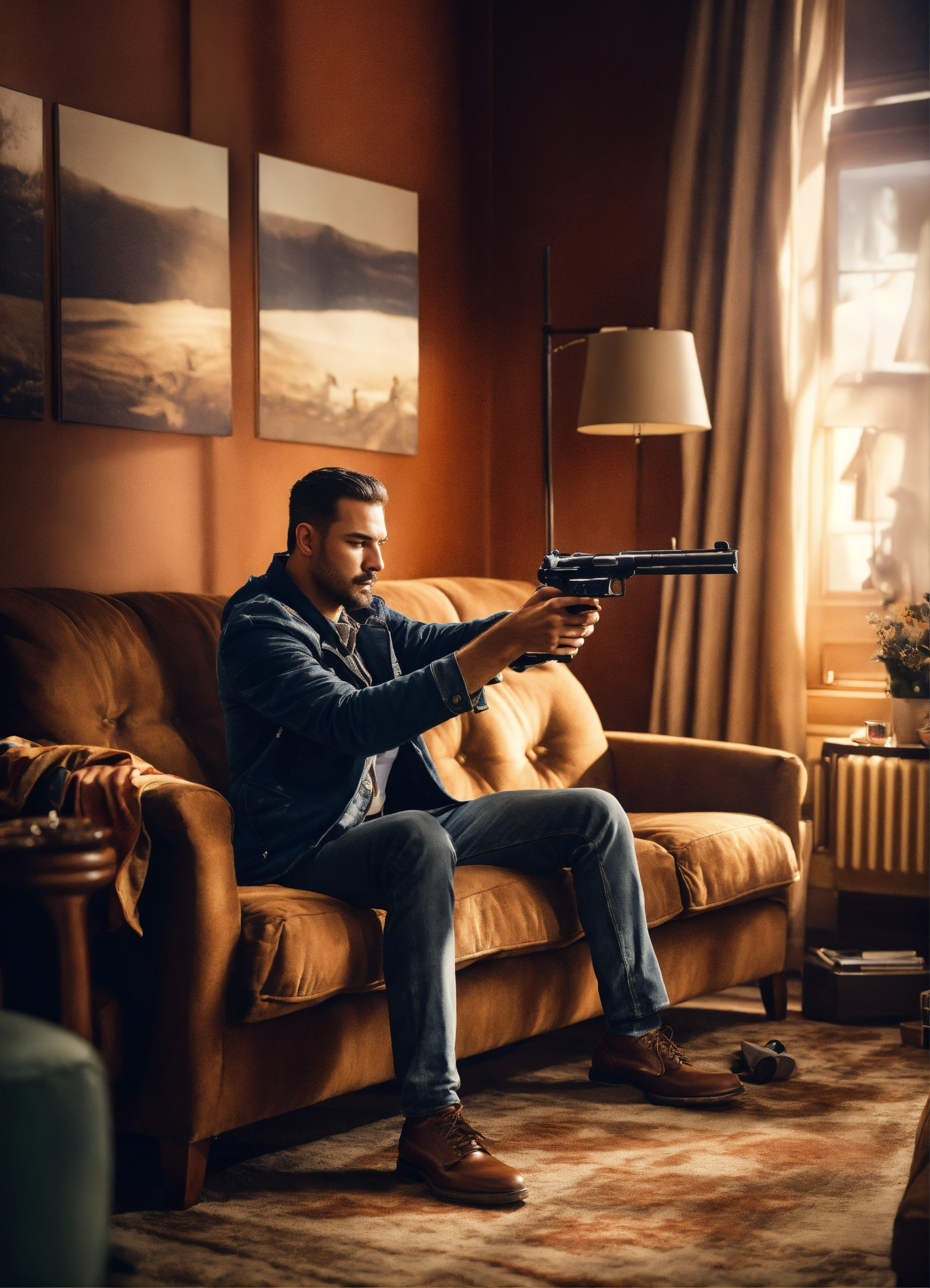 Create a poster of a man holding a gun while he is setting on a sofa make the photo realistic