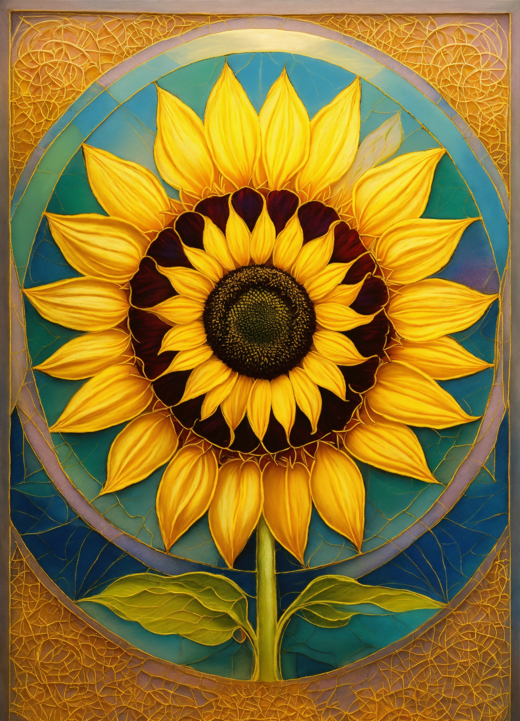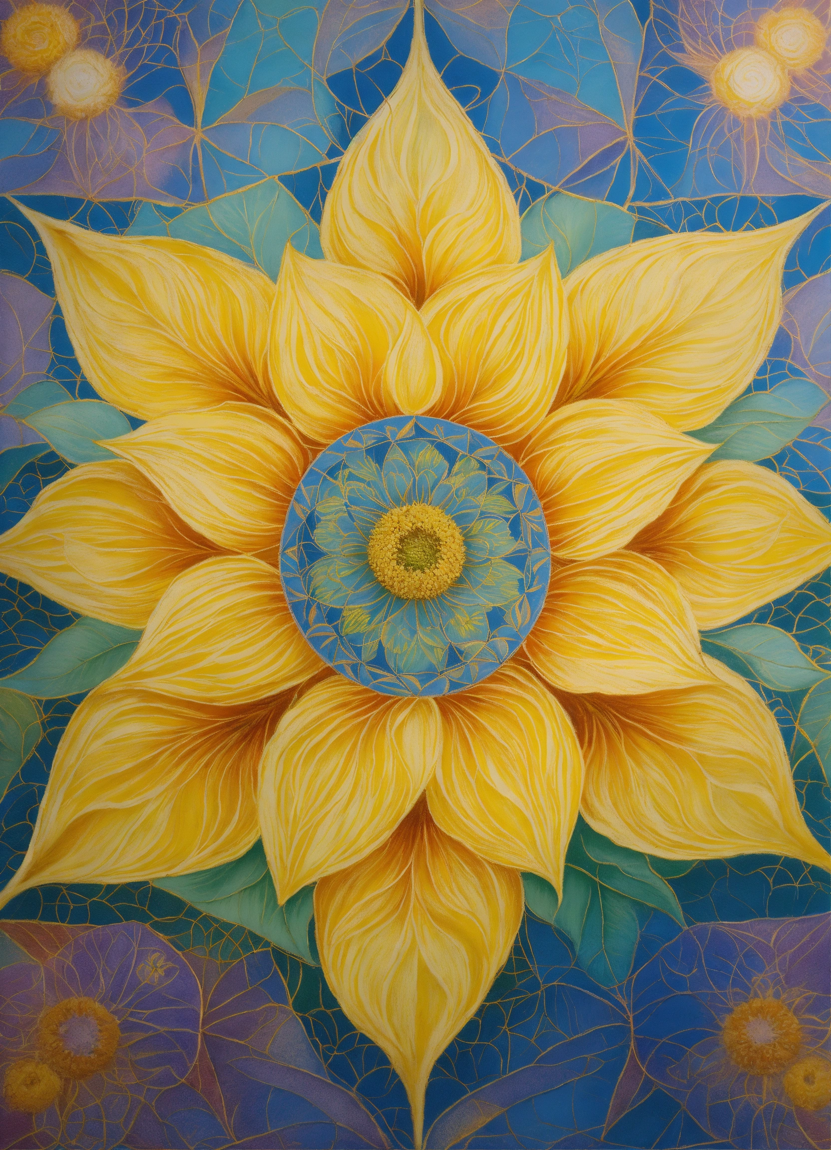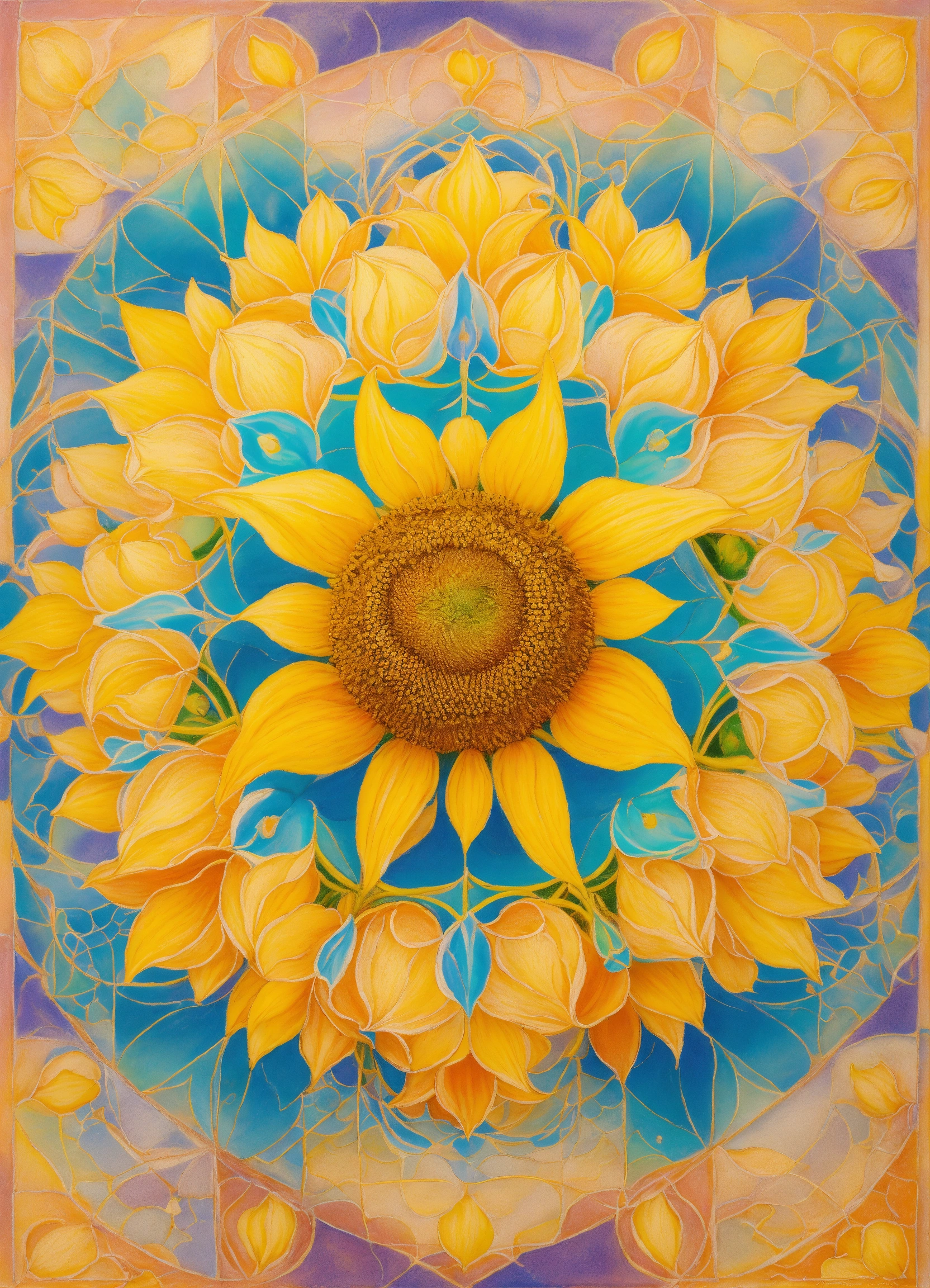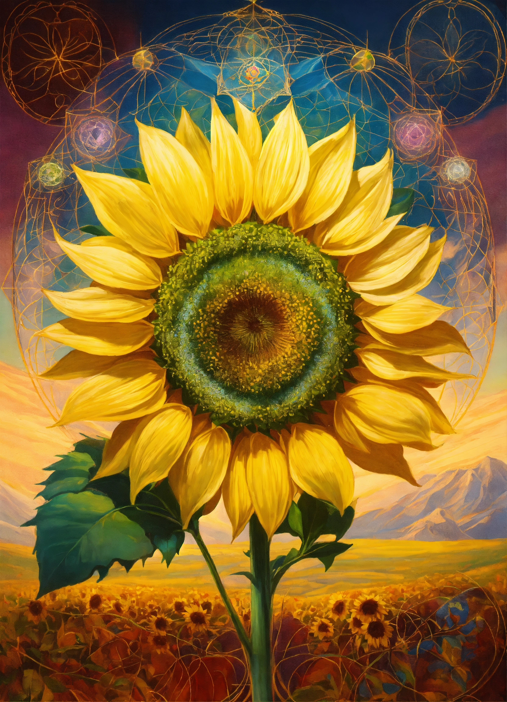 Fleur de tournesols symbole spirituel, adn, connected to other universes, to the invisible worlds, pastel colors, shinning light, sacred geometry