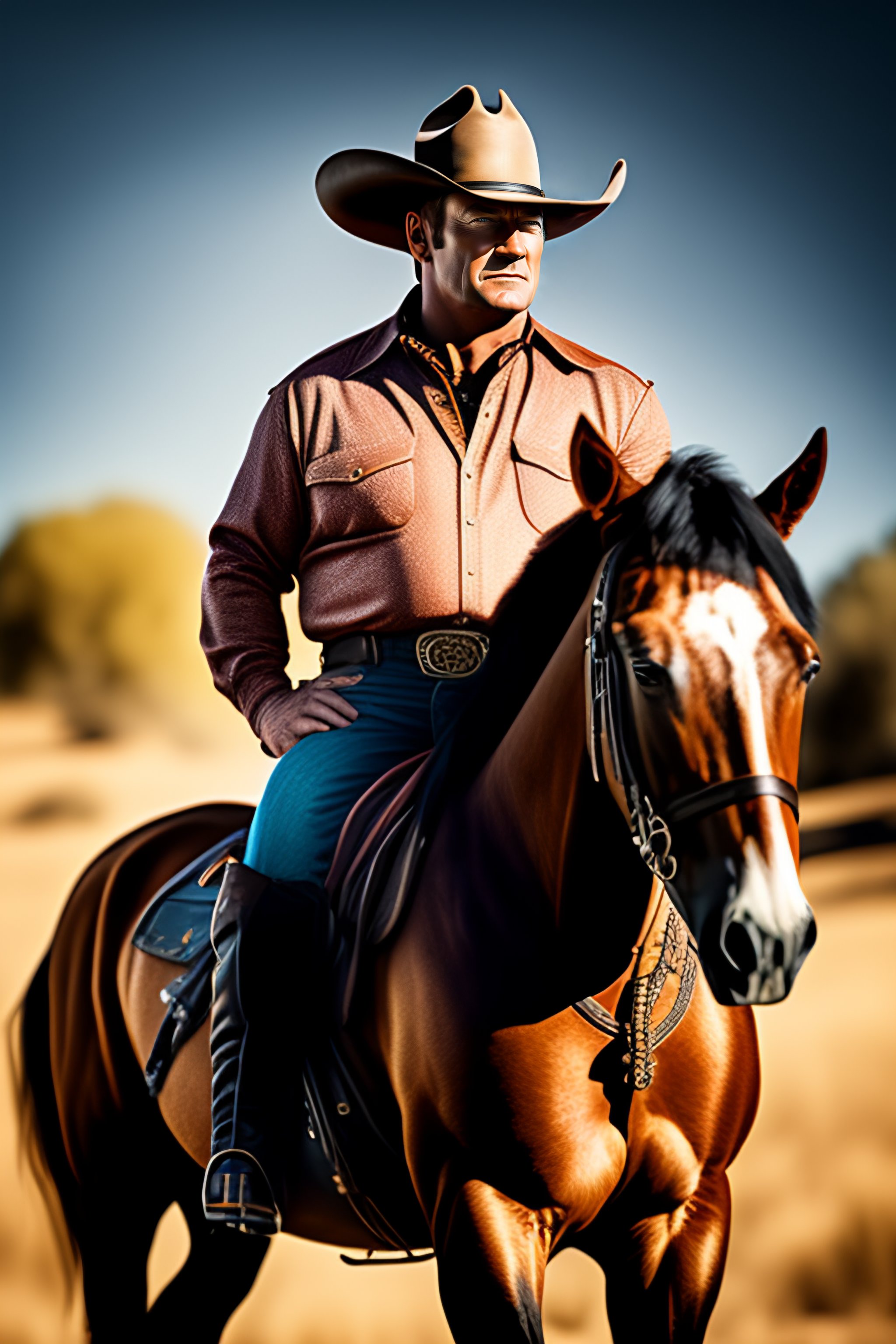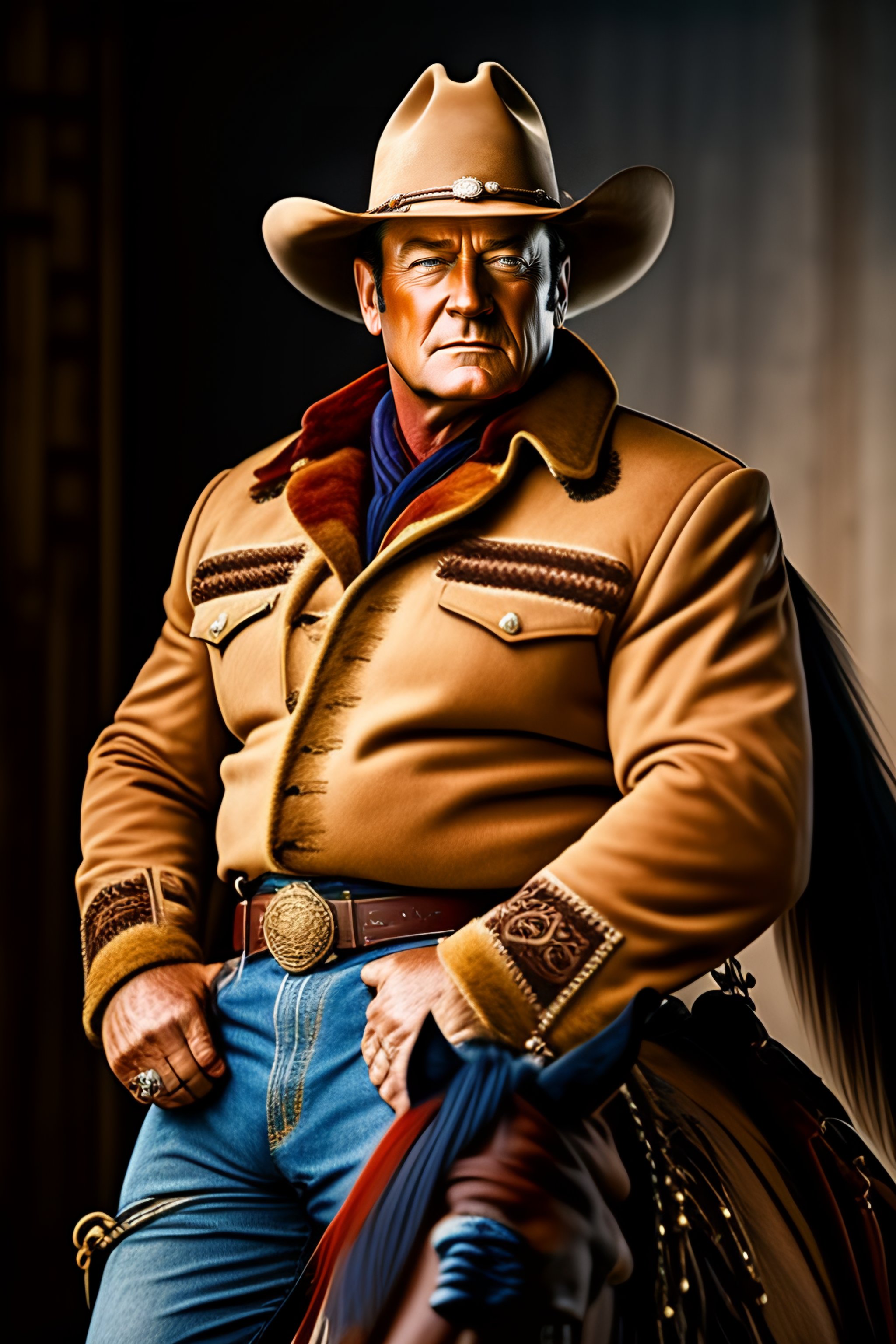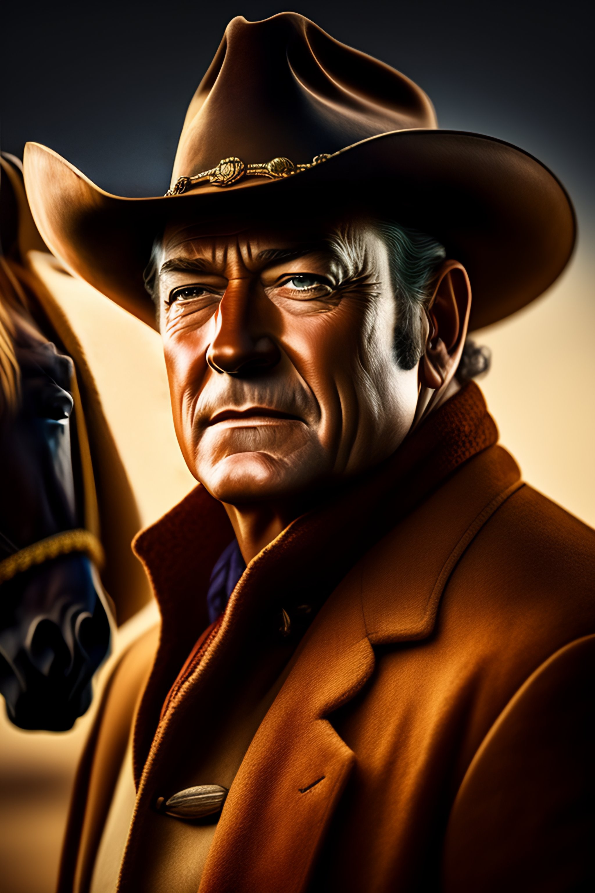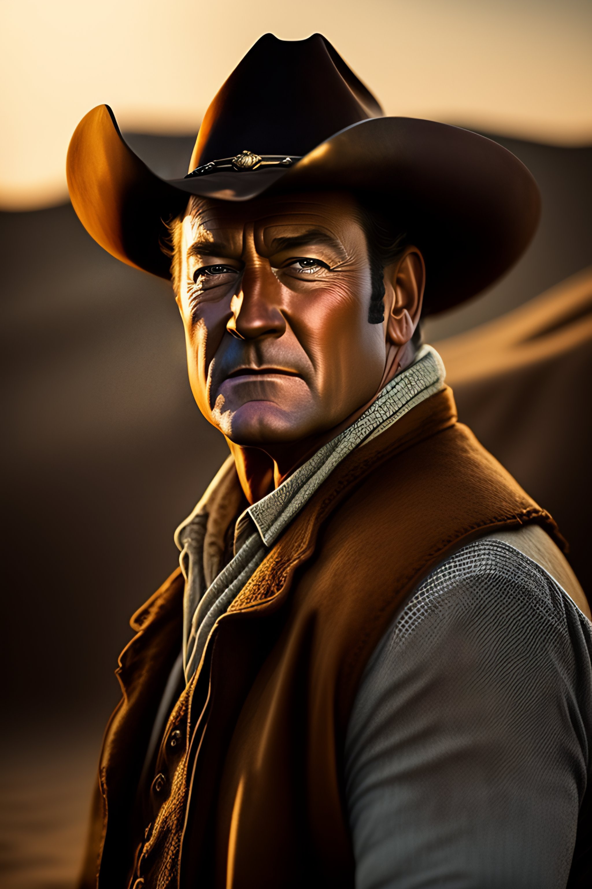 Photorealistic true-to-life portrait of 40-year-old john wayne as a cowboy in the style of rembrandt, studio lighting, bright summer day