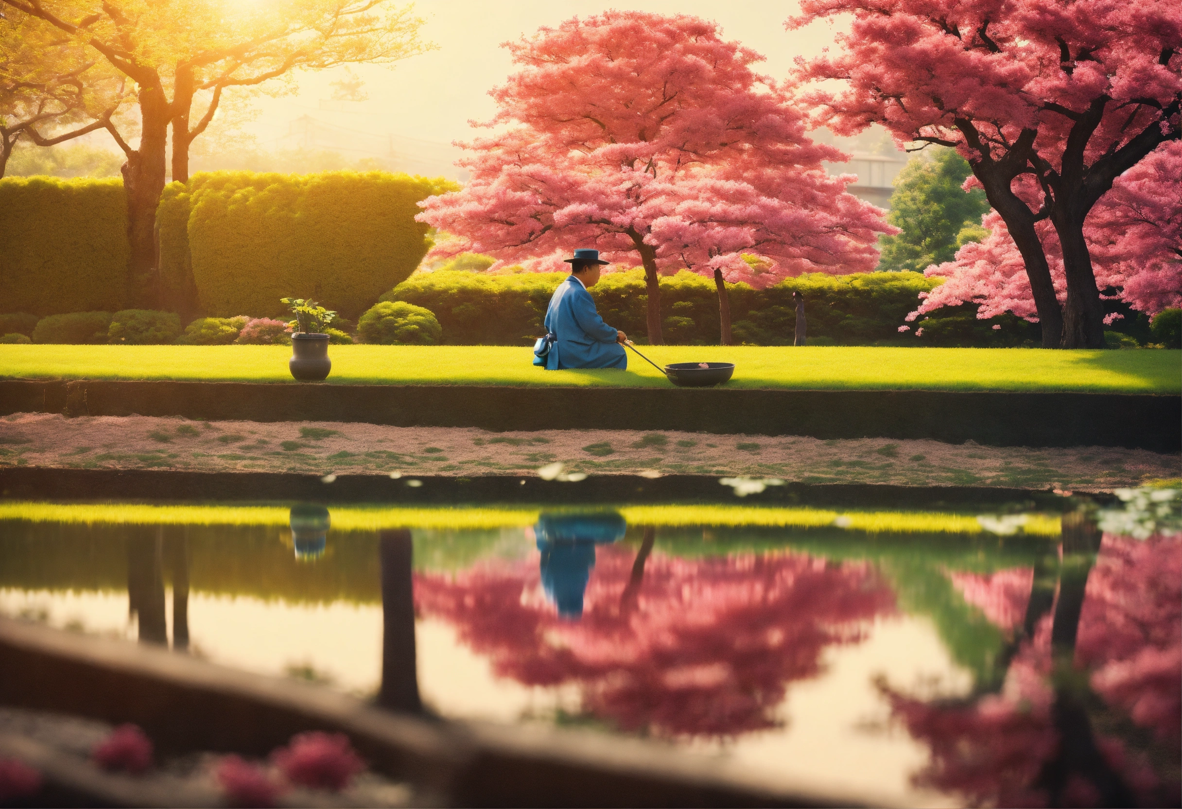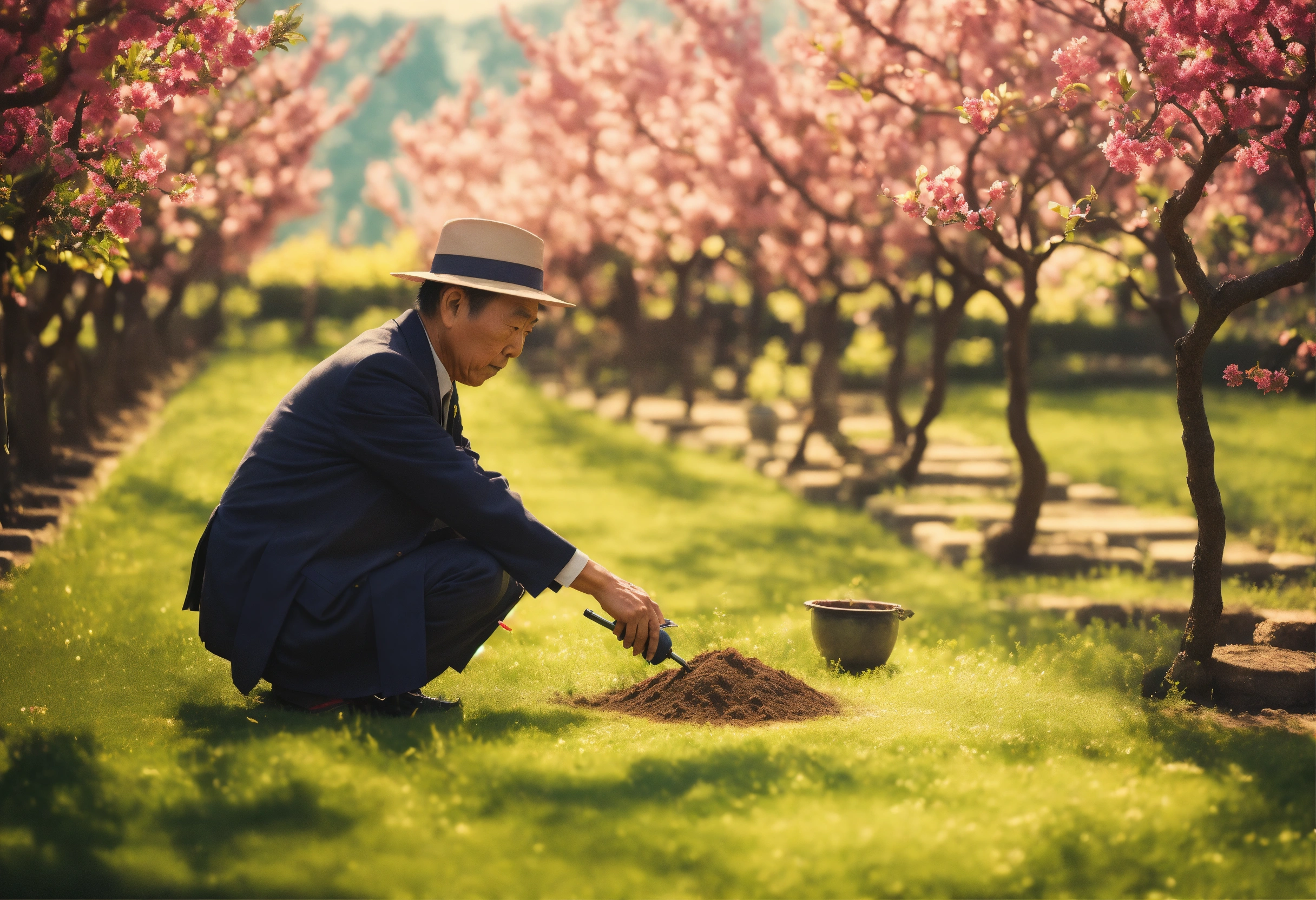 A wise japanese gentleman planting in a large garden with many fruit trees, on a beautiful sunny day, 4k, vintage photo, reflection, beautiful cinematography, surreal, film grain, hype, with detailed and relevant background 8k ultra realistic neon