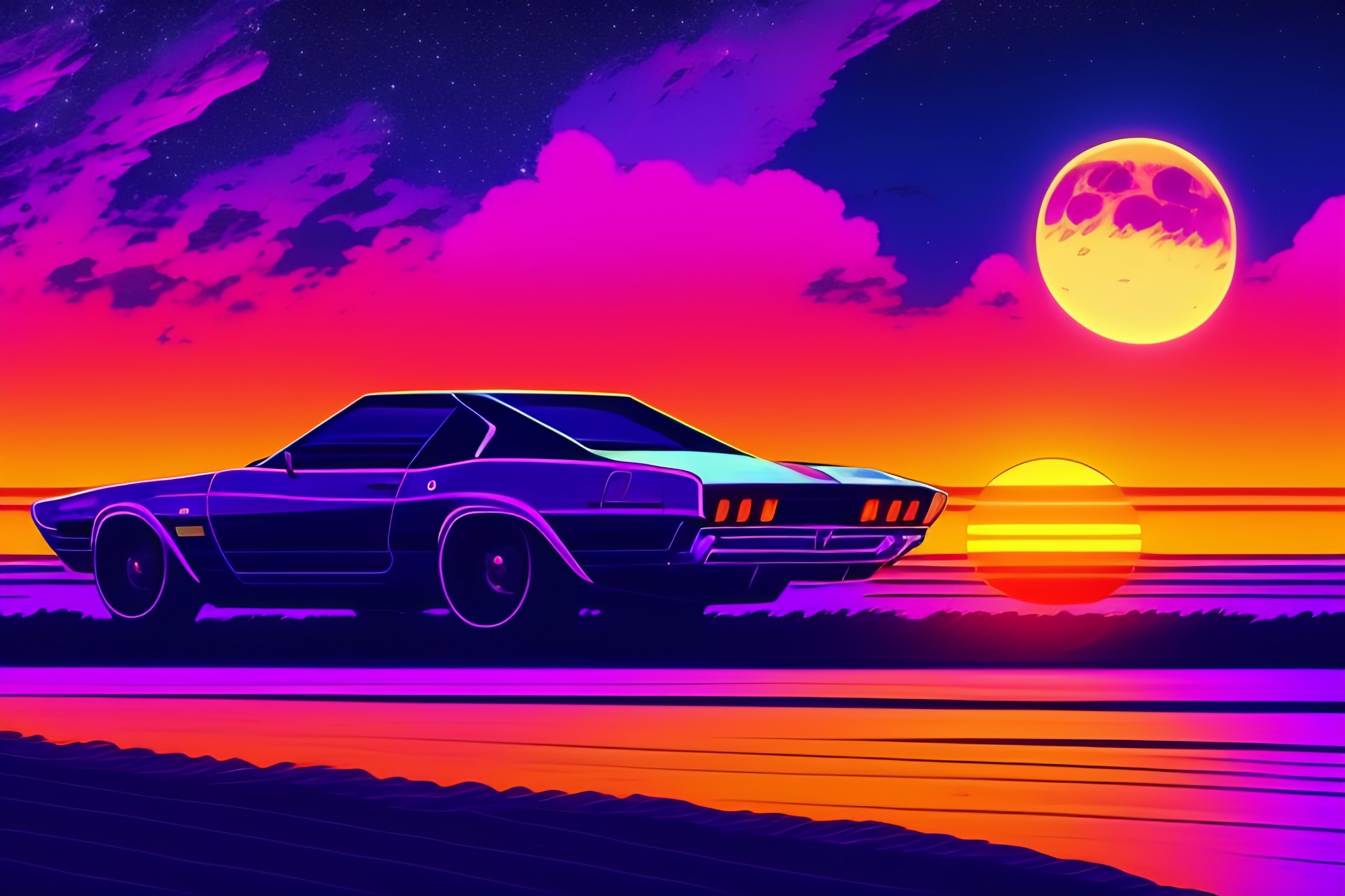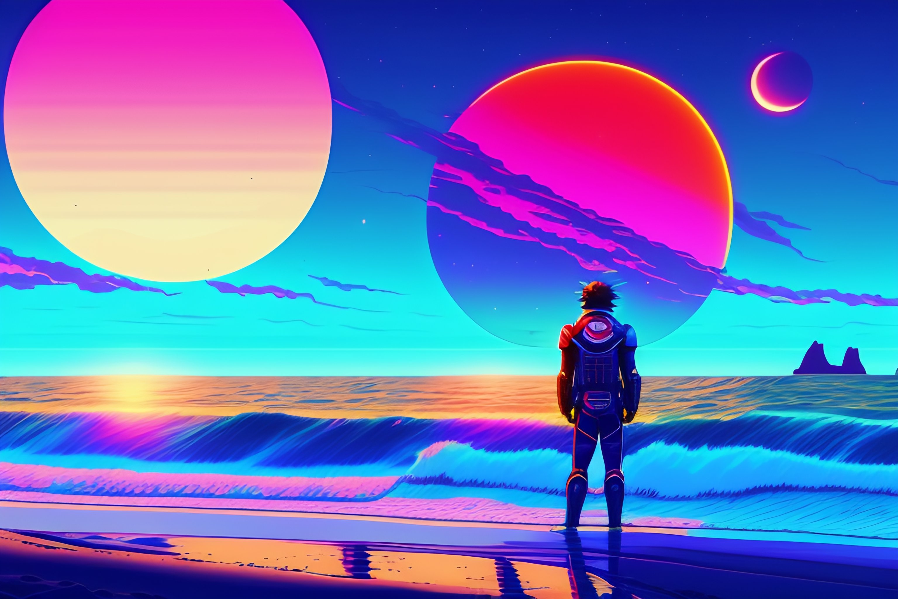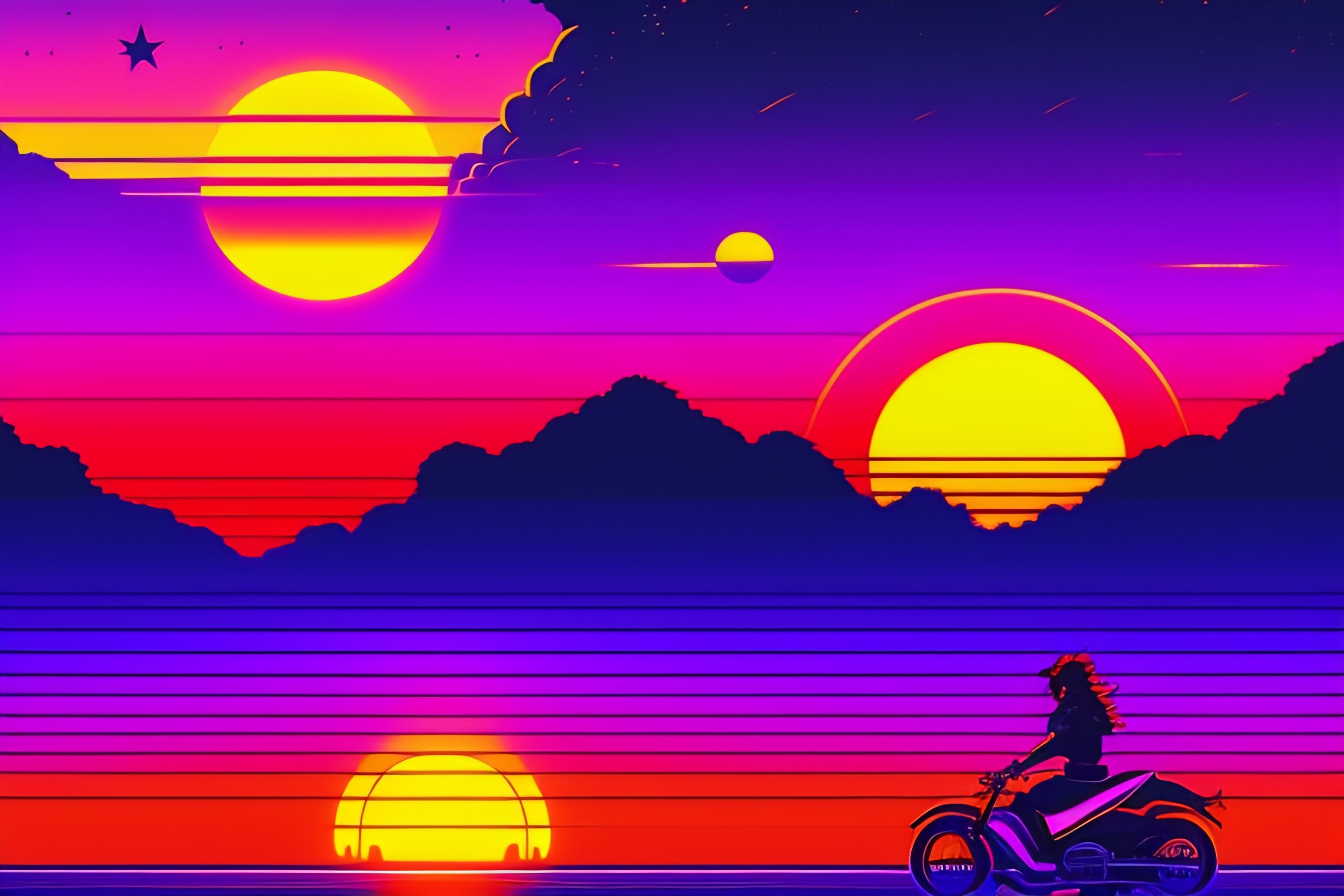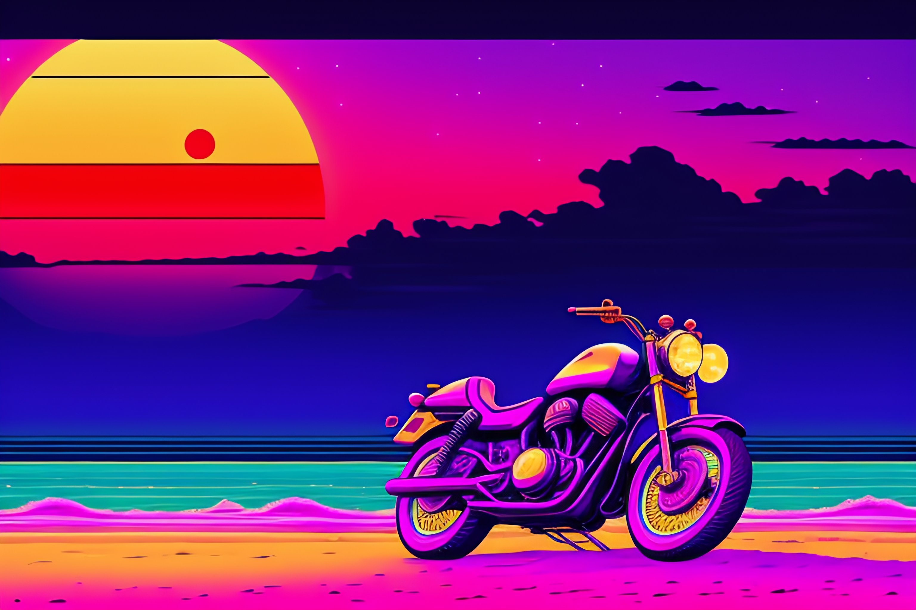 Sunset, beautiful synthwave, digital illustration, digital art, stars, moon, ocean, 80s motorcycle on the beach, anime style hero, retro art, reduced saturation