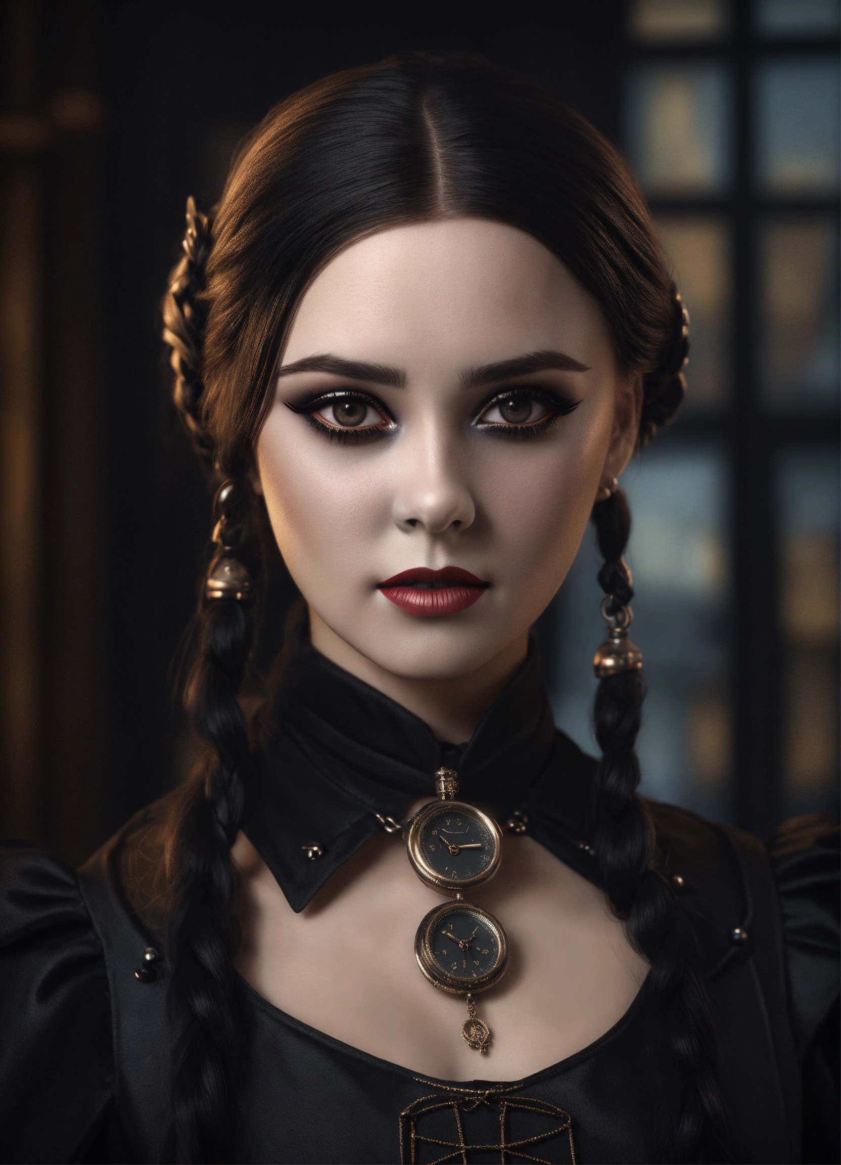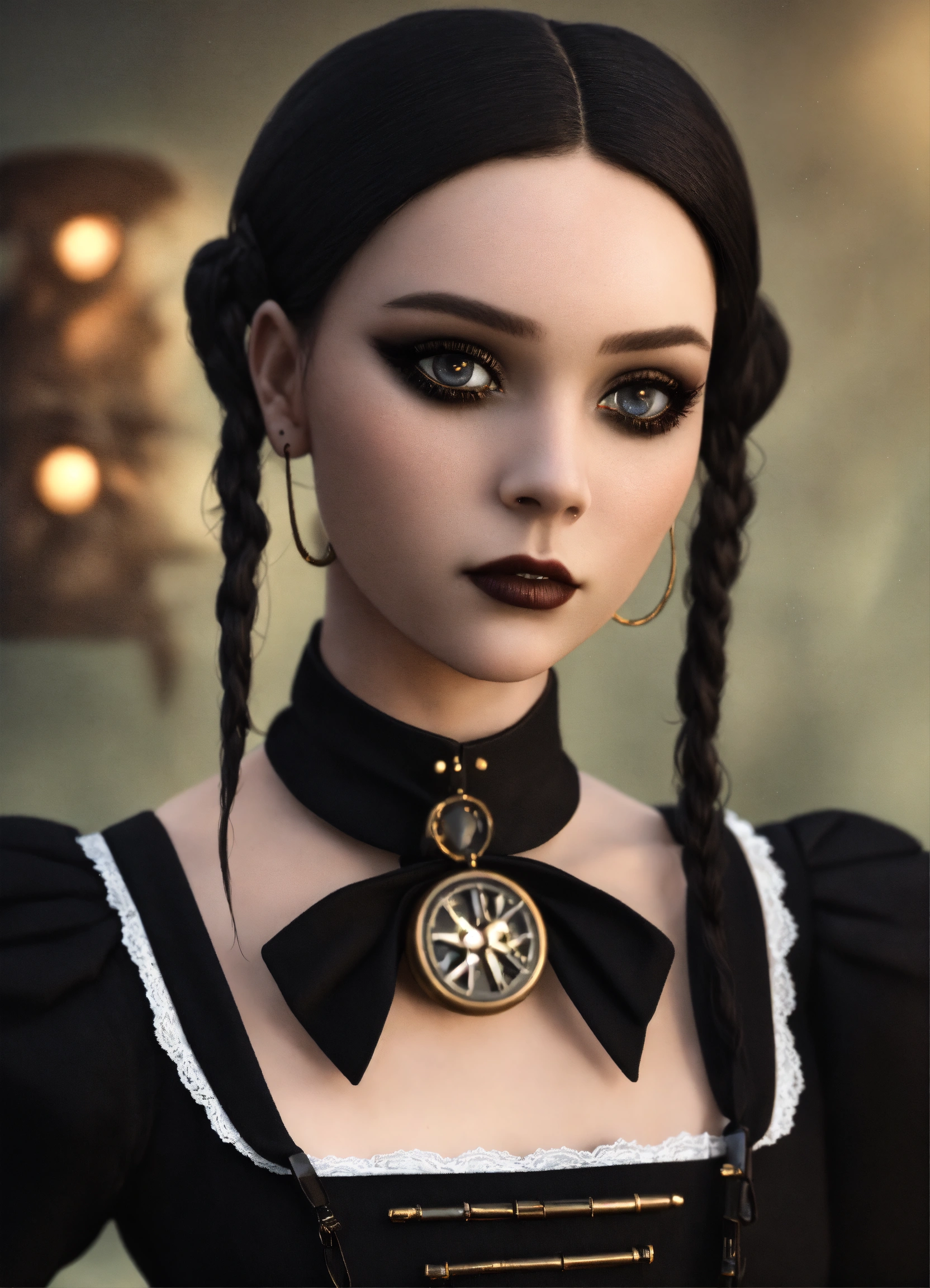 Young woman stunning wednesday addams evil expression wearing steampunk black clothes gothic makeup realistic 3d render --q 5 --ar 11