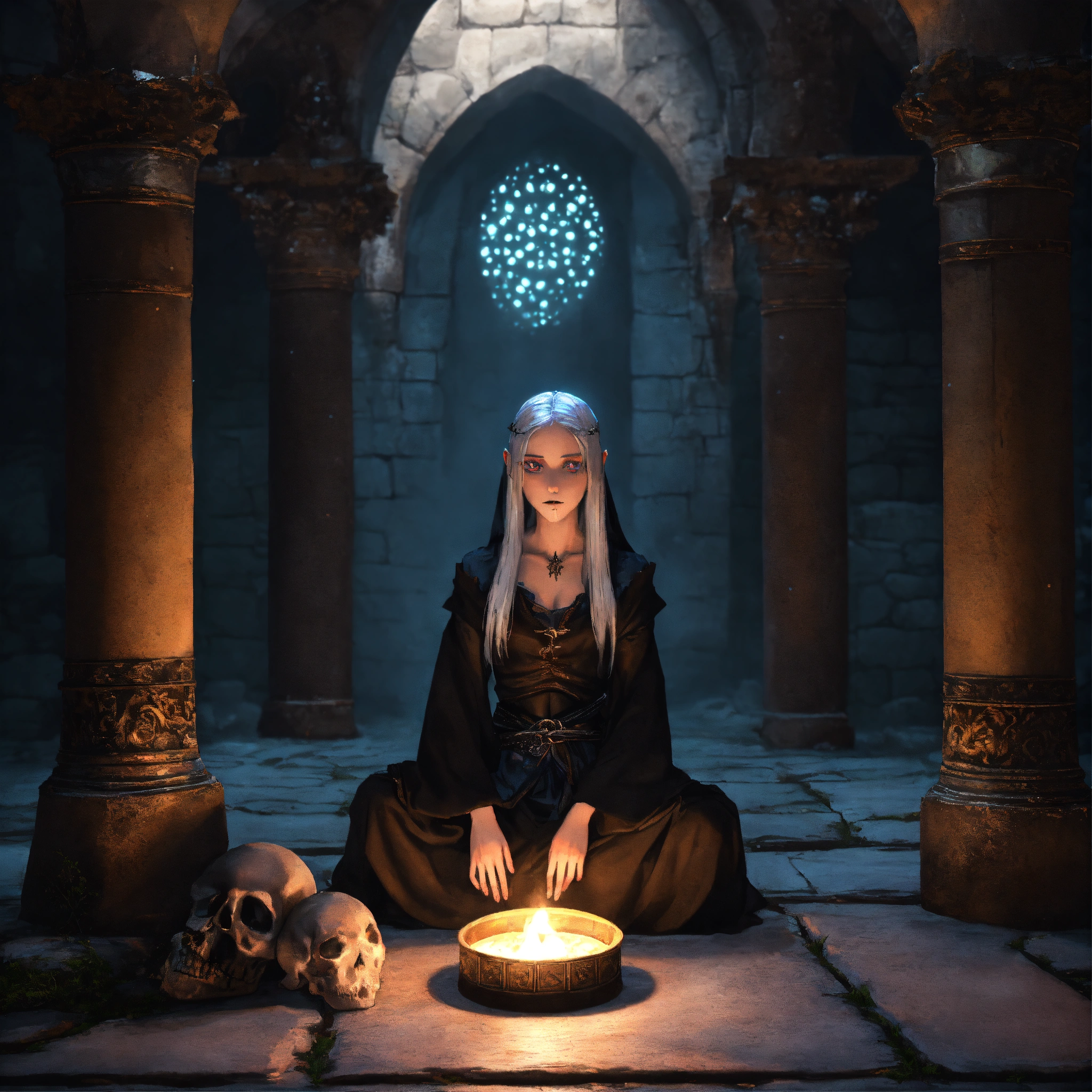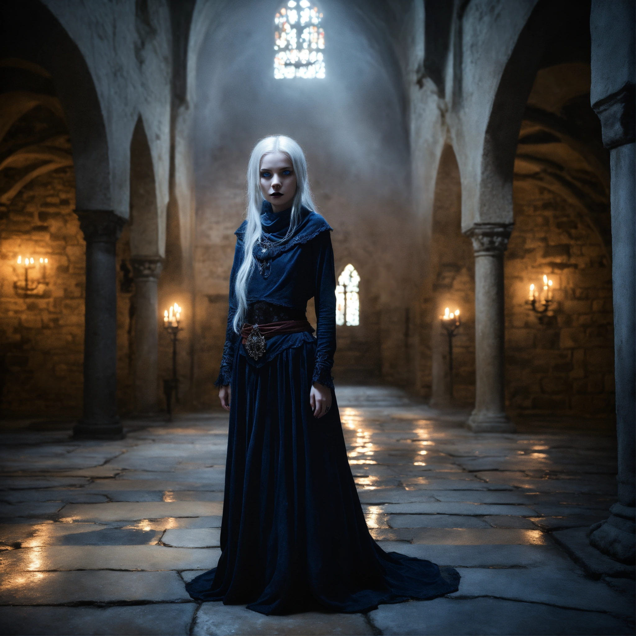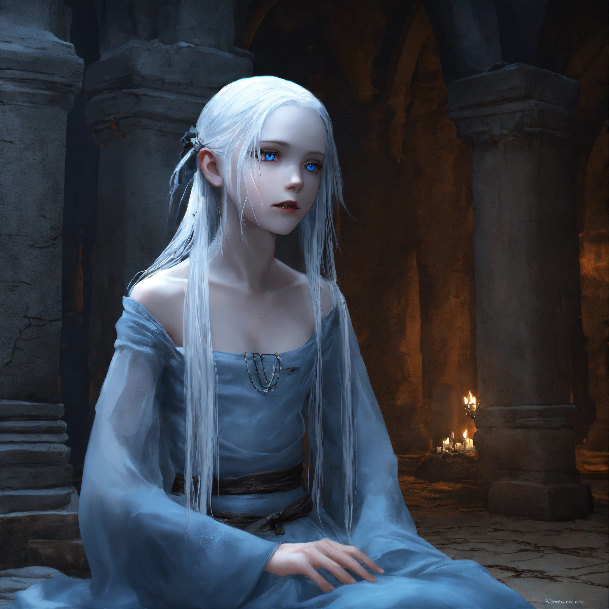 Body portrait, sehr kindhaftes deadly pale extremely slim twelve year old female child, she is a goth necromancer with waist long silverwhite hair and a short off-the-shoulder cropped top and a very low worn hip scarf, extremely flat belly, belly button, extremely skinny, extremely slim and emaciated body, completely emaciated, extremly narrow face, alabaster skin, pale as a corpse, glowing blue eyes, slim face, thin body, innocent looking, kneels on the stone floor in a gloomy crypt, kindlich, unschuldig, childlike, juvenile, graceful, wispy, glowing blue eyes, ghostly, dead, evil, demonic, undead, darkness, grotesque, mysterious, dark, dark, cold ambient lighting, extremely detailed, fantasy, medieval setting