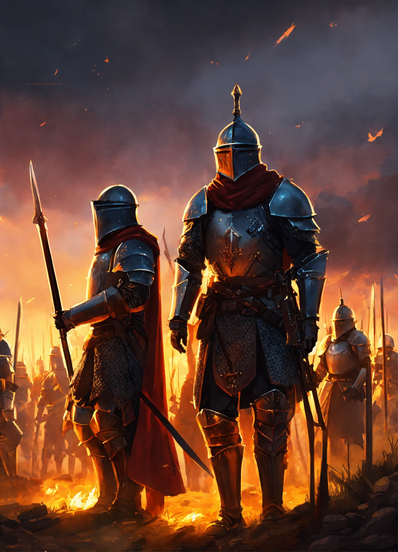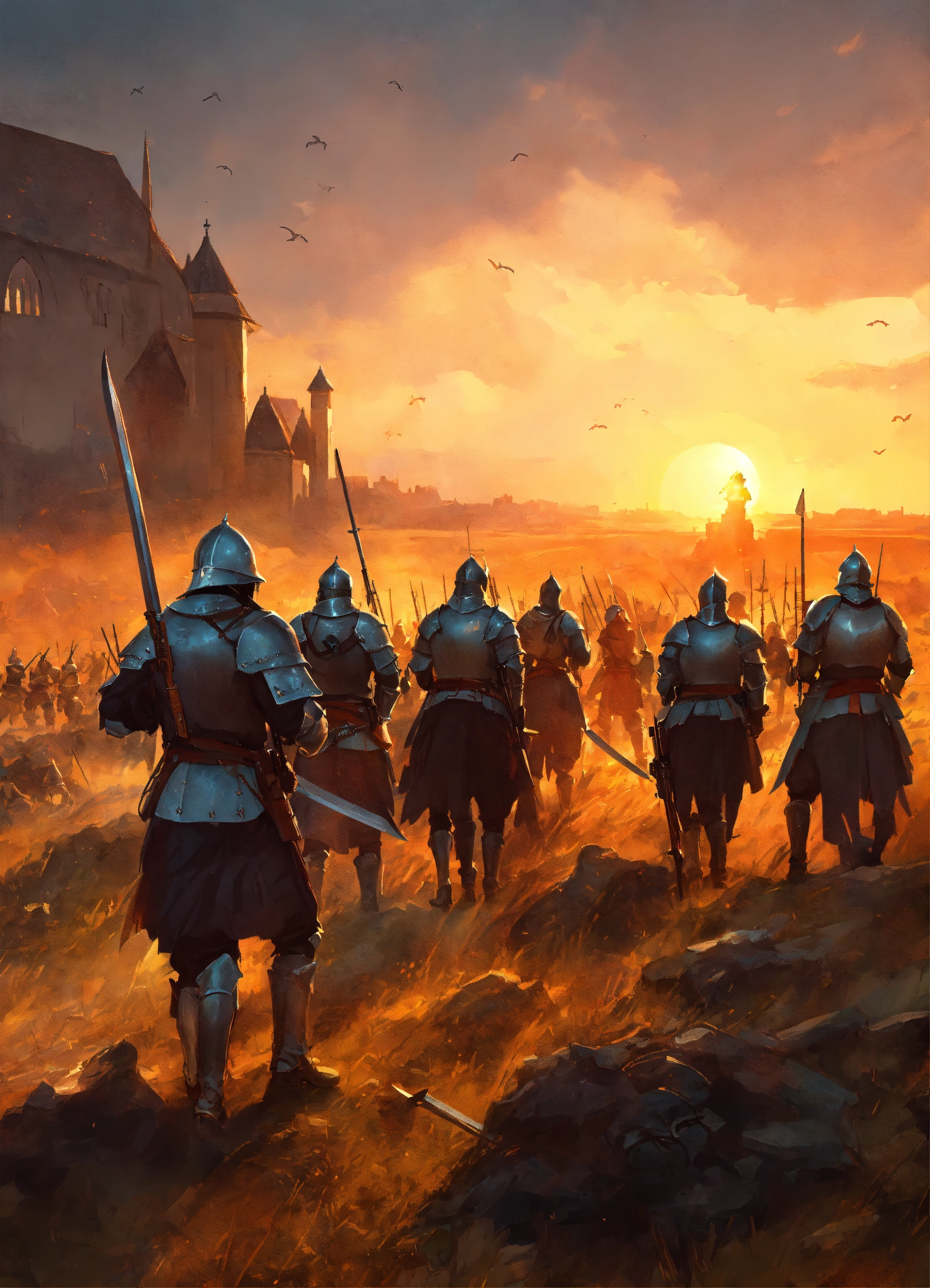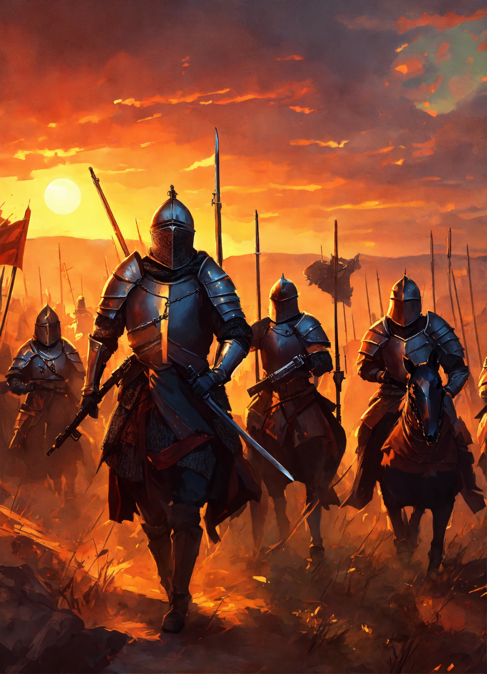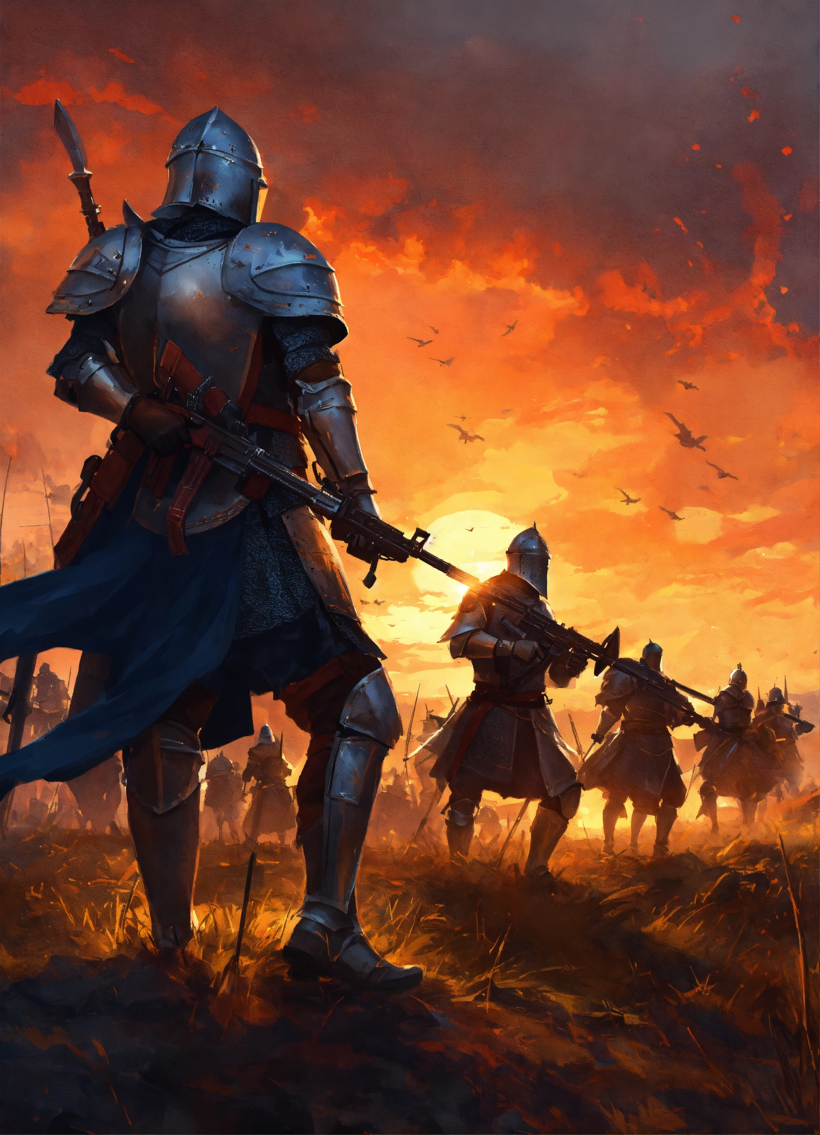 Concept art of a medieval battleground with knights holding ak47s and other assault rifles and swords, the sun sets behind them casting a glow onto the battlefield