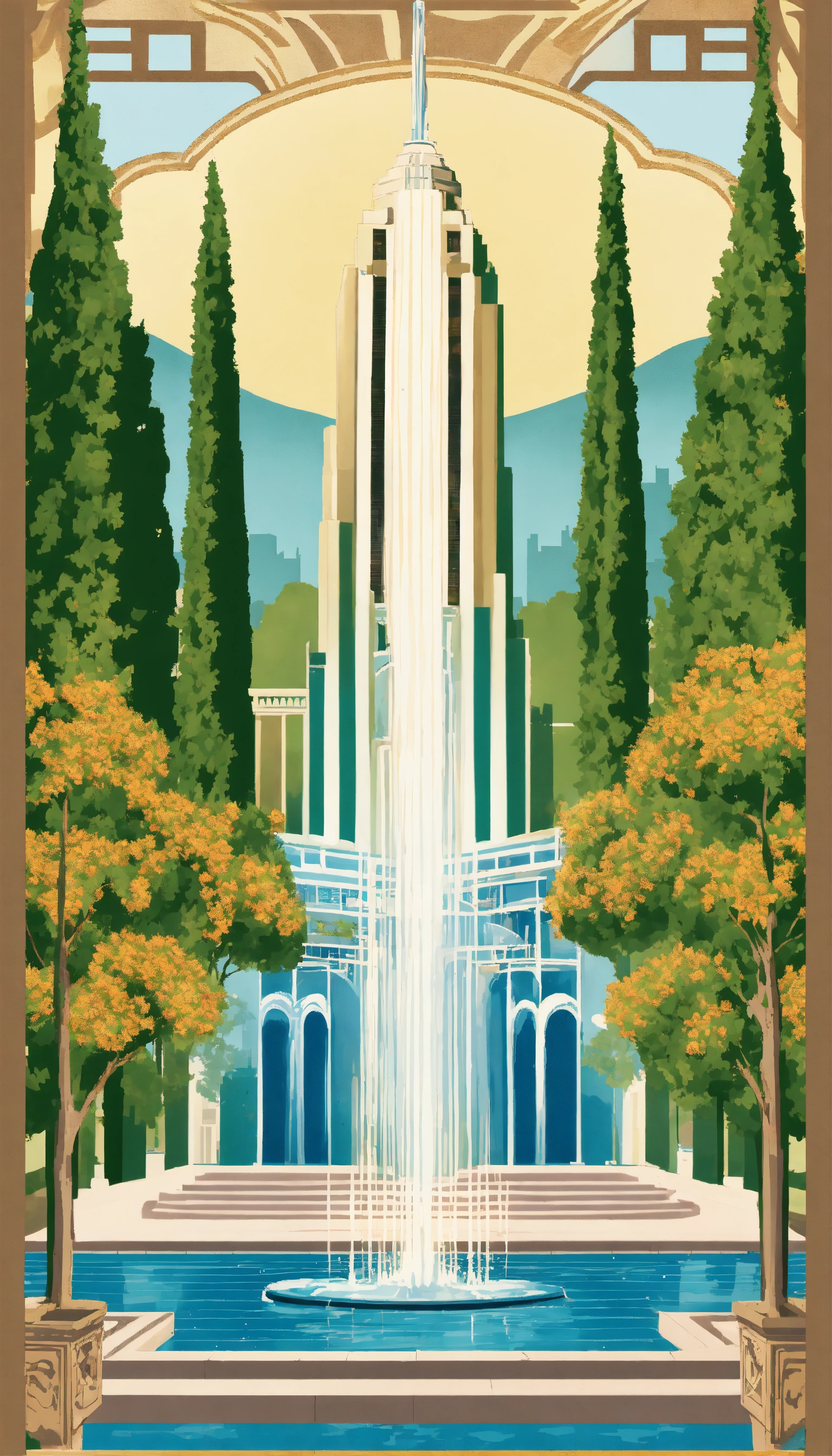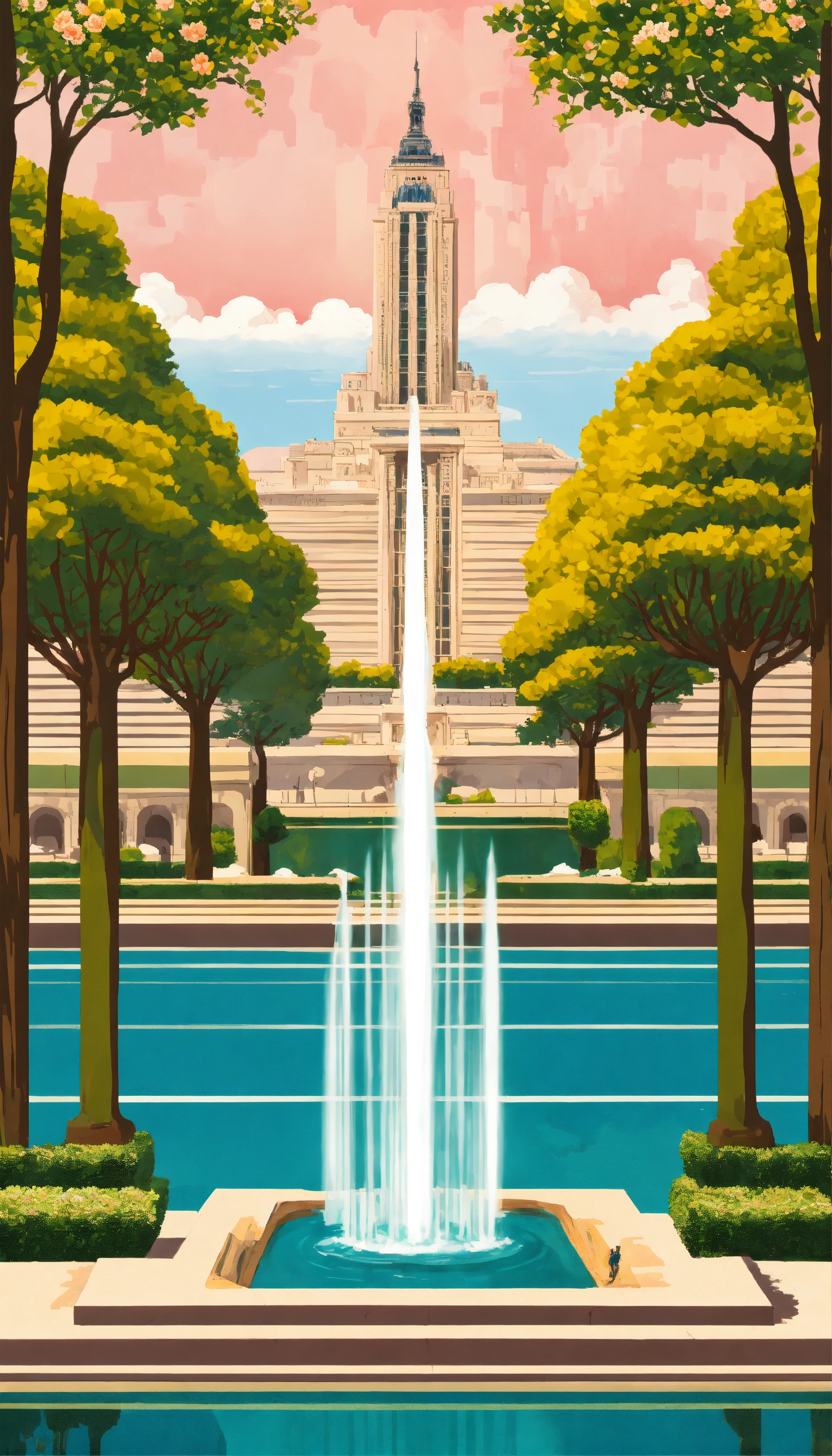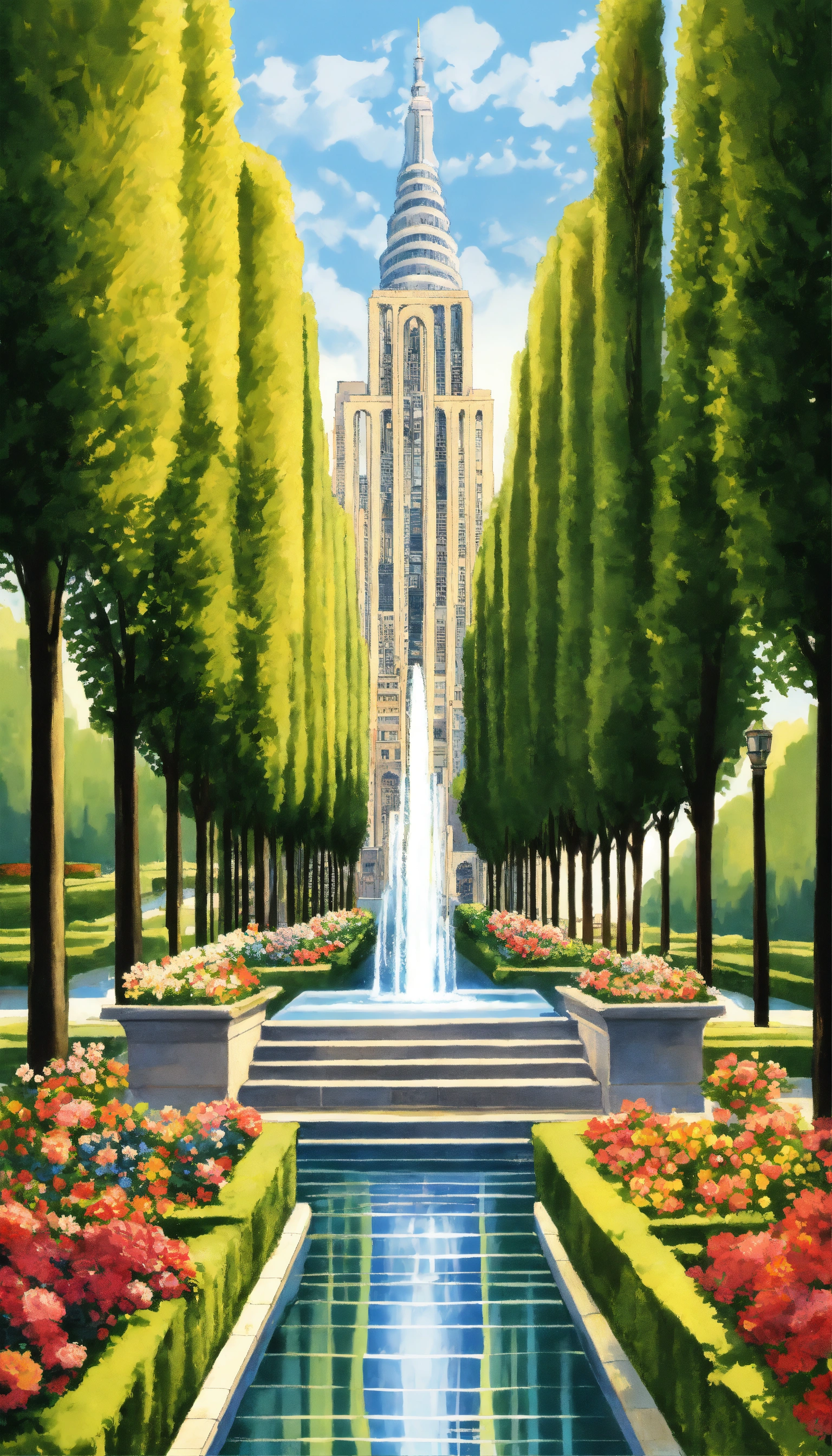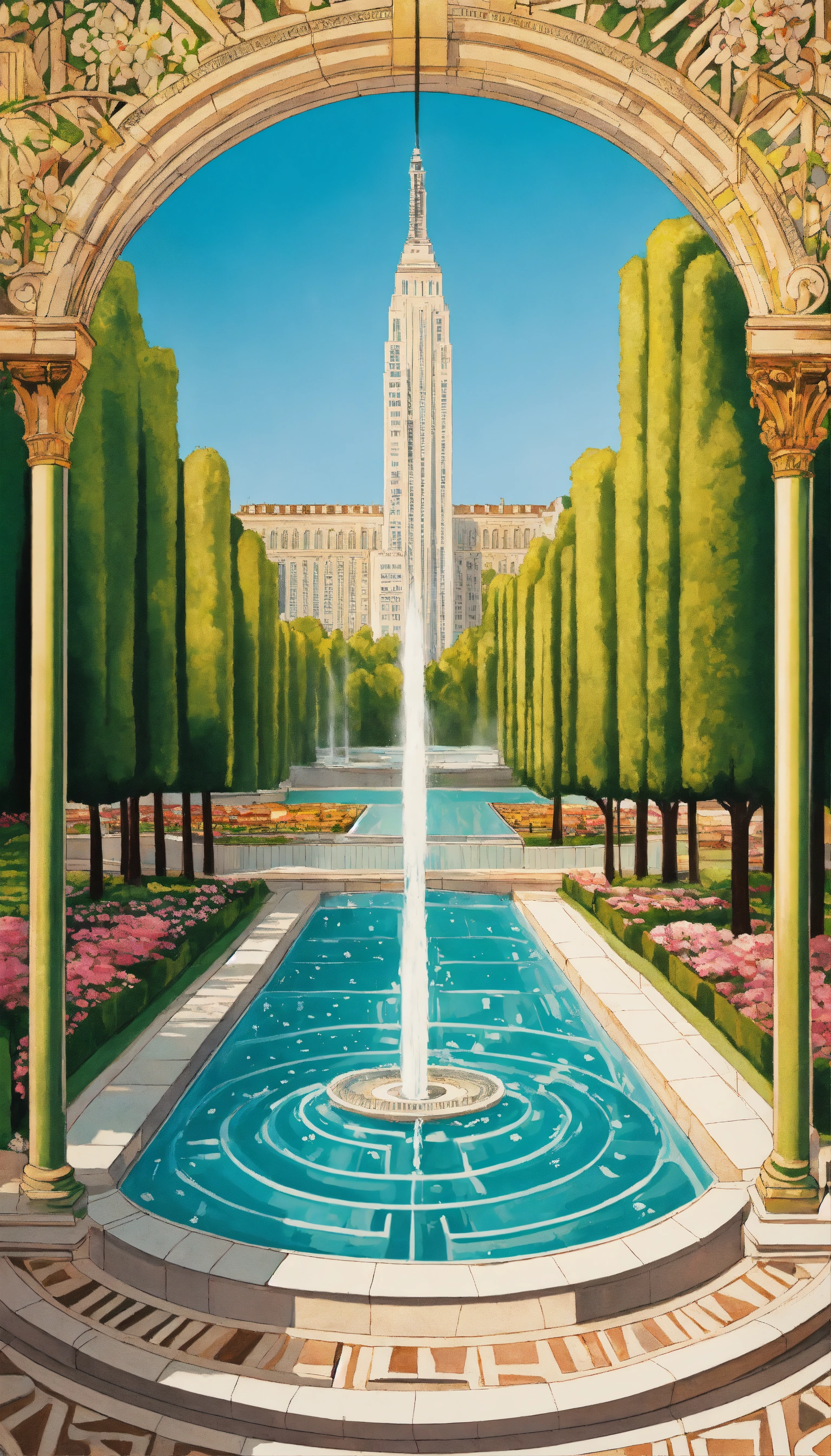 Water falls, the geneva water fountain jet d’eau, cypress trees tall, flowers, art deco pattern maze, pool canal, ornade sculpted stone masonry haussmannian parisian style empire state building with french roof tops, hérgé style illustration, symmetrical symmetry