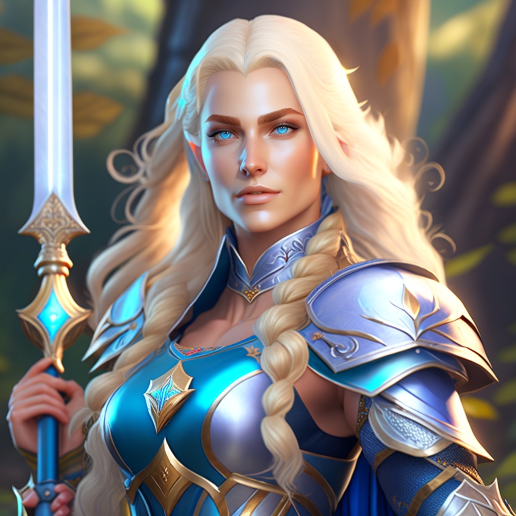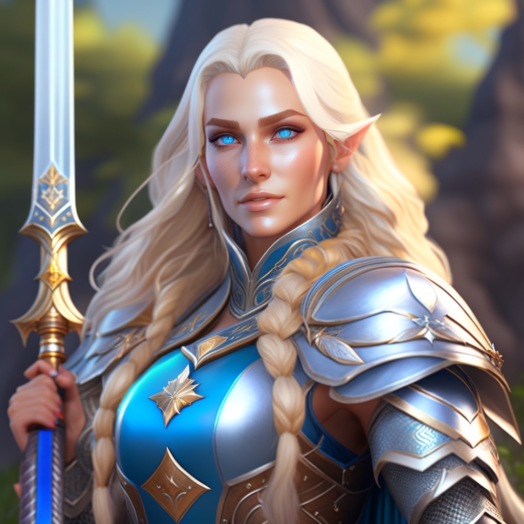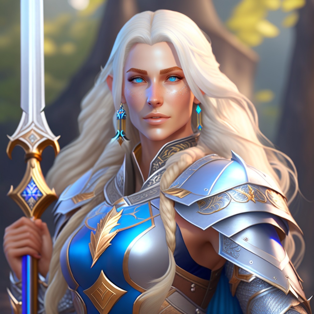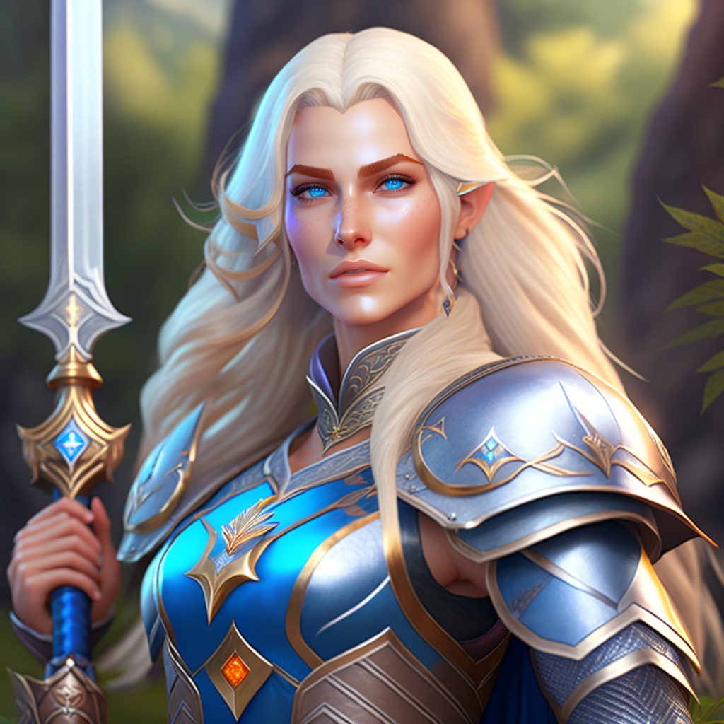 A beautiful female elf knight, pointed ears, full body shot, 8k, hyper realistic photograph, beautiful face, glowing blue eyes, long wavy light blonde hair, plate armor, holding runed longsword, hyper detailed, fantasy, medieval, elven, magus, battlemage, muscular, scar on face, vibrant colors, attractive, global illumination, detailed and intricate environment