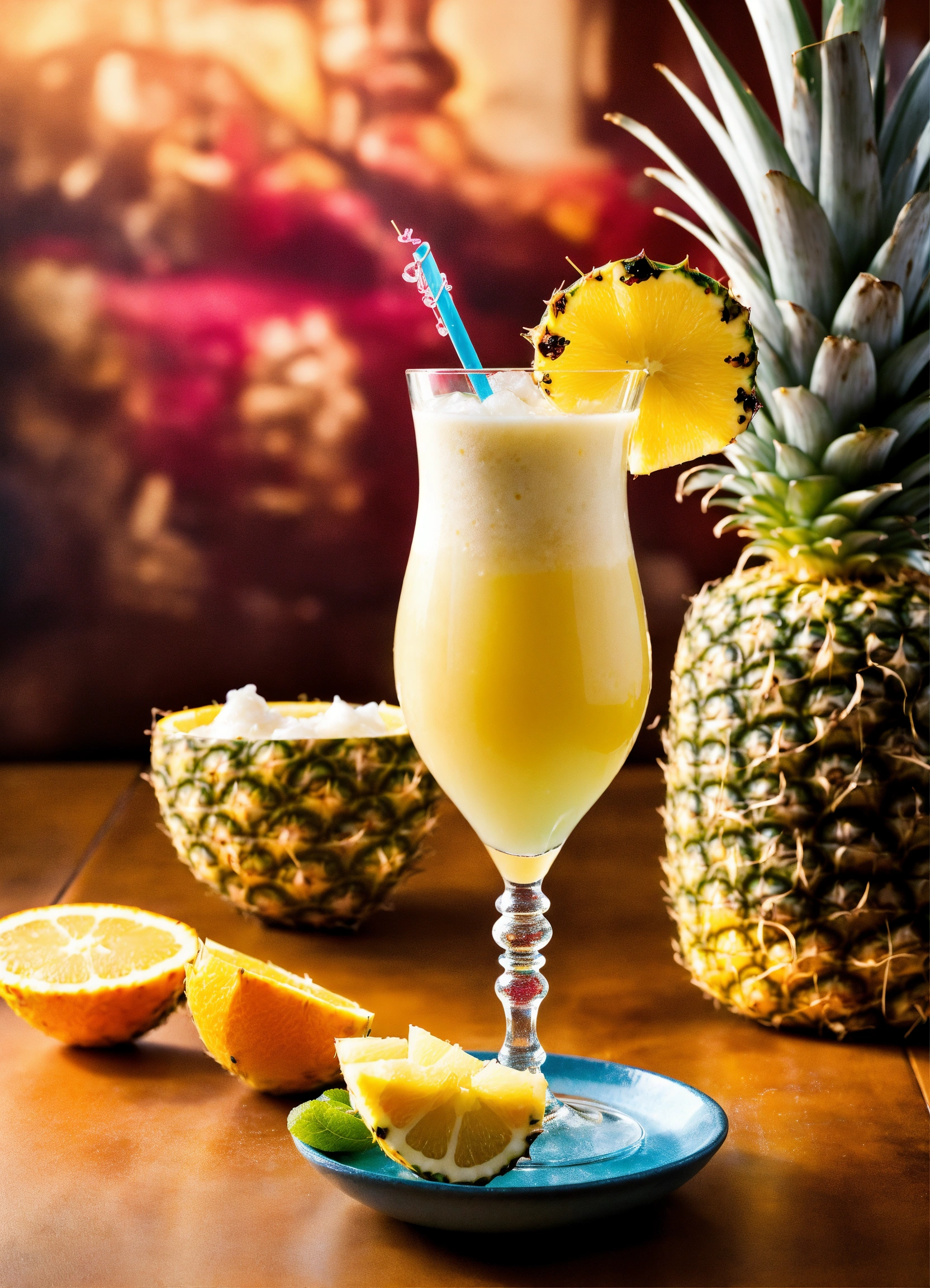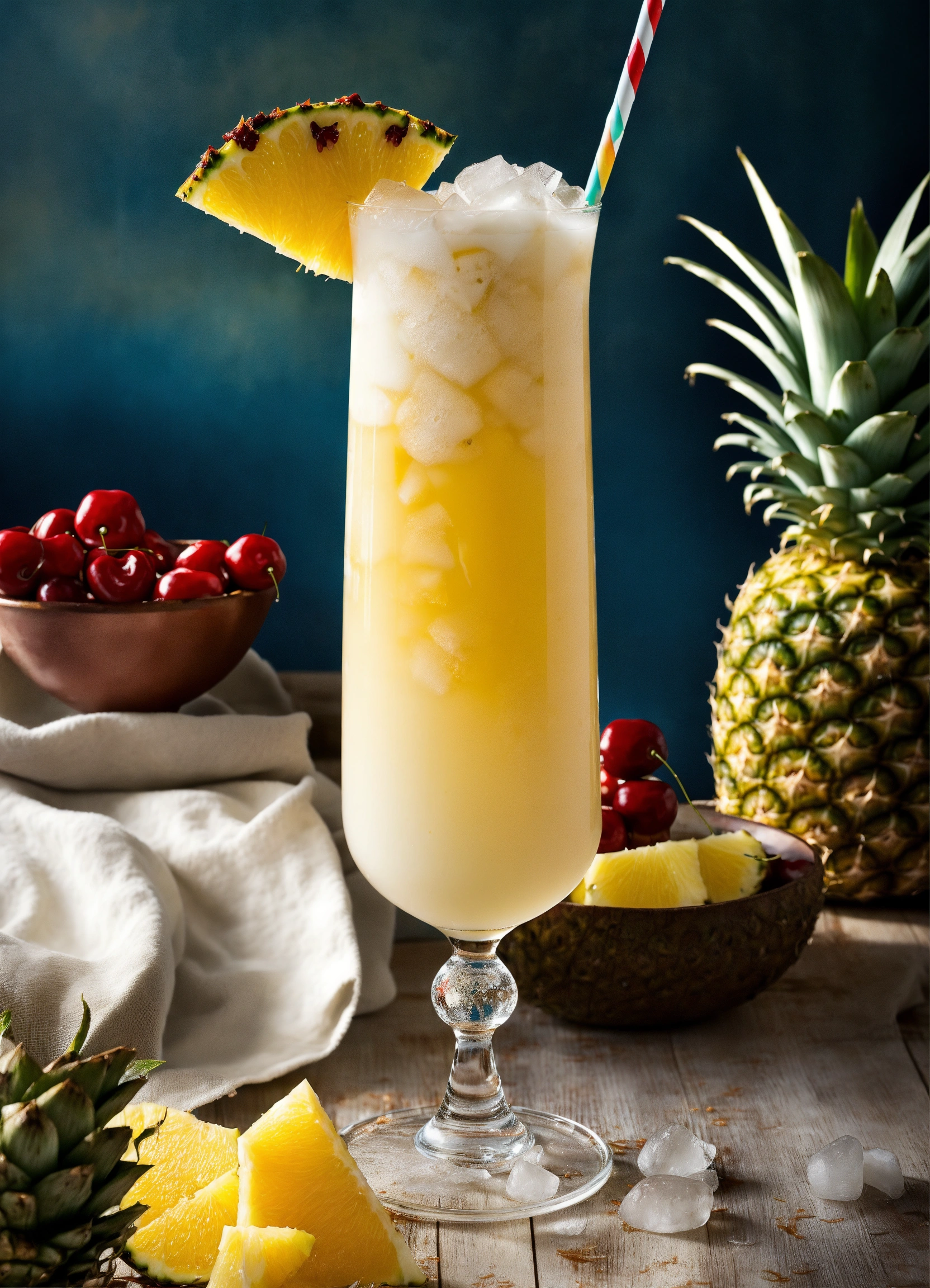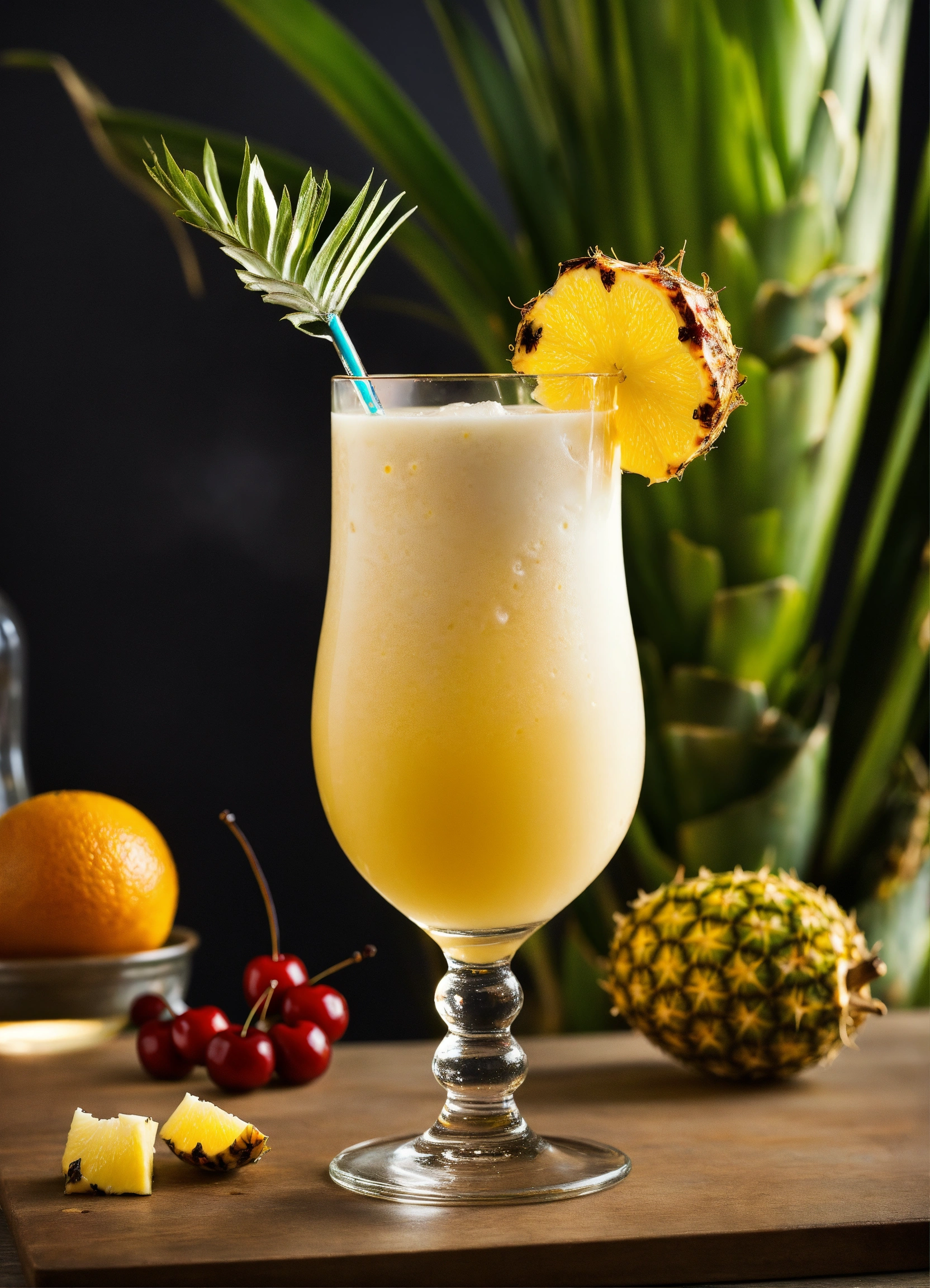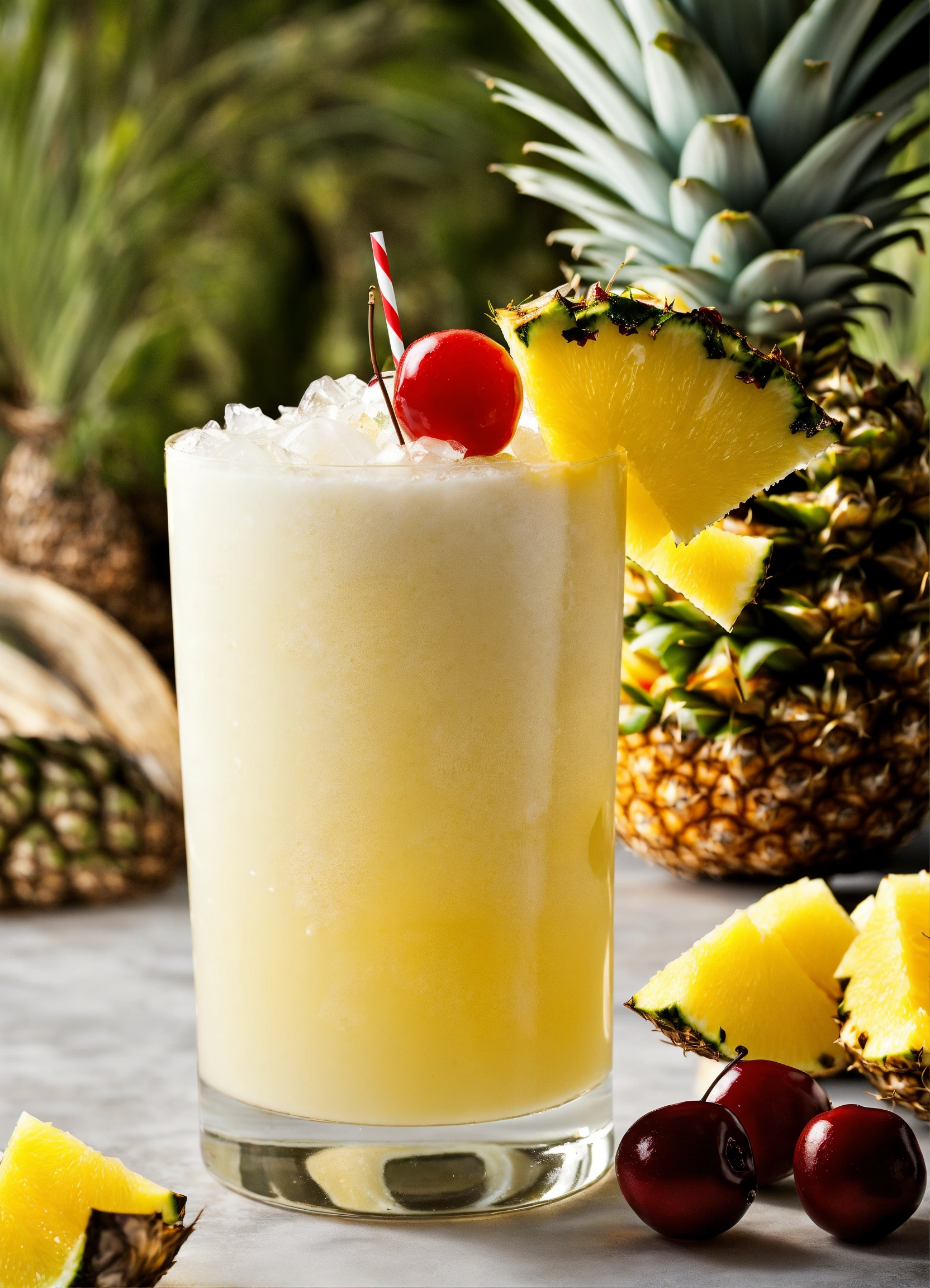 Generate a full-screen photo of a pina colada cocktail. you will need a glass suitable for a pina colada cocktail. ingredients 60 ml white rum 120 ml pineapple juice 60 ml coconut cream ice pineapple slices (for garnish) maraschino cherries (for garnish) orange slices (for garnish) preparing the cocktail place ice cubes in the glass. pour in the white rum, pineapple juice, and coconut cream. thoroughly mix the ingredients with a stirring rod or shaker. garnish the drink with pineapple slices, maraschino cherries, and orange slices. selecting lighting and background lighting is crucial for creating a good photo. use natural light or studio lighting to illuminate the cocktail. for the background, you can use a simple but elegant backdrop, such as a clean white or light-colored wall, or a beautiful beach scene that evokes the spirit of pina colada.