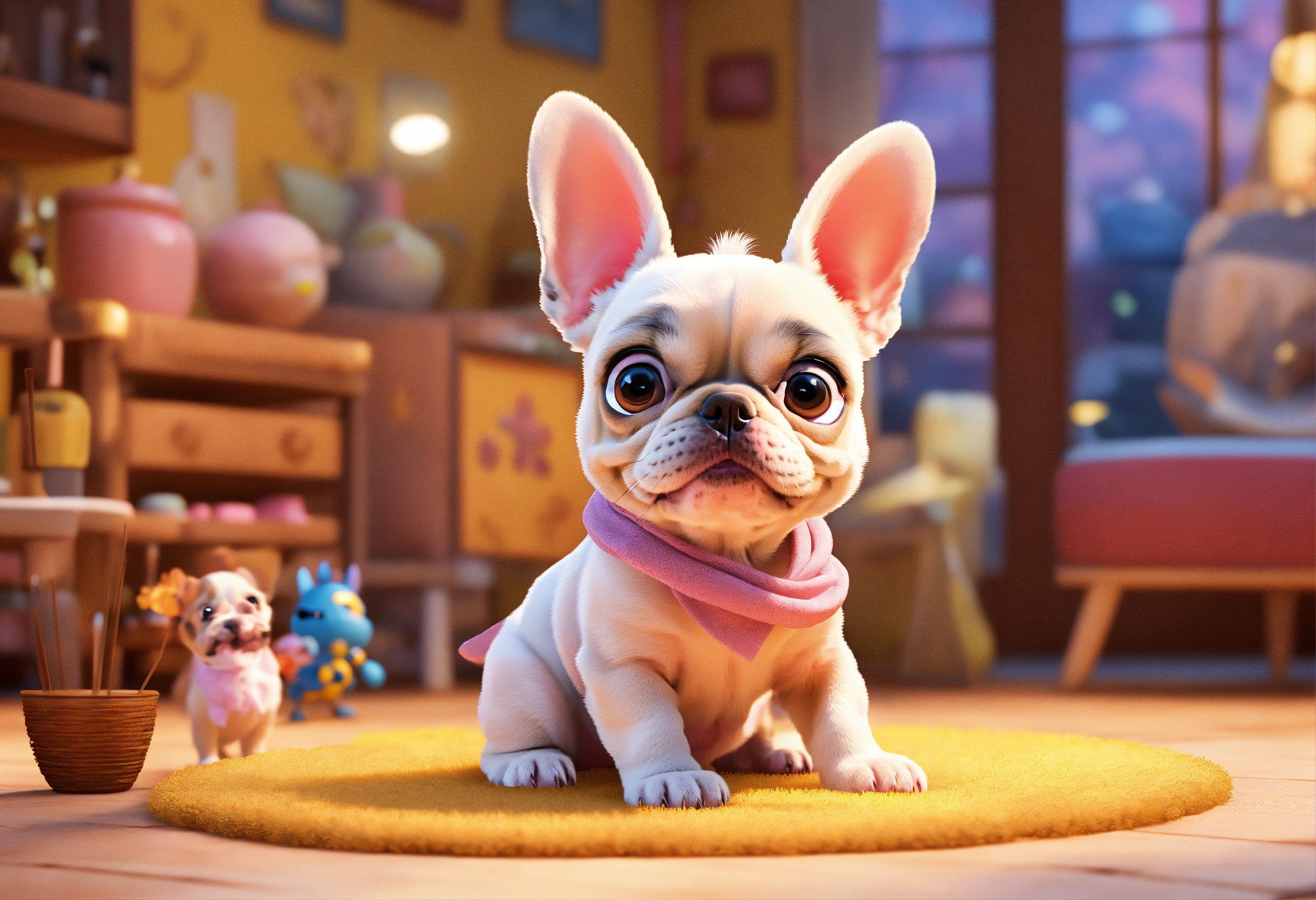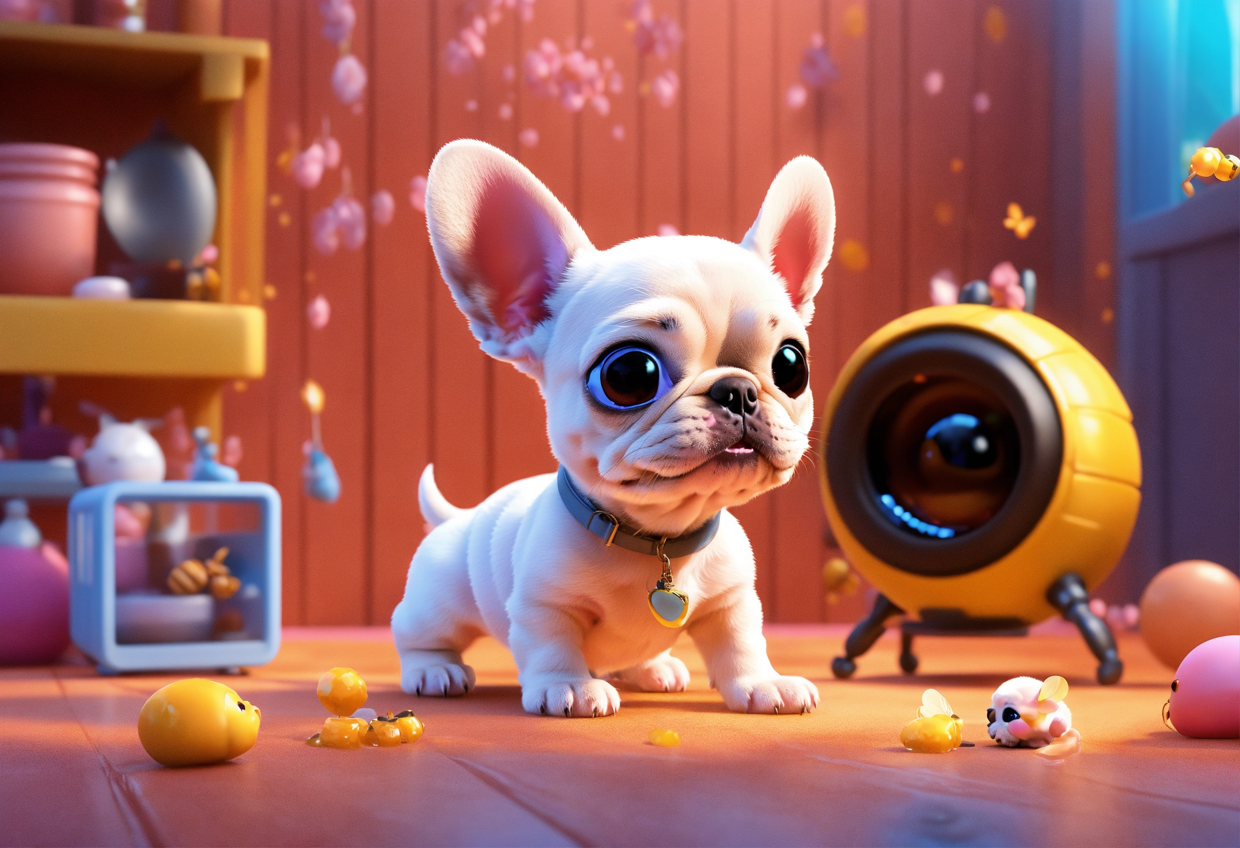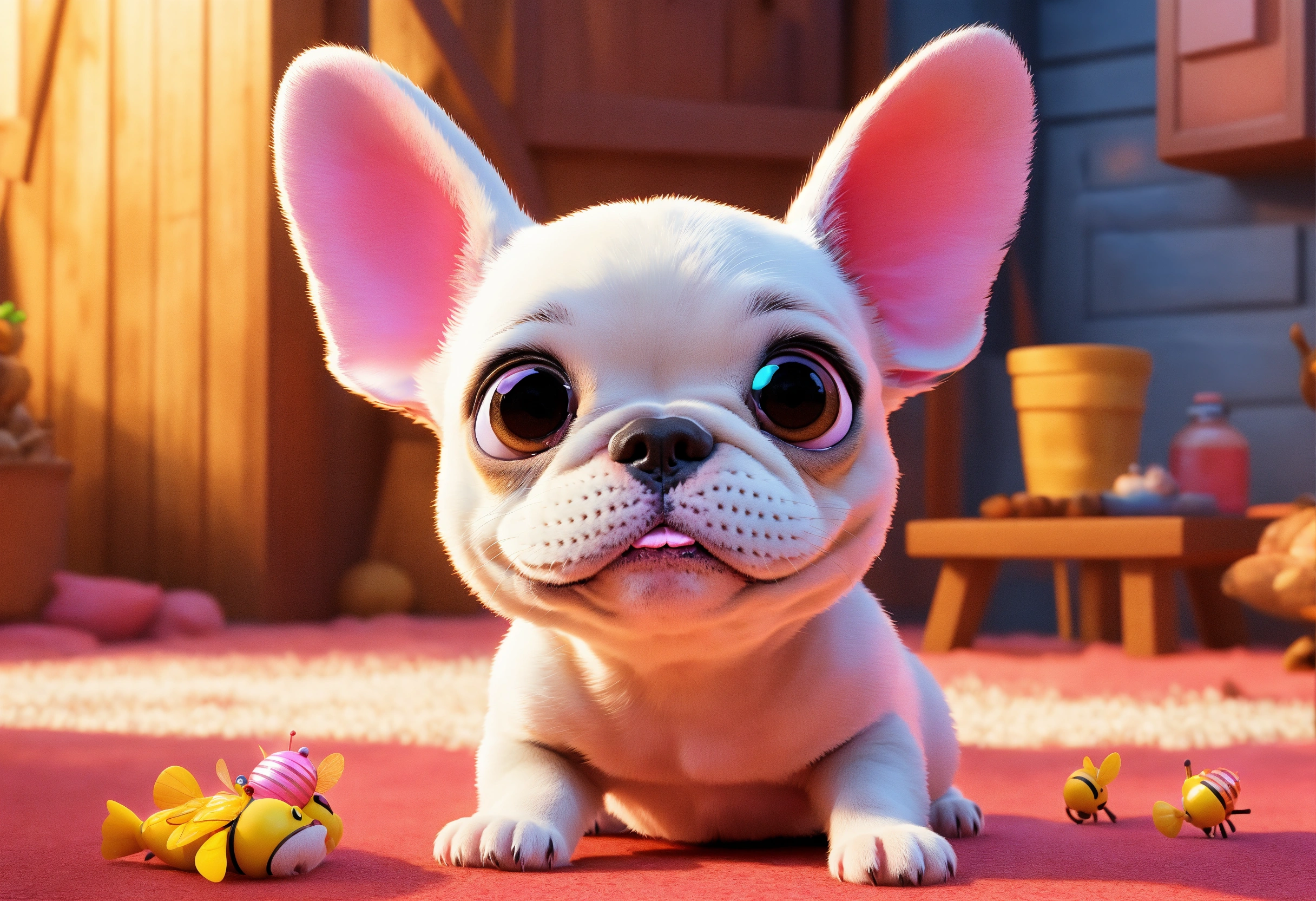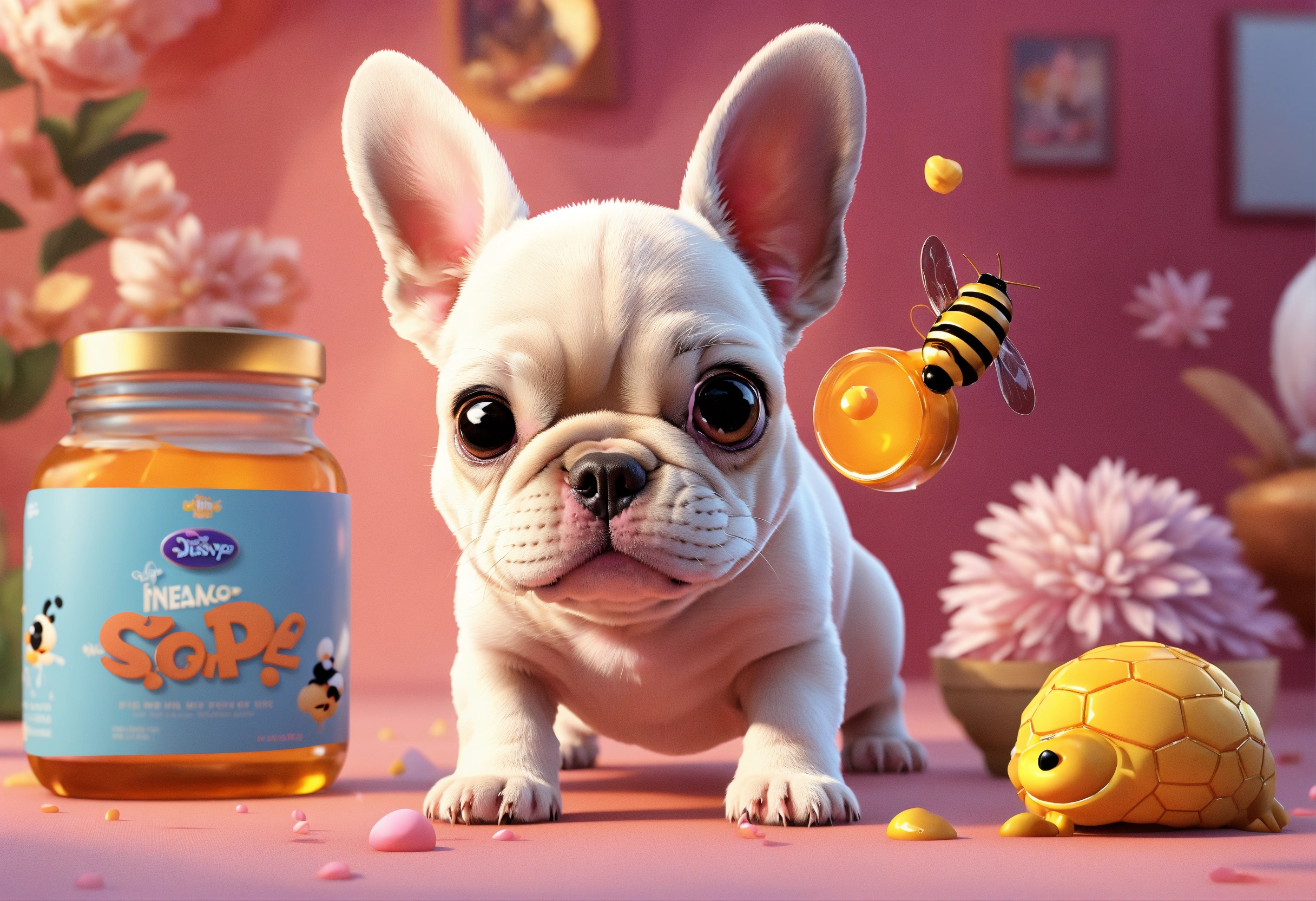 A disney pixar inspired movie poster 3d render, cinematic with a baby white french bulldog puppy with brown eyes, with beehive with honey, and pink hues. the scene should be in pixar's digital art style, emphasizing the characters expressions, bright colours, and detailed characteristics of their animations.