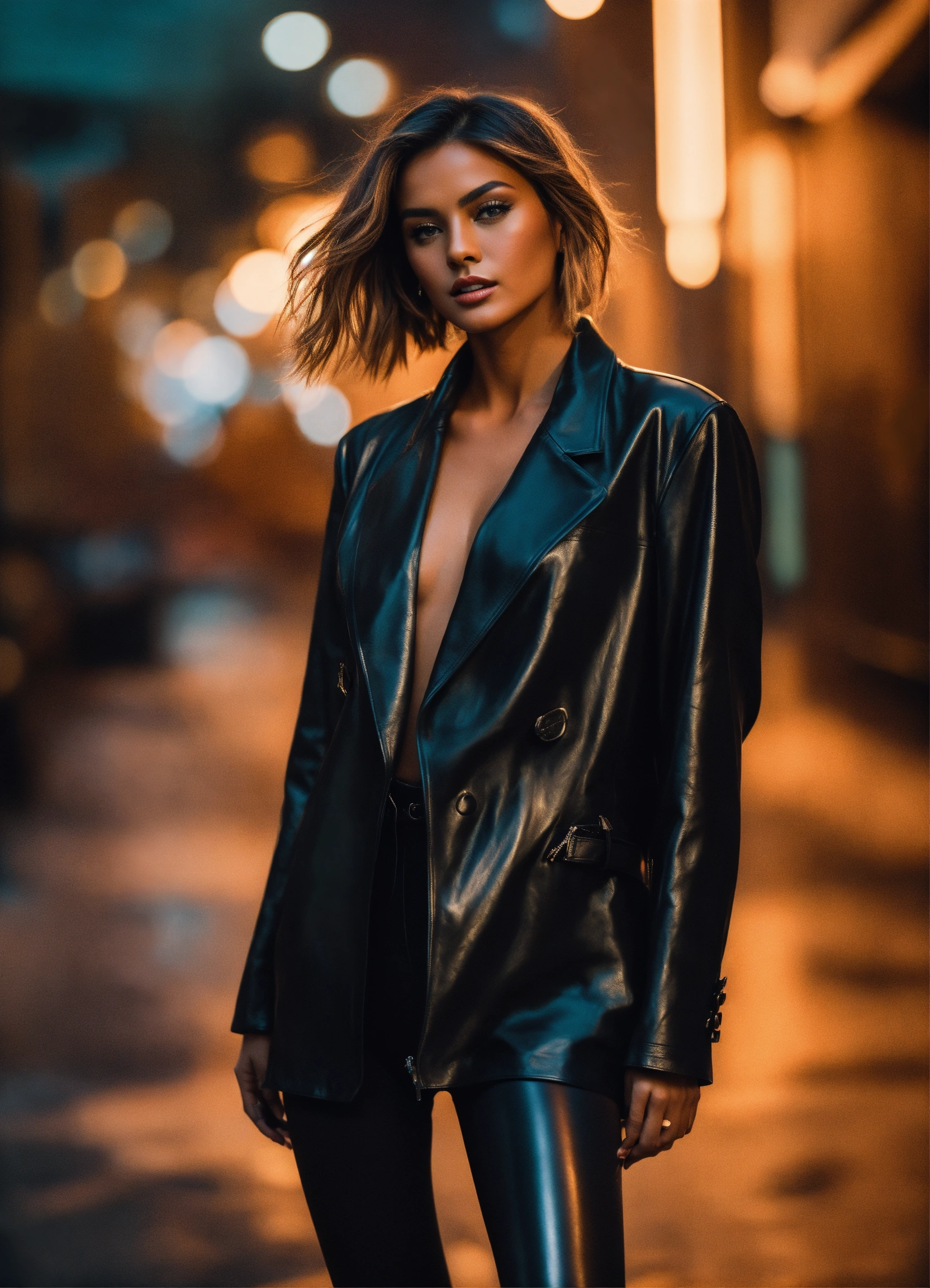 Create a visually stunning movies inspired photoshoot featuring a tanned supermodel wearing oversized black leather blazer with sheer tights and boots, iso 400, surrealistic, 8k, full frame, cinematic hollywood background aestethic