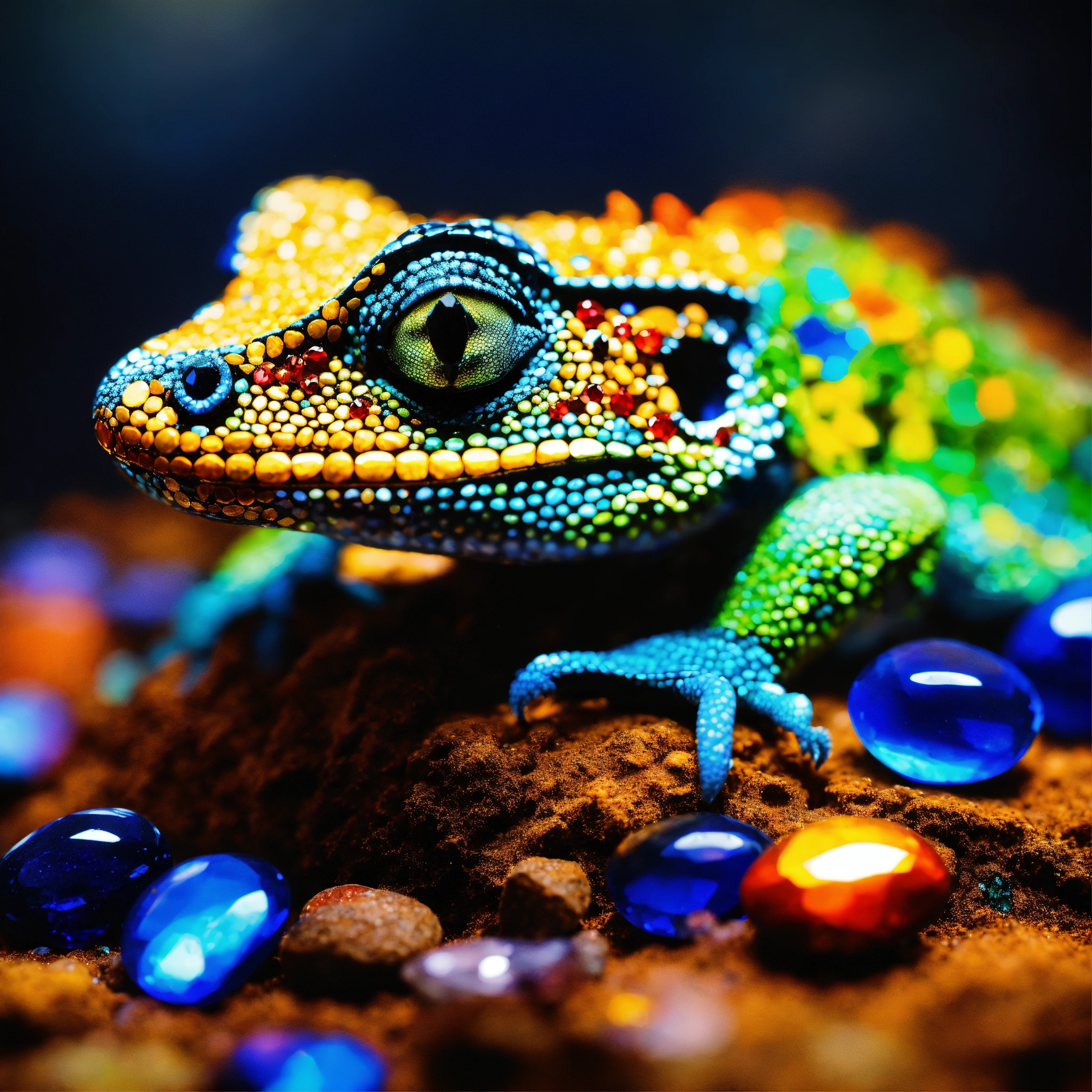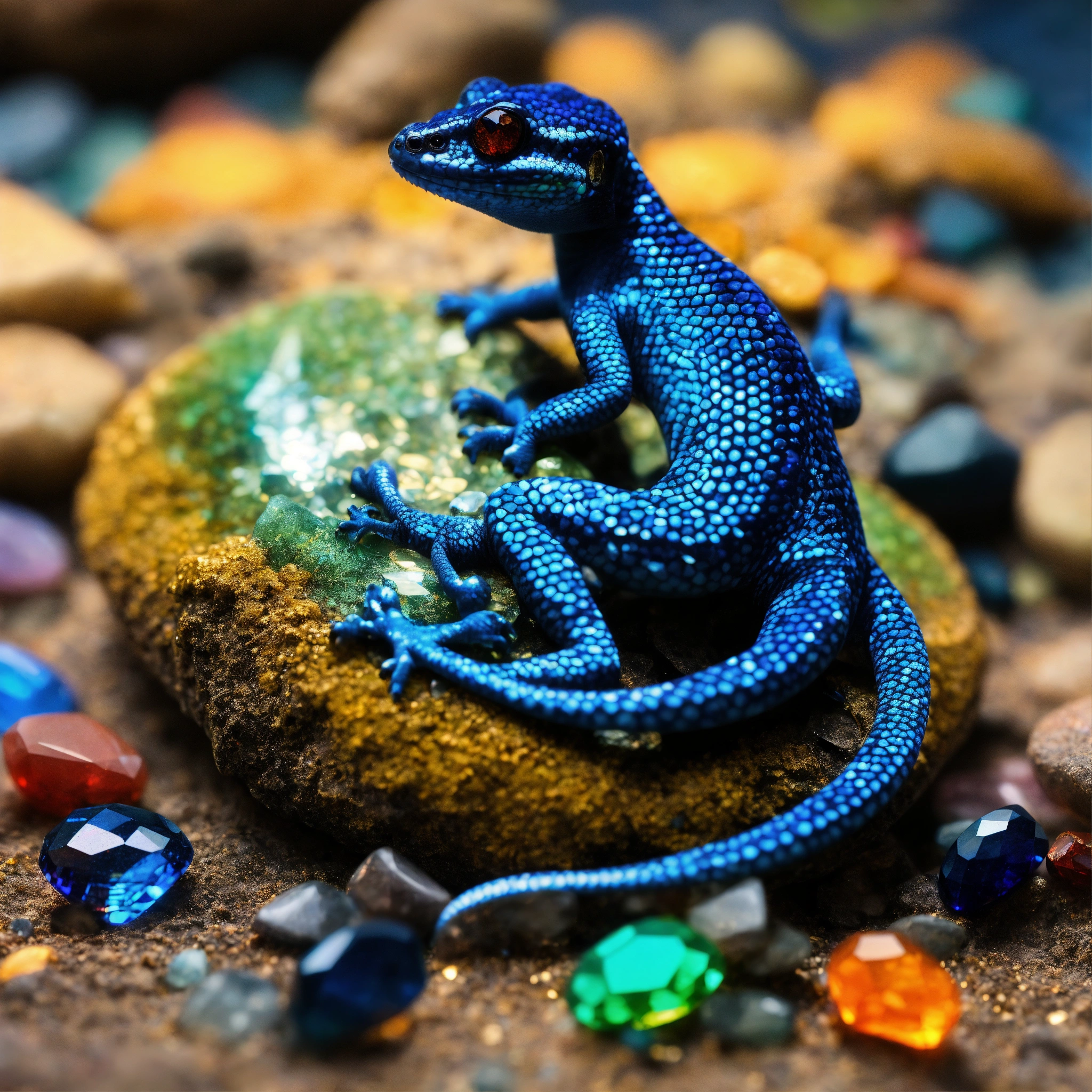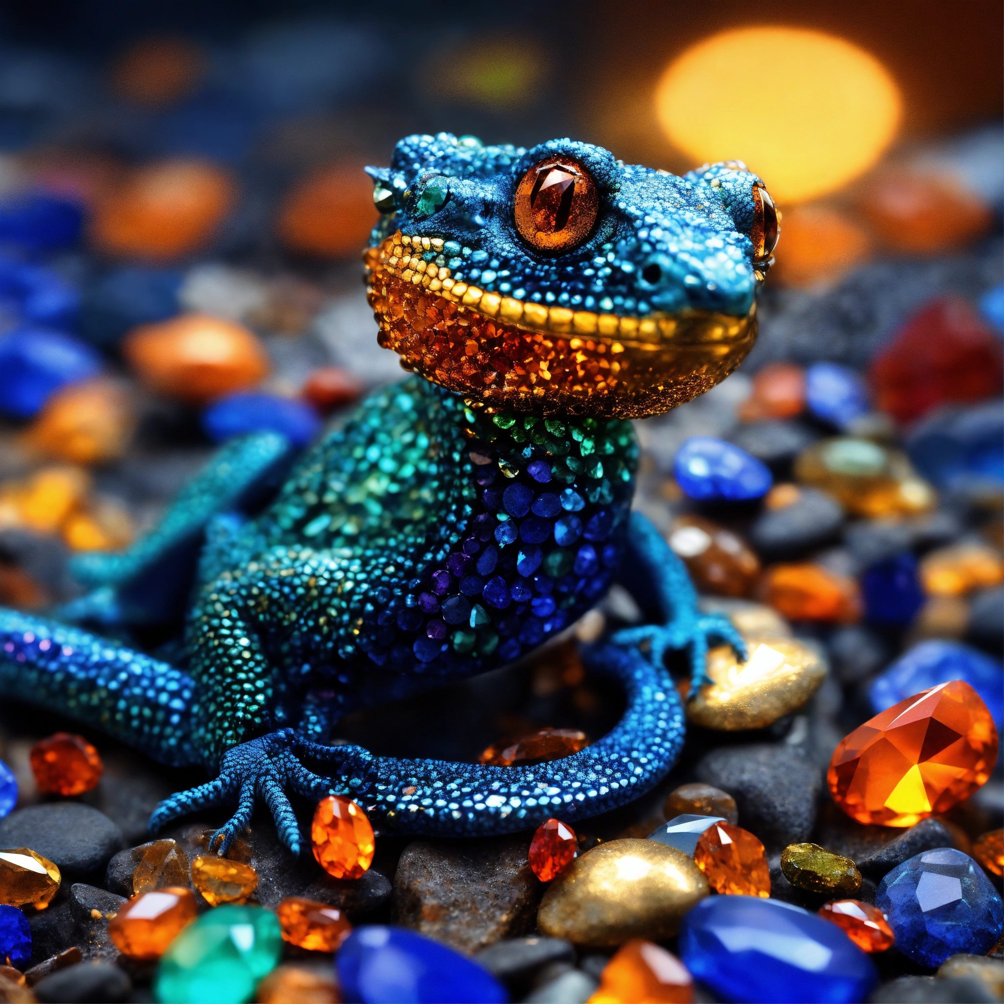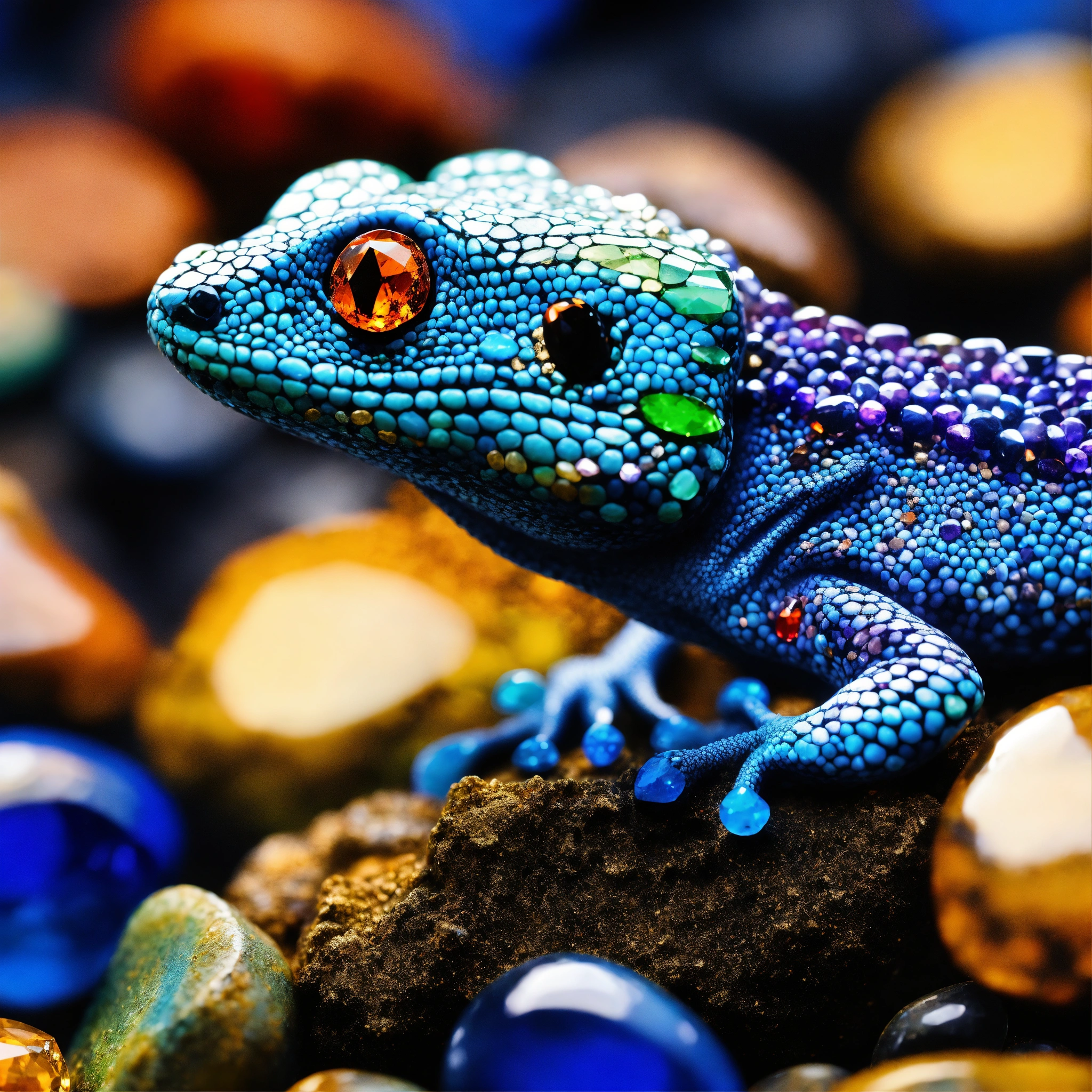 Gecko (mostly dark blue scaled, rest is orange scale, dark blue orange = 73, a little bit of aether green scales around the neck). gecko on gem stone pile (black gem stones, gold gem stones, red gemstones). no gems on the gecko. no gems on gecko's eyes. a lot of gemstones. ground filled with gemstones. gem stones reflecting light. sky blue colored water wetting the gemstones.