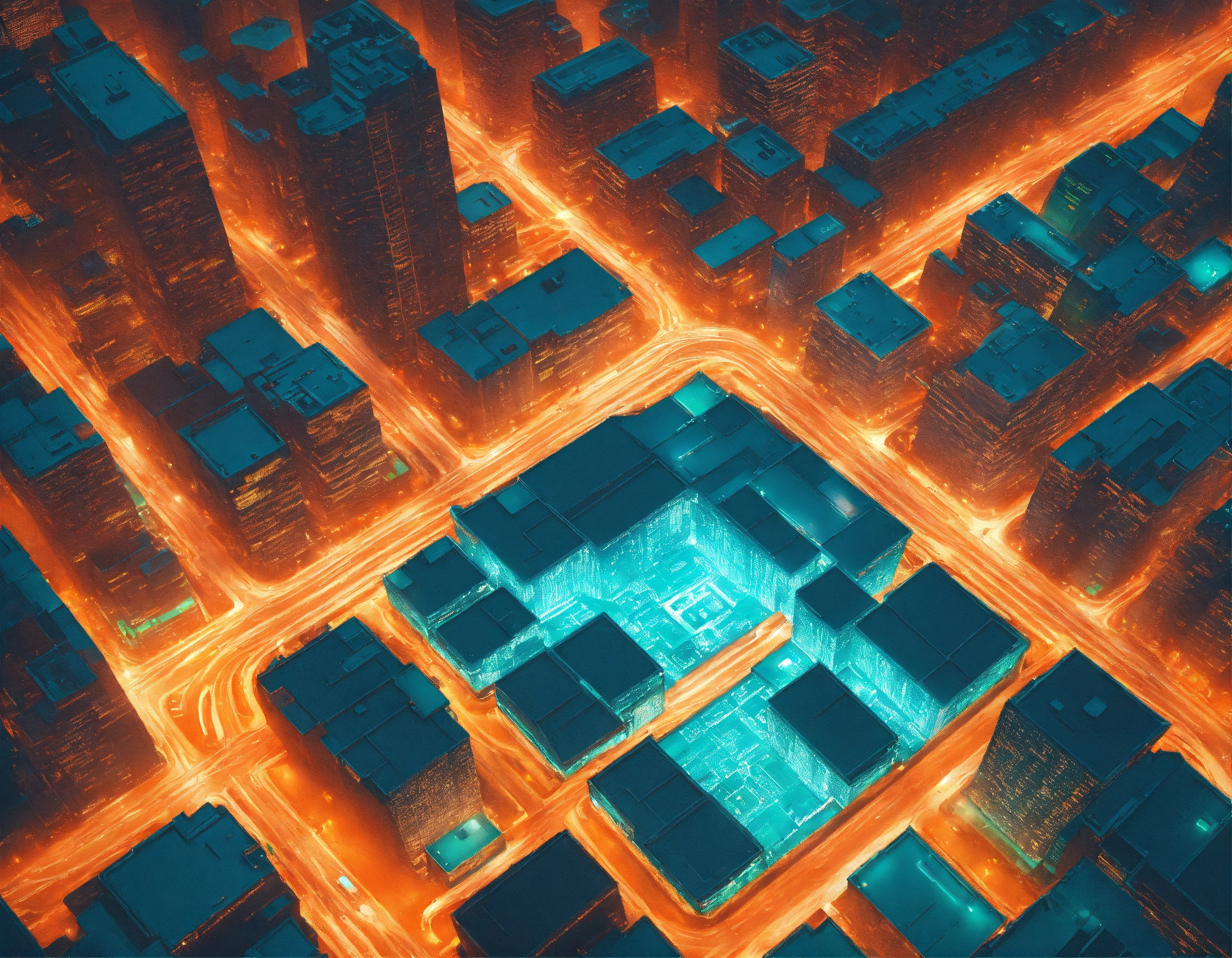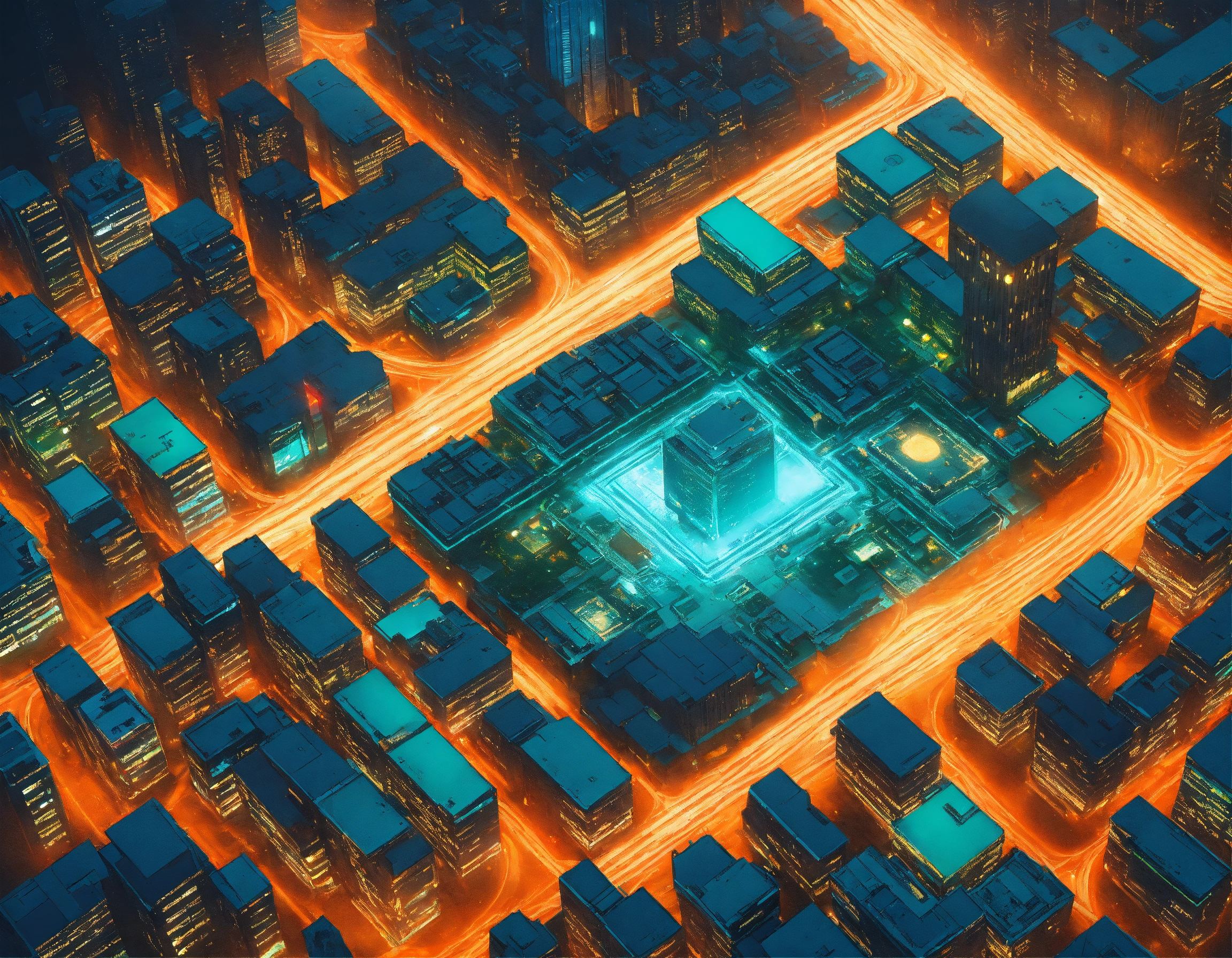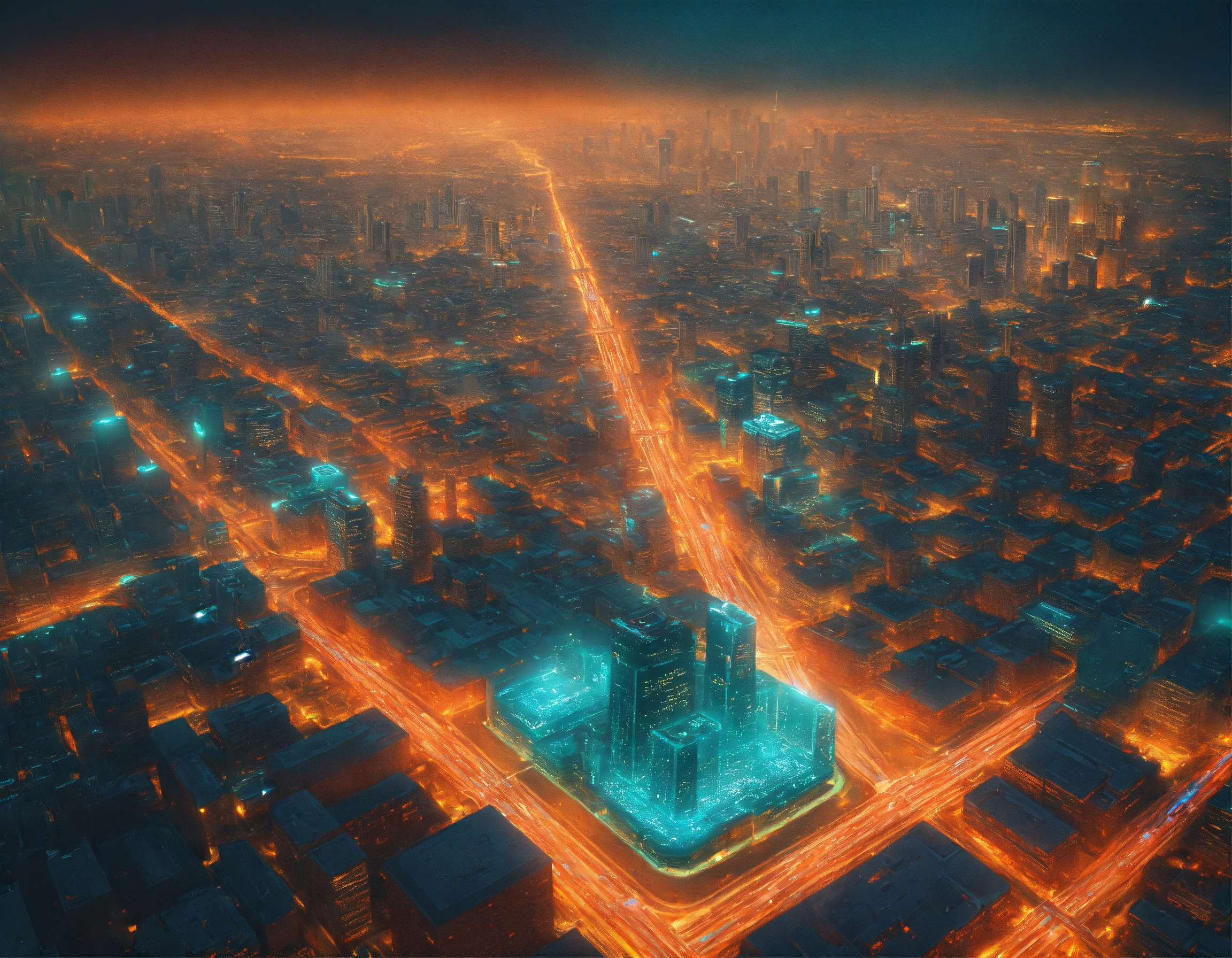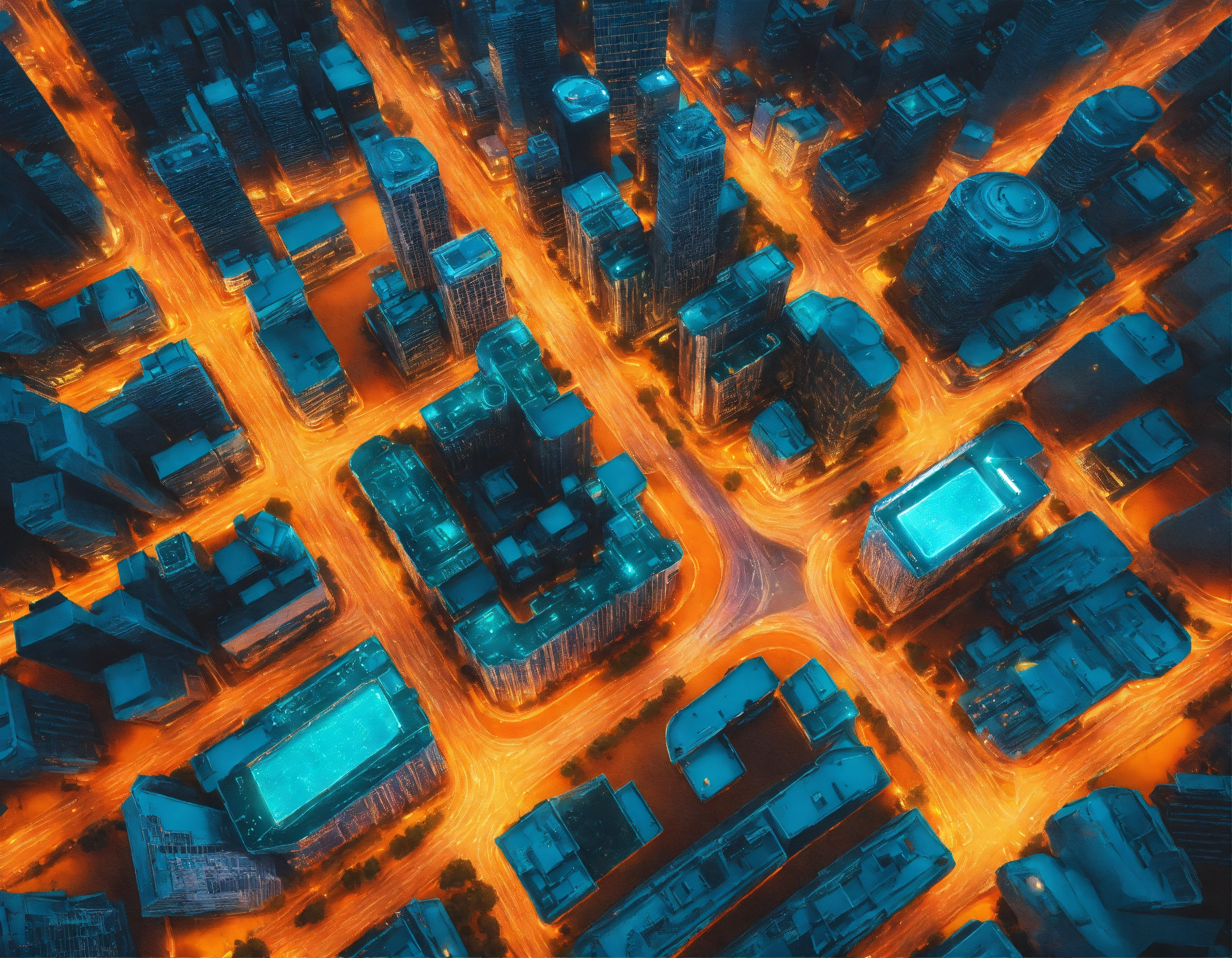 Ultra realistic straight down aerial view of a teal colored megapolis downtown, streets lit with orange street light, looking like a computer motherboard from movie hackers