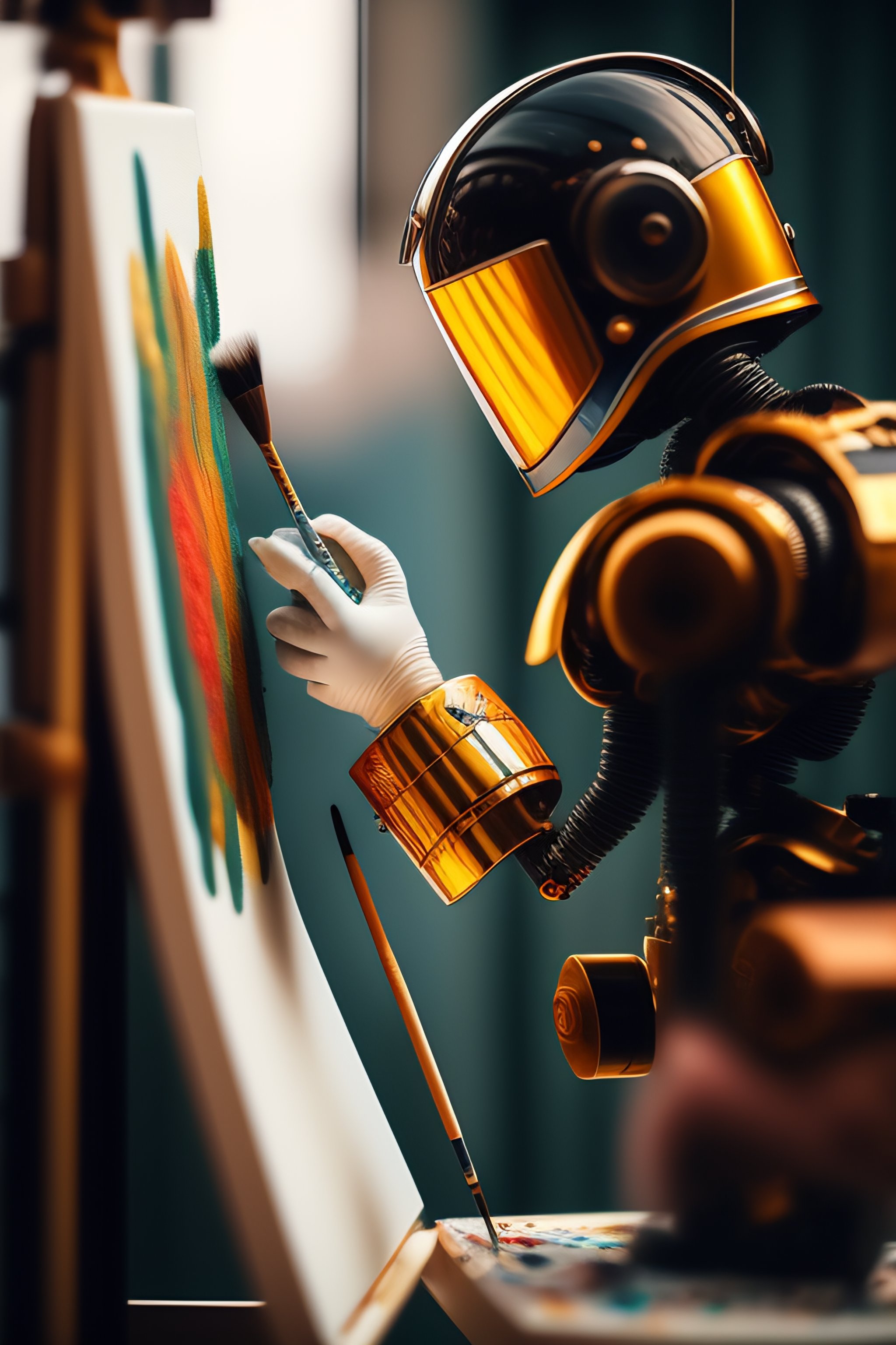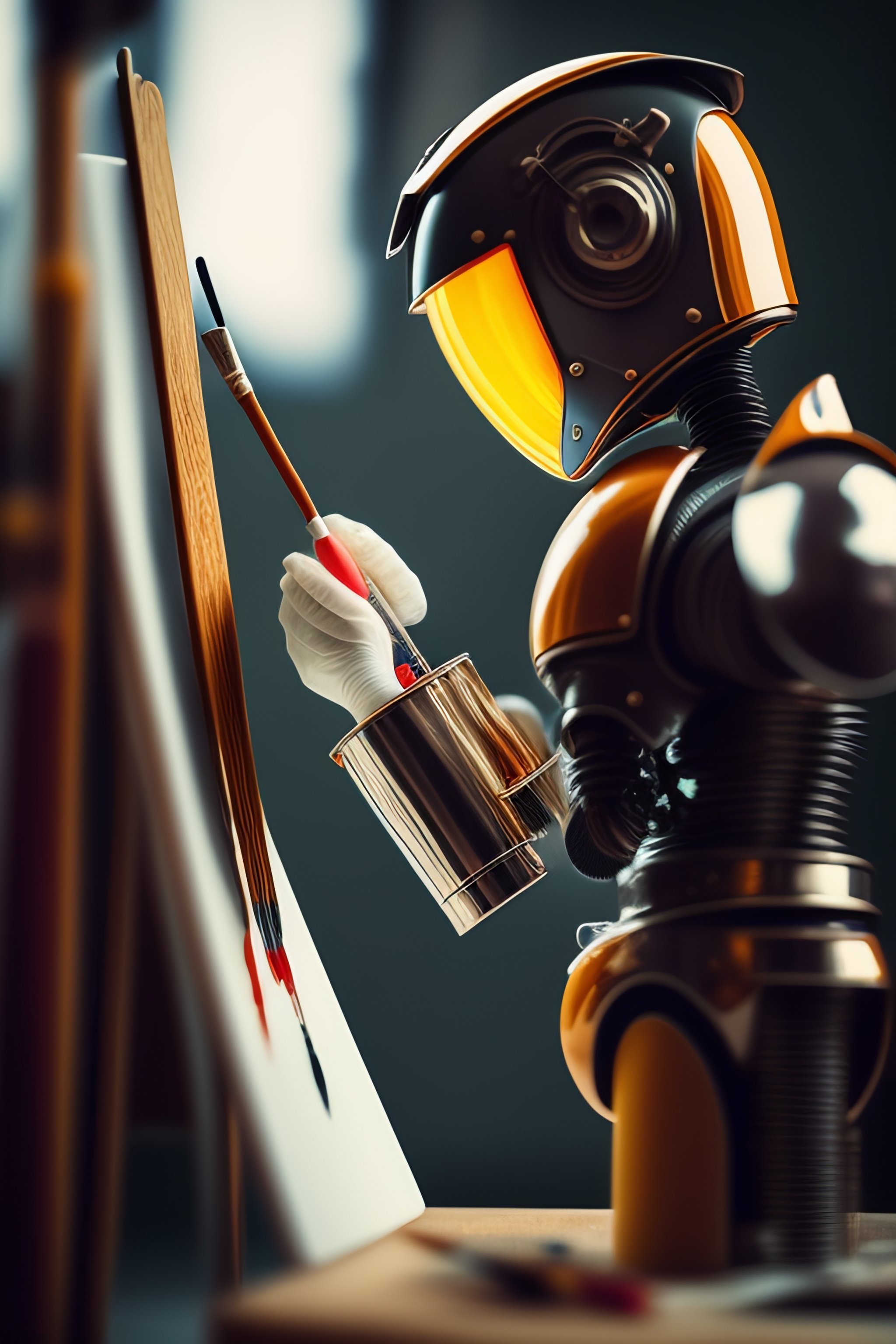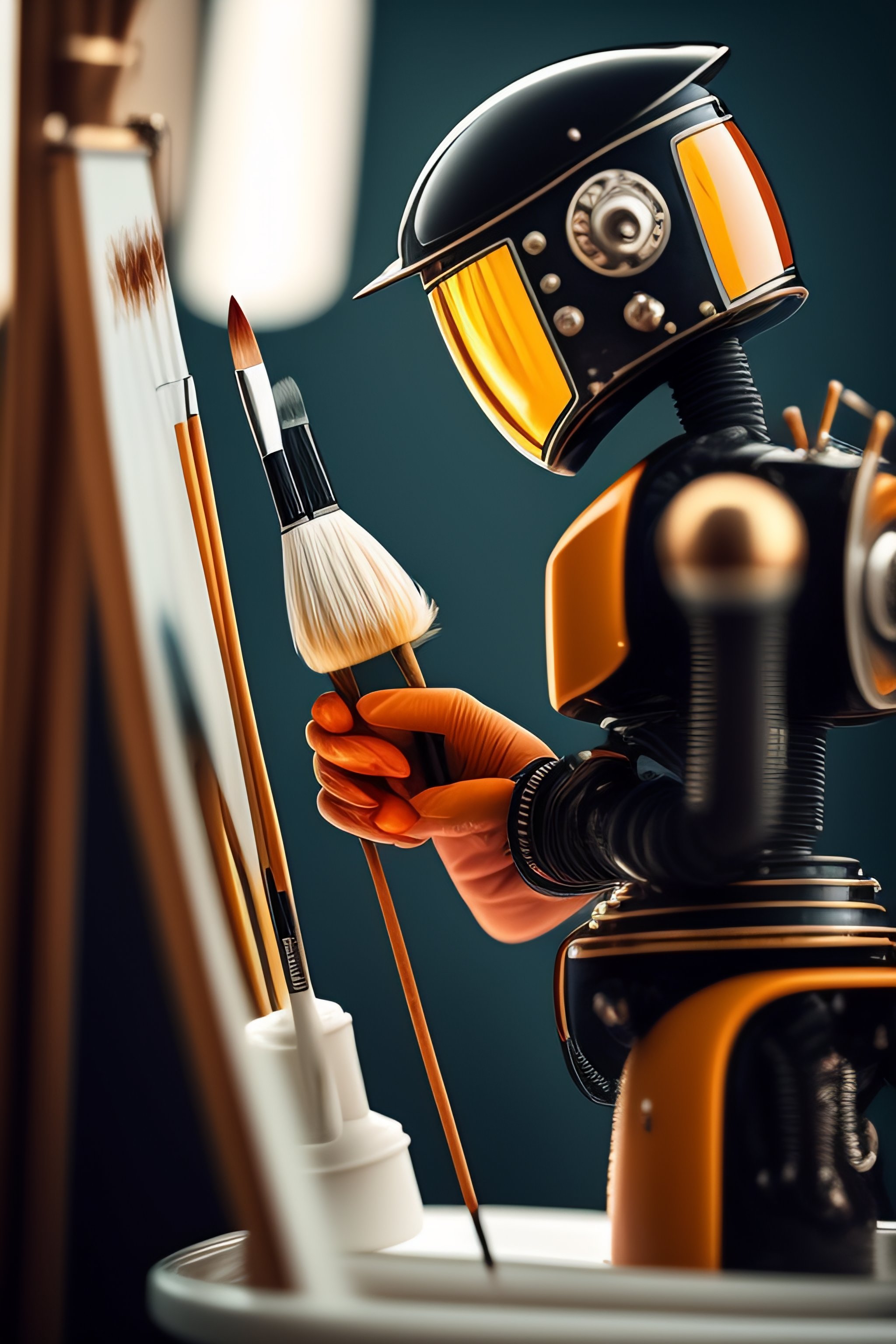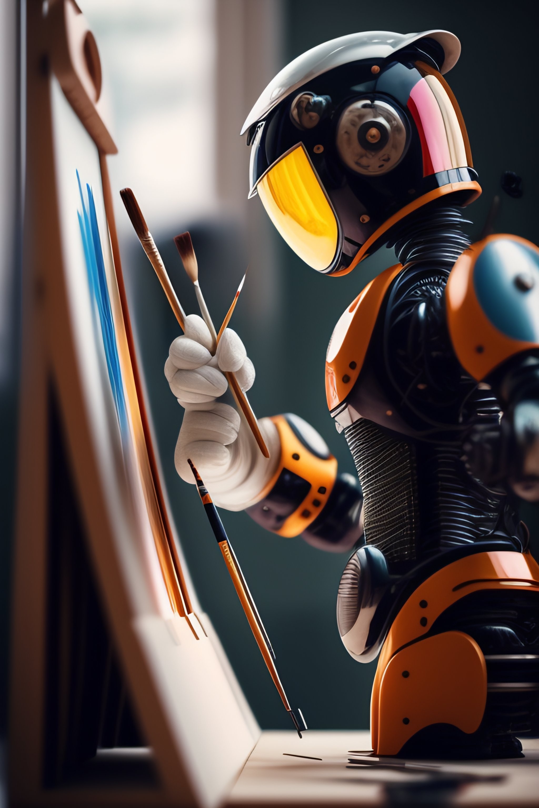 An artist robot holding a paintbrush is painting a masterpiece