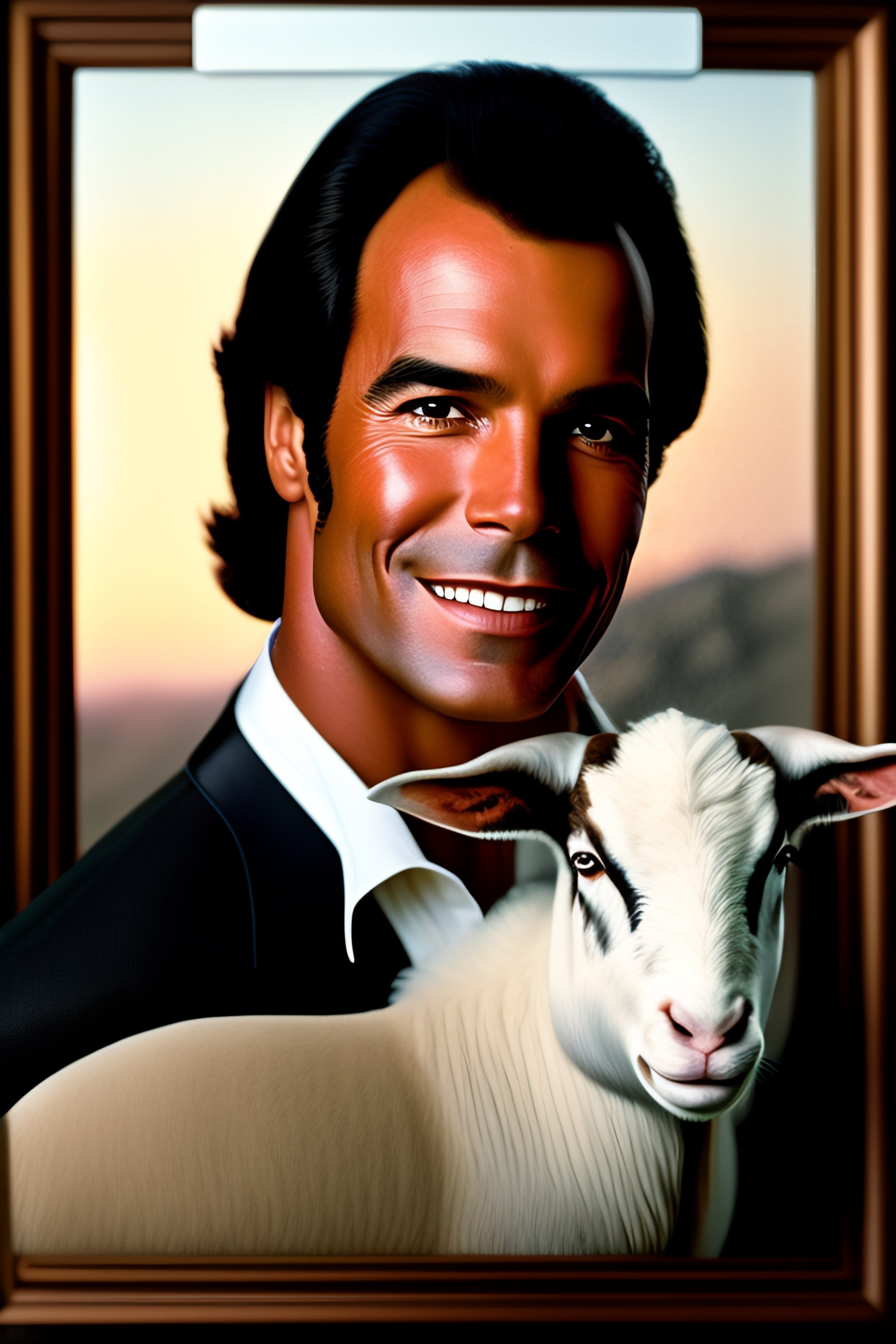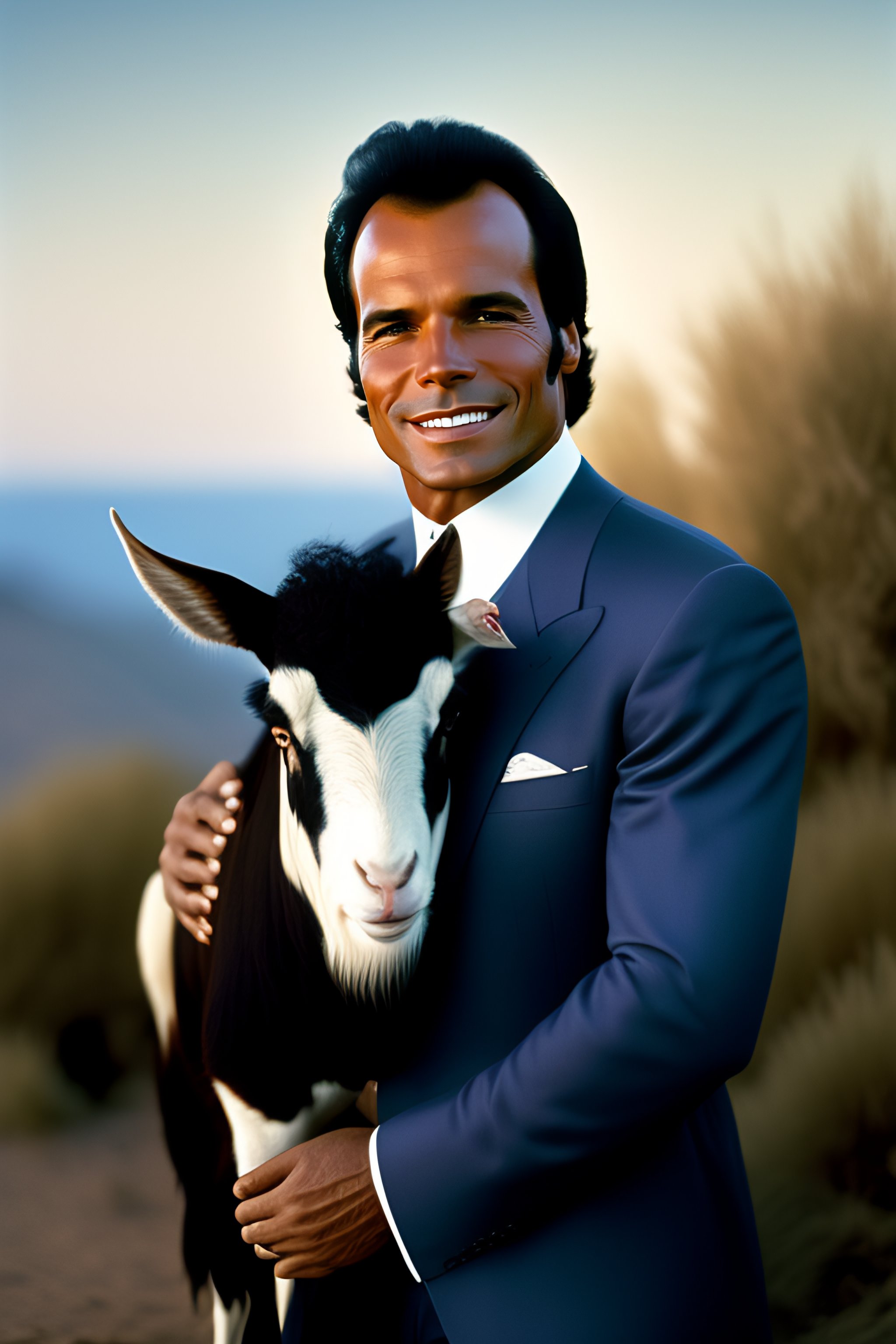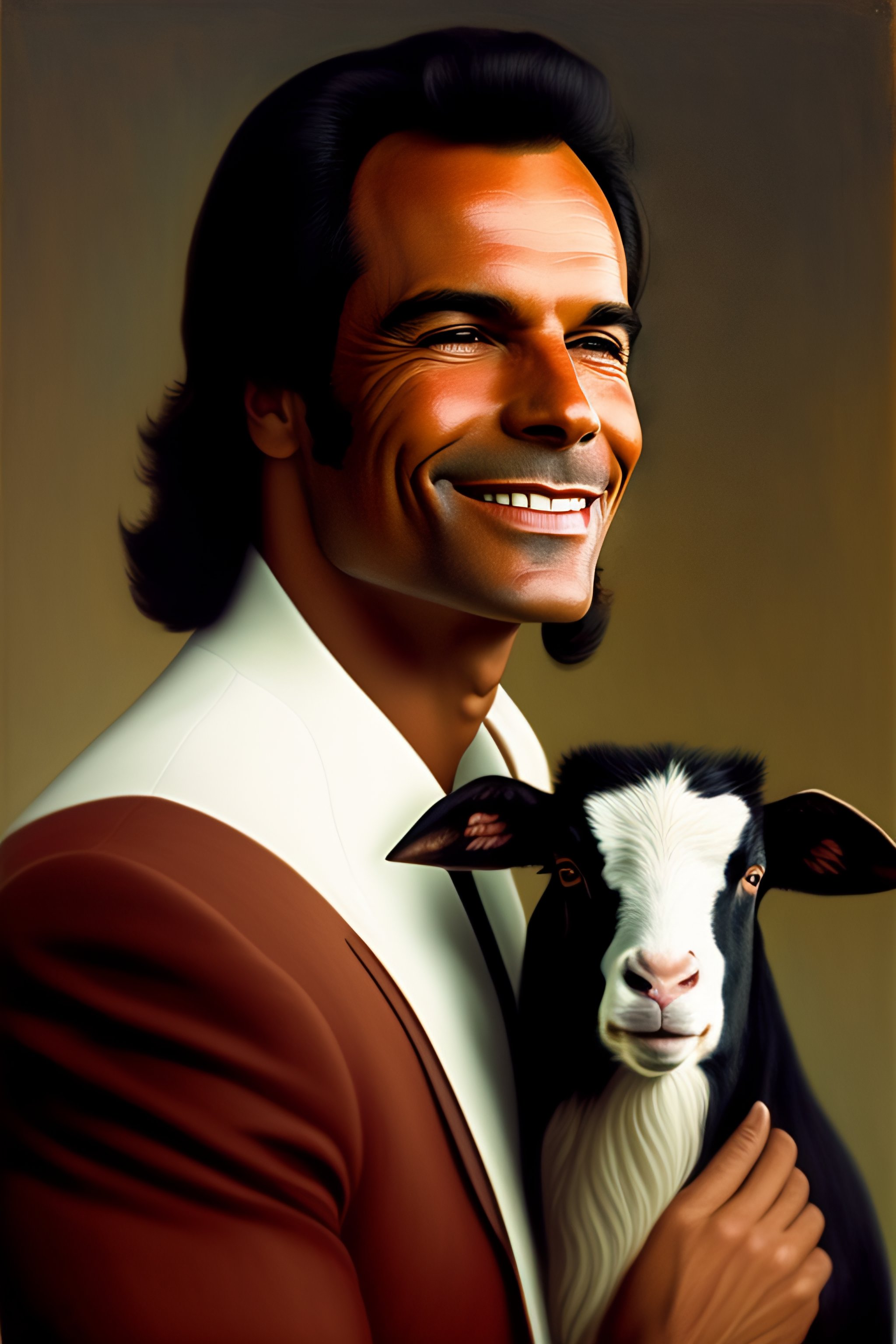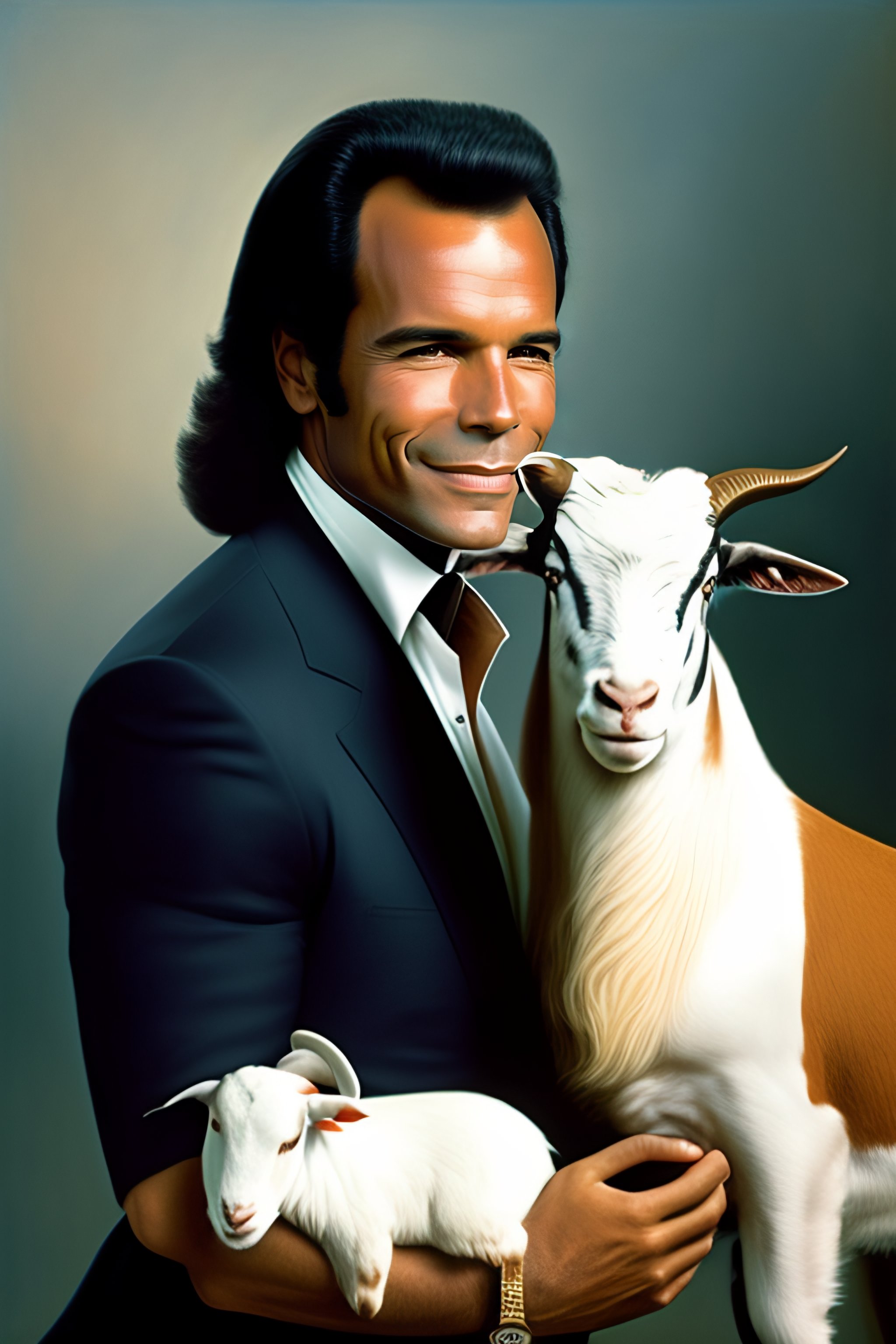 Portrait of julio iglesias holding a goat con el pelo blanco