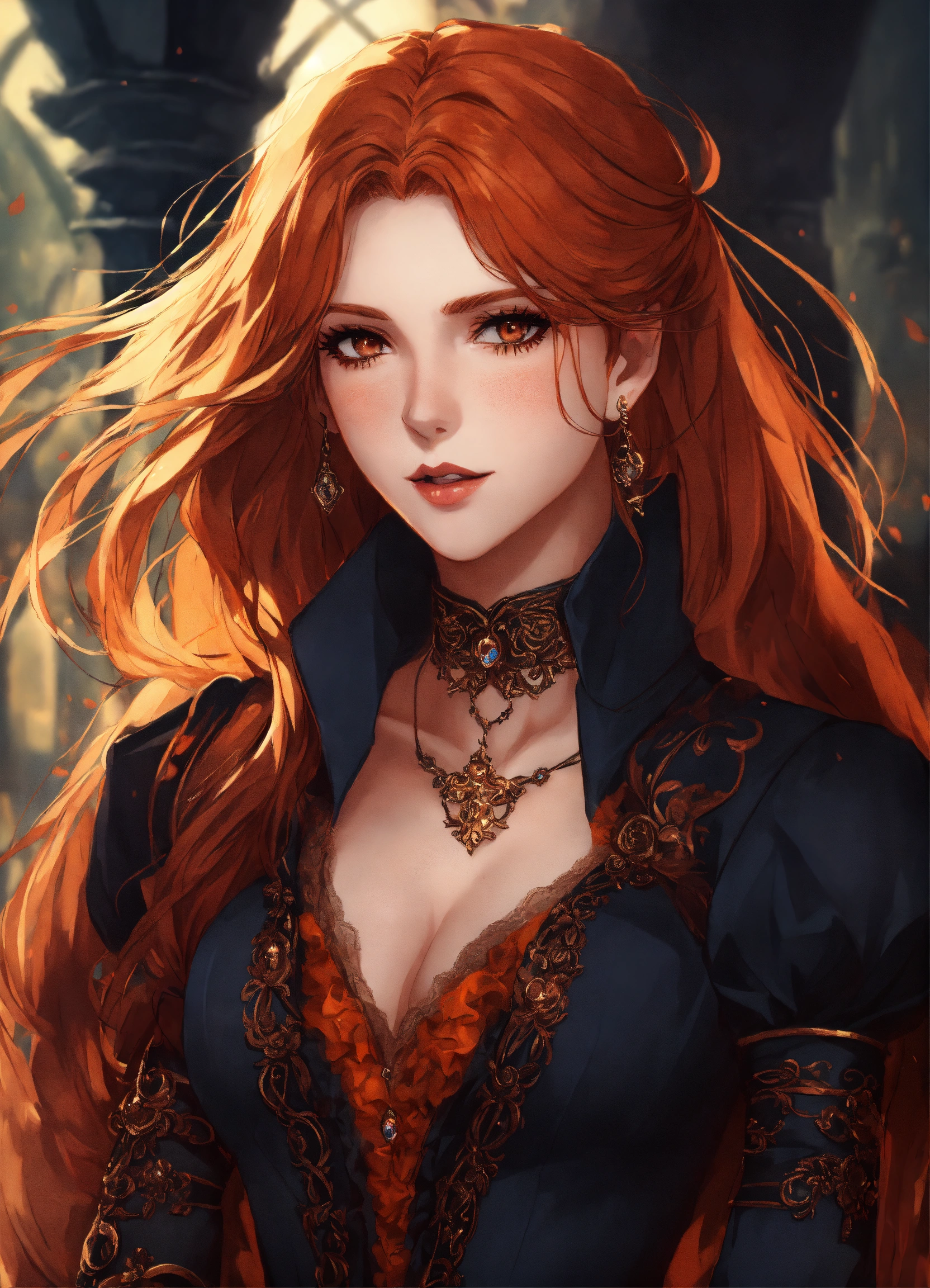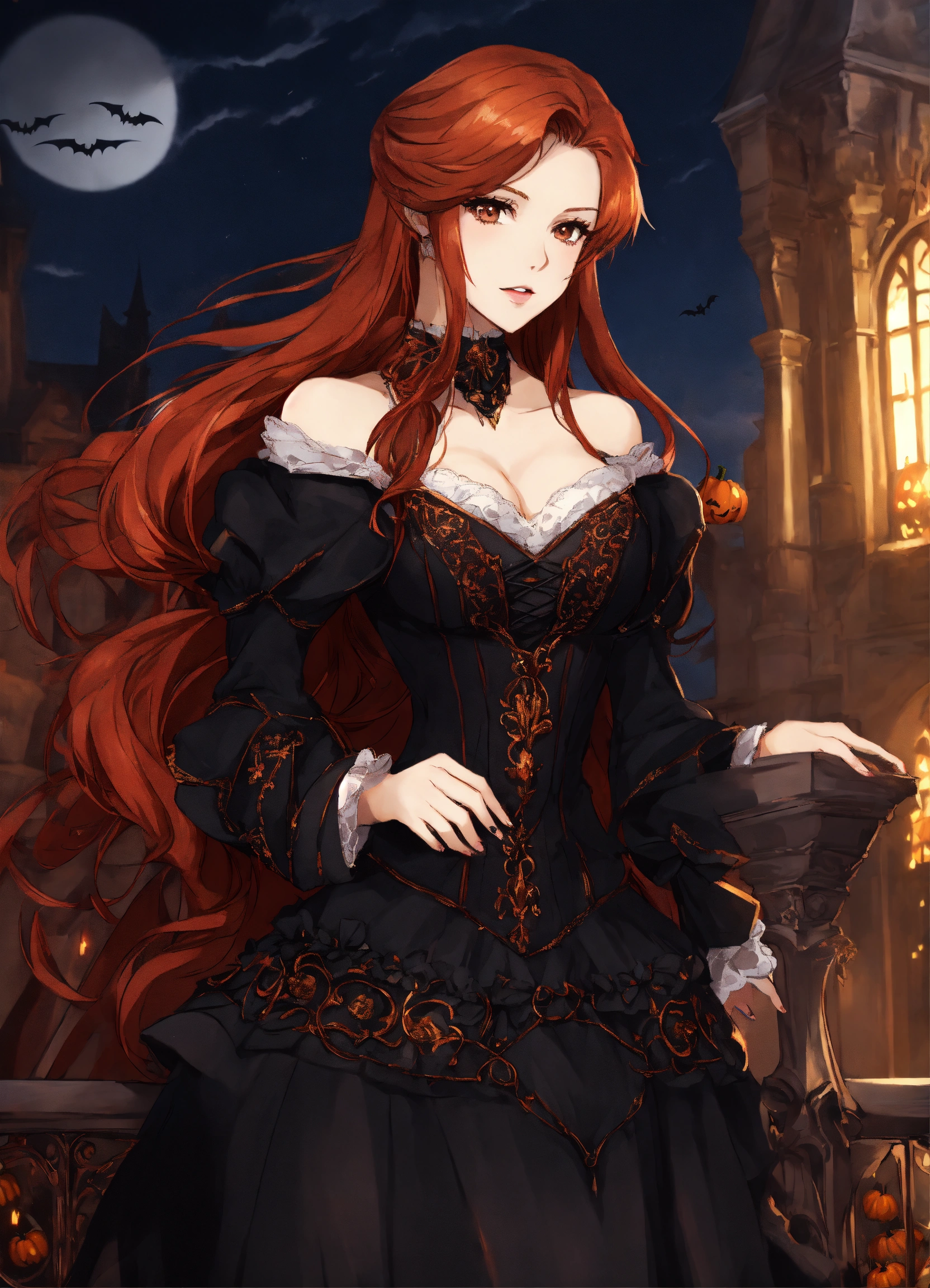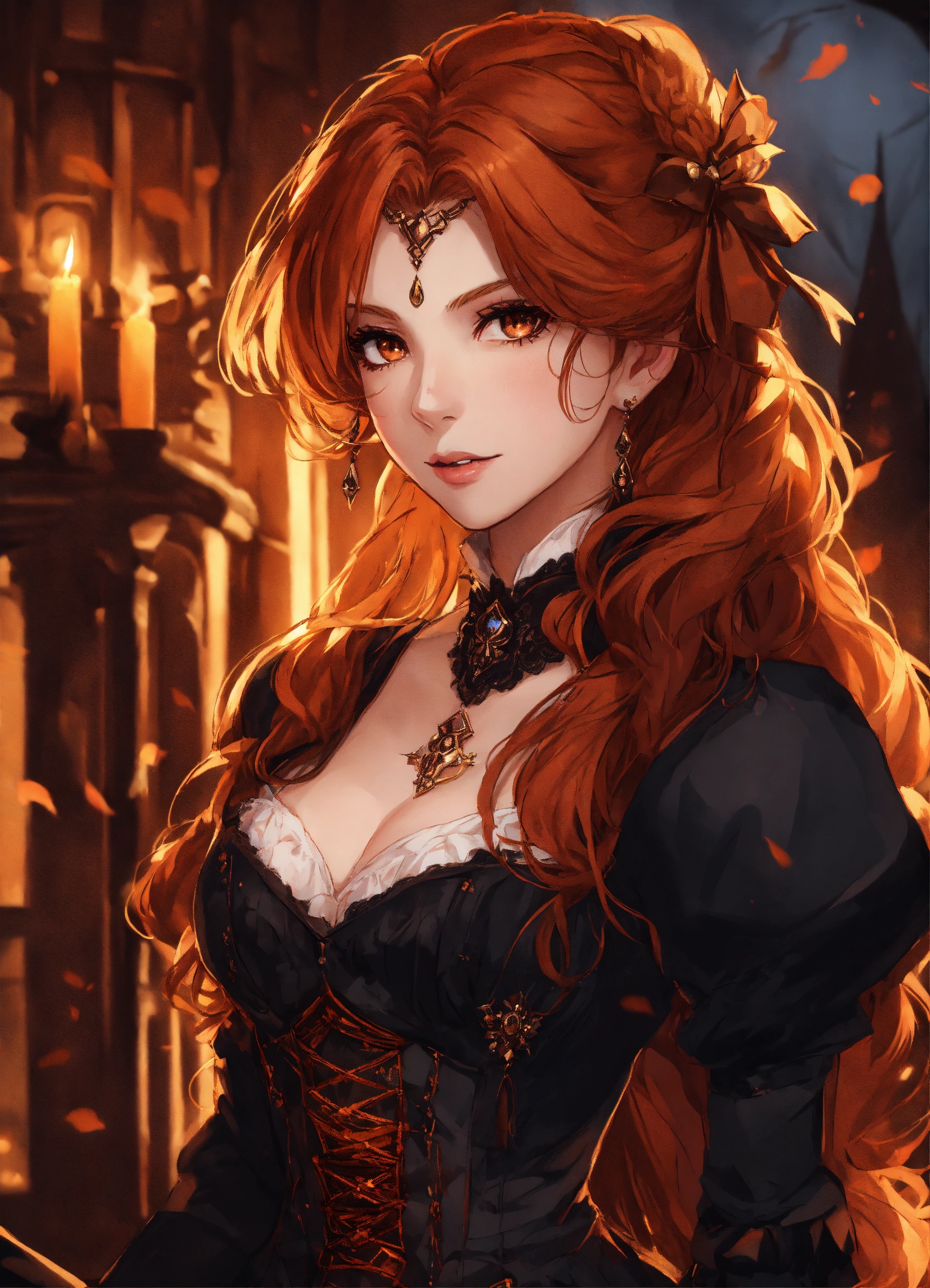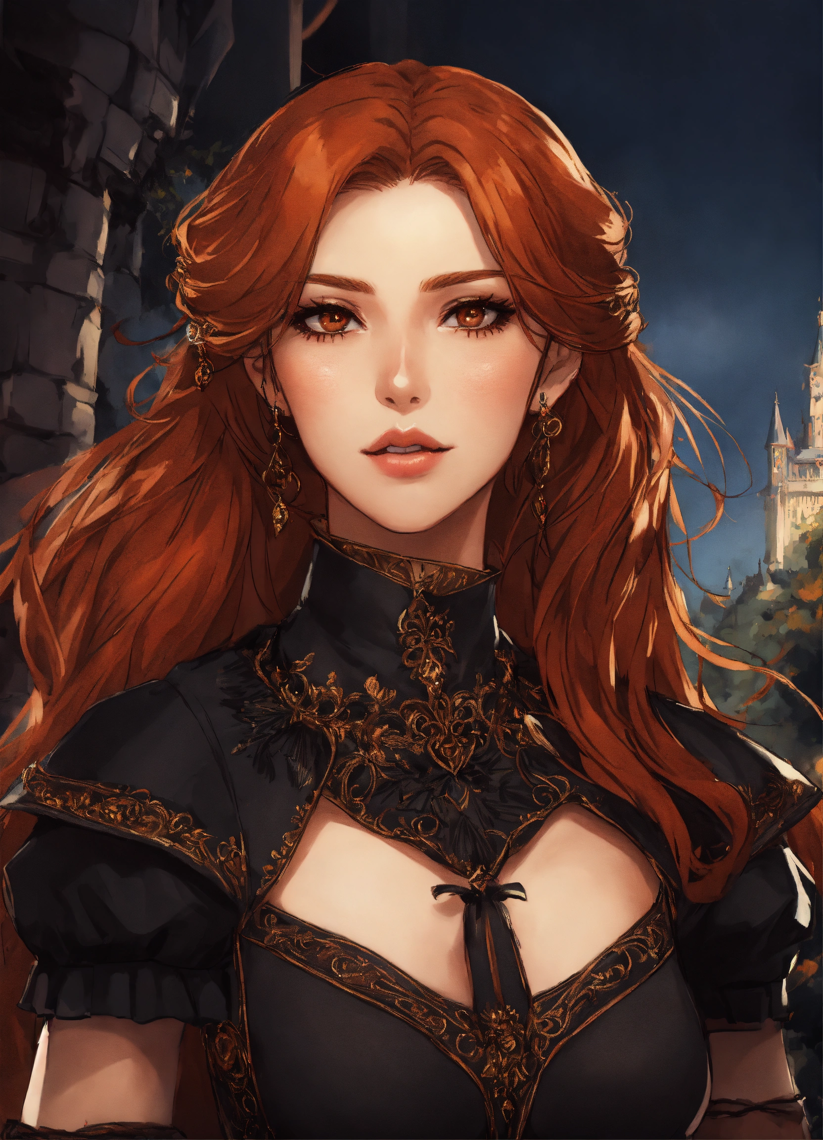Beautiful redhead woman, anime, brown eyes, manga, detailed, black clothes, dress, portrait, detailed, pretty, gorgeous, attractive face, halloween, in the style of castlevania