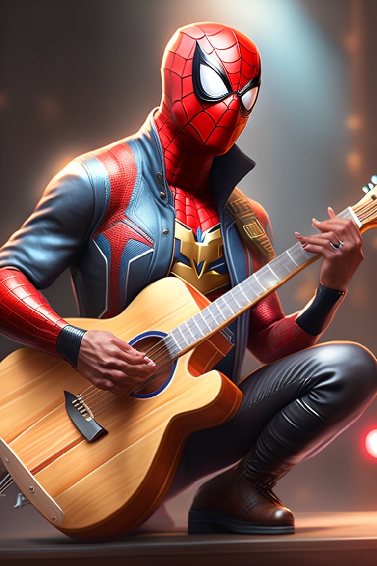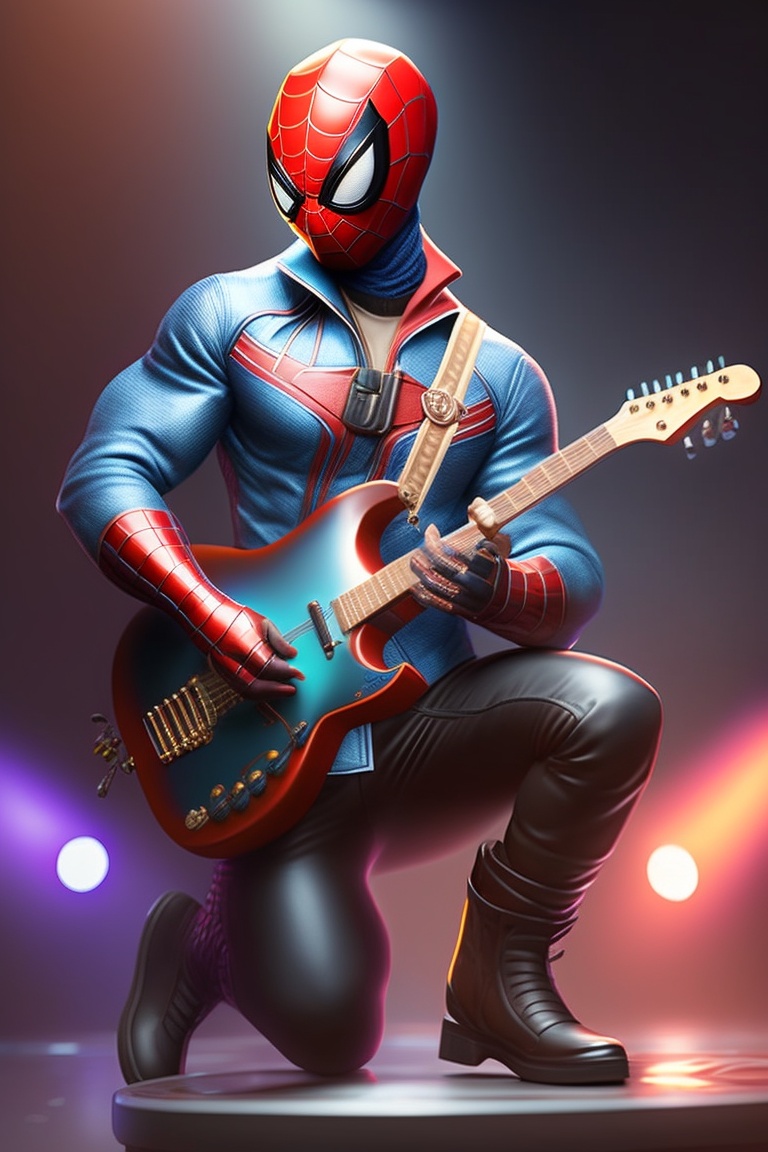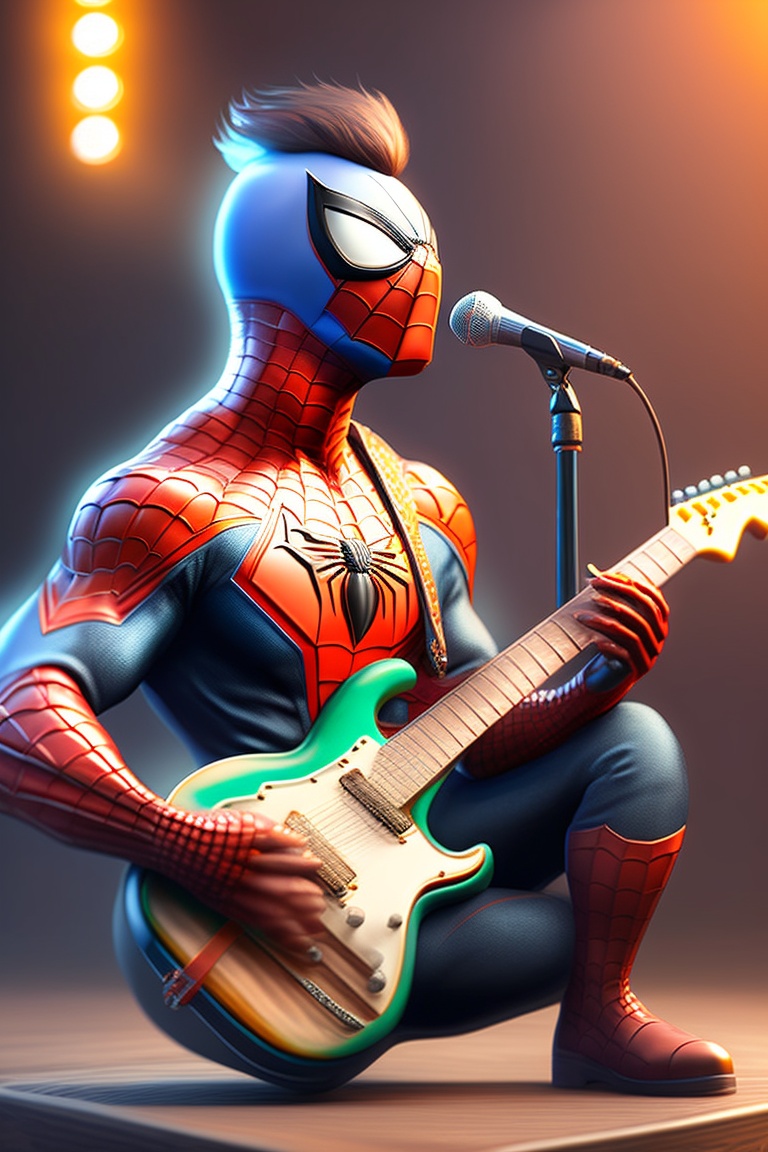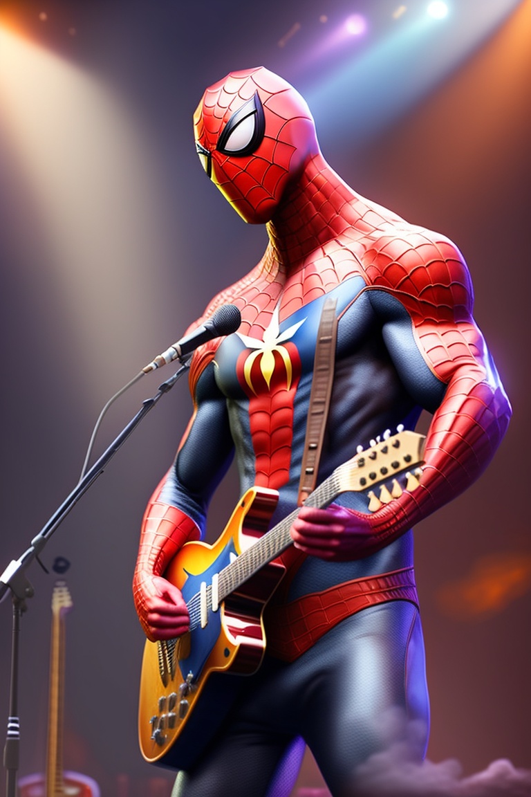 Spiderman playing guitar and singing on stage, realistic, surrealism, super cool, trending on artstation, 3d