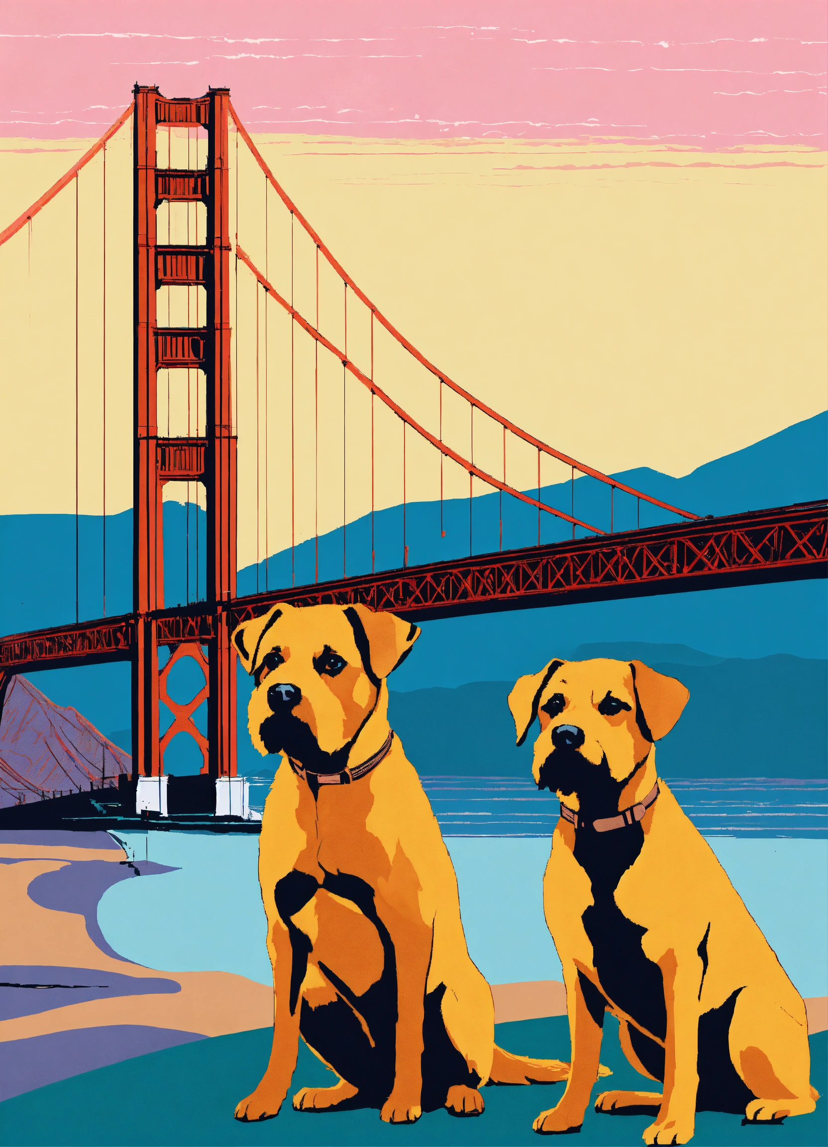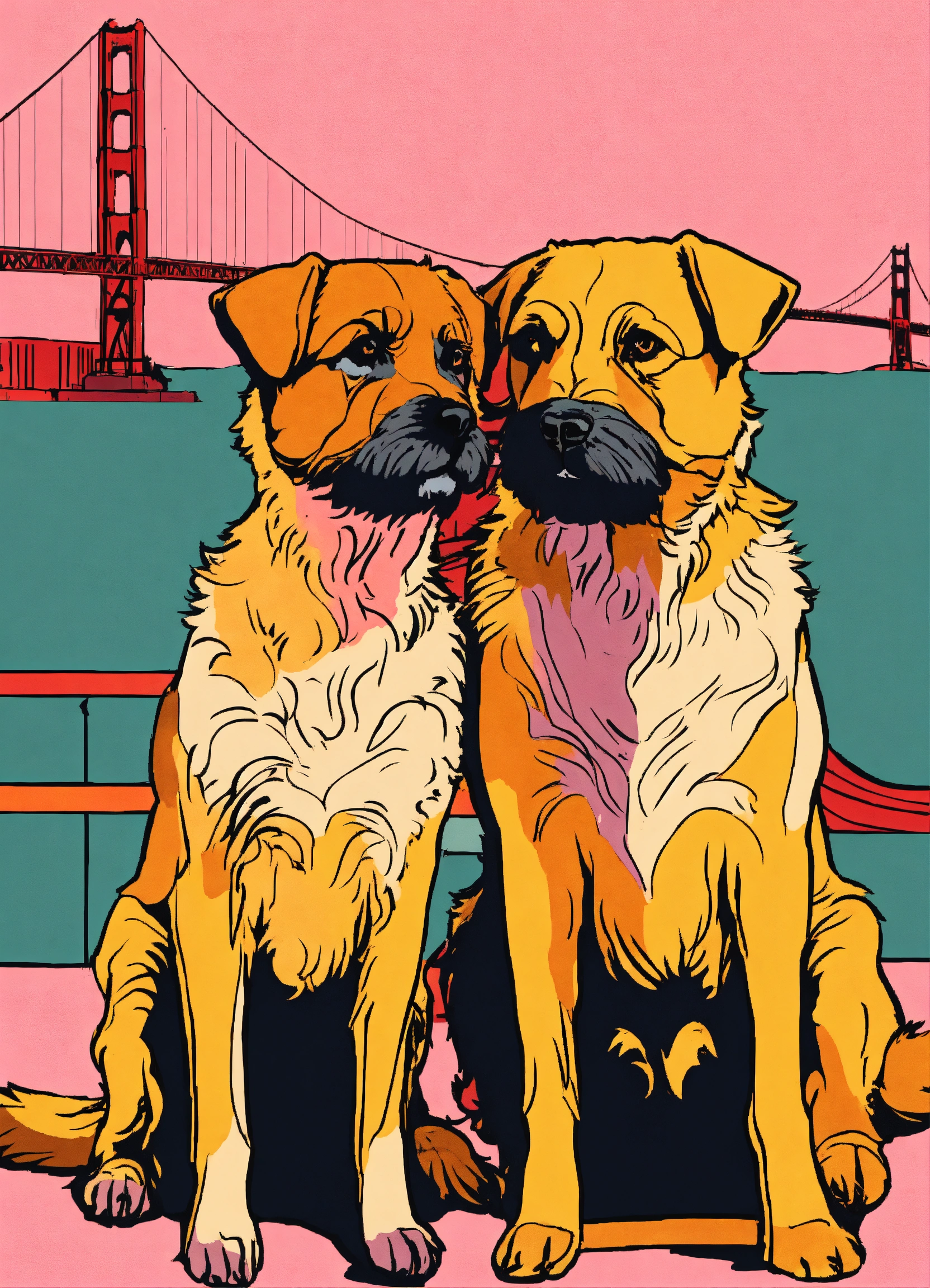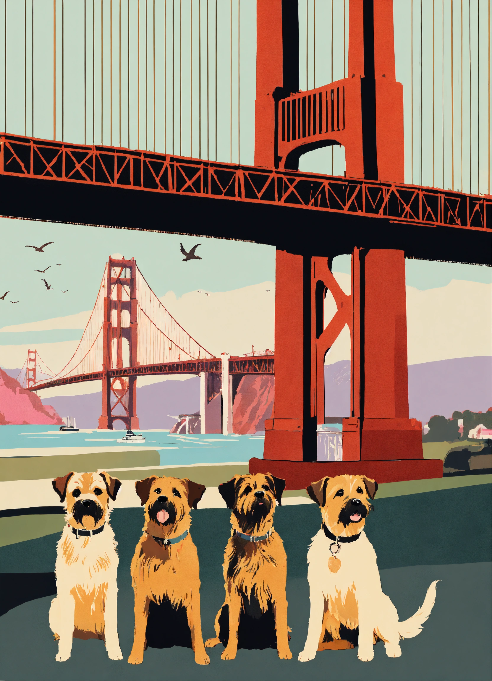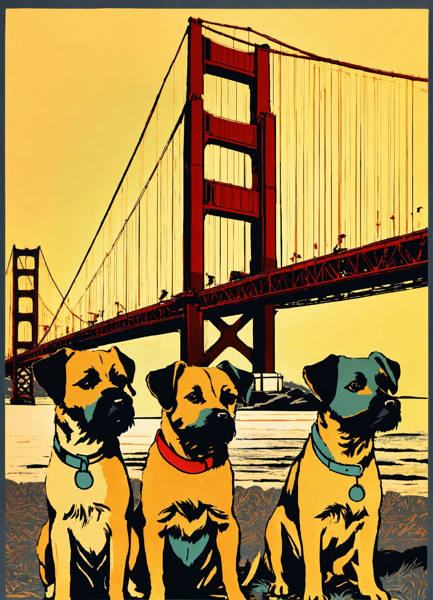 Abstract, border terrier group, no collars, dark muzzles and ears, screenprinting, golden gate bridge, symmetrical, pastels, no collars on dogs