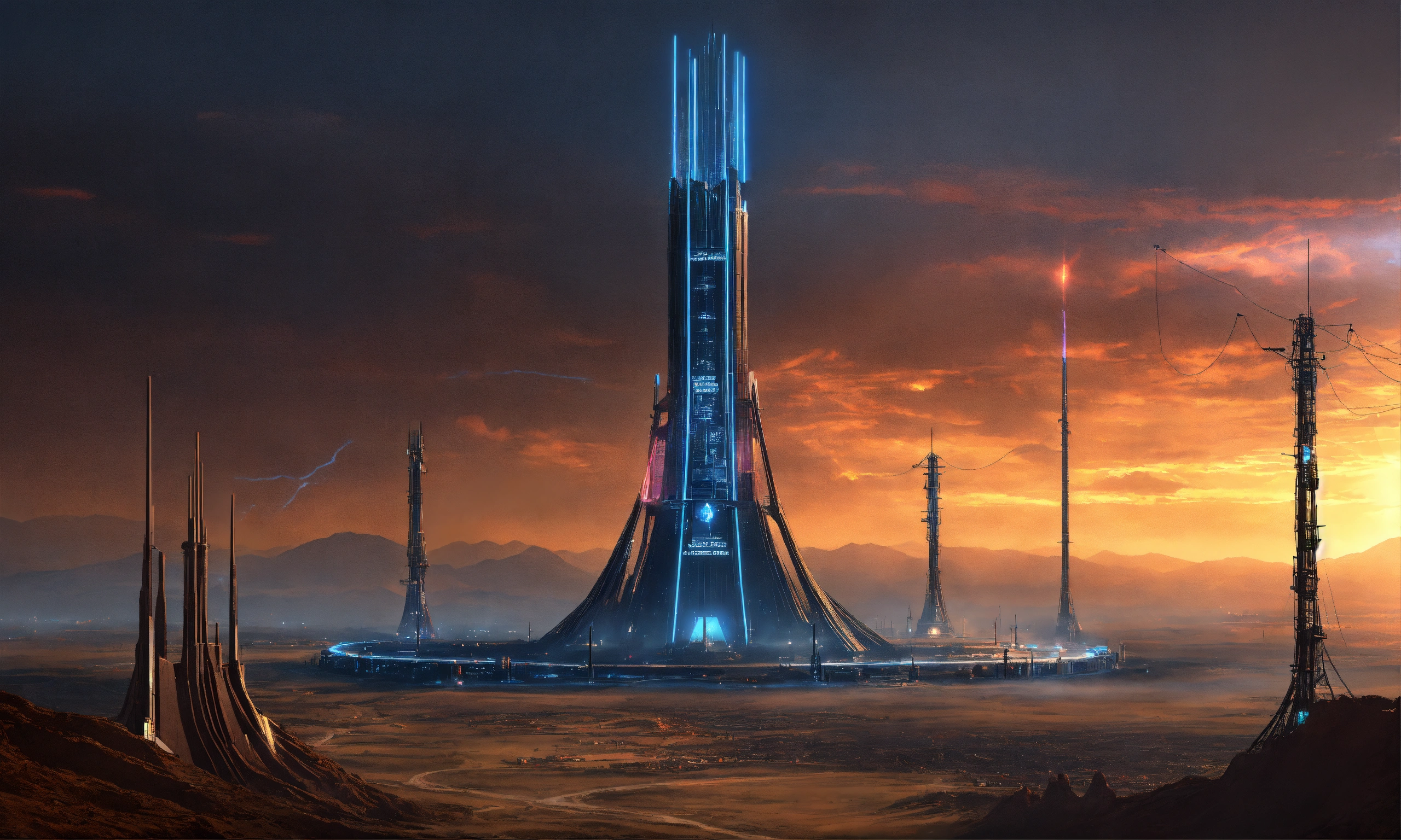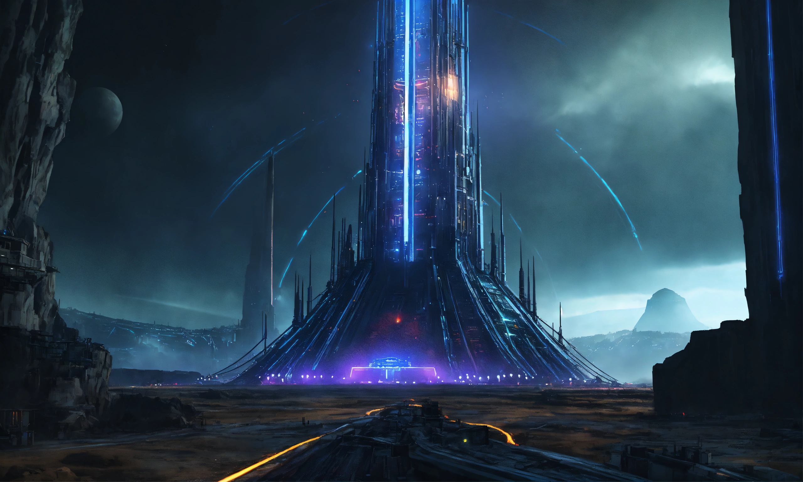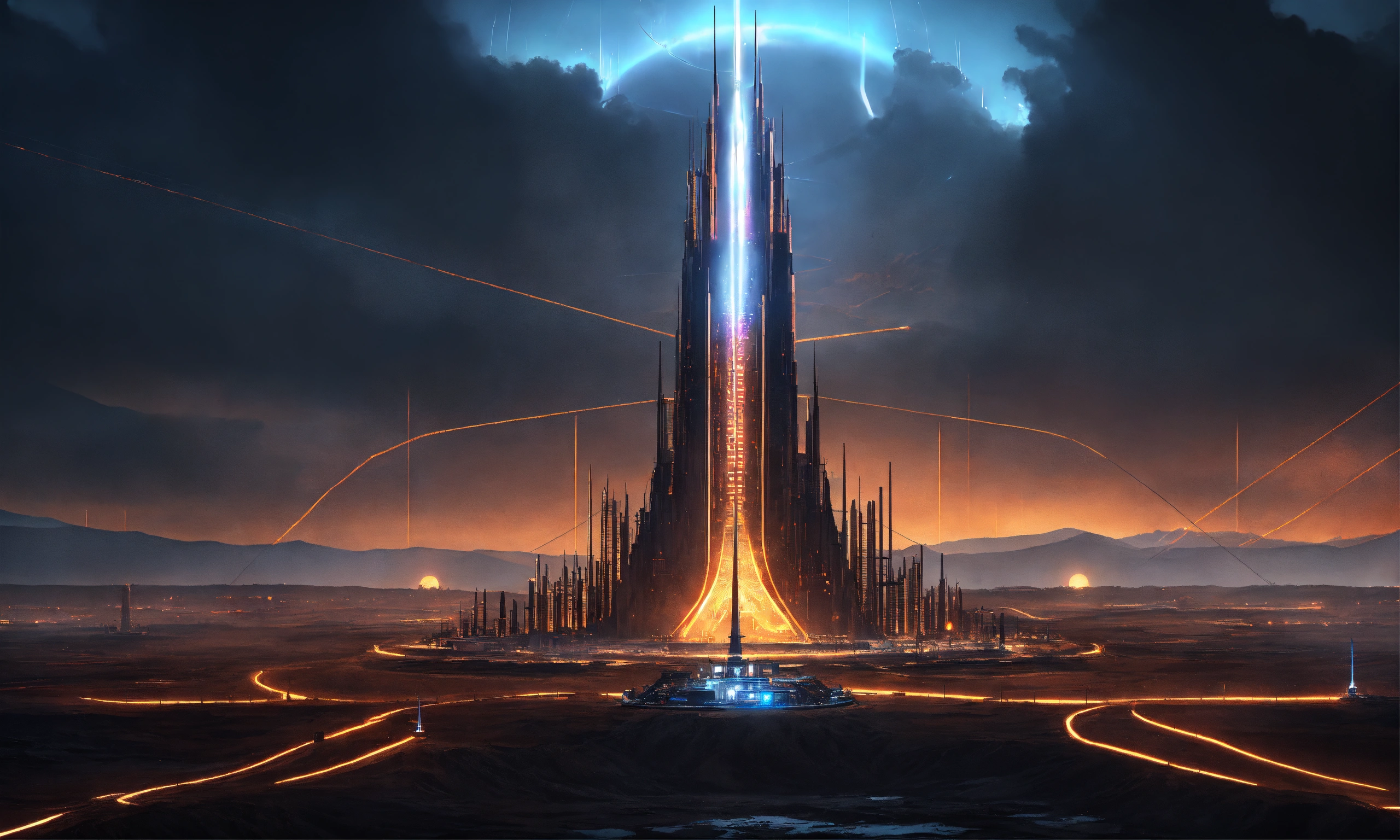 Dark alien tower of sauron seen from a distance is a towering fortress with digital circuit lines going up the structure with energy field blasting through the top to create a dome force field, digital hologram, tron, looks like music equipment with meter bridges, speakers, and transmission towers sound wave, in the middle of a wasteland, 8k realistic, pixar, disney, sci-fi