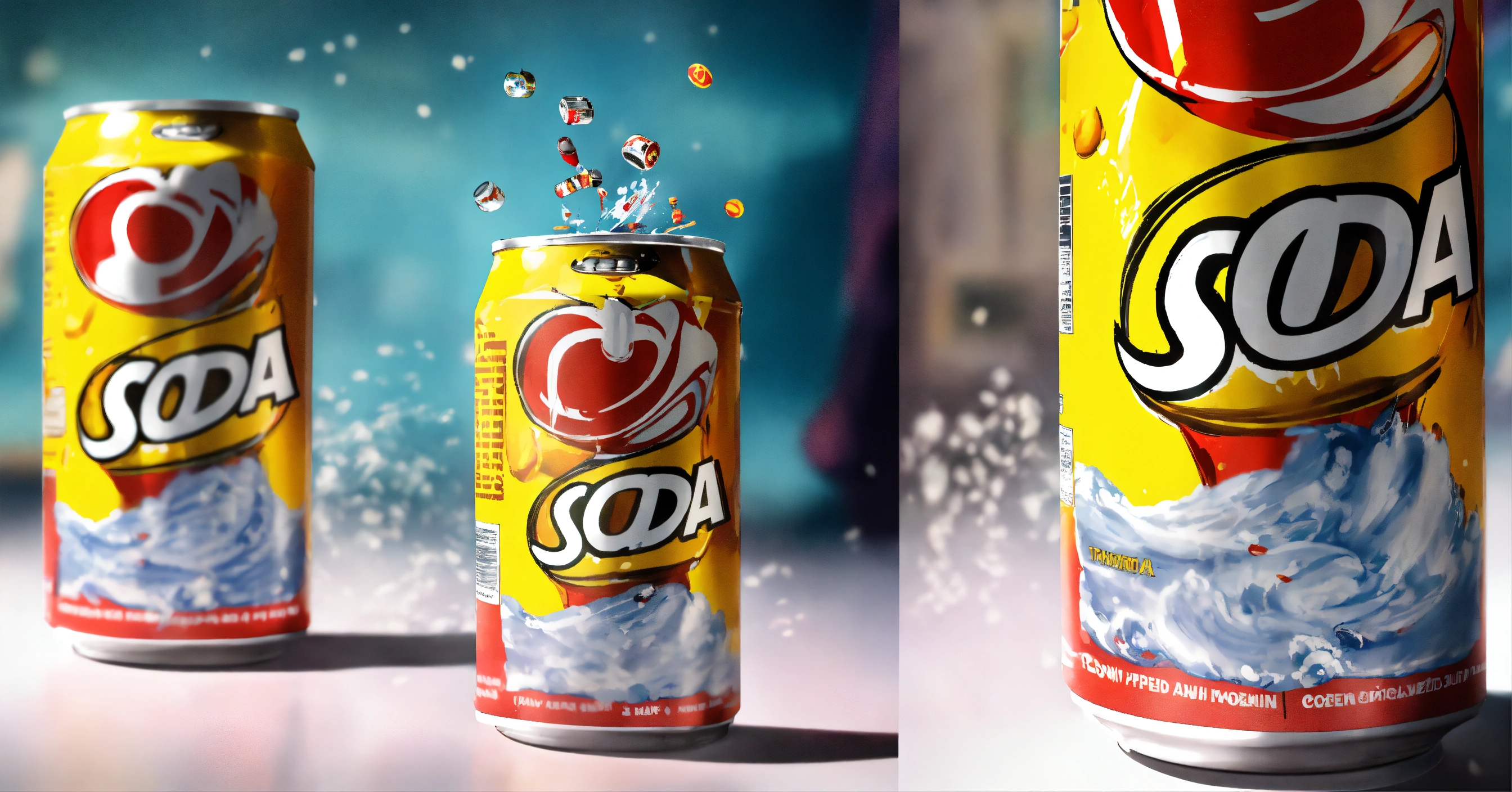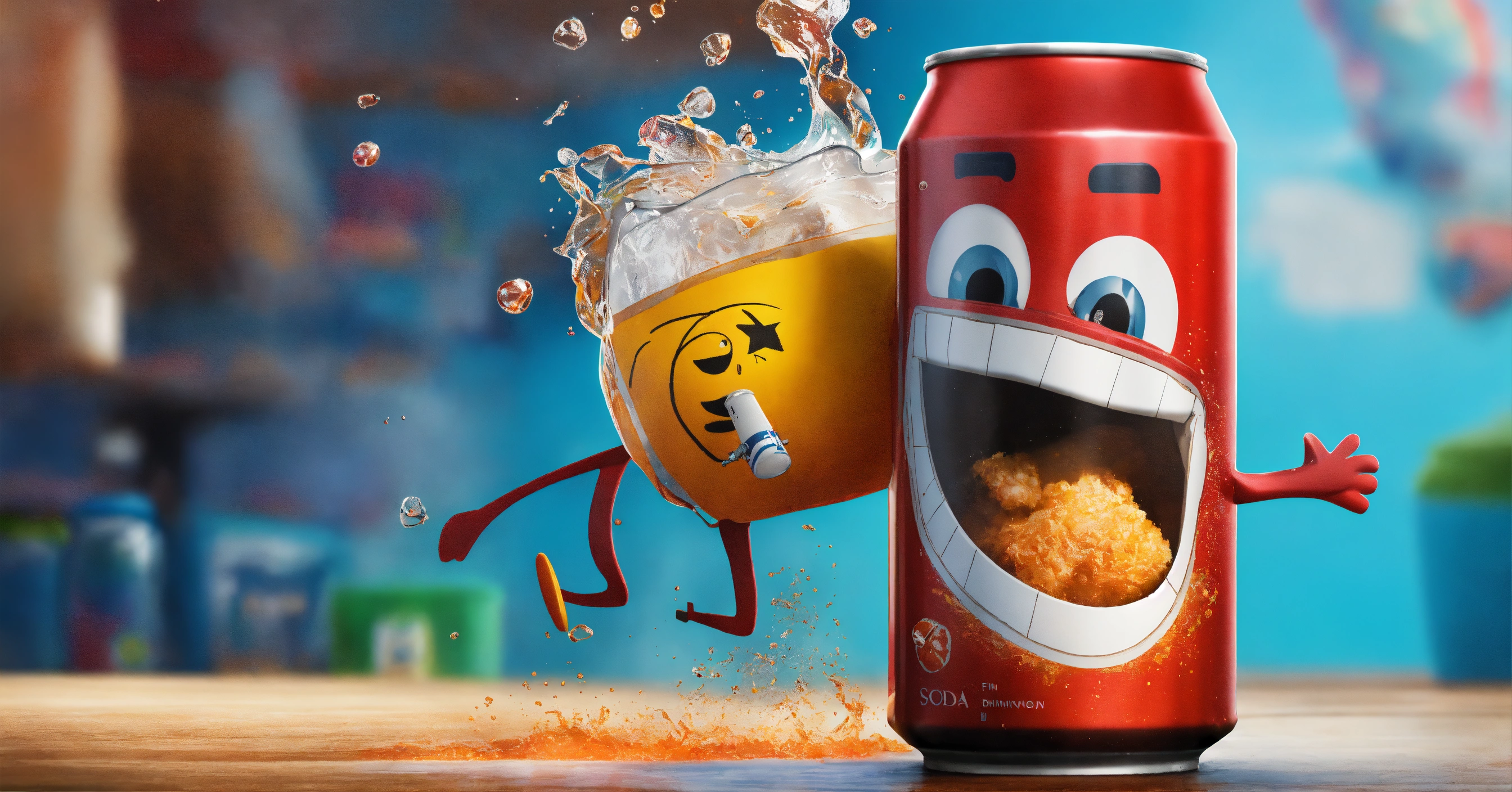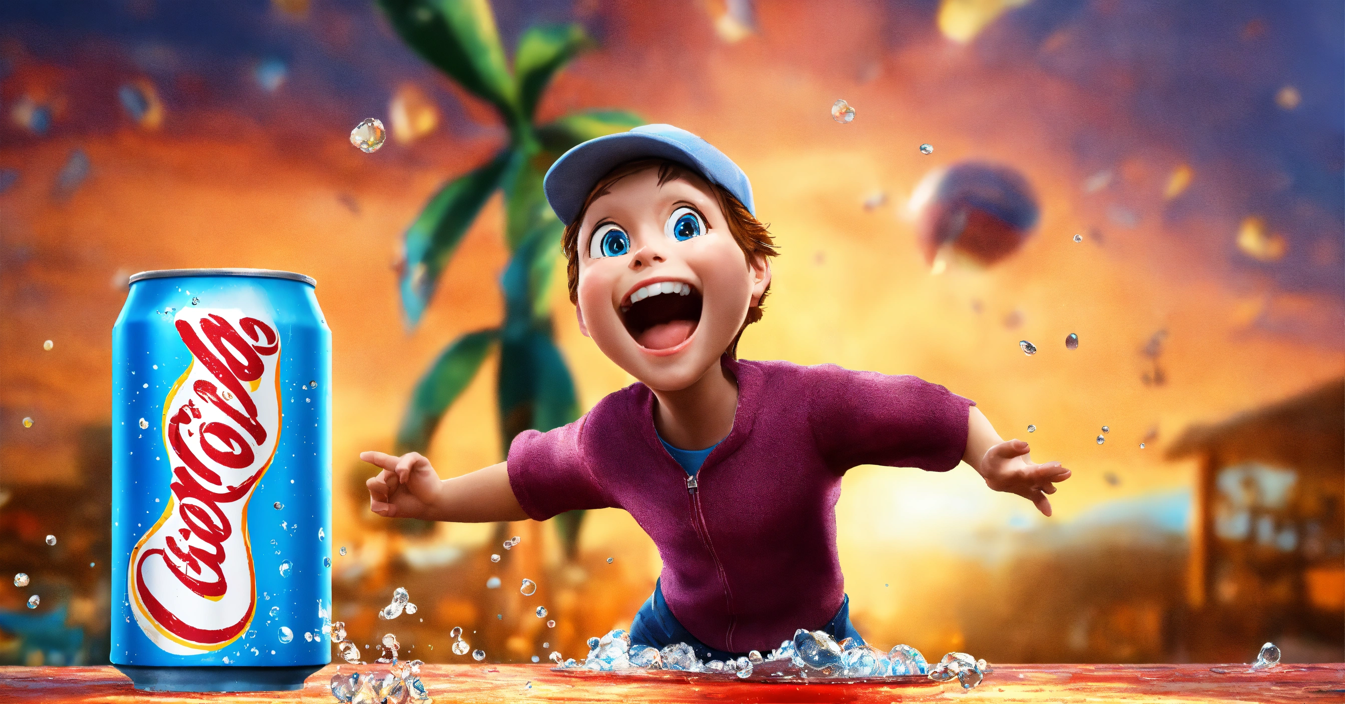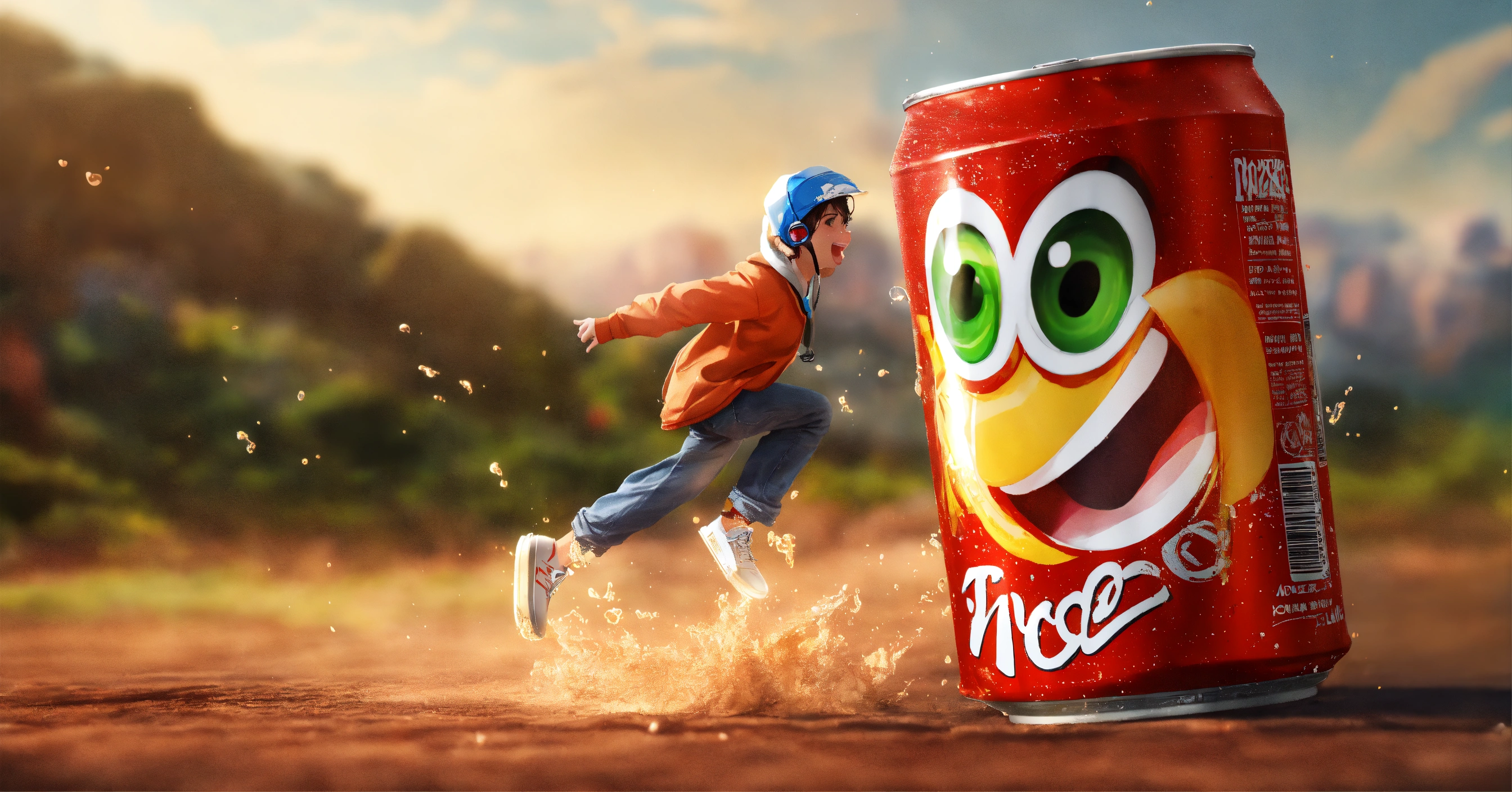 Photorealistic image of a fun 2 dimensional character jumping out of printed can of soda and becoming a 3 dimensional avatar