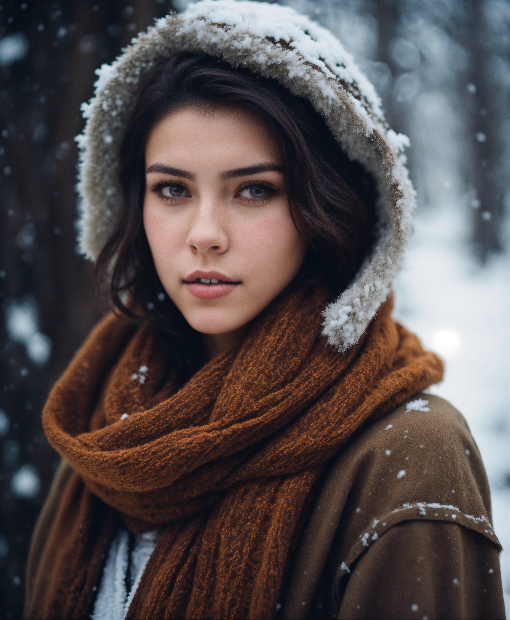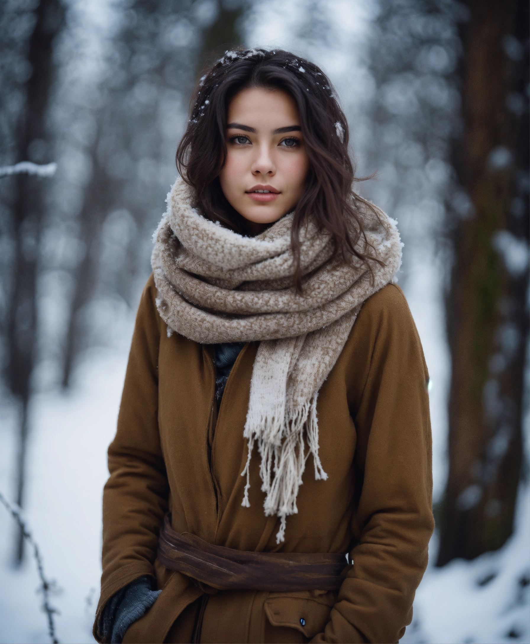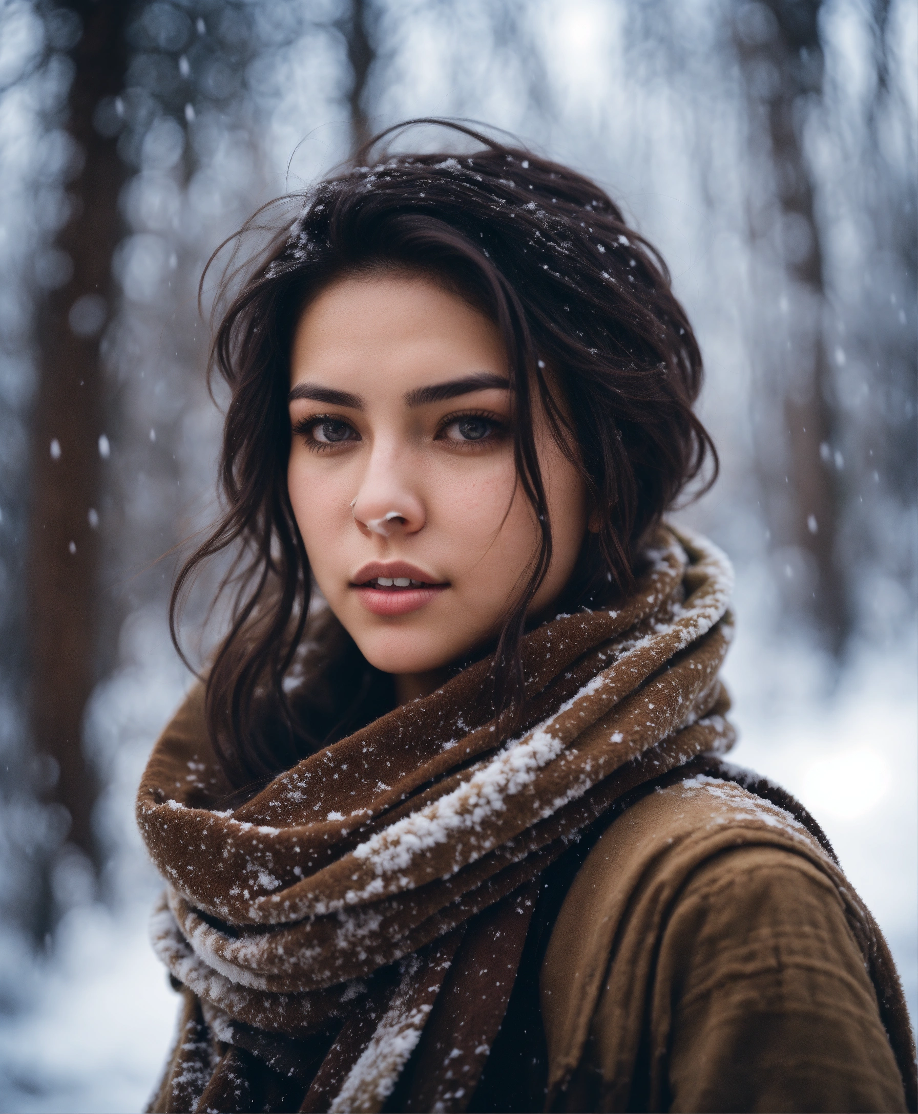 An ultra detailed photo of a 22 years old brunette girl, with mid-short loose hair, brown eyes, natural beauty, calm expression, warm skin tone, strong body, wearing a scarf and snowy post-apocalyptic clothes, a snowed forest in the background. romantic aura. no jewelry, no makeup.