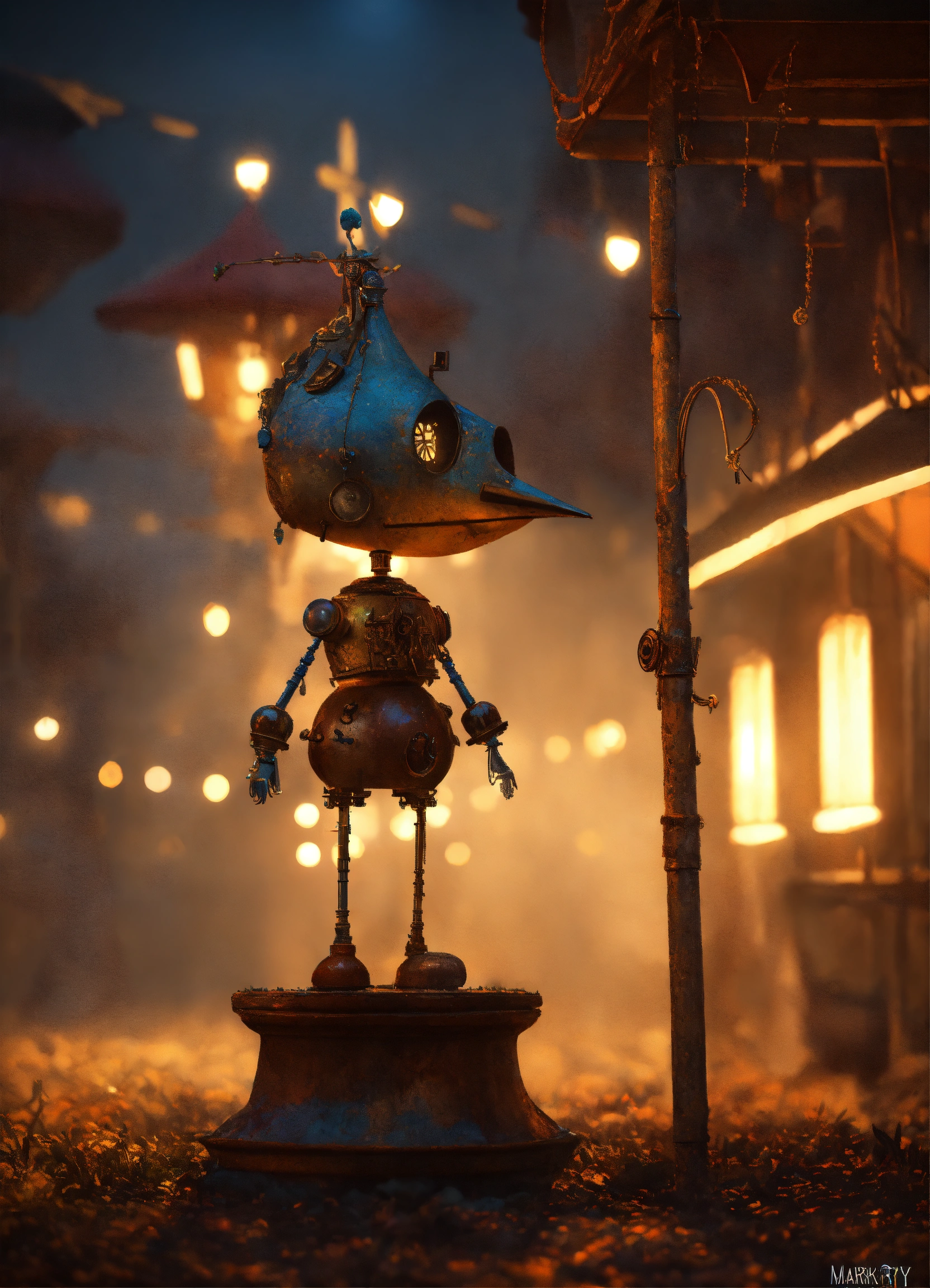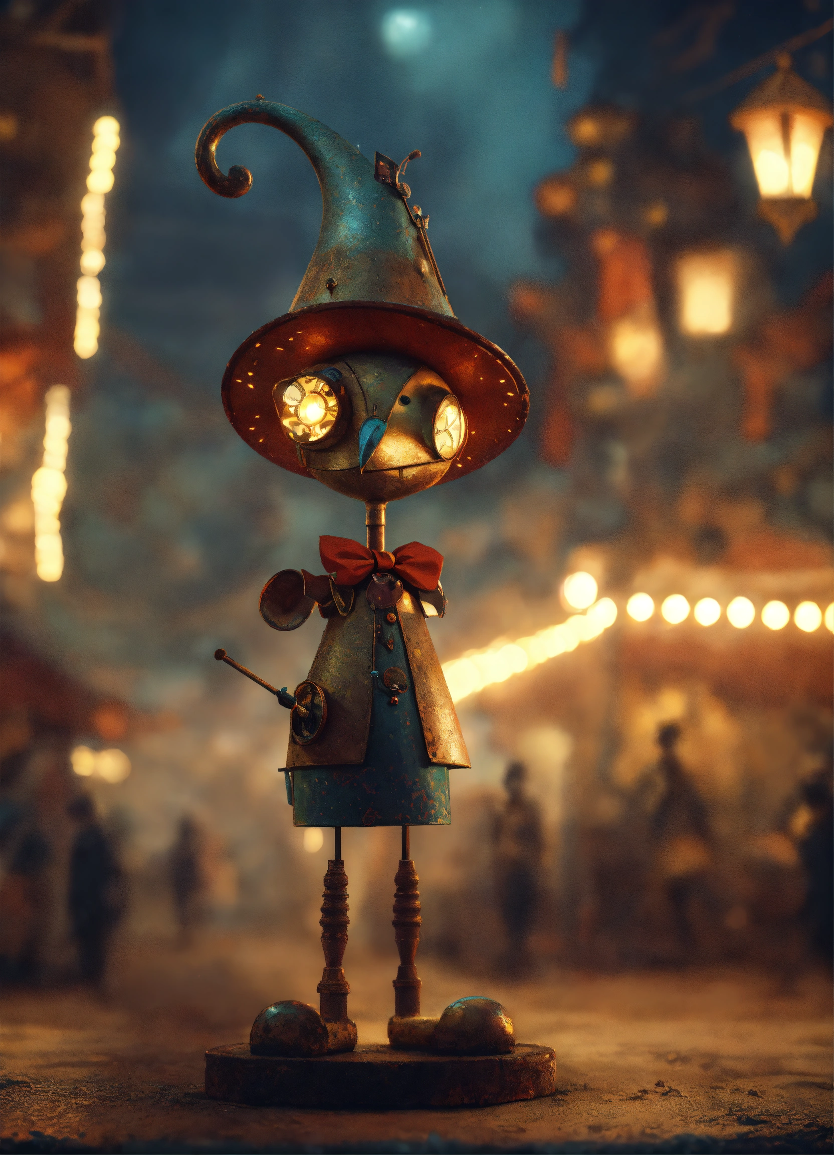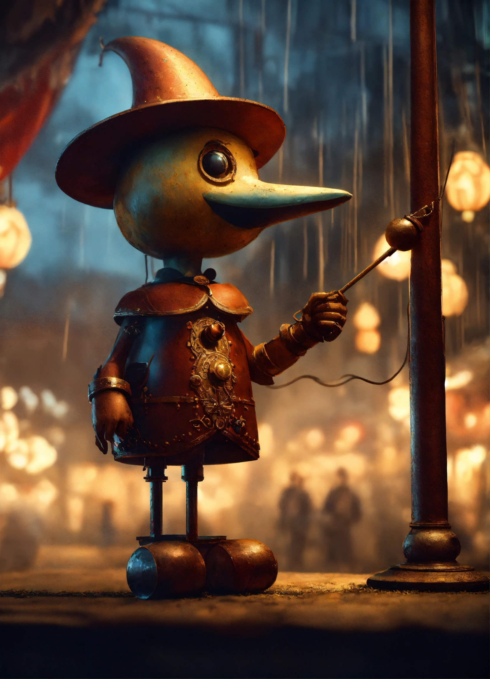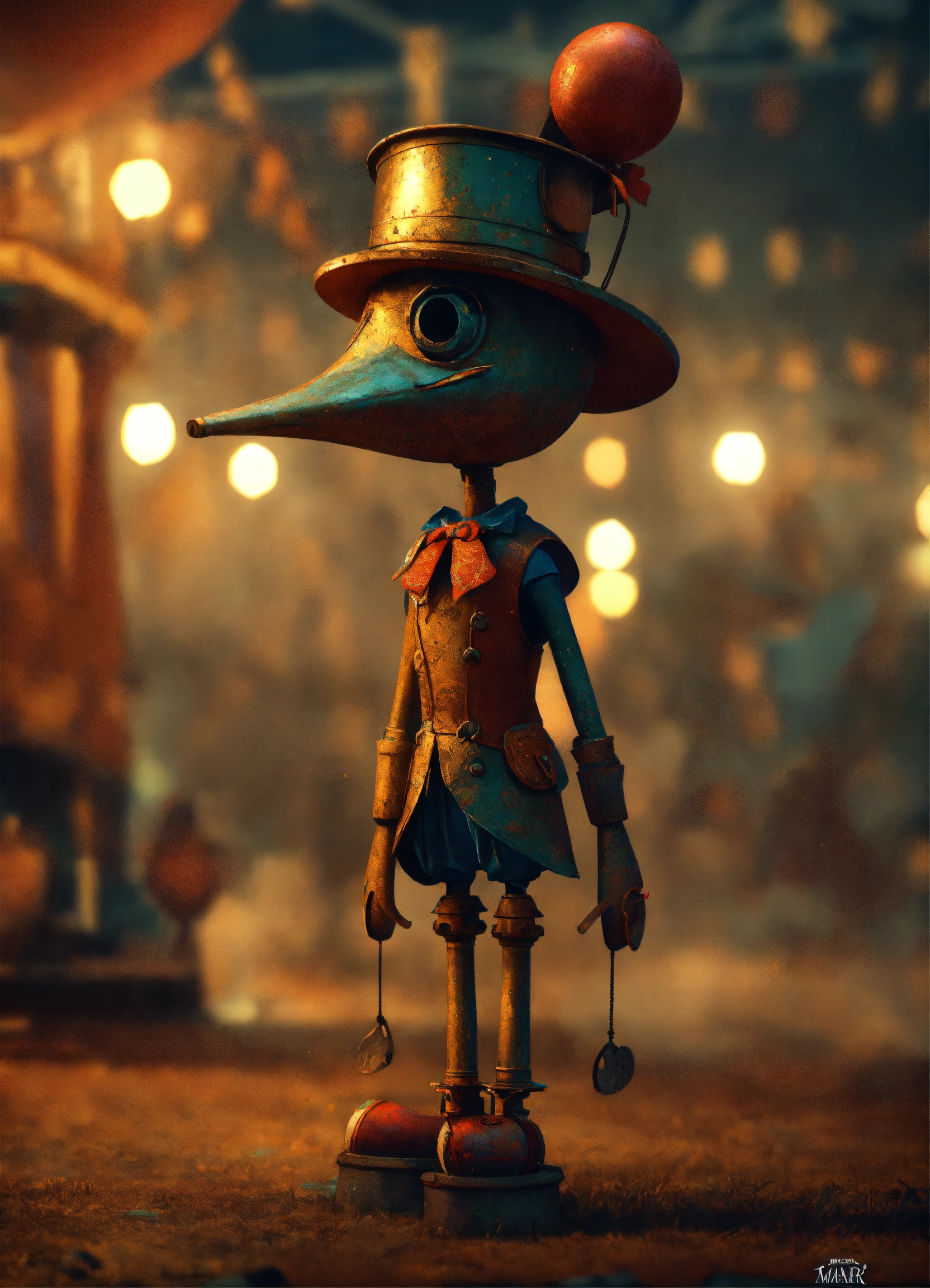 Pinocchio whit a long nose made of rusted metal in a birdcase, vintage circus carnival, foggy weather, night light, intricate, sharf focus, concept art, artstation, fantasy art, octane render, cinematic lighting, otherworldy, by mark ryden