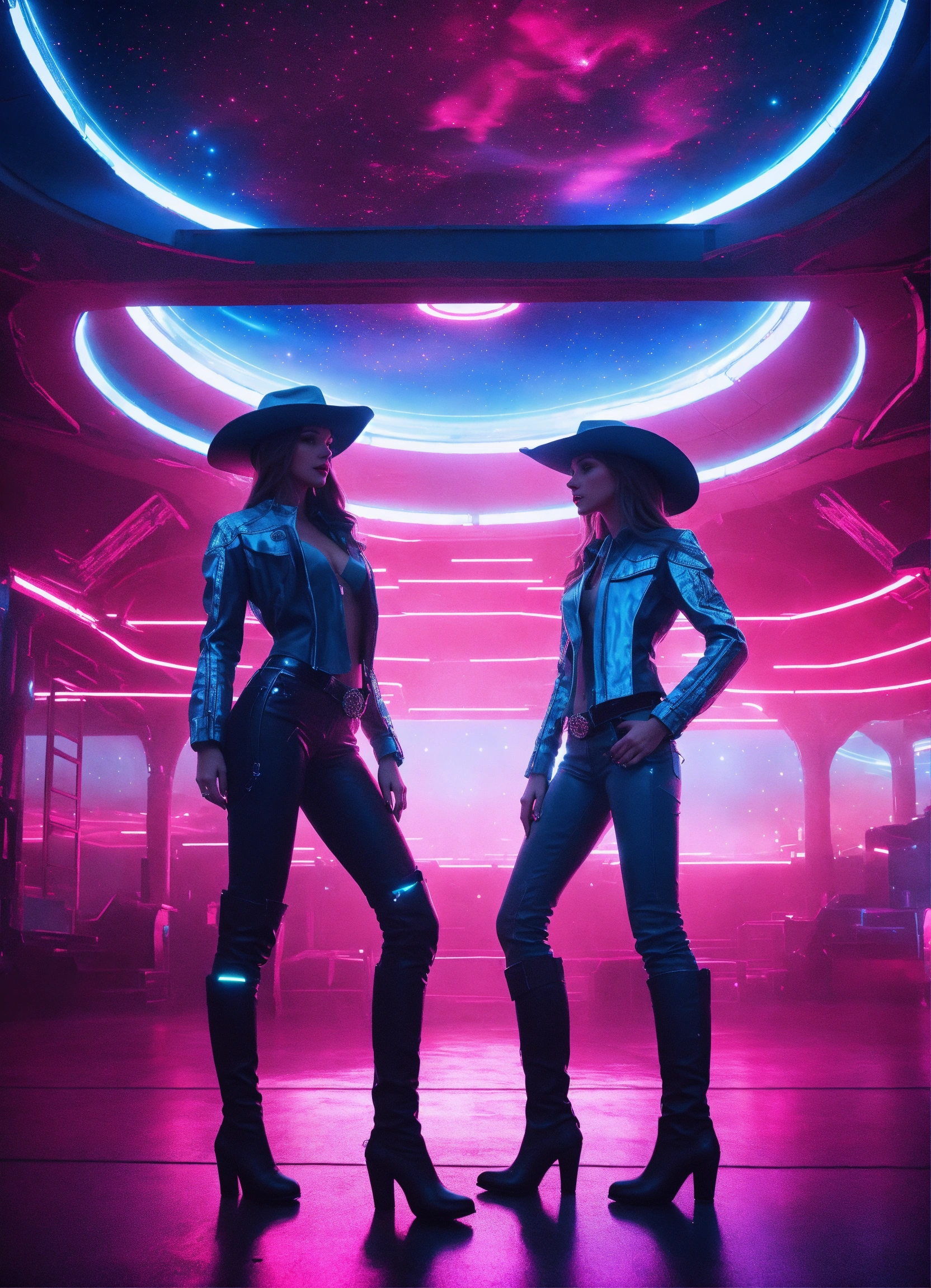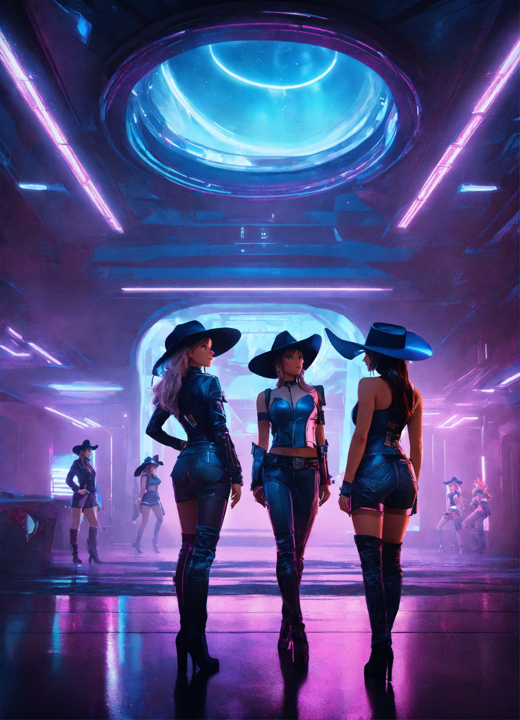 Three futuristic cowgirls wearing cowboy hats. they are standing in a dark, dimly-lit, futuristic dance hall at night. the interior of the dance hall looks like the ruins of a spaceship. the night stars shine above the glass ceiling of the dance hall. the interior lights glow blue and grey and blue and pink. digital art. trending on artstation.