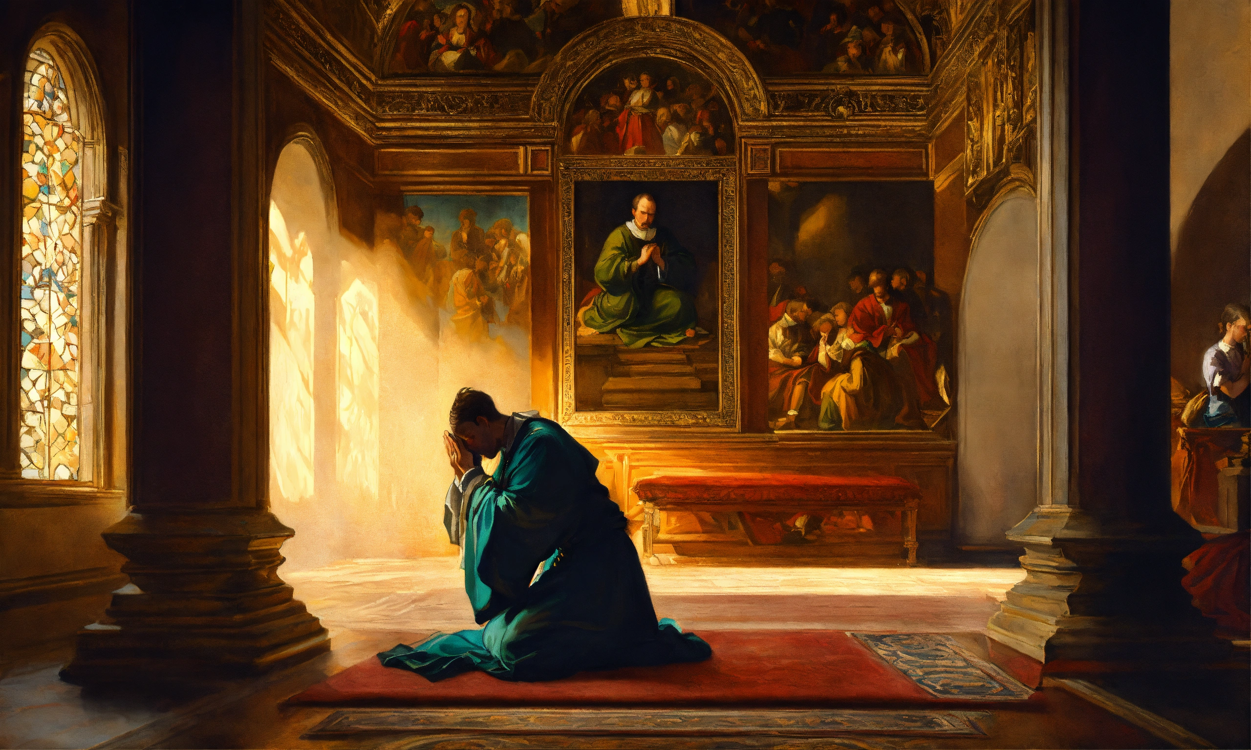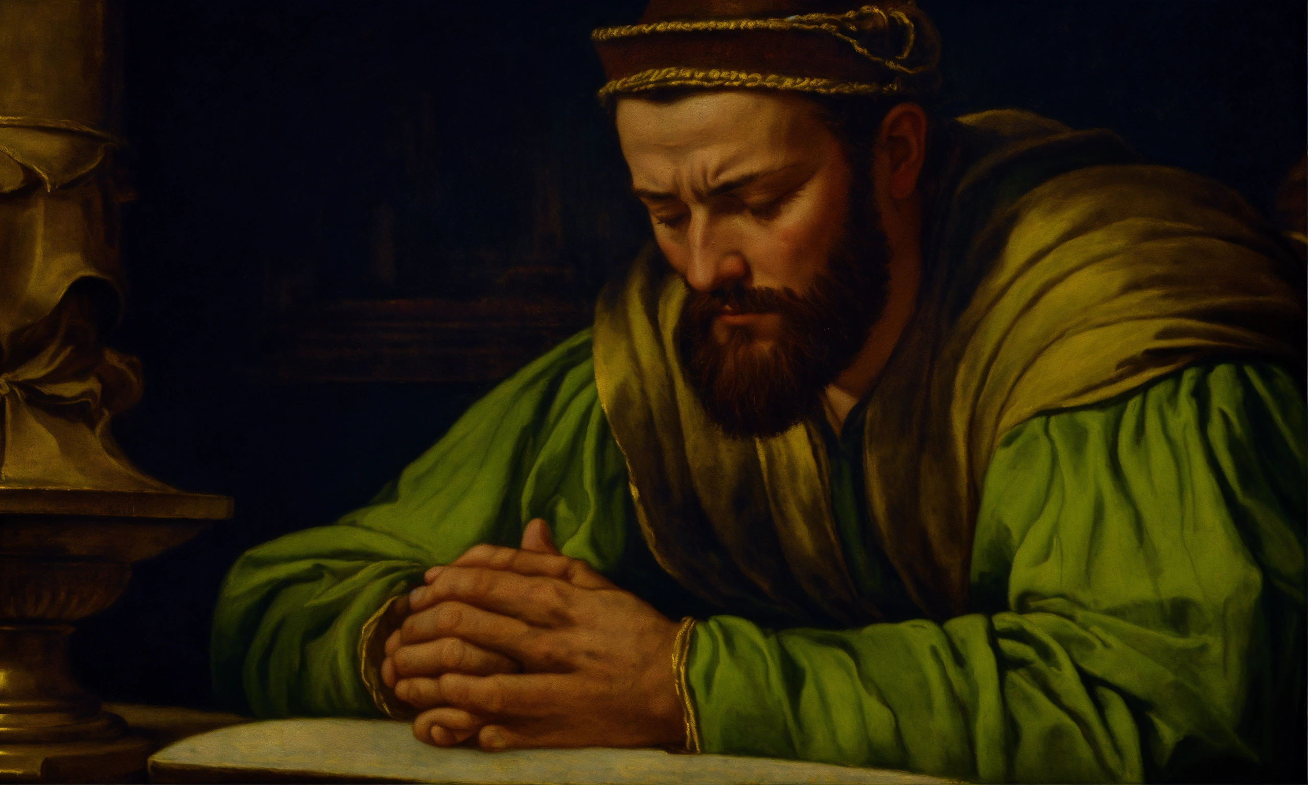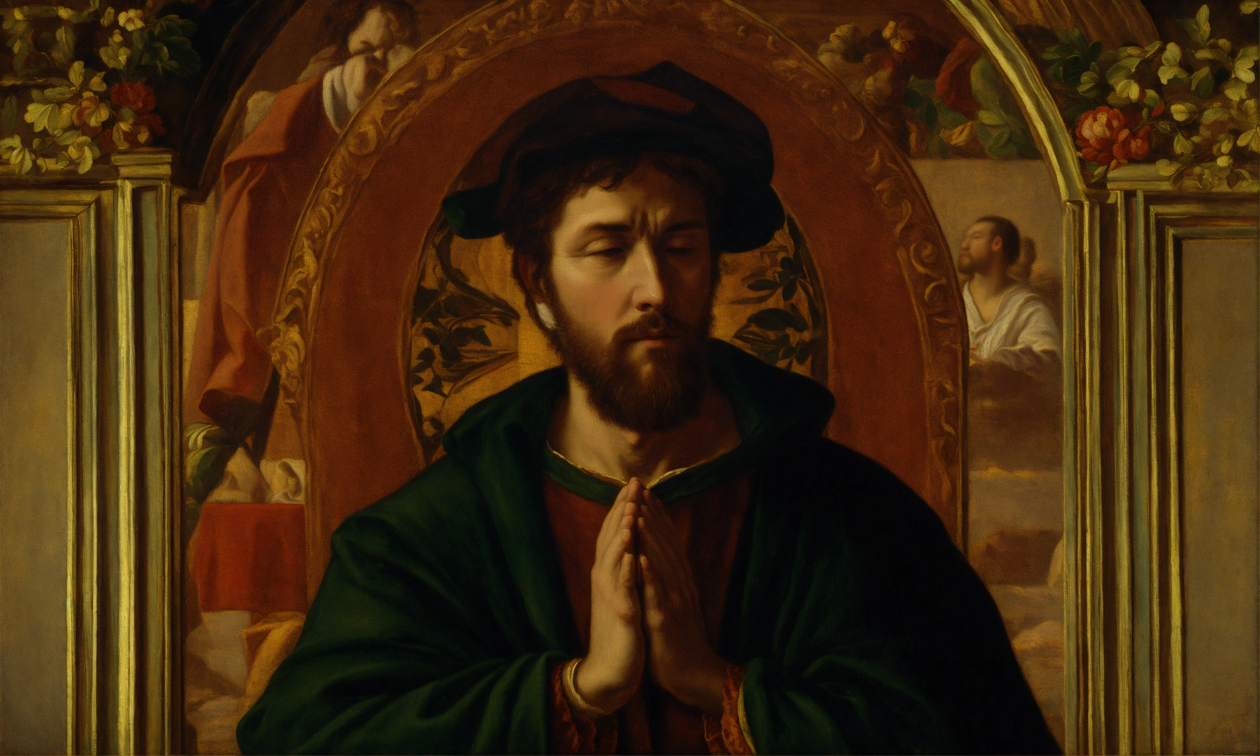 Renaissance oil painting of a man praying