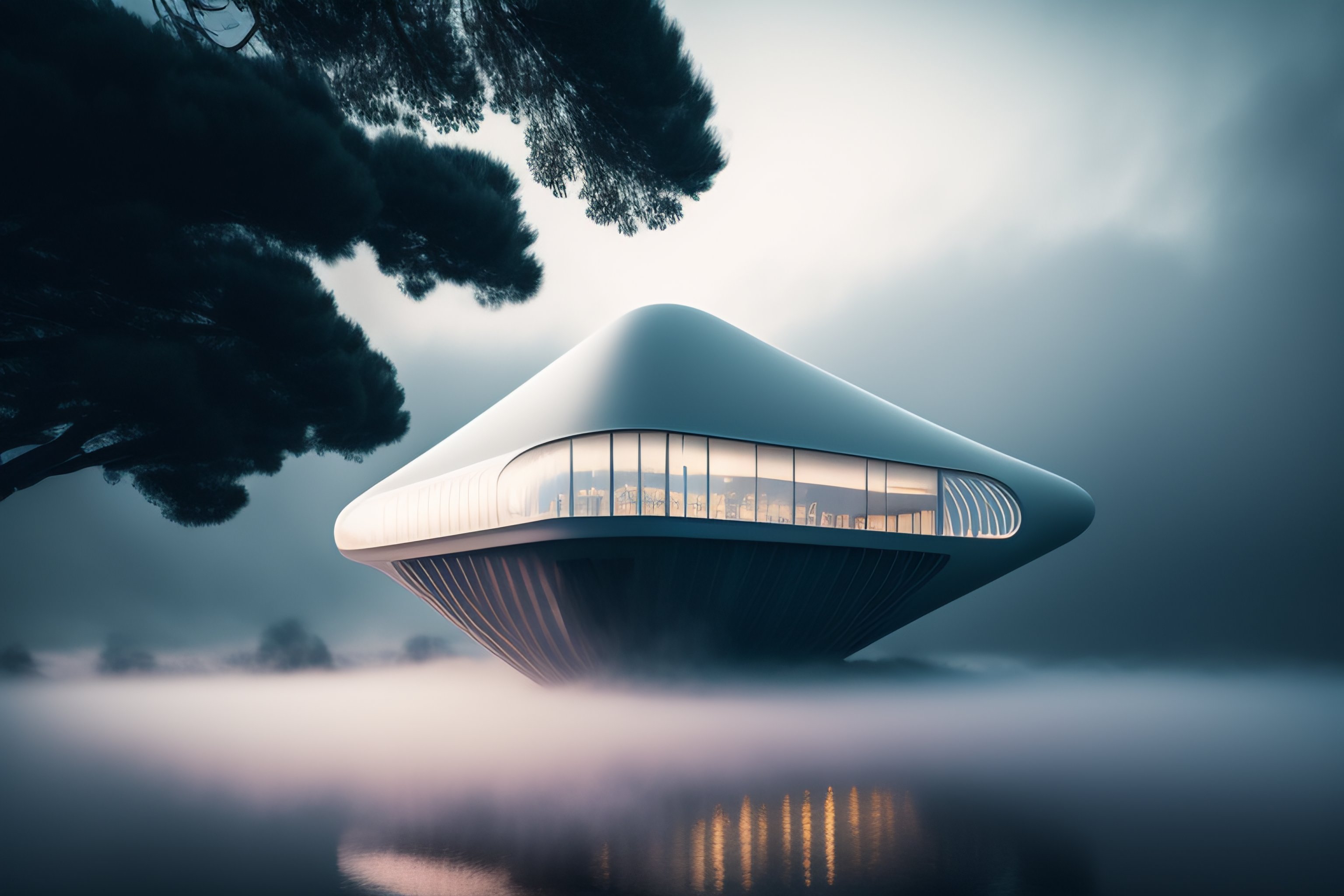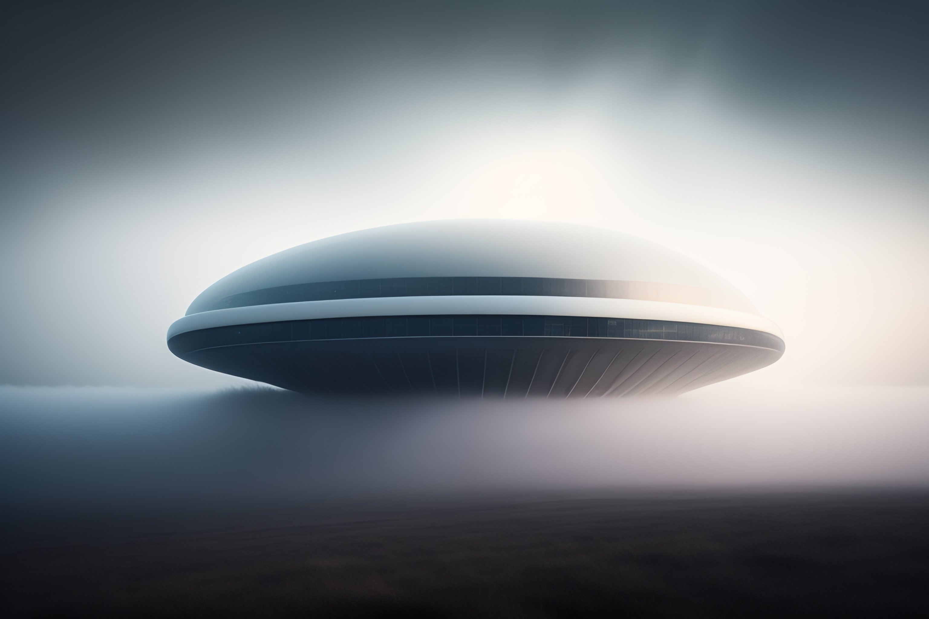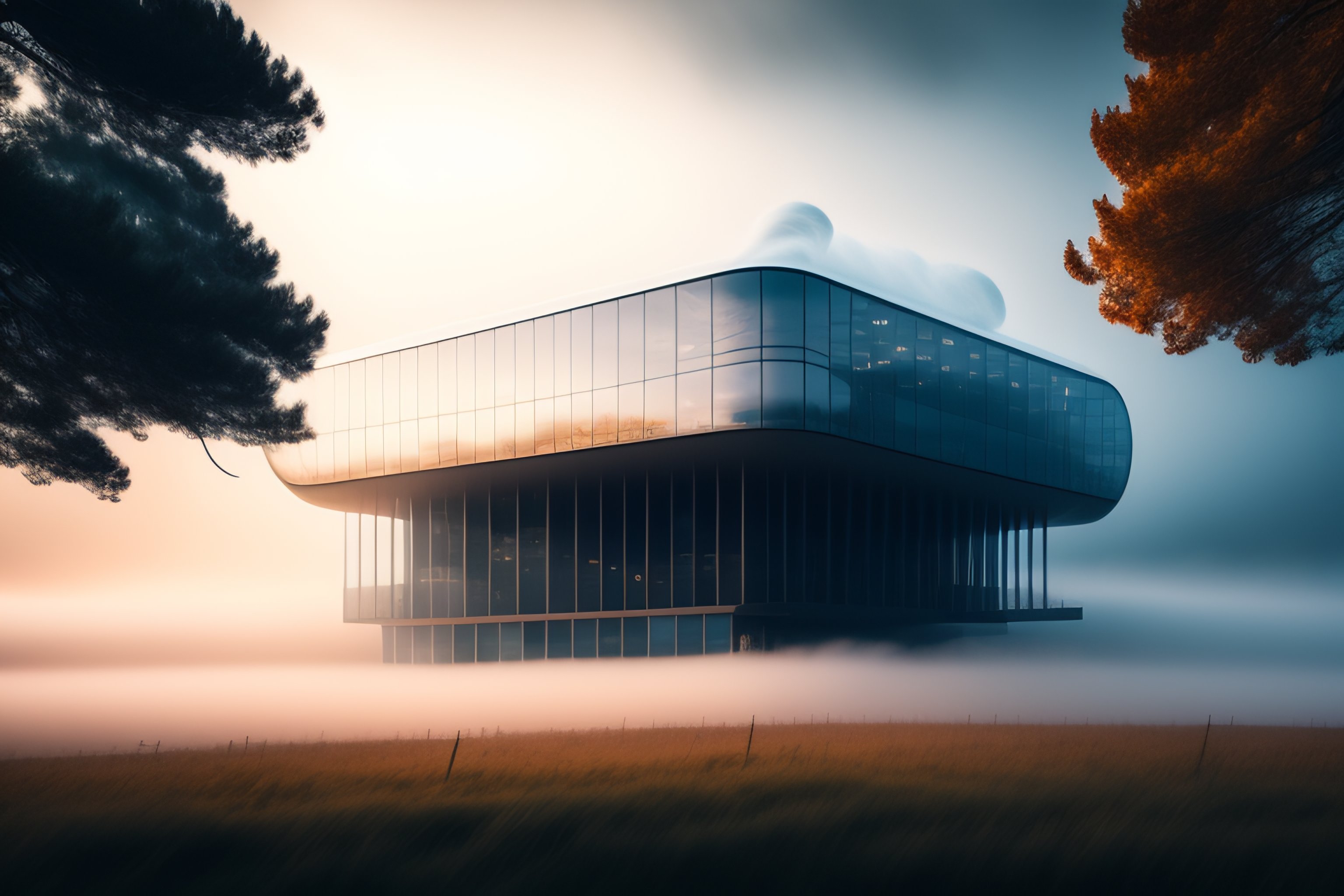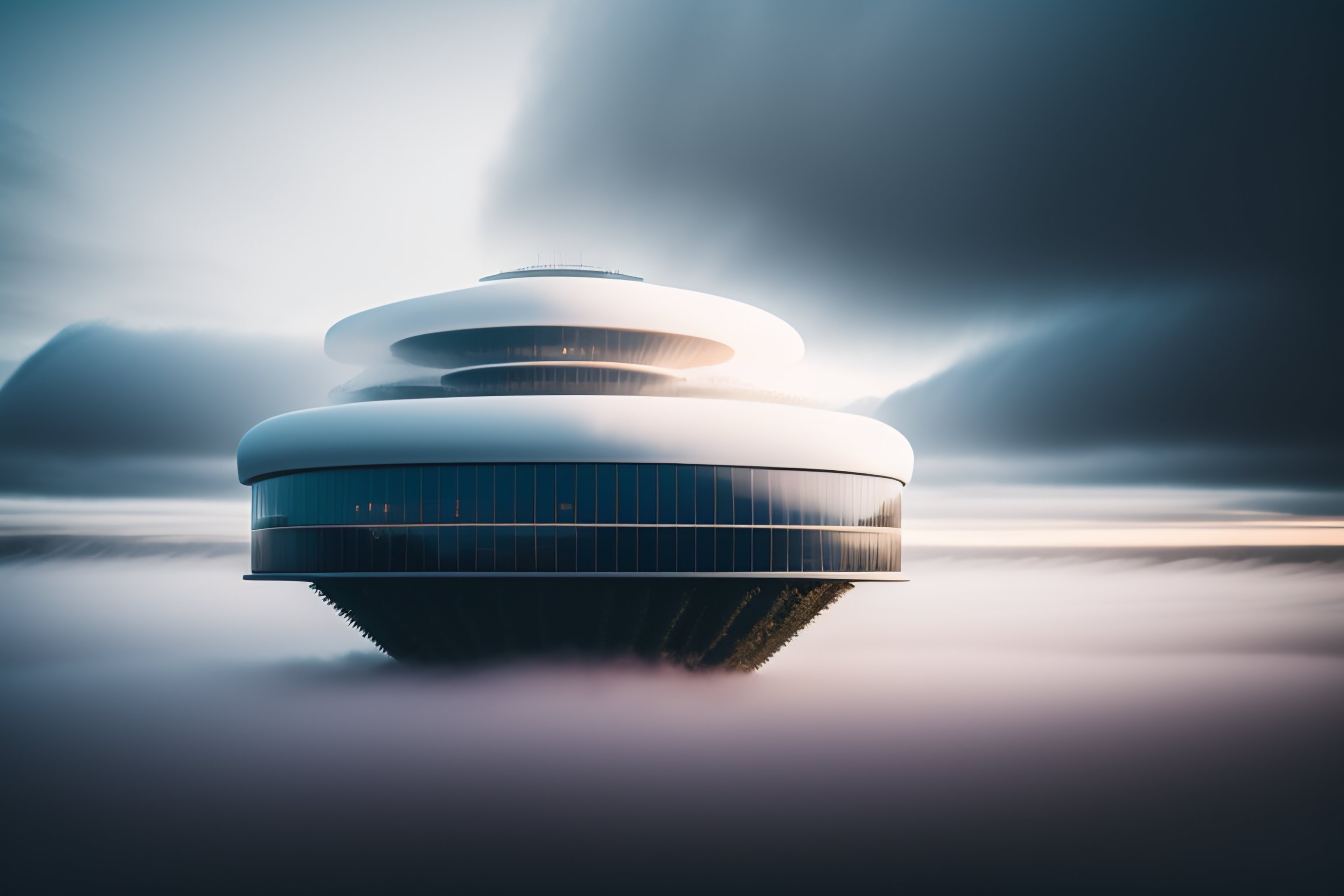 A modern building floating in the air on a cloud above fog