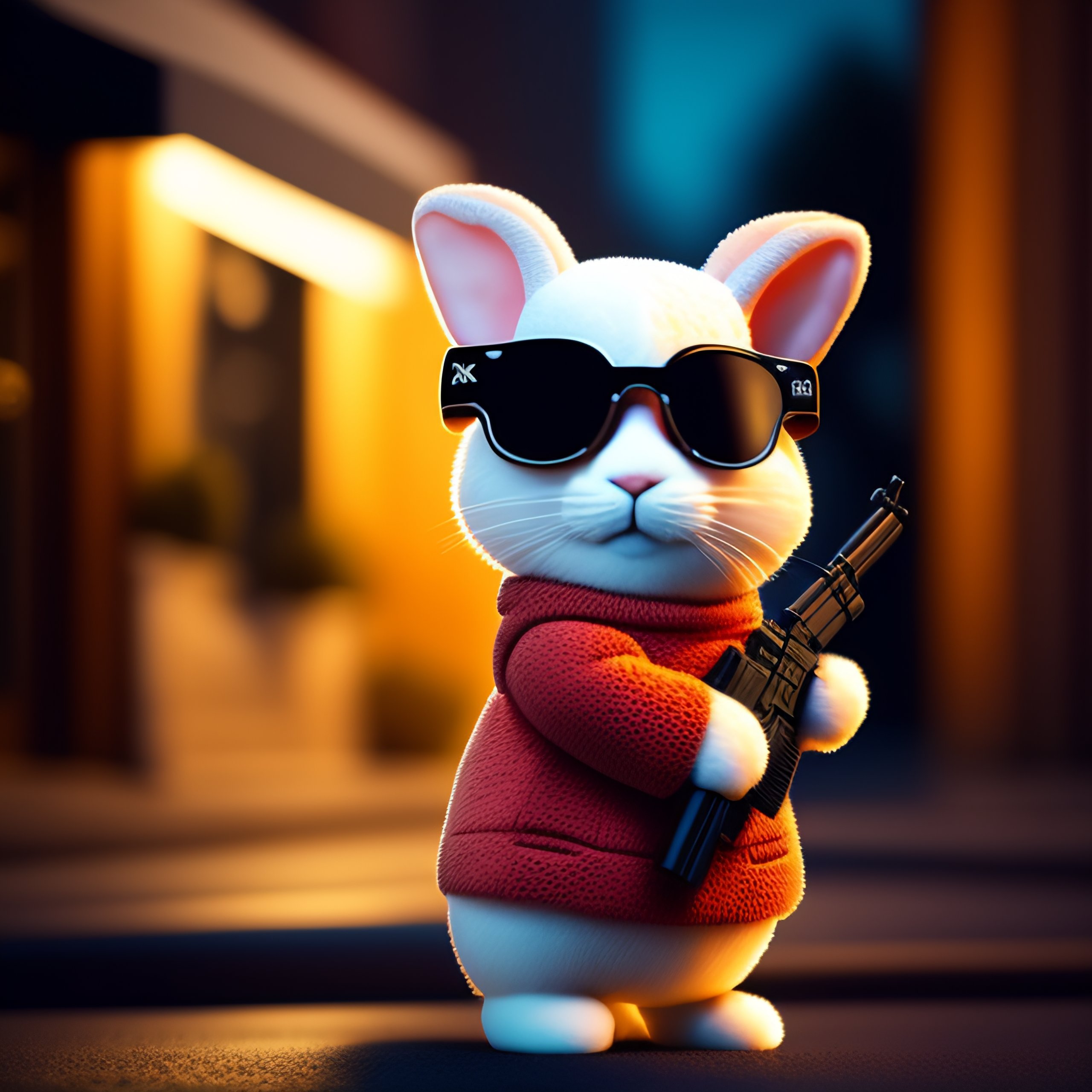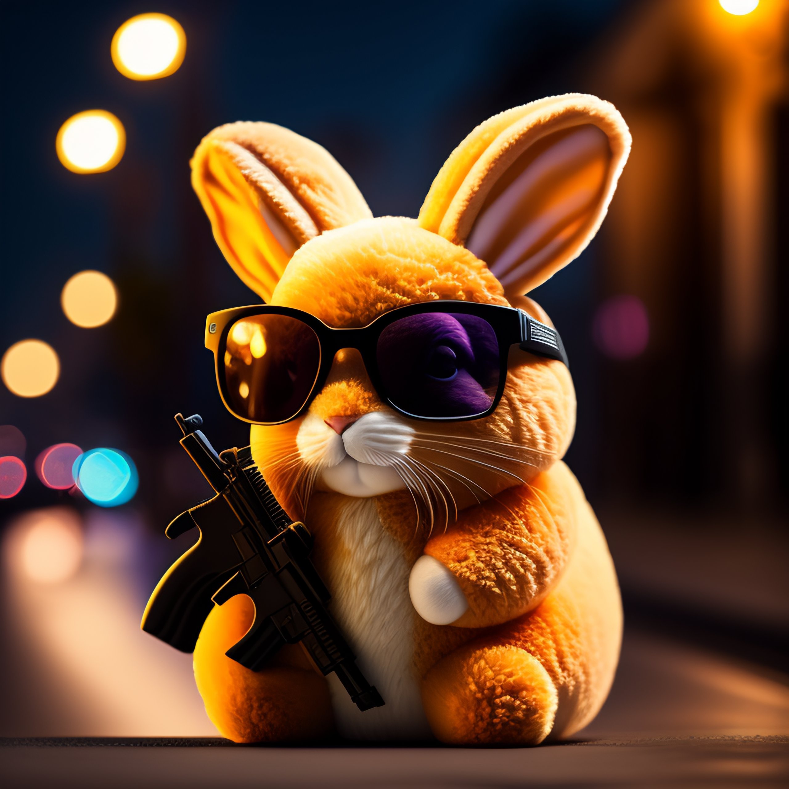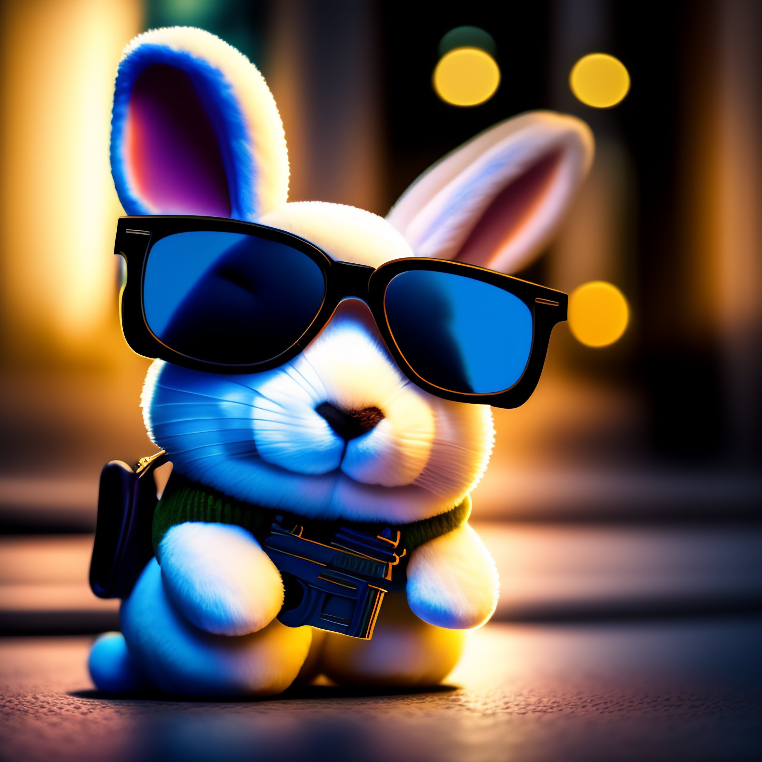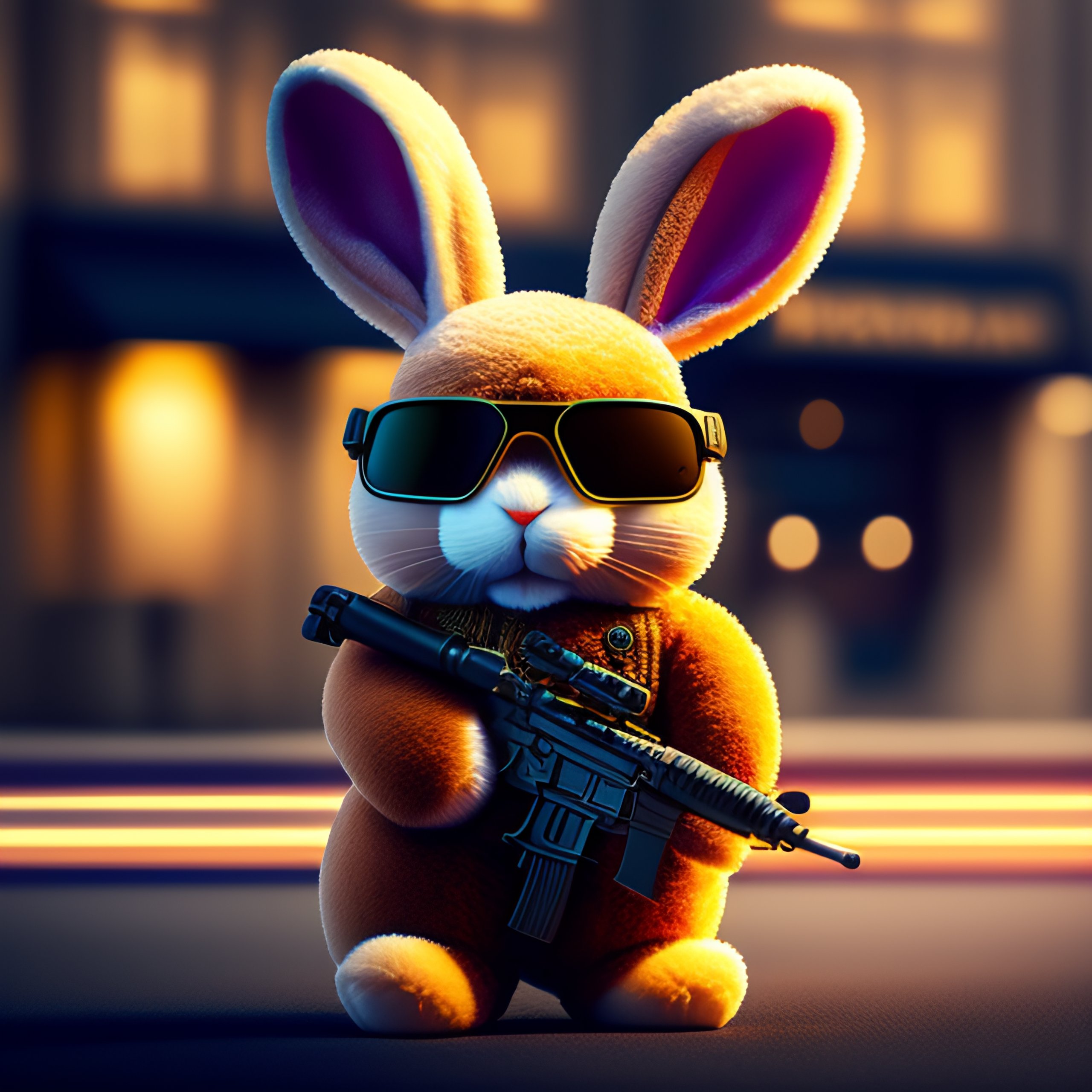 Plush rabbit with gun and sunglasses in front of bank robbing 8k
