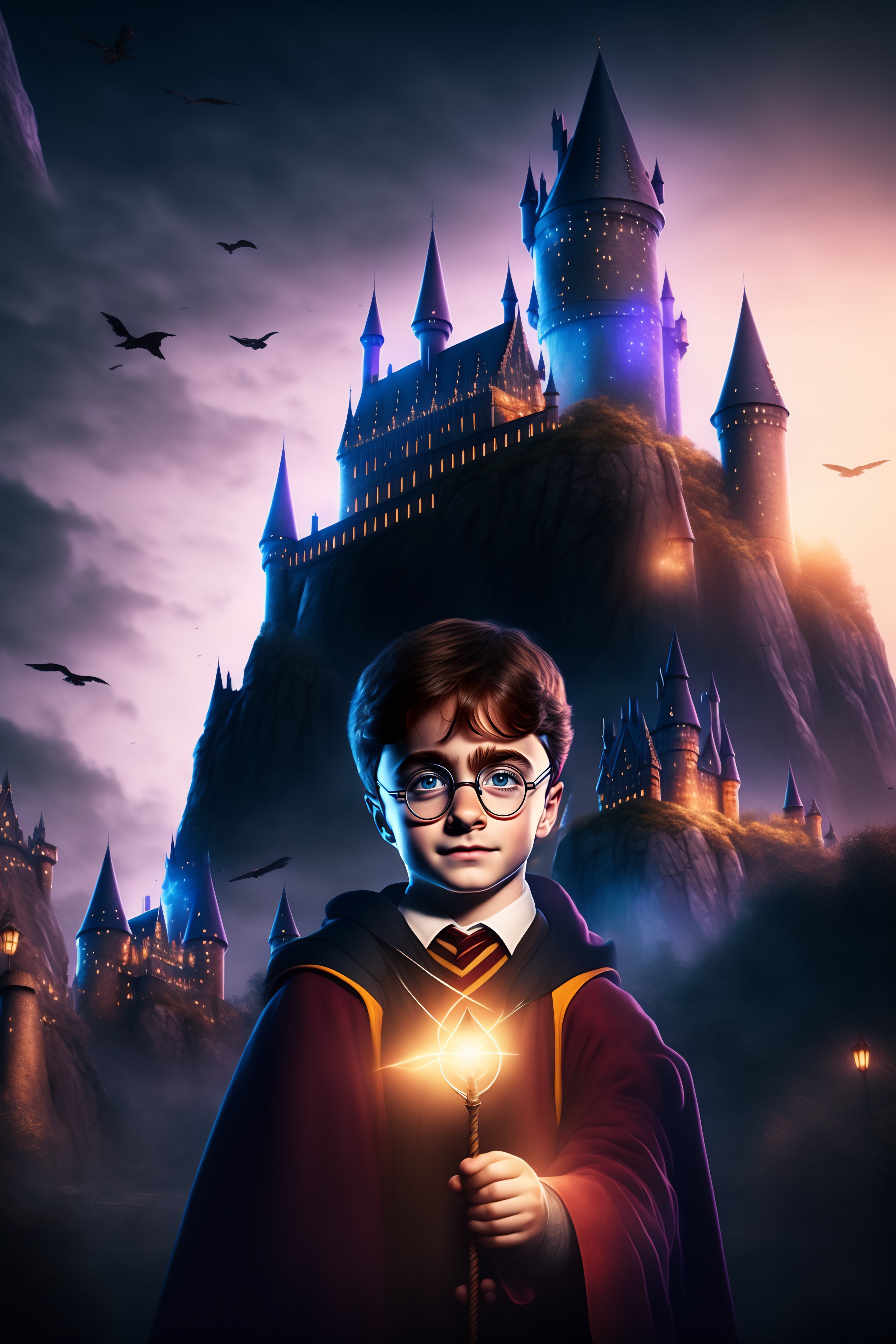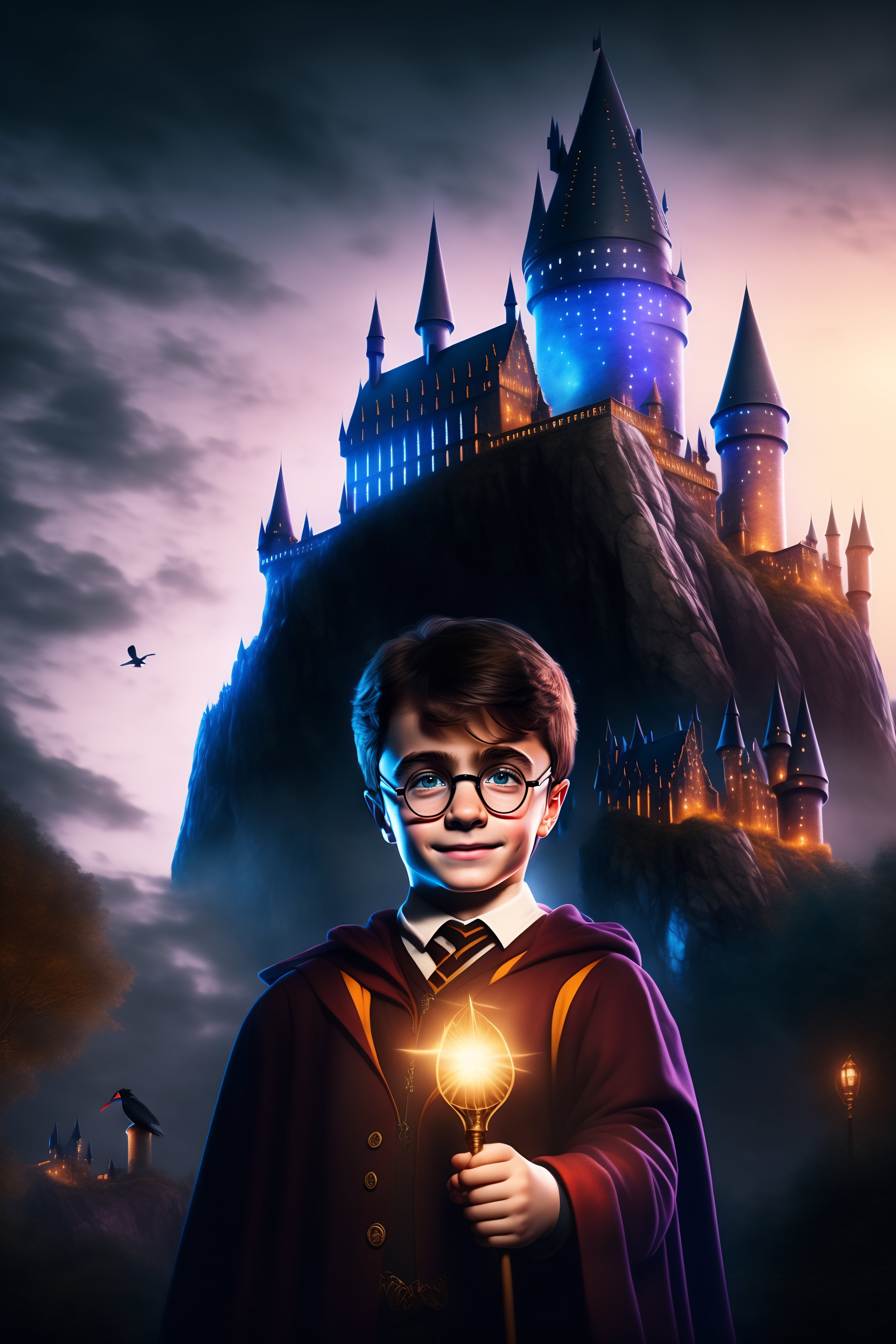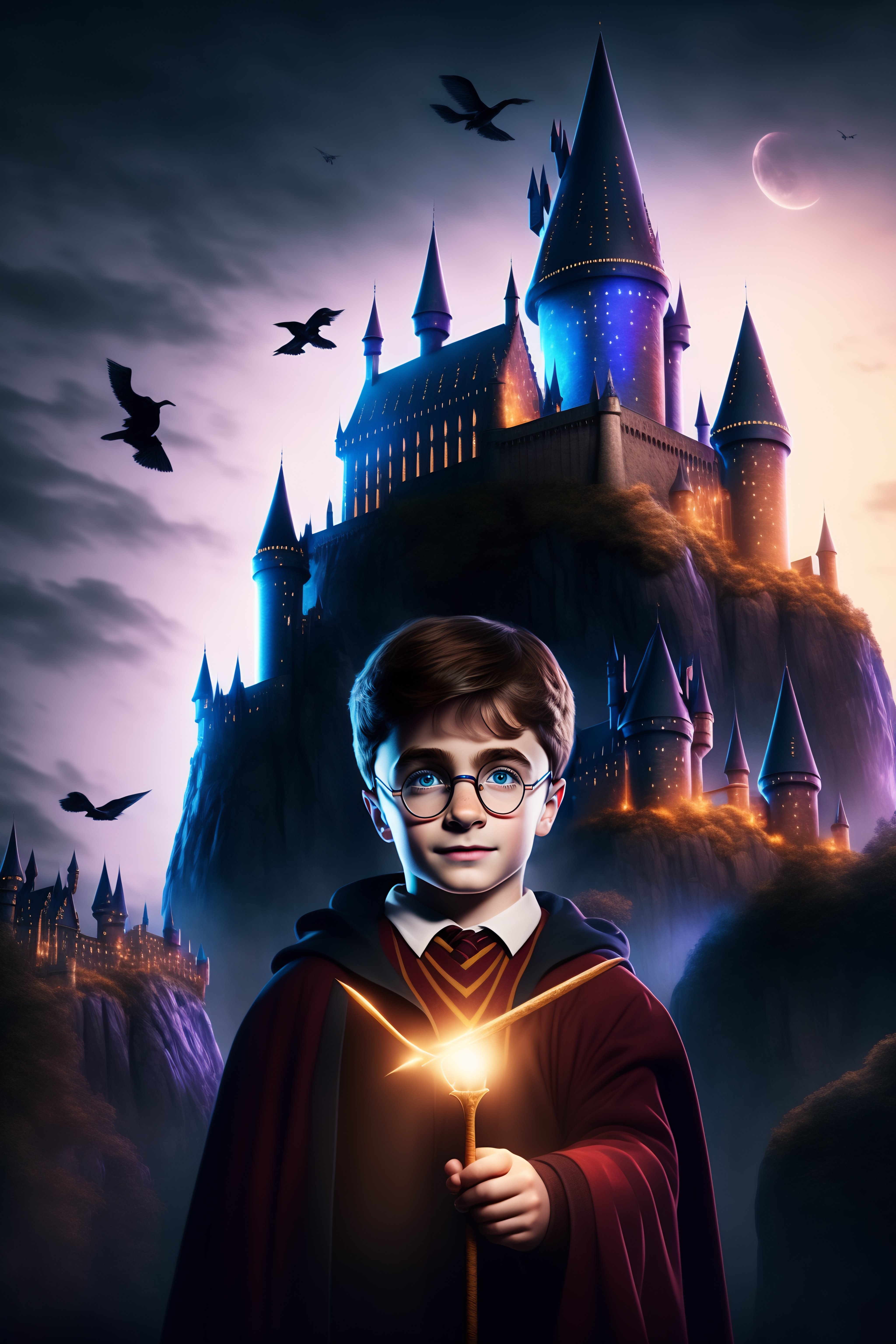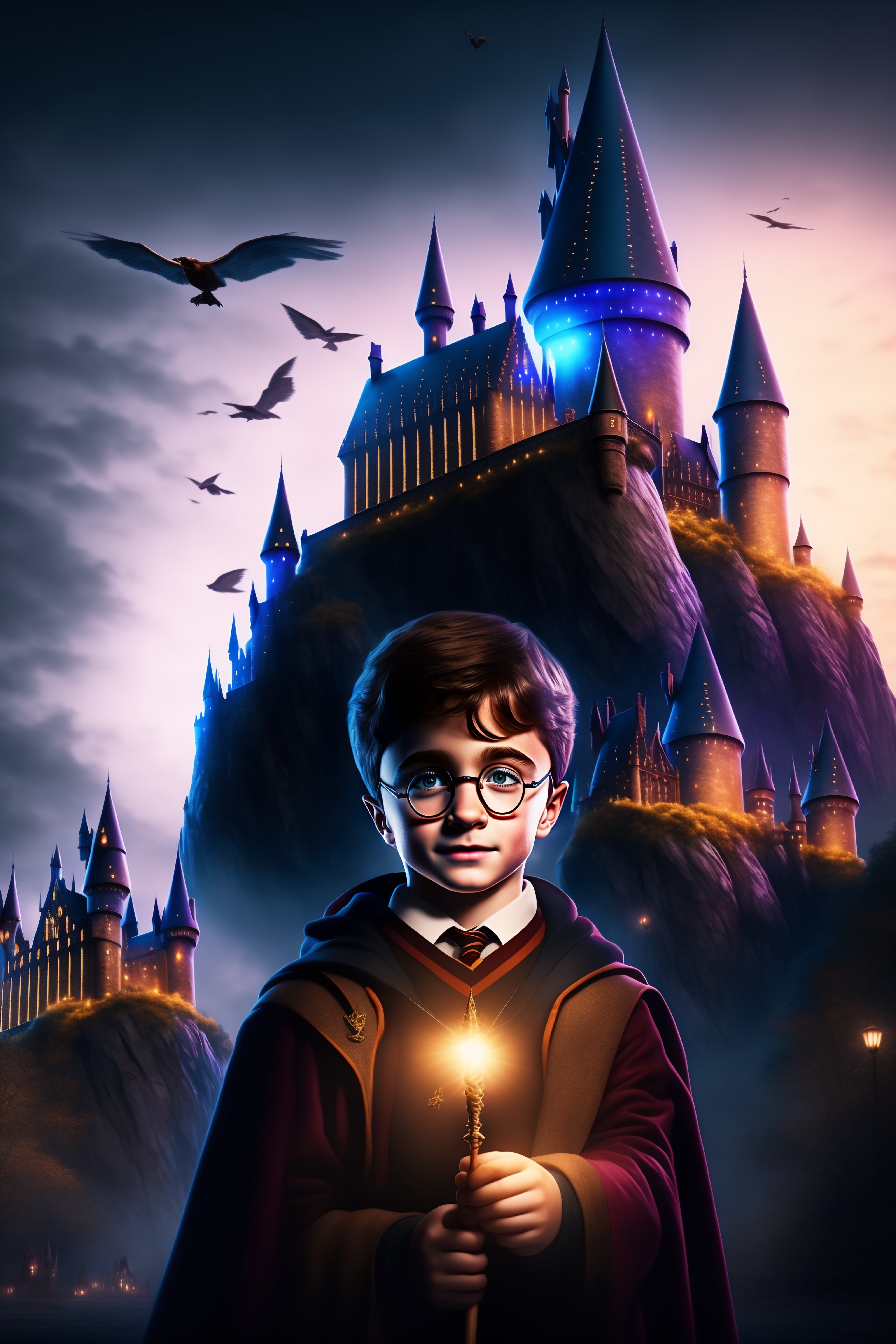 Portrait of harry potter child holding his wand with hogwarts castle in the background at night with crows flying in the sky. using 8k high definition. intricate, elegant and highly detailed ultra-realistic, cinematic dynamic lighting, octane rendering, photorealistic