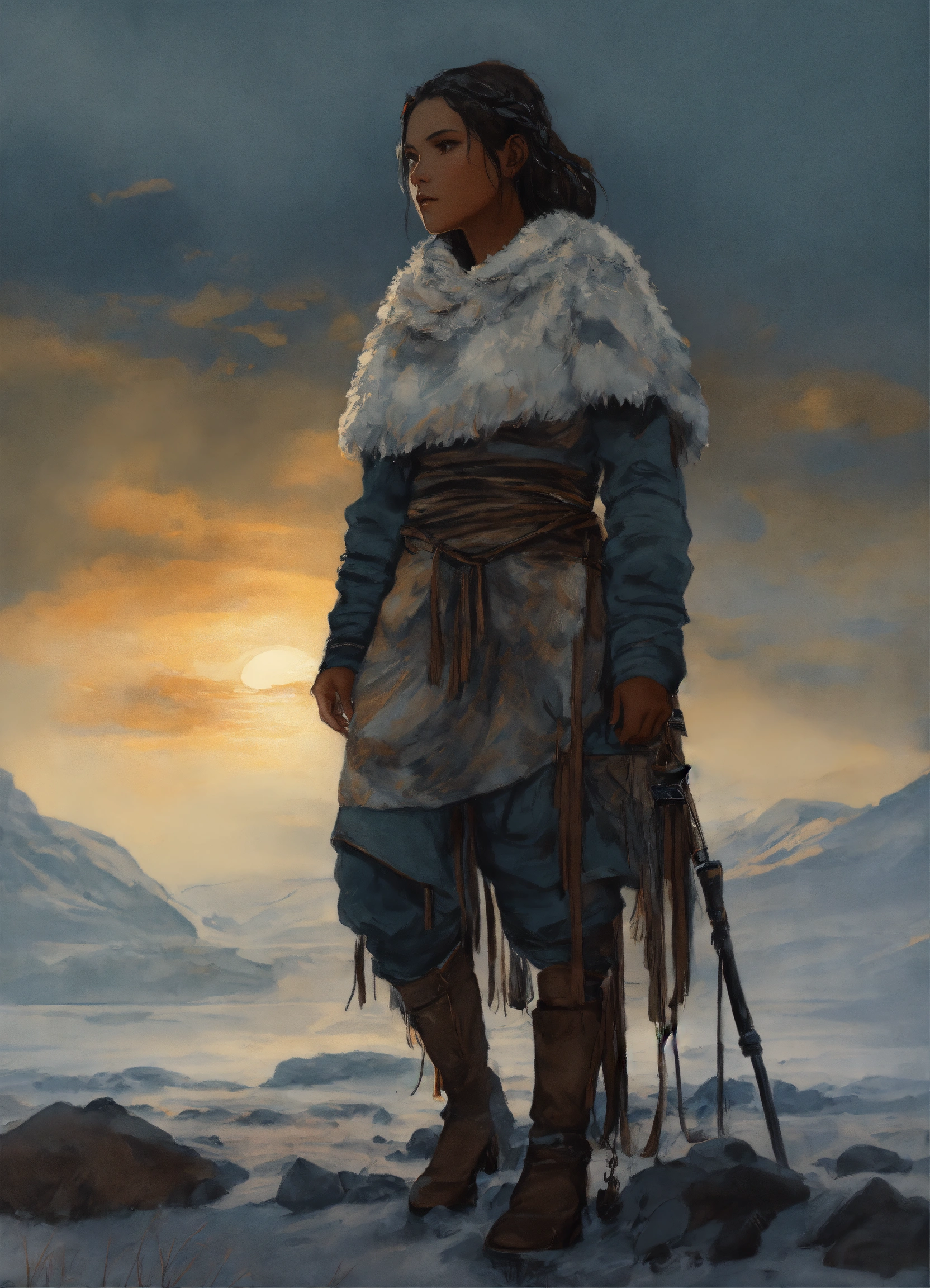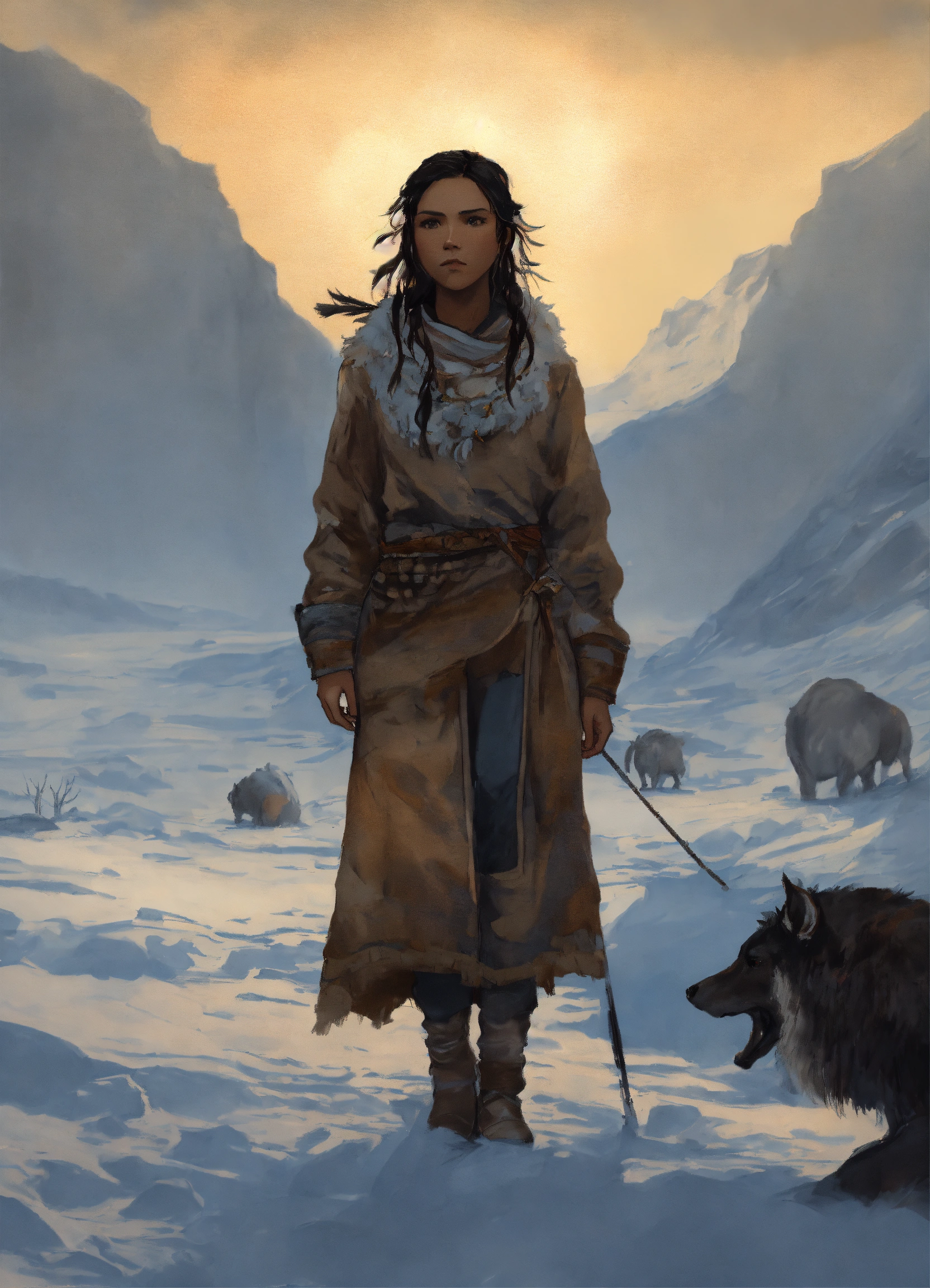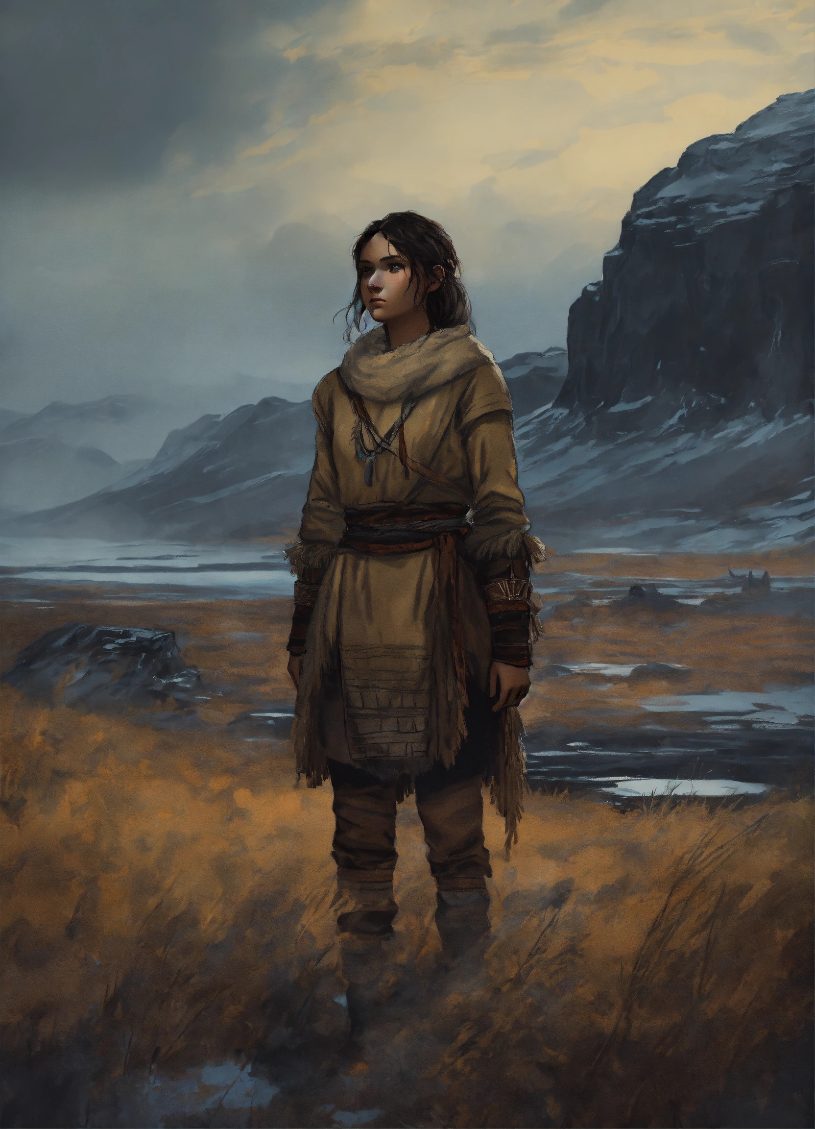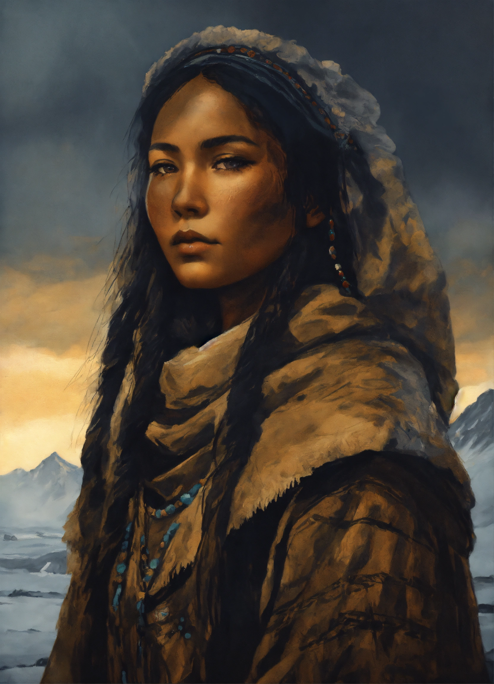 Painting of a young siberian aboriginal woman wearing paleolithic arctic clothing, dark fantasy, 8k, outlined silhouettes, dark hues, gloomy and depressing ambient, in the style of tom björklund and alan lee, inspired by senua's sacrifice and horizon zero dawn