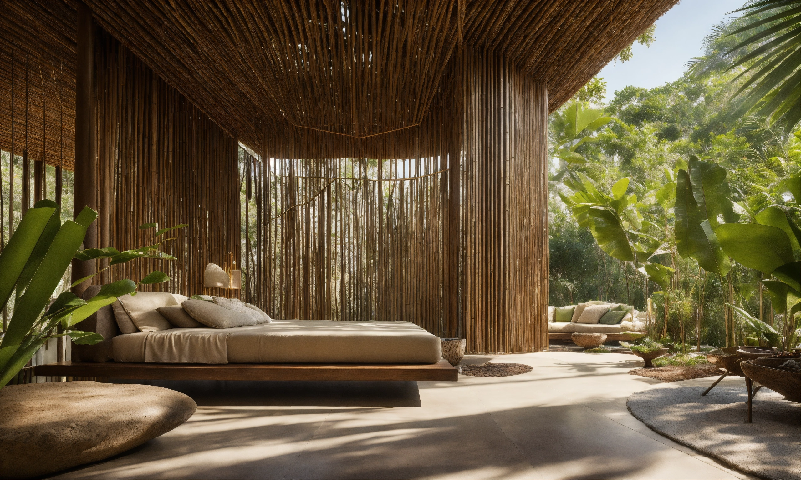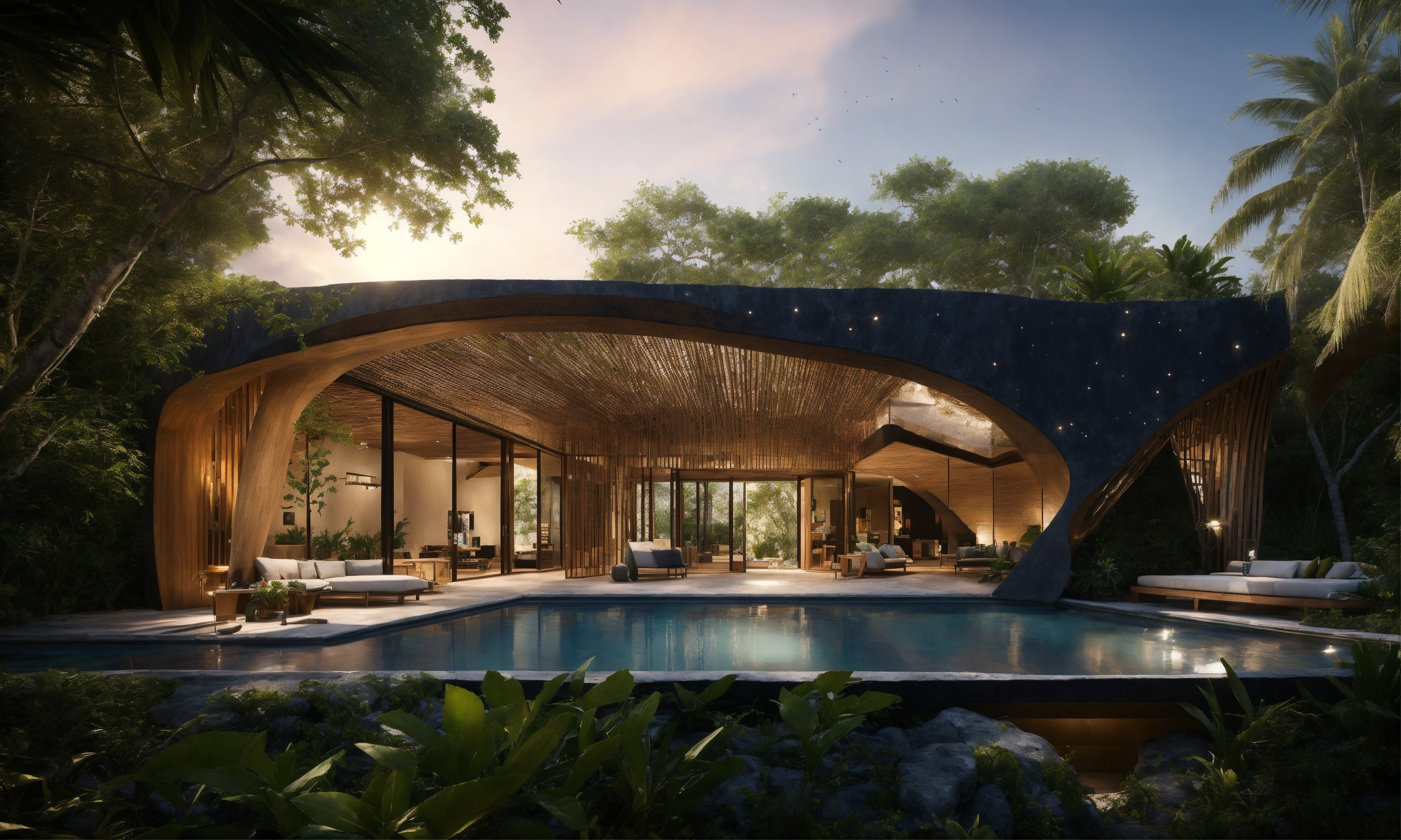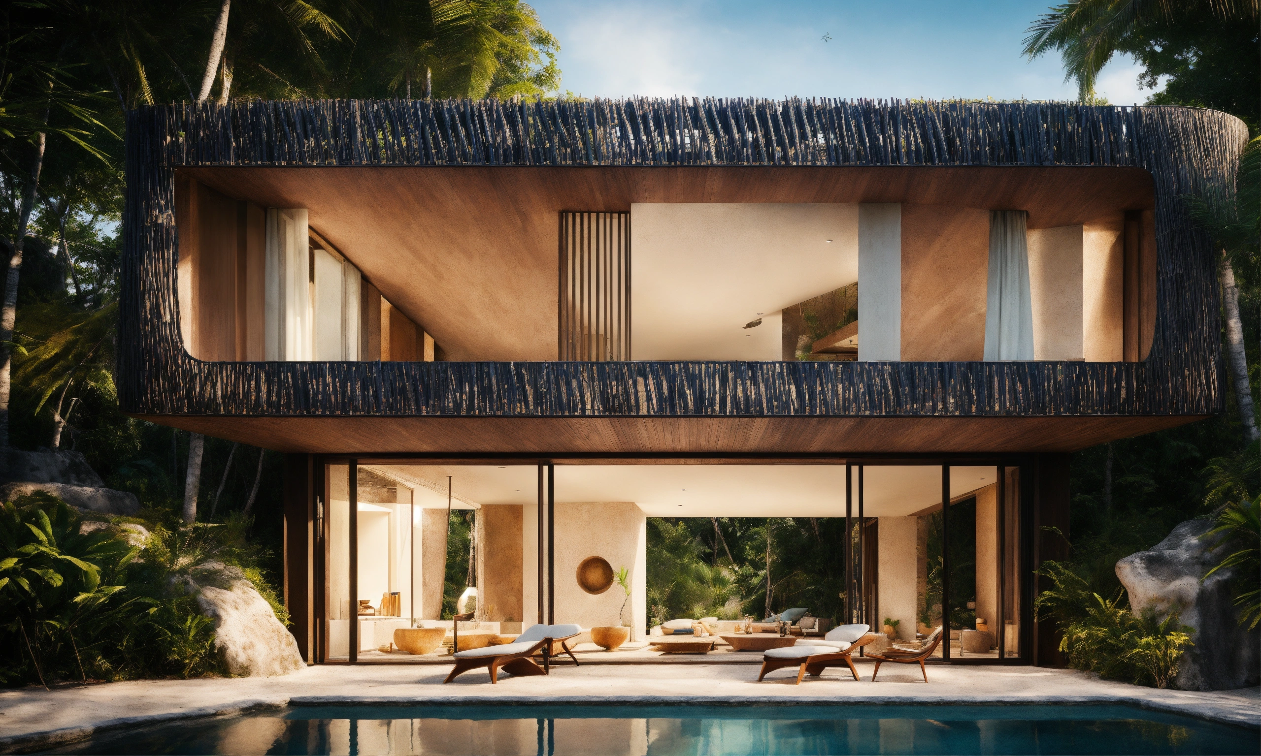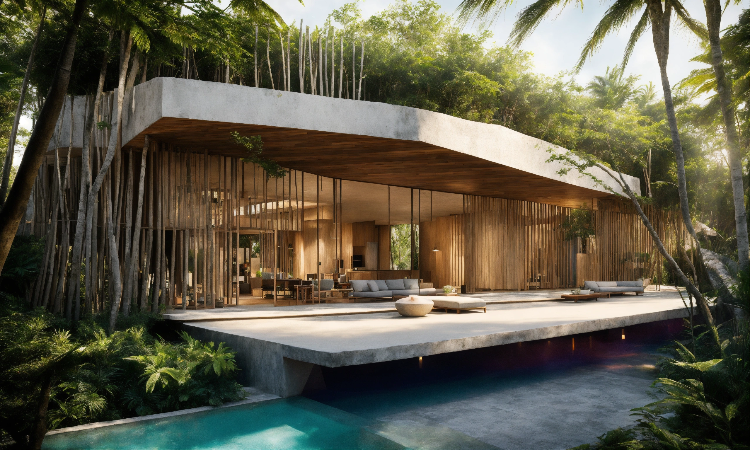 Envision a zaha hadid-styled and eames house, environmentally-conscious villa nestled within the bustling modern architecture of tulum, quintana roo. as you approach from the entrance, the street view reveals a facade adorned with a vertical bamboo lattice, gracefully contrasting with the stone finish. large overhangs hint at the interior's coolness, and the surrounding trees whisper tales of nature's embrace. the interior is decorated with natural material