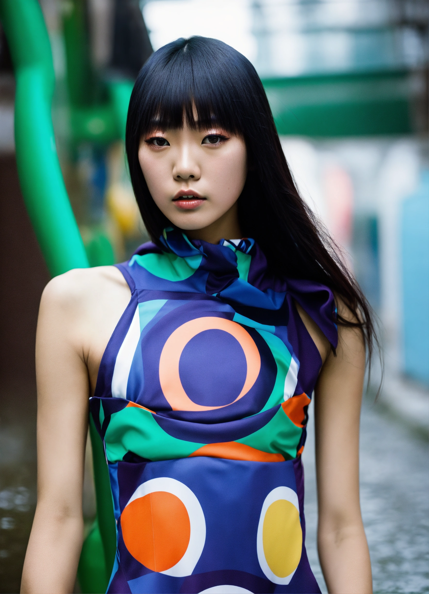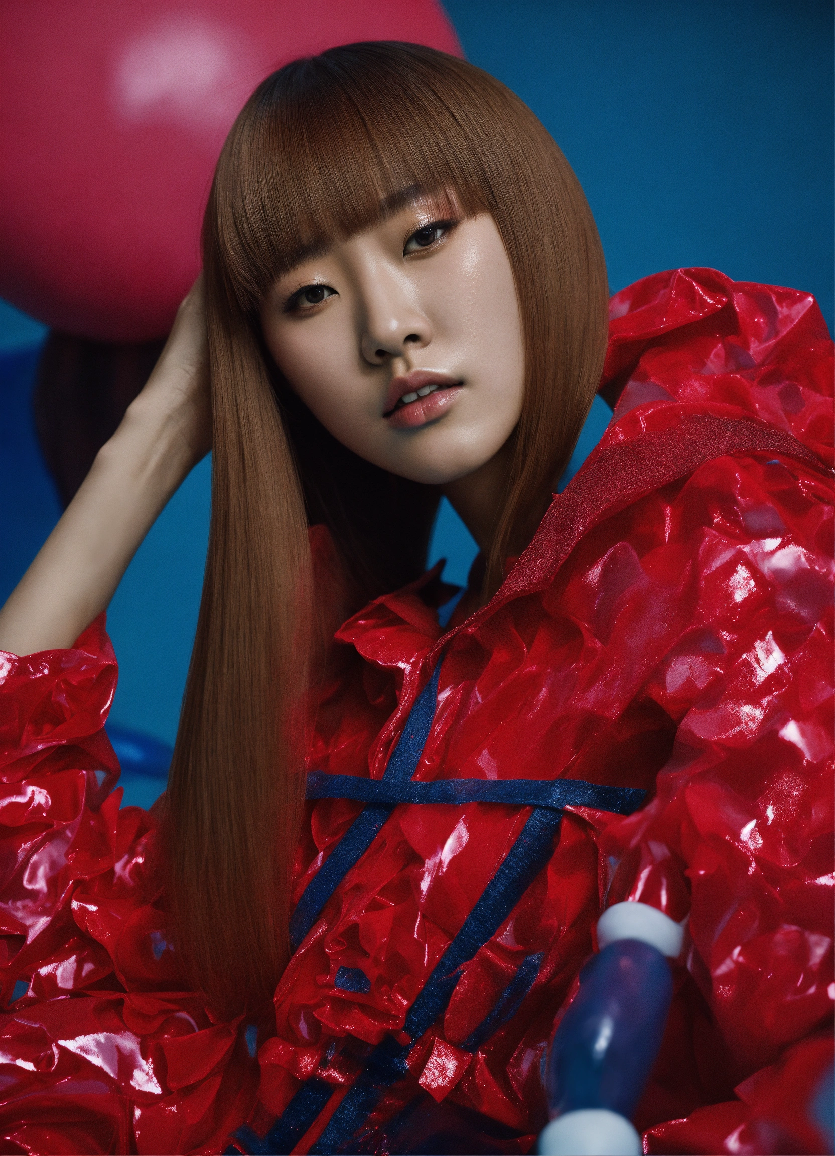 Japanese fashion model with straight hair wearing an avant-garde street style in a swimming-themed photo shoot, photograph by lara jade, extreme pose, contorted pose, highly detailed --ar 10001618