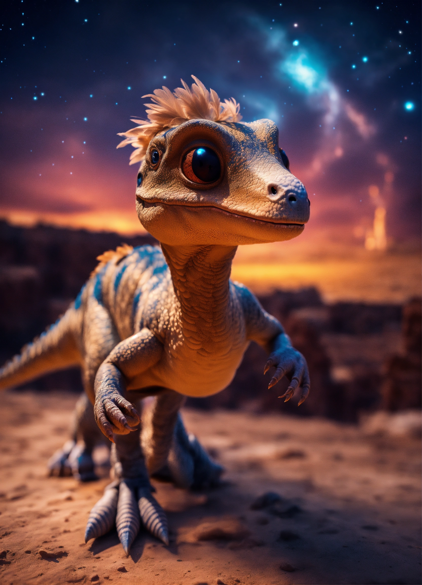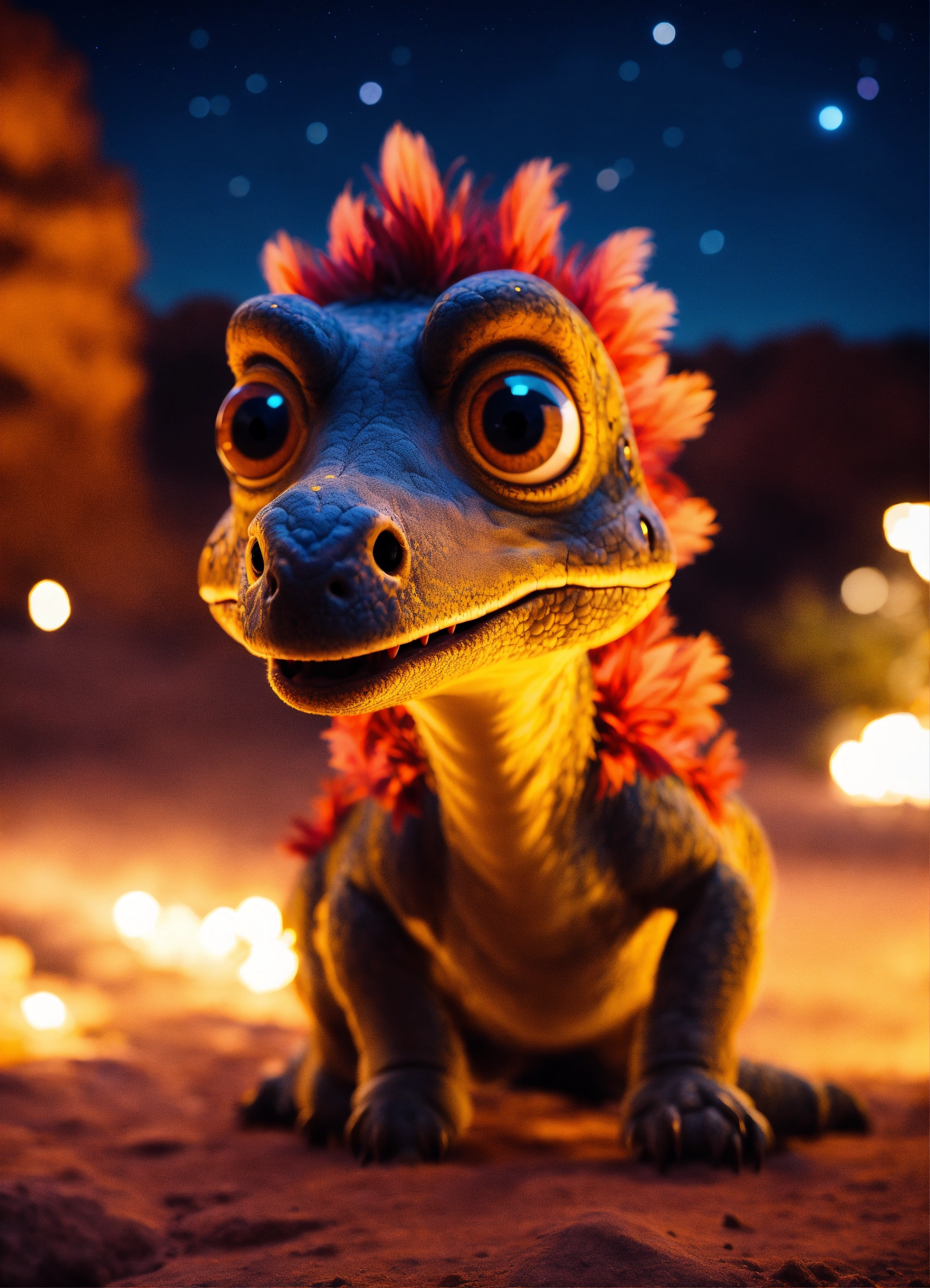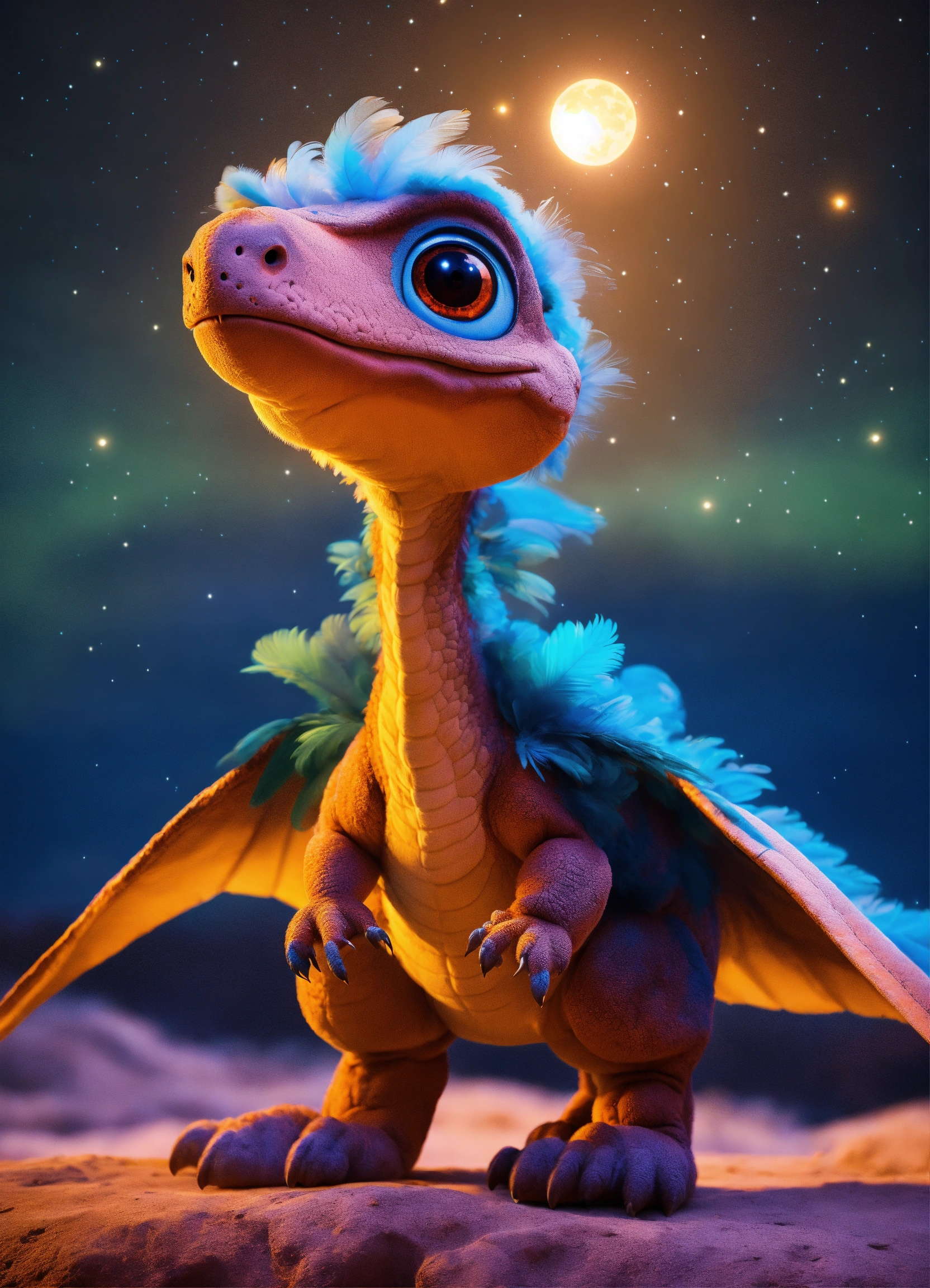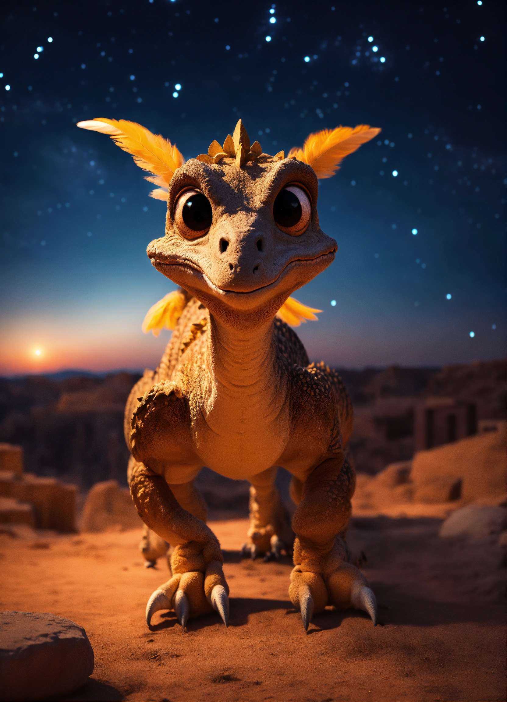 An cute and fluffy dinosaur with big cute eyes, with feathers and wings, night, in jordan petra, glowing, bright sky, stars, with blur background, high quality, 8k