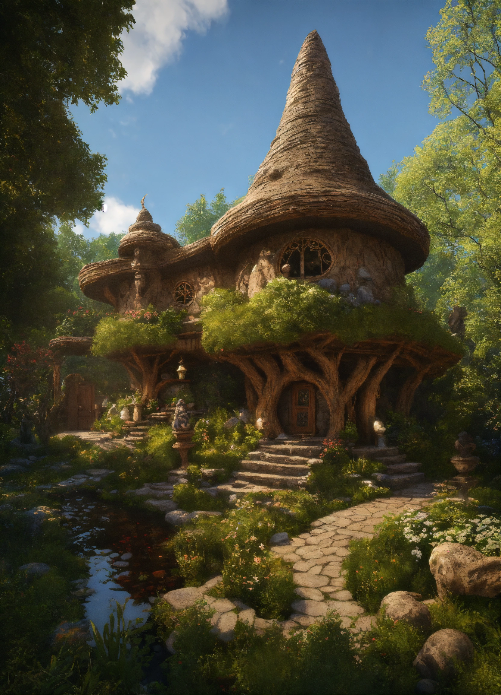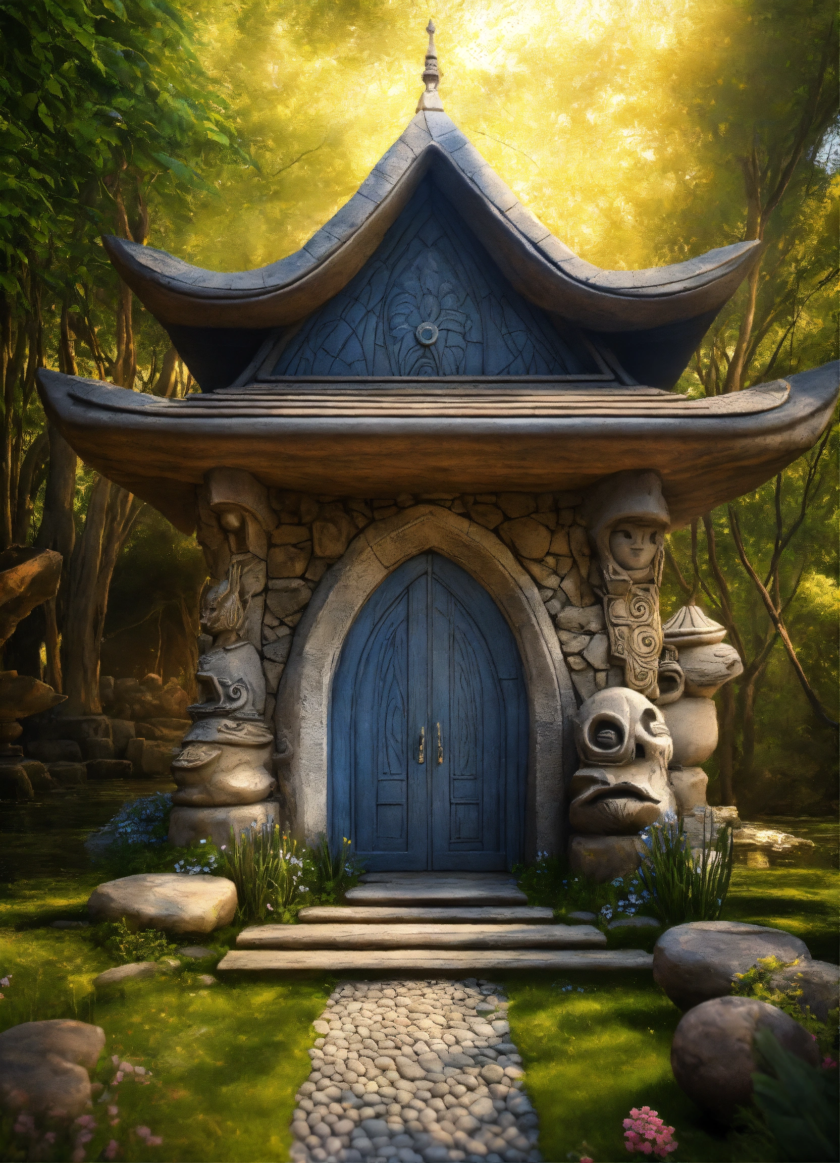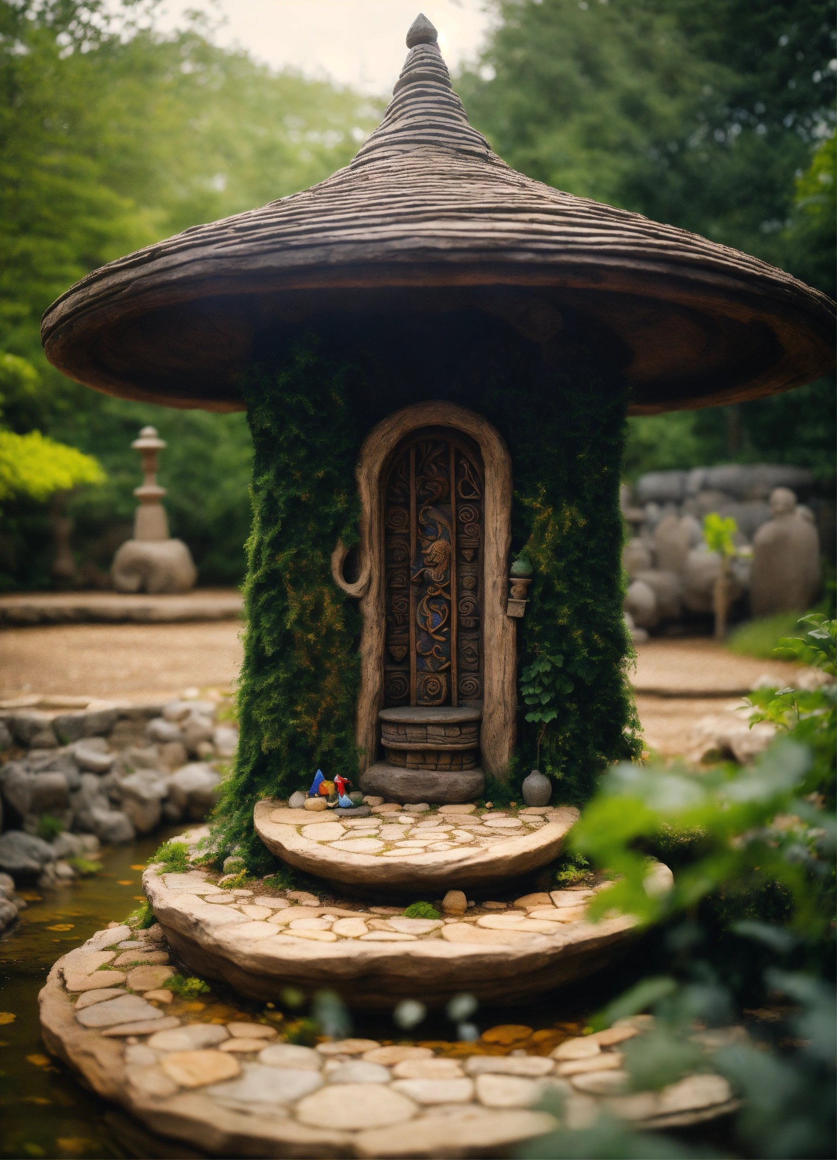 An ancient spiritual hooded female gnome medieval cabin . style of alex grey, giger.unreal engine.totem sculptures.swirling patterned stone pathway courtyard.wood.stone.driftwood.statues. artistic sculpture.air bnb house/backyard.stone lanterns.tall sculptured posts.pond