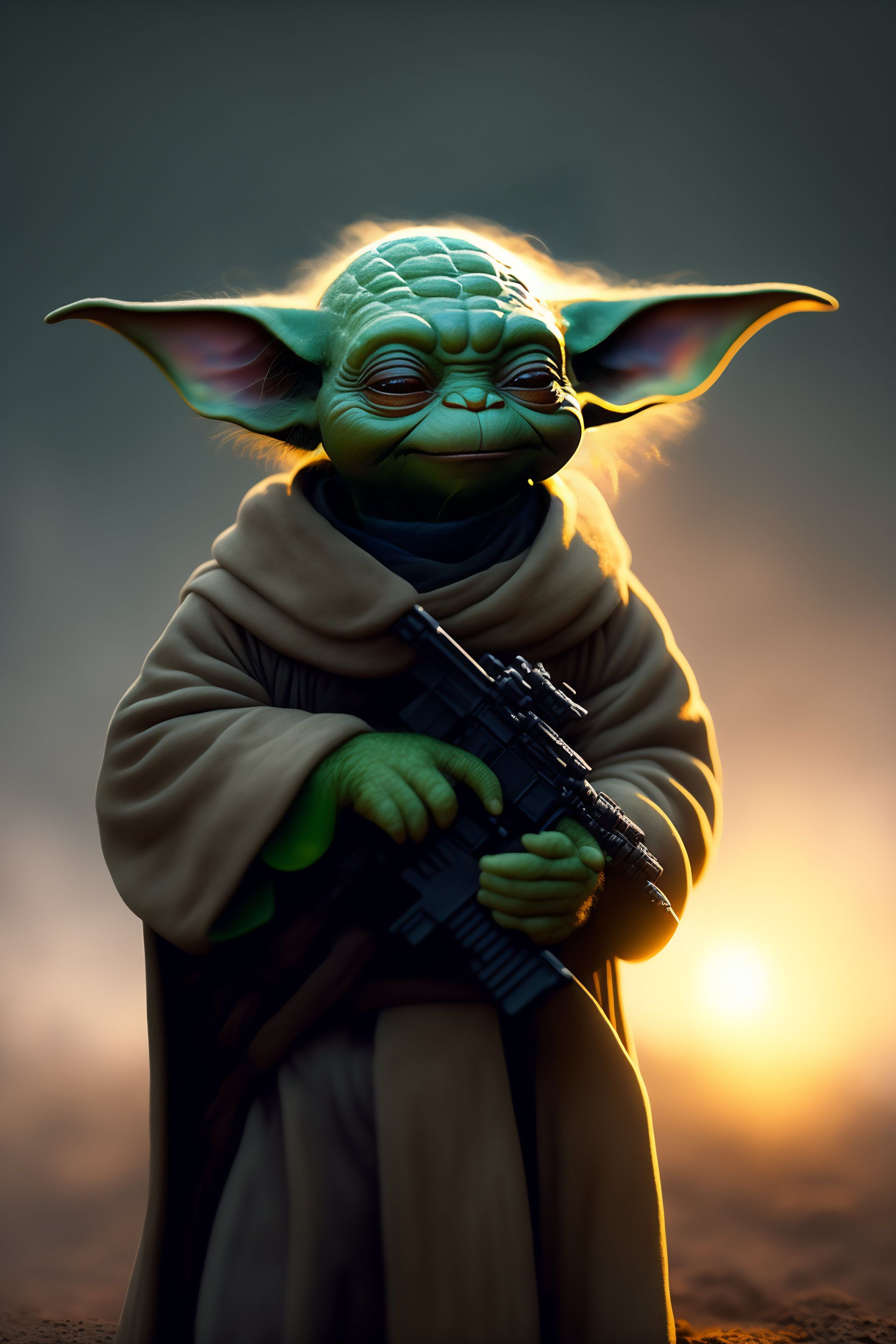 Happy yoda is on the front line in the army at night, smiling, his platoon is fighting, key illumination, soft light, foggy, steve hanks, lisa yuskavage, serov valentin, tarkovsky, rendering 8k, detailing, cute cartoon style, very cute charming face