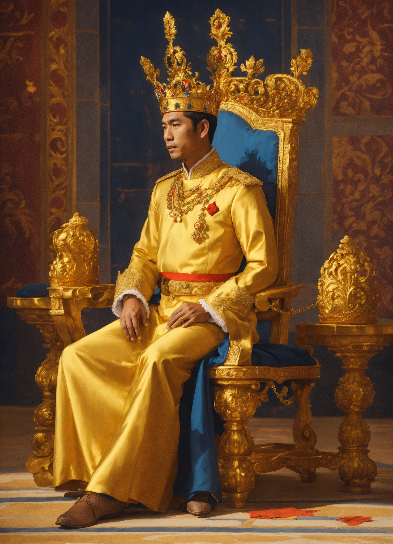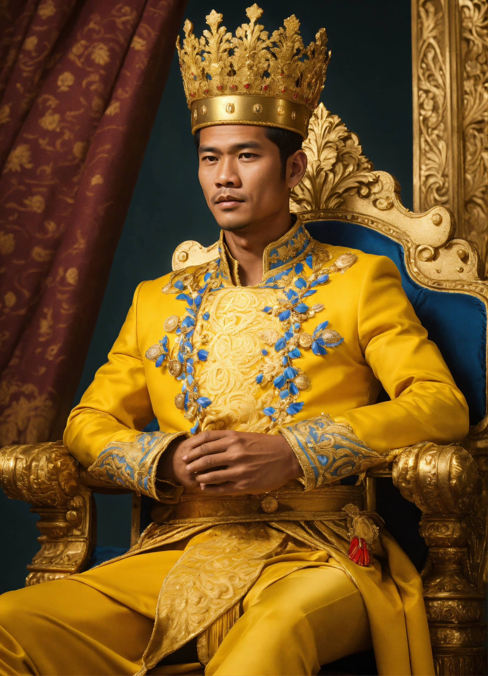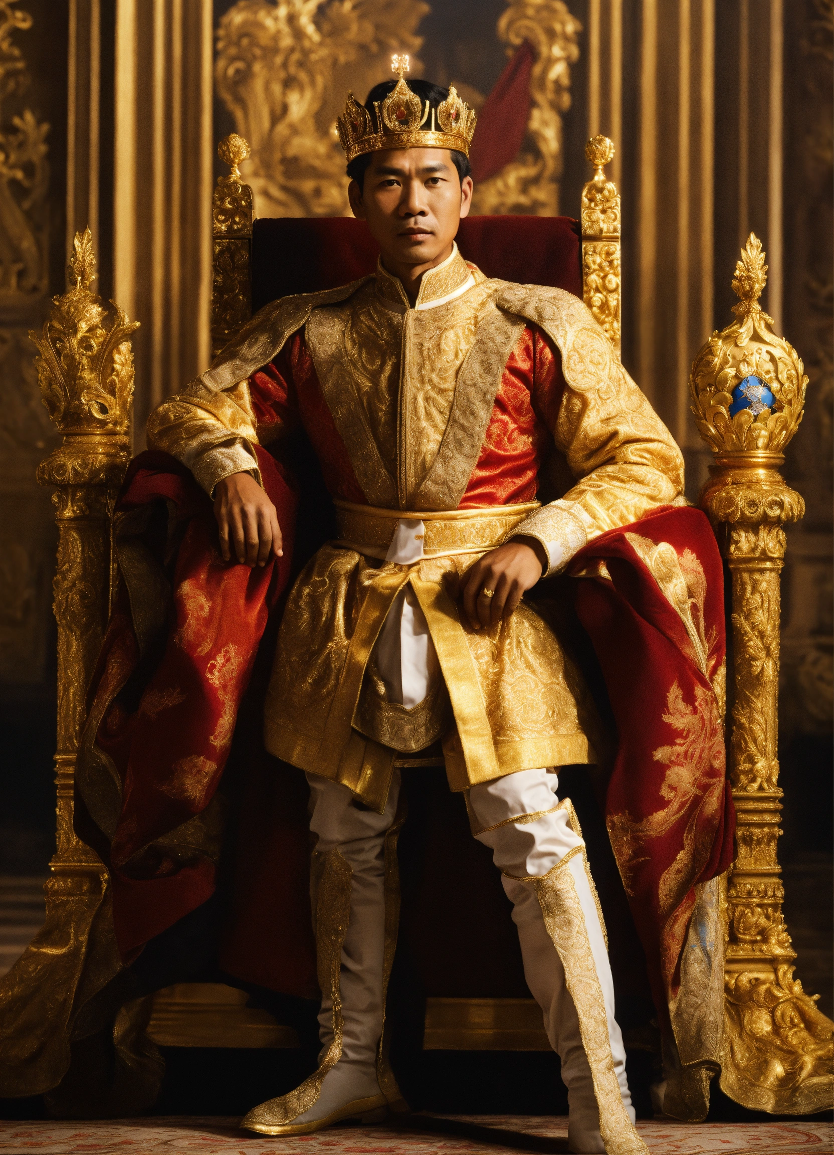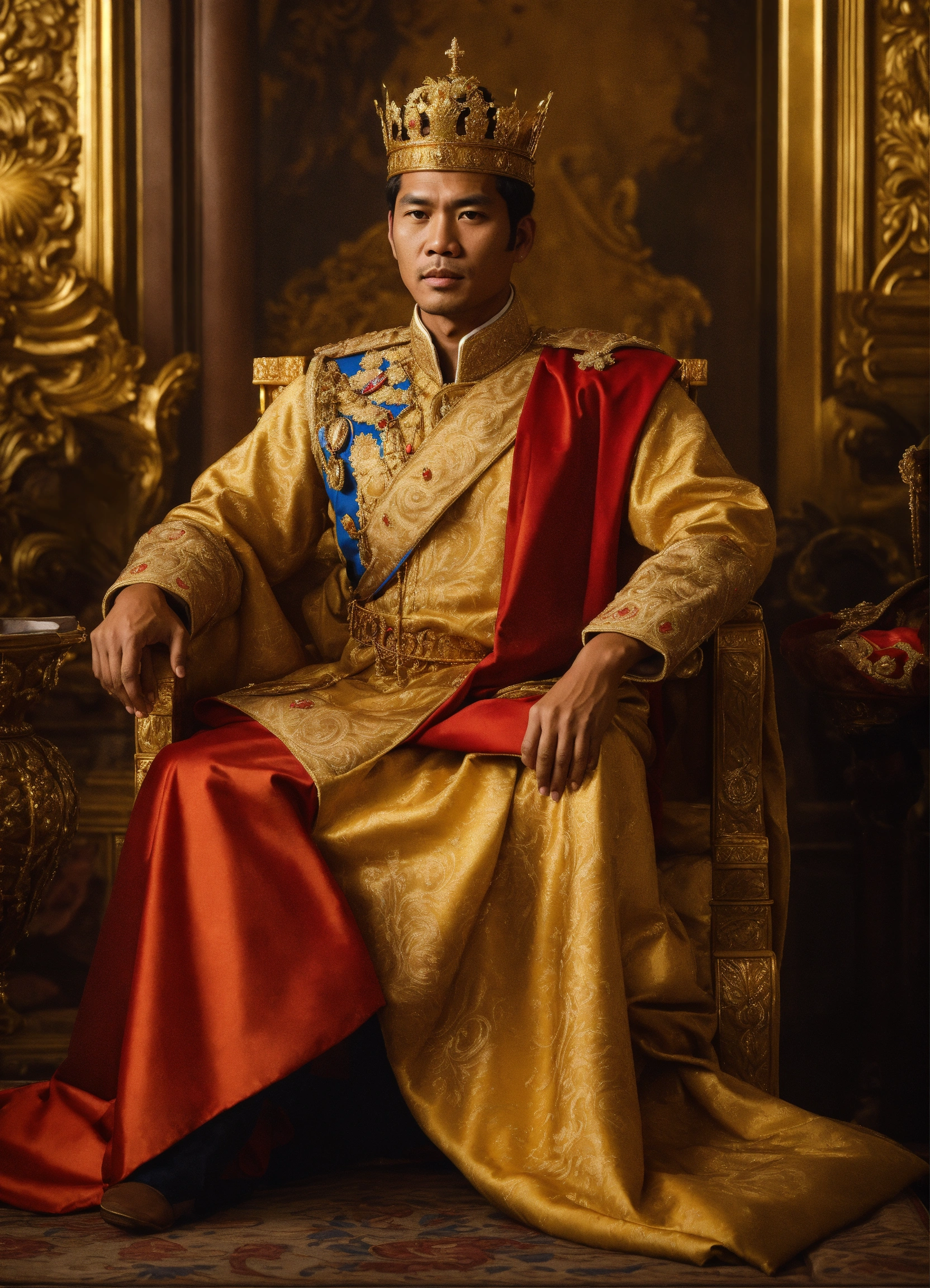 Filipino man serves as a royal assistant to a king and he stands at the right side of his thrown, the king is a hispanic man who wears a golden crown and is dressed in elegant royal clothes, the king sits on a golden royal thrown, the king has masculine facial features