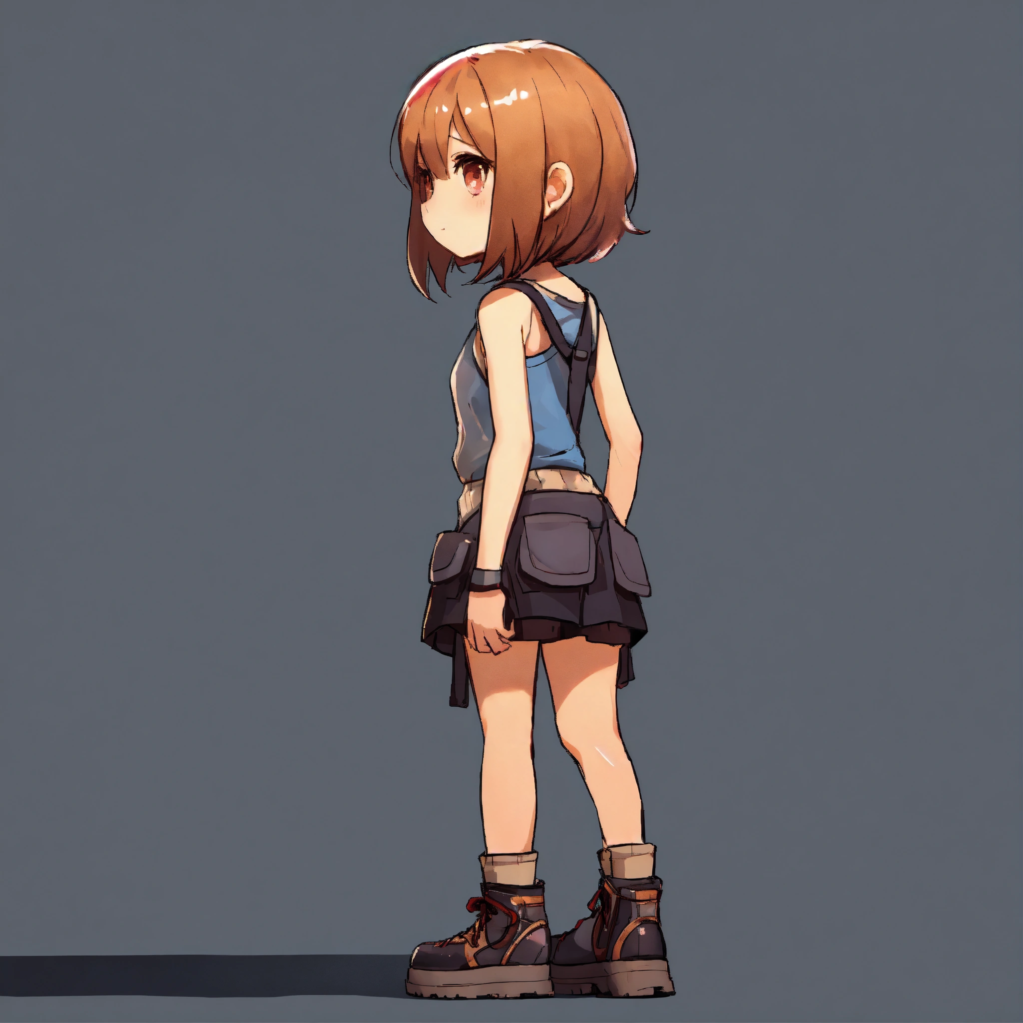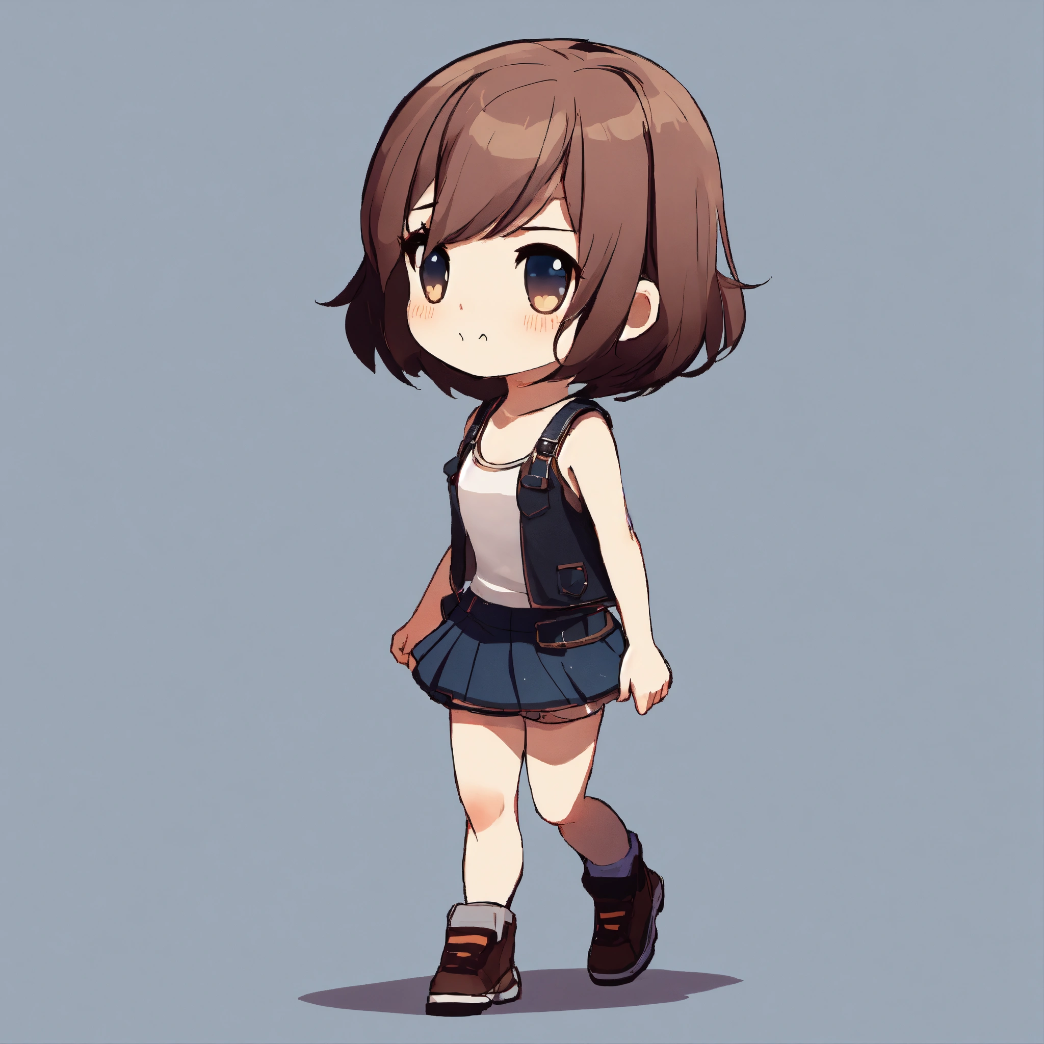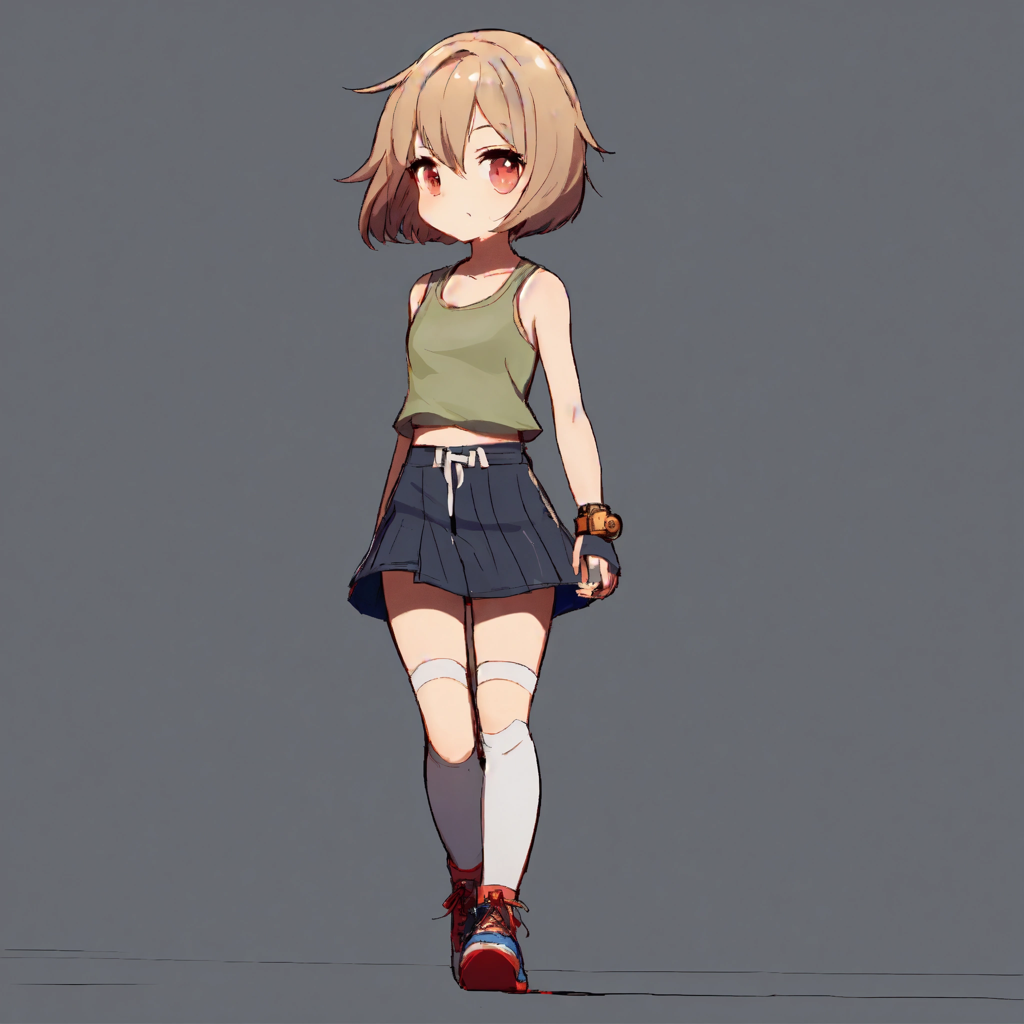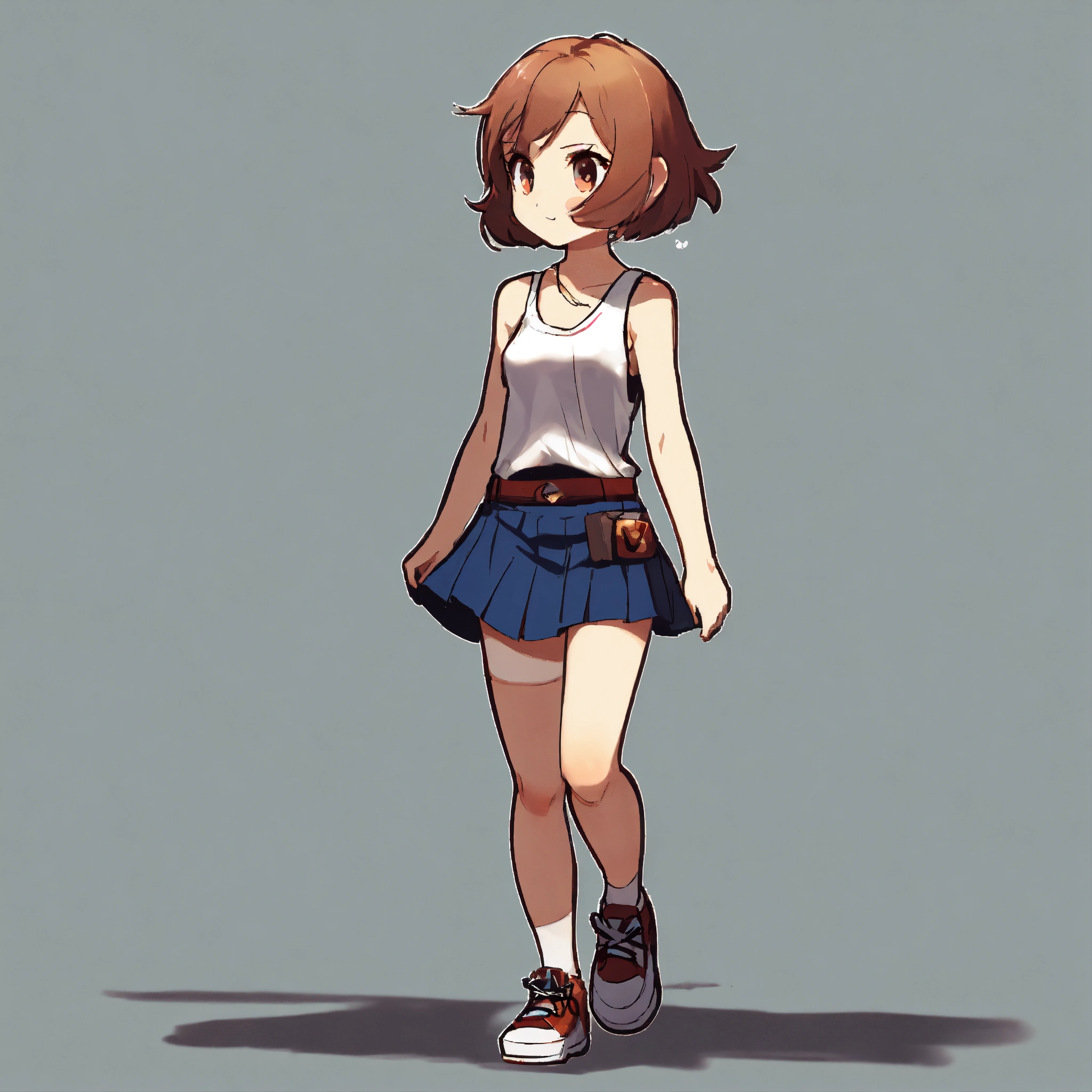 Short haired girl wearing tank top and short skirt, walking, game art, full body view, side view, artstyle from heartstone, chibi proportions, blank background
