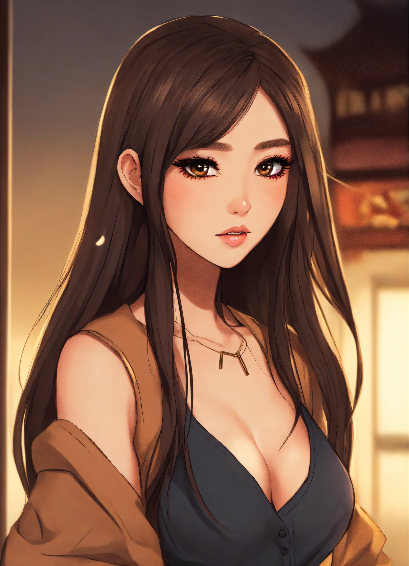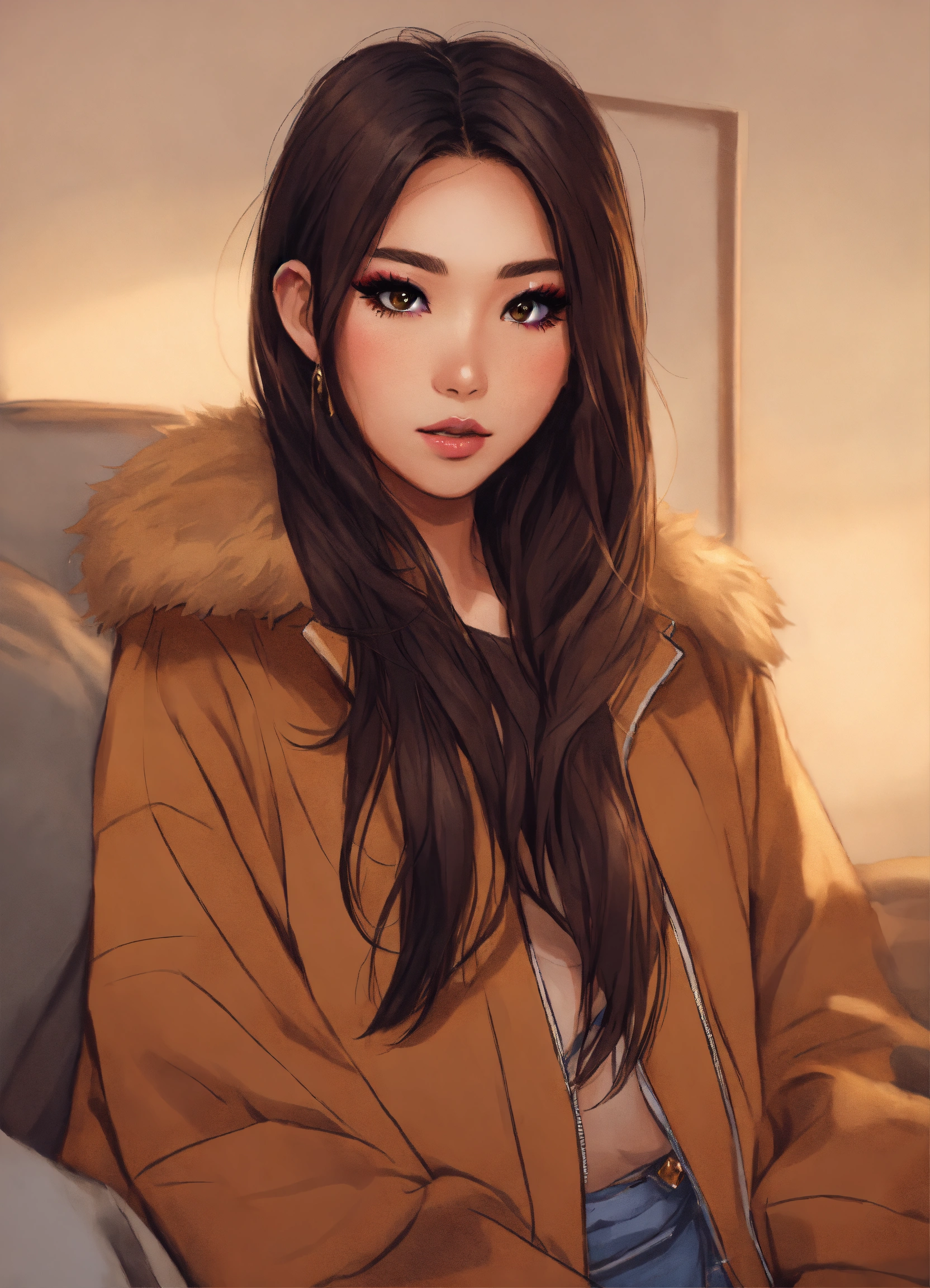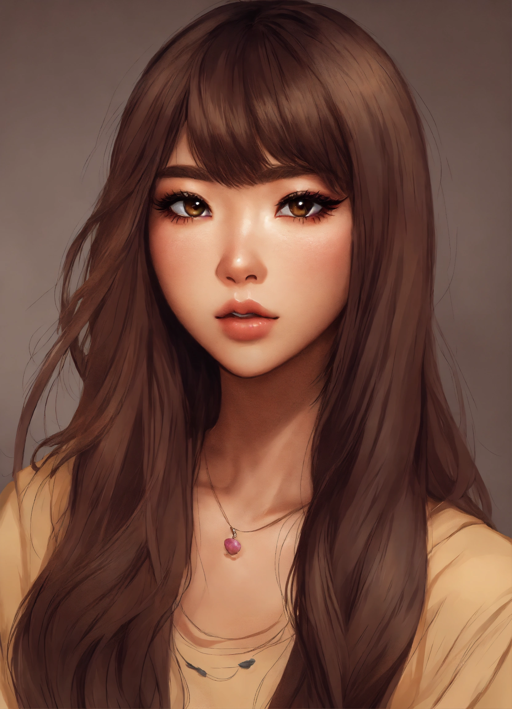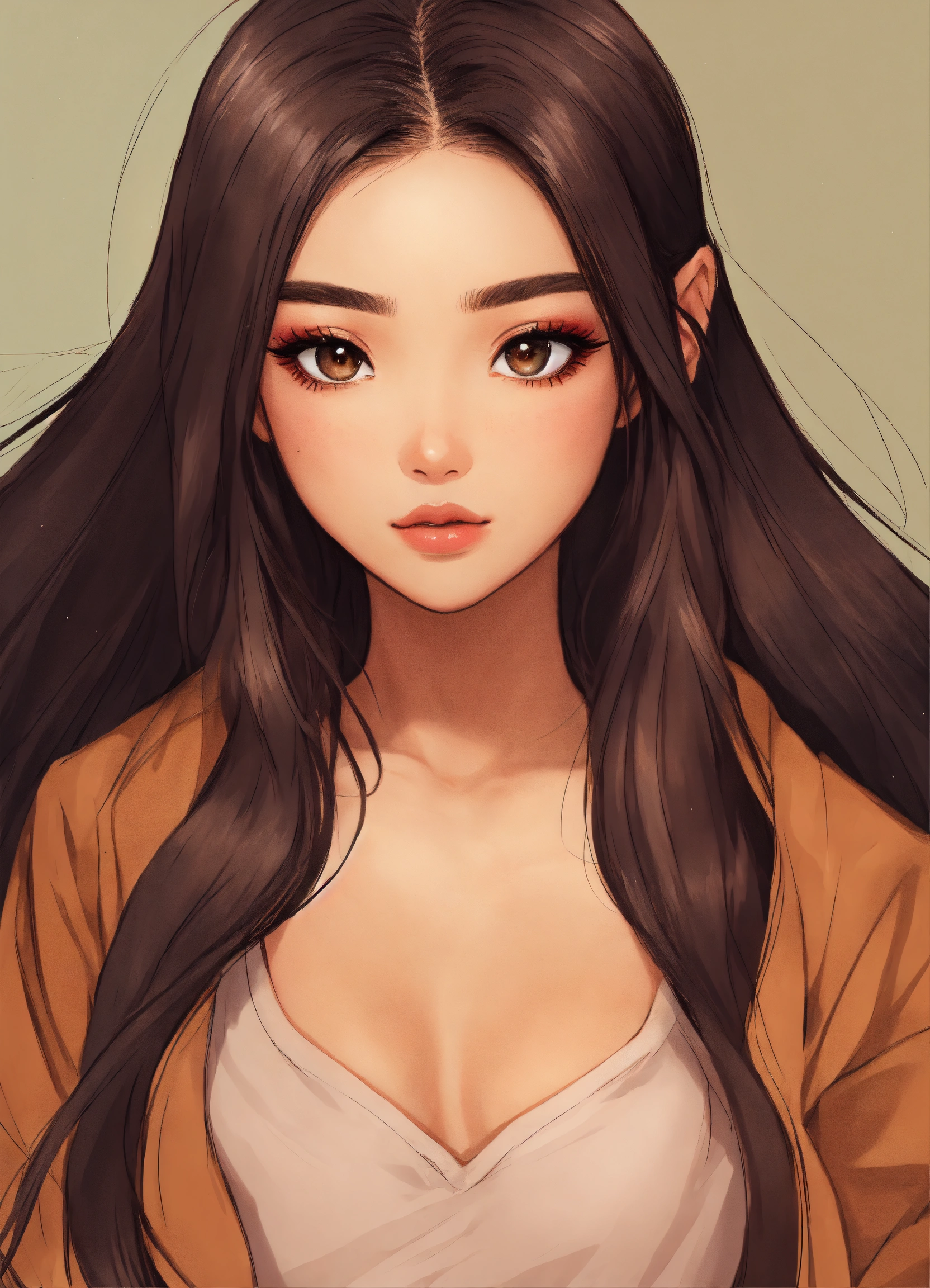 Tan asian female, long brown and black straight fluffy hair, heavy eyeliner, makeup, cartoon, no imperfections