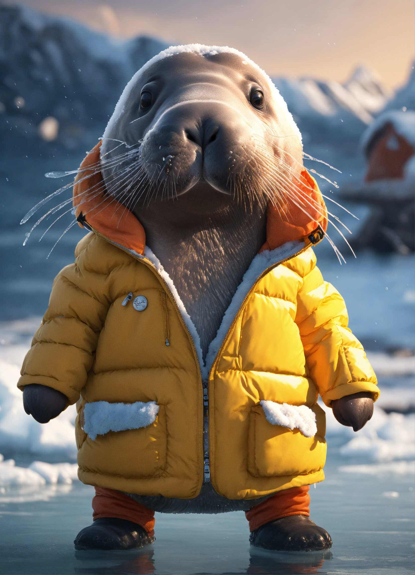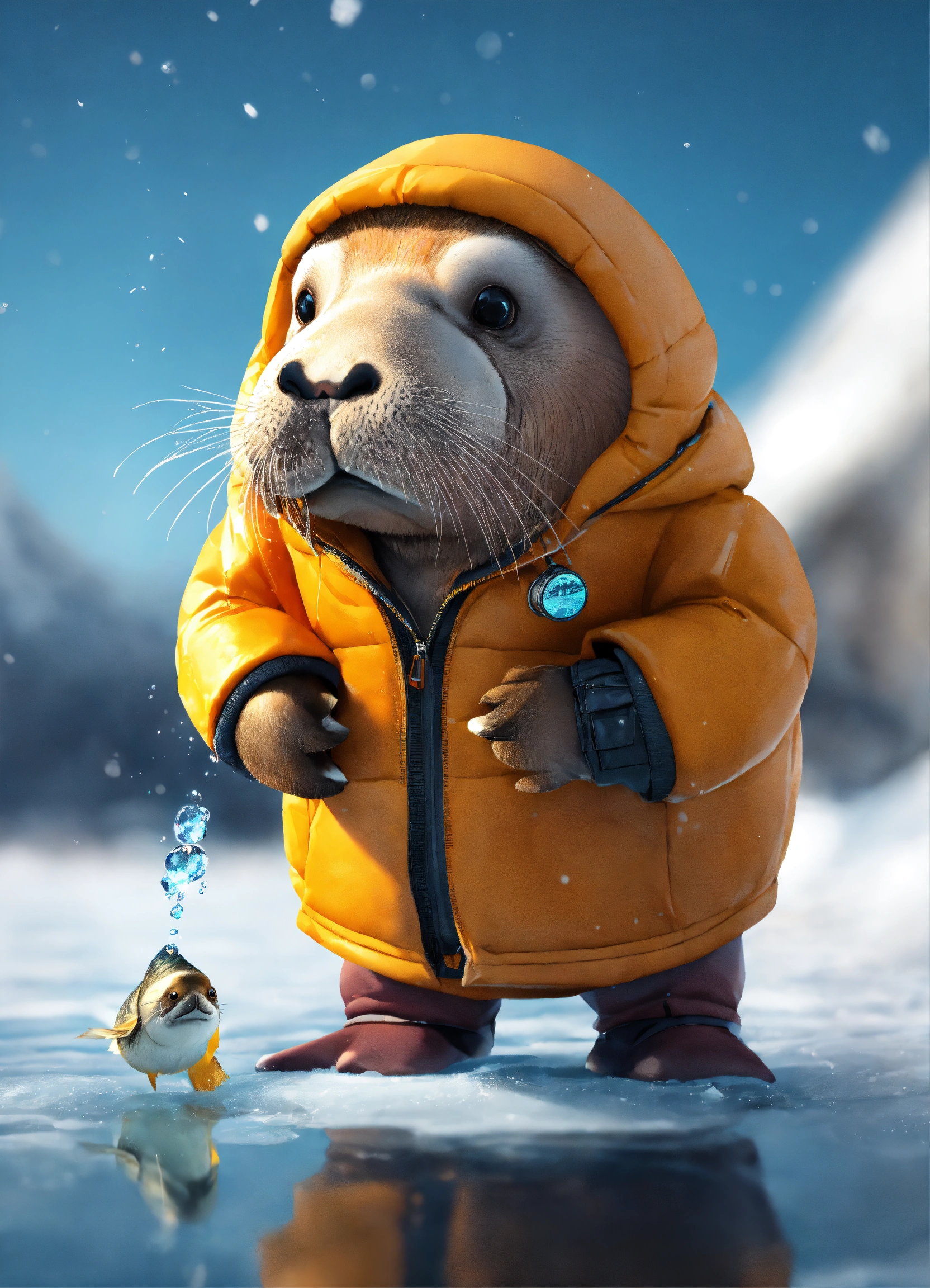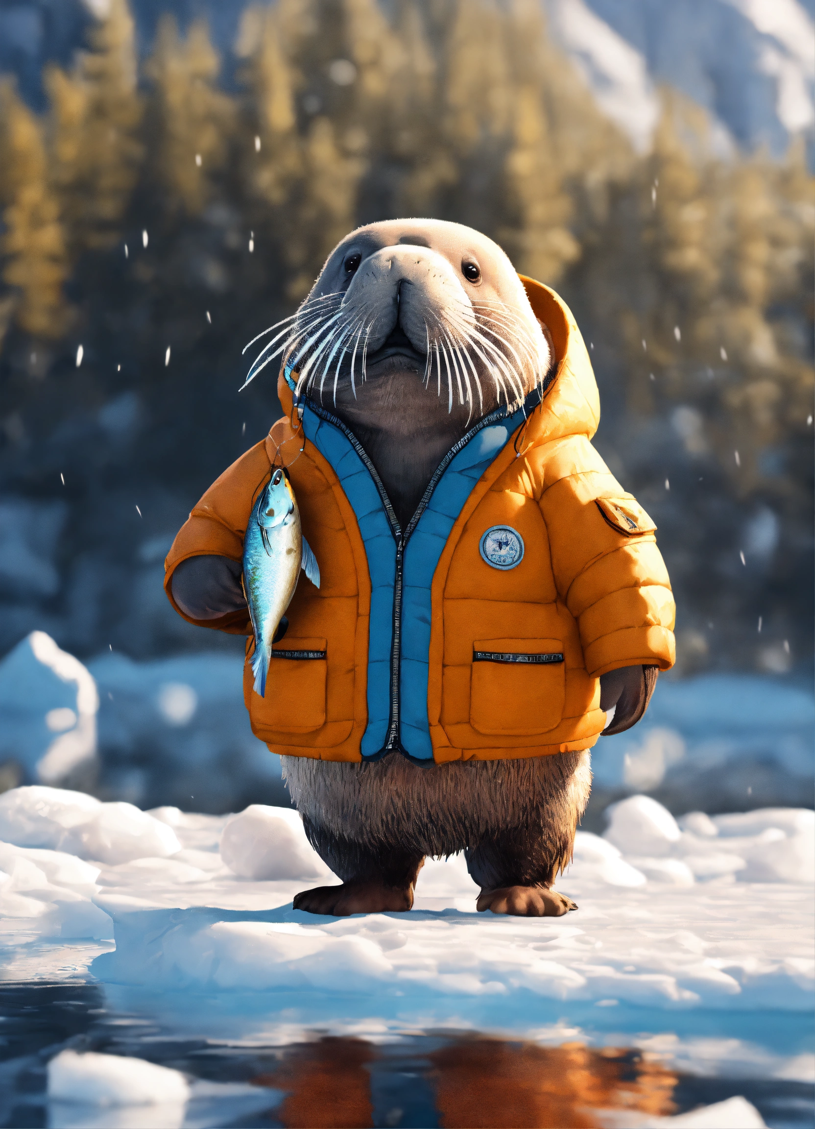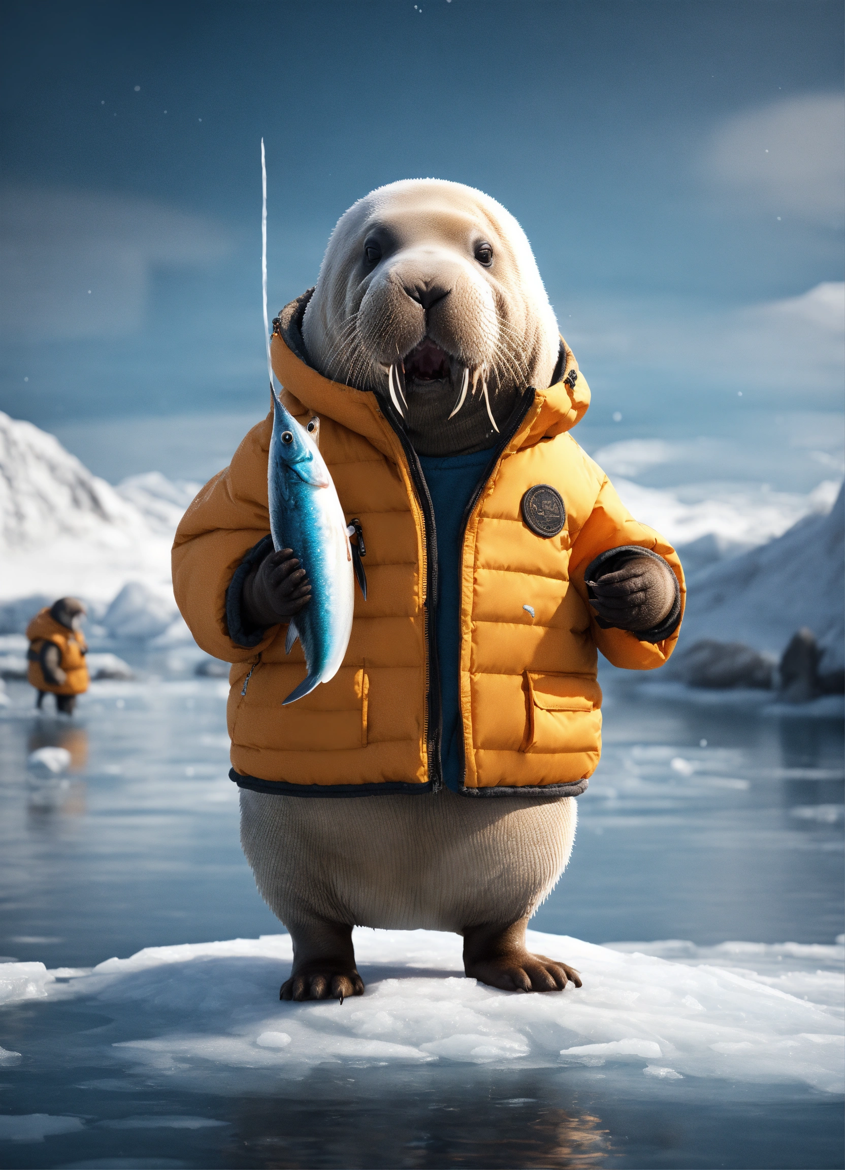 A cute walrus eating a fish, wearing a puffer jacket standing on ice next the water, on it unreal engine render